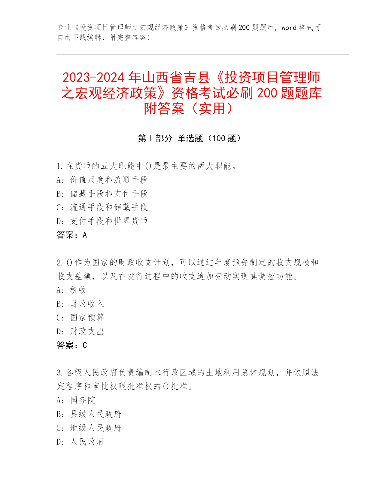 2023-2024年山西省吉县《投资项目管理师之宏观经济政策》资格考试必刷200题题库附答案(实用)