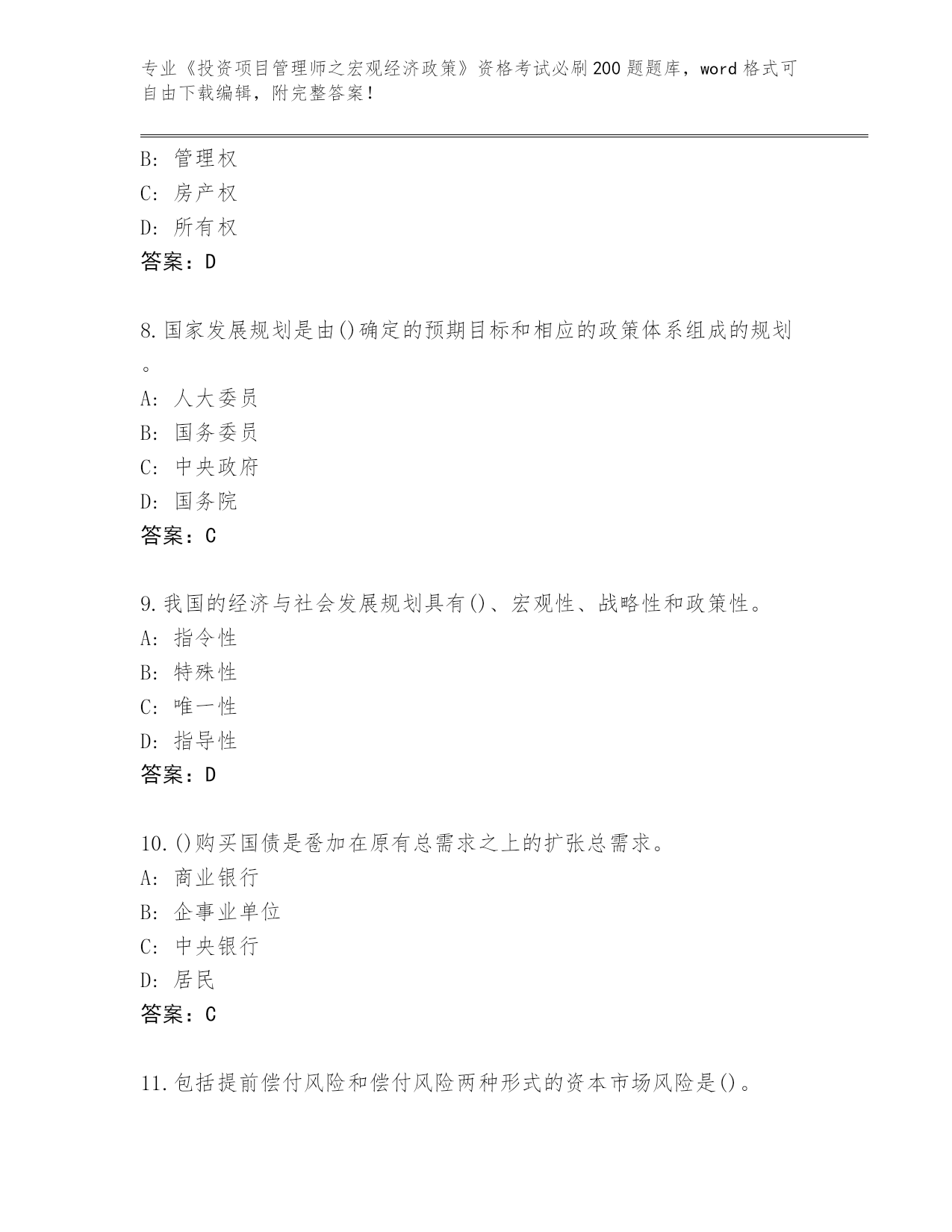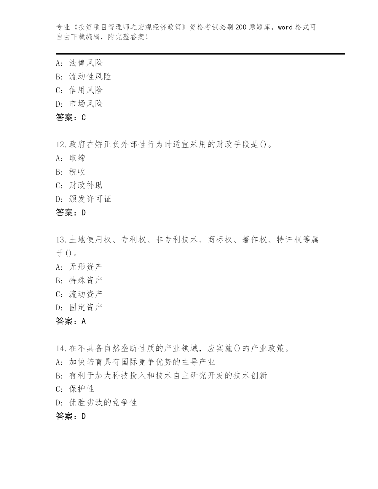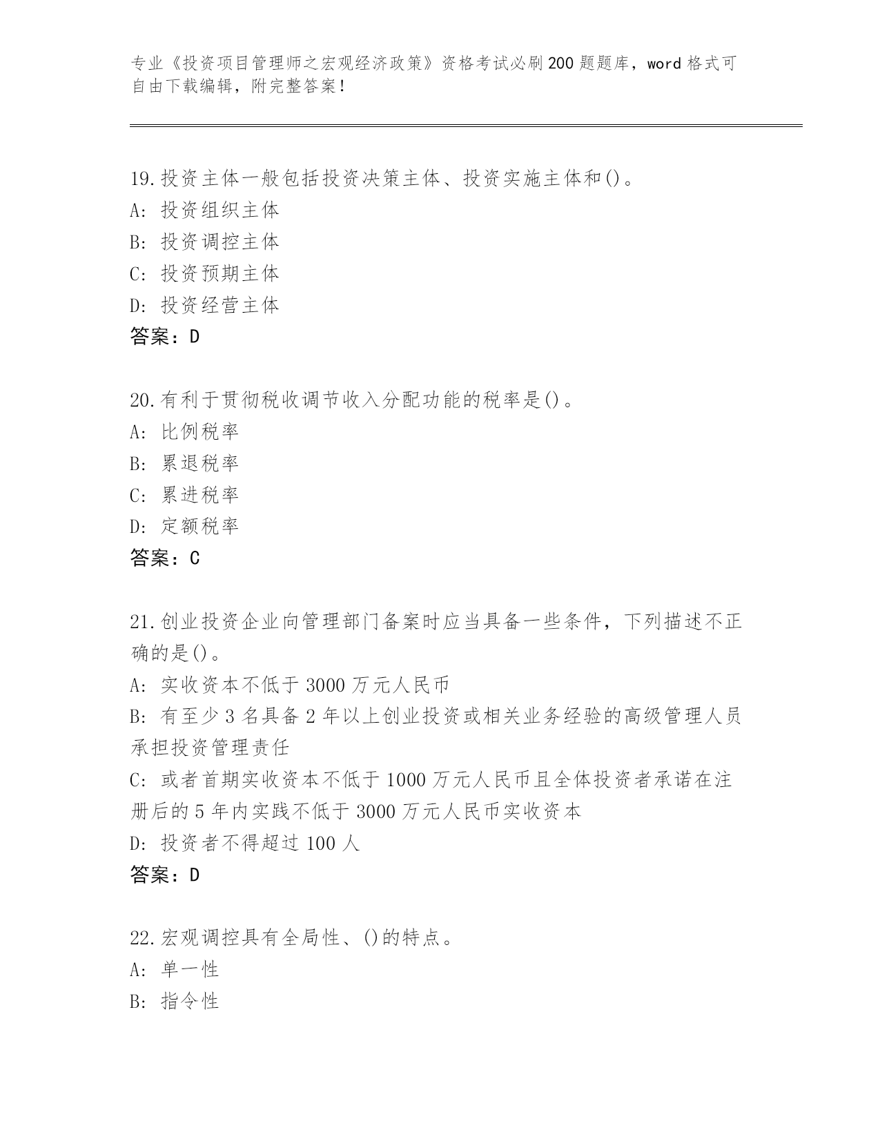 山西省整理《投资项目管理师之宏观经济政策》资格考试必背200题(实用)