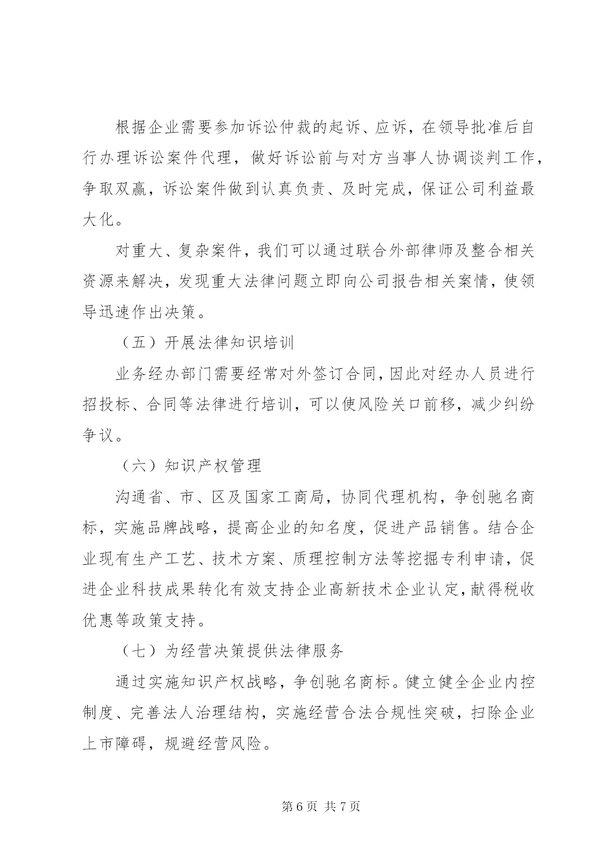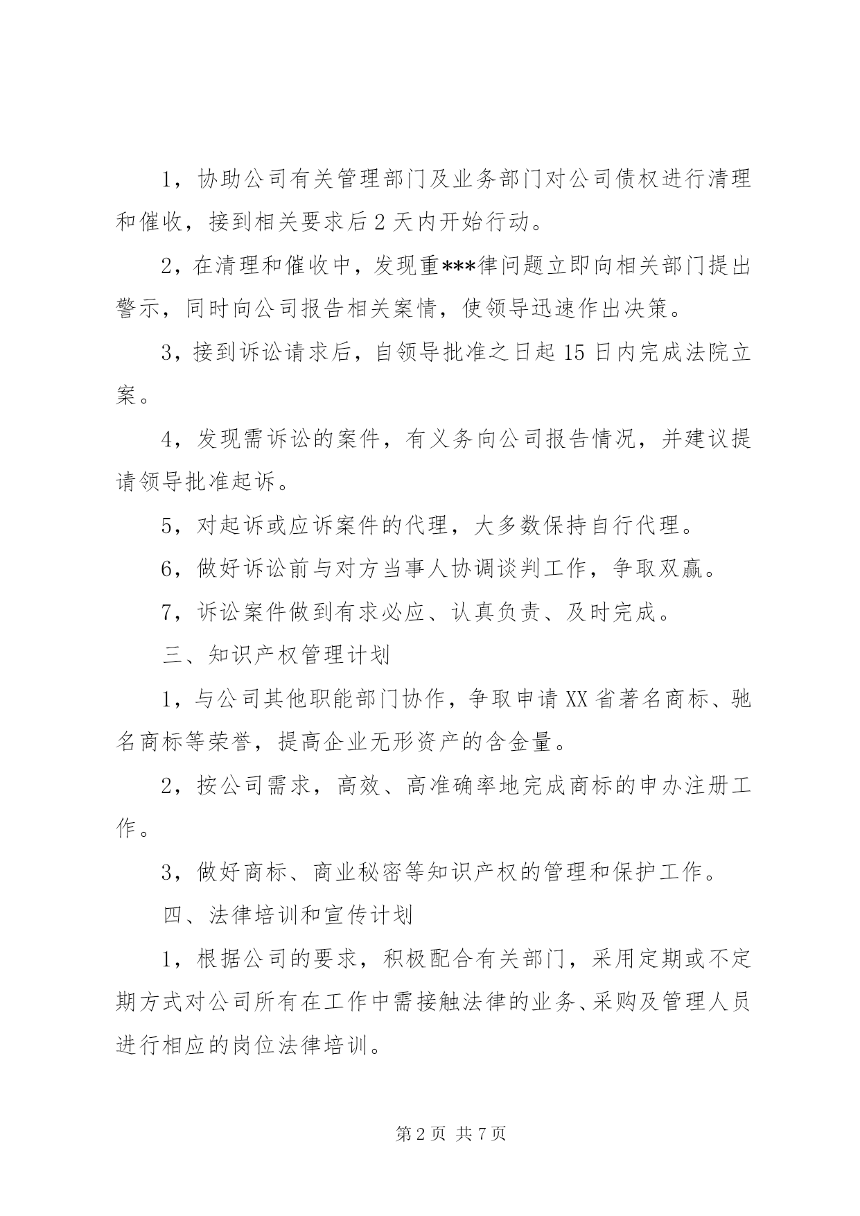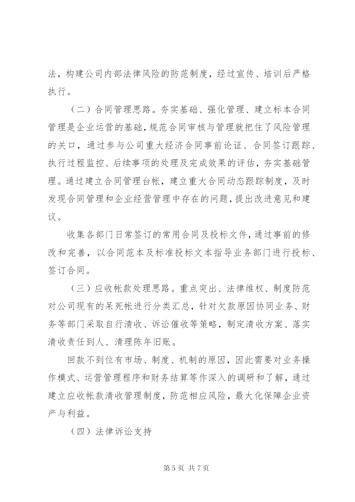 第PAGE\*Arabic\*MERGEFORMAT7页共NUMPAGES\*MERGEFORMAT7页公司法务XX年工作计划范文公司法务2017年工作计划范文(一)法务部根据目前公司的工作情况和工作需要,坚持以事前预防、事中控制为主、事后补救为辅为原则,以高效、高准确率和自律为法律服务准则,结合企业法律工作的特点和公司法律服务的实际需求,制定法务部工作计划。一、合同及法律文件的审核、起草1,协助巩固和完善合同及法律文件审核的机制,加强合同审核的有效性。2,进一步完善合同范本的修改和制作,使其更符合实际操作和公司利益。3,合同及其他法律文件审核保持自收到文本2小时内审核完毕,并提出相应的书面法律意见或进行相应的修改,但特殊情况除外。4,合同及其他法律文件的起草自详细了解相应的具体内容后4小时内完成,但特殊情况除外。5,加强合同管理,规范审批流程,完善管理制度,尽可能降低公司的法律风险。6,保持敢于直言的风格,大胆地提出合同中所在的风险和问题,为领导决策提供法律依据。二、法律补救功能中的计划1,协助公司有关管理部门及业务部门对公司债权进行清理和催收,接到相关要求后2天内开始行动。2,在清理和催收中,发现重***律问题立即向相关部门提出警示,同时向公司报告相关案情,使领导迅速作出决策。3,接到诉讼请求后,自领导批准之日起15日内完成法院立案。4,发现需诉讼的案件,有义务向公司报告情况,并建议提请领导批准起诉。5,对起诉或应诉案件的代理,大多数保持自行代理。6,做好诉讼前与对方当事人协调谈判工作,争取双赢。7,诉讼案件做到有求必应、认真负责、及时完成。三、知识产权管理计划1,与公司其他职能部门协作,争取申请XX省著名商标、驰名商标等荣誉,提高企业无形资产的含金量。2,按公司需求,高效、高准确率地完成商标的申办注册工作。3,做好商标、商业秘密等知识产权的管理和保护工作。四、法律培训和宣传计划1,根据公司的要求,积极配合有关部门,采用定期或不定期方式对公司所有在工作中需接触法律的业务、采购及管理人员进行相应的岗位法律培训。2,拟对公司涉及商标、商业秘密等知识产权工作的相关人员进行知识产权知识点的培训。3,在进行法律培训的同时,法务部不定时地解答法律咨询和进行法律宣传。五、自身素质提高1、加强学习新知识,吸收新知识,争取机会参与业务培训和同行交流。2、鉴于法务部自身还未能熟悉地掌握法律英语和运用国际经济法律、商业惯例,对公司涉外经济活动的法律支持和服务还缺乏力度,有待继续学习提高。公司法务2017年工作计划范文(二)在公司领导和同事的关心支持下,经过近两天对公司制度、文件的学习,走访车间并沟通各部门负责人,征集法律服务与支持意见,针对以上信息资料现提出以下法务工作思路,请领导作出批示。我将按领导要求,开展具体工作,为企业发展提供法律支持与保障。一、法务工作现状分析现阶段法务工作基础薄弱、法务制度流程不够健全,公司现有业务模式存在工程质量、应收帐款等经营风险。企业现有风险管理、控制机制需要加强,人员对法务工作的认识理解与支持需要一个过程。二、工作定位以服务企业发展为中心,突出法律支持与服务,防范和化解法律风险,构建以事先防范和过程控制为主、事后救济为辅的企业法律风险防范机制。三、工作目标:(一)三个月打基础制定日常经营用合同范本,对应收帐款进行分析、区别不同情况进行法律清收,对工程招投标文件及产品销售、业务运作模式进行分析,提交风险防范意见。(二)一年搭框架法律模块管理制度、流程制定,建立比较符合现状的法务管理职责、权限,通过建立内控制度明确各部门、关键岗位在风险管理中的职责,将风险管理纳入各项管理流程,完善企业法人治理、法律事务管理,法务工作框架体系基本形成。(三)两年成体系拓展法律服务领域、法务工作不断创新与完善,构建支撑企业战略的法务工作体系。四、法务工作具体业务模块工作思路(一)法务管理思路。修订制度、明确职责、狠抓落实明确法务工作职责,优化工作流程和岗位职责,针对目前公司法务工作现状制定法律事务管理办法、合同管理办法和应收帐款管理办法,构建公司内部法律风险的防范制度,经过宣传、培训后严格执行。(二)合同管理思路。夯实基础、强化管理、建立标本合同管理是企业运营的基础,规范合同审核与管理就把住了风险管理的关口,通过参与公司重大经济合同事前论证、合同签订跟踪、执行过程监控、后续事项的处理及完成效果的评估,夯实基础管理。通过建立合同管理台帐,建立重大合同动态跟踪制度,及时发现合同管理和企业经营管理中存在的问题,提出改进意见和建议。收集各部门日常签订的常用合同及投标文件,通过事前的修改和完善,以合同范本及标准投标文本指导业务部门进行投标、签订合同。(三)应收帐款处理思路。重点突出、法律维权、制度防范对公司现有的呆死