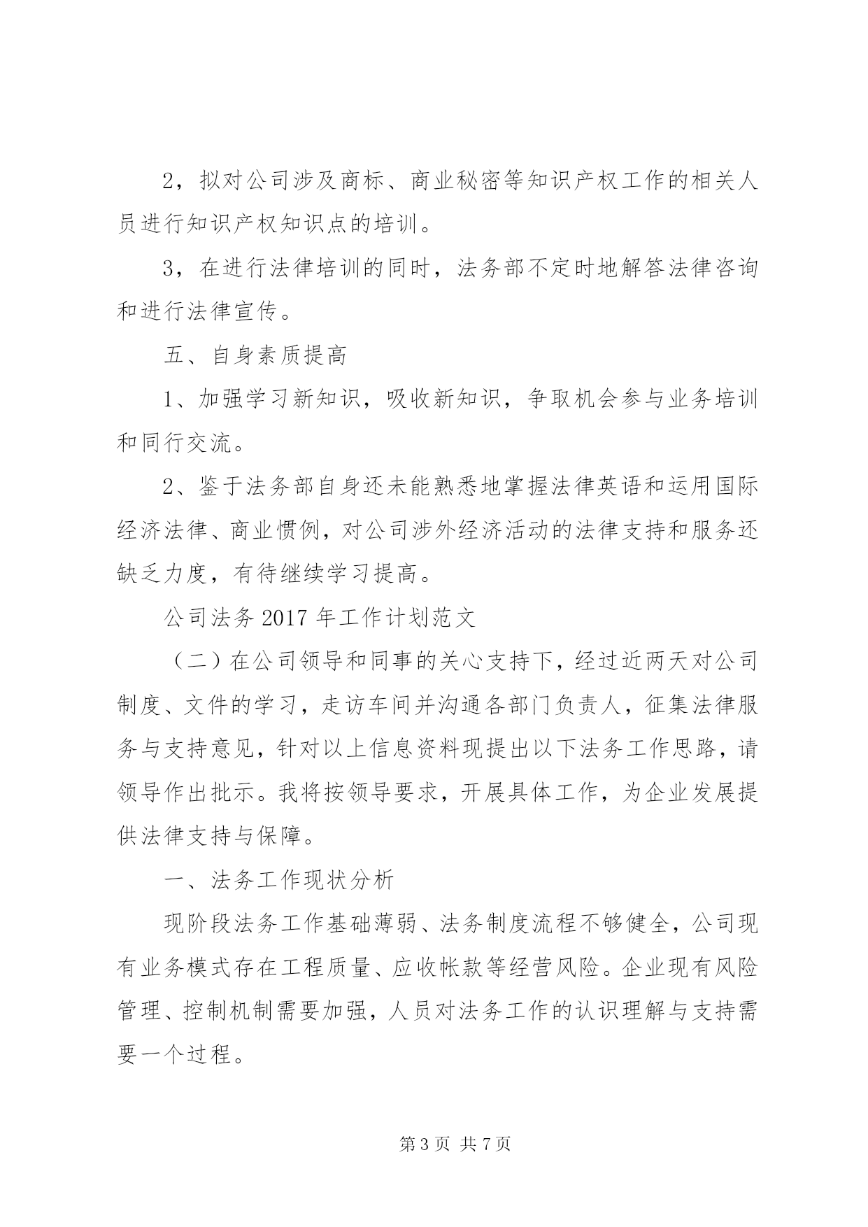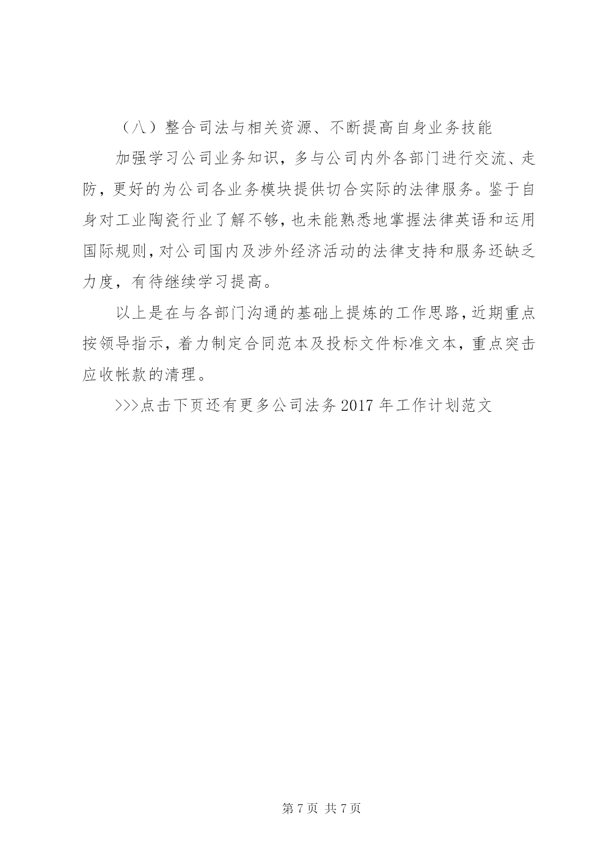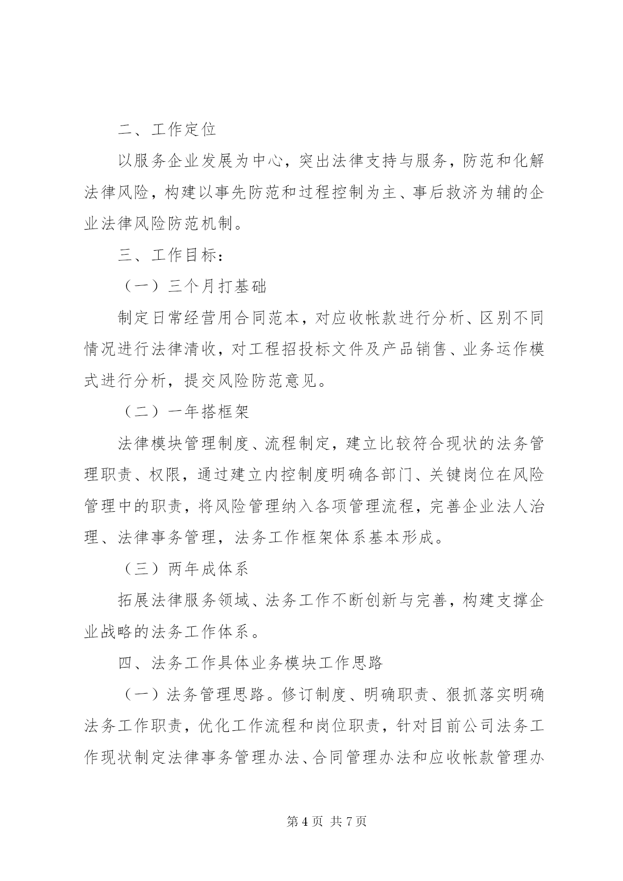 第PAGE\*Arabic\*MERGEFORMAT7页共NUMPAGES\*MERGEFORMAT7页公司法务XX年工作计划范文公司法务2017年工作计划范文(一)法务部根据目前公司的工作情况和工作需要,坚持以事前预防、事中控制为主、事后补救为辅为原则,以高效、高准确率和自律为法律服务准则,结合企业法律工作的特点和公司法律服务的实际需求,制定法务部工作计划。一、合同及法律文件的审核、起草1,协助巩固和完善合同及法律文件审核的机制,加强合同审核的有效性。2,进一步完善合同范本的修改和制作,使其更符合实际操作和公司利益。3,合同及其他法律文件审核保持自收到文本2小时内审核完毕,并提出相应的书面法律意见或进行相应的修改,但特殊情况除外。4,合同及其他法律文件的起草自详细了解相应的具体内容后4小时内完成,但特殊情况除外。5,加强合同管理,规范审批流程,完善管理制度,尽可能降低公司的法律风险。6,保持敢于直言的风格,大胆地提出合同中所在的风险和问题,为领导决策提供法律依据。二、法律补救功能中的计划1,协助公司有关管理部门及业务部门对公司债权进行清理和催收,接到相关要求后2天内开始行动。2,在清理和催收中,发现重***律问题立即向相关部门提出警示,同时向公司报告相关案情,使领导迅速作出决策。3,接到诉讼请求后,自领导批准之日起15日内完成法院立案。4,发现需诉讼的案件,有义务向公司报告情况,并建议提请领导批准起诉。5,对起诉或应诉案件的代理,大多数保持自行代理。6,做好诉讼前与对方当事人协调谈判工作,争取双赢。7,诉讼案件做到有求必应、认真负责、及时完成。三、知识产权管理计划1,与公司其他职能部门协作,争取申请XX省著名商标、驰名商标等荣誉,提高企业无形资产的含金量。2,按公司需求,高效、高准确率地完成商标的申办注册工作。3,做好商标、商业秘密等知识产权的管理和保护工作。四、法律培训和宣传计划1,根据公司的要求,积极配合有关部门,采用定期或不定期方式对公司所有在工作中需接触法律的业务、采购及管理人员进行相应的岗位法律培训。2,拟对公司涉及商标、商业秘密等知识产权工作的相关人员进行知识产权知识点的培训。3,在进行法律培训的同时,法务部不定时地解答法律咨询和进行法律宣传。五、自身素质提高1、加强学习新知识,吸收新知识,争取机会参与业务培训和同行交流。2、鉴于法务部自身还未能熟悉地掌握法律英语和运用国际经济法律、商业惯例,对公司涉外经济活动的法律支持和服务还缺乏力度,有待继续学习提高。公司法务2017年工作计划范文(二)在公司领导和同事的关心支持下,经过近两天对公司制度、文件的学习,走访车间并沟通各部门负责人,征集法律服务与支持意见,针对以上信息资料现提出以下法务工作思路,请领导作出批示。我将按领导要求,开展具体工作,为企业发展提供法律支持与保障。一、法务工作现状分析现阶段法务工作基础薄弱、法务制度流程不够健全,公司现有业务模式存在工程质量、应收帐款等经营风险。企业现有风险管理、控制机制需要加强,人员对法务工作的认识理解与支持需要一个过程。二、工作定位以服务企业发展为中心,突出法律支持与服务,防范和化解法律风险,构建以事先防范和过程控制为主、事后救济为辅的企业法律风险防范机制。三、工作目标:(一)三个月打基础制定日常经营用合同范本,对应收帐款进行分析、区别不同情况进行法律清收,对工程招投标文件及产品销售、业务运作模式进行分析,提交风险防范意见。(二)一年搭框架法律模块管理制度、流程制定,建立比较符合现状的法务管理职责、权限,通过建立内控制度明确各部门、关键岗位在风险管理中的职责,将风险管理纳入各项管理流程,完善企业法人治理、法律事务管理,法务工作框架体系基本形成。(三)两年成体系拓展法律服务领域、法务工作不断创新与完善,构建支撑企业战略的法务工作体系。四、法务工作具体业务模块工作思路(一)法务管理思路。修订制度、明确职责、狠抓落实明确法务工作职责,优化工作流程和岗位职责,针对目前公司法务工作现状制定法律事务管理办法、合同管理办法和应收帐款管理办法,构建公司内部法律风险的防范制度,经过宣传、培训后严格执行。(二)合同管理思路。夯实基础、强化管理、建立标本合同管理是企业运营的基础,规范合同审核与管理就把住了风险管理的关口,通过参与公司重大经济合同事前论证、合同签订跟踪、执行过程监控、后续事项的处理及完成效果的评估,夯实基础管理。通过建立合同管理台帐,建立重大合同动态跟踪制度,及时发现合同管理和企业经营管理中存在的问题,提出改进意见和建议。收集各部门日常签订的常用合同及投标文件,通过事前的修改和完善,以合同范本及标准投标文本指导业务部门进行投标、签订合同。(三)应收帐款处理思路。重点突出、法律维权、制度防范对公司现有的呆死