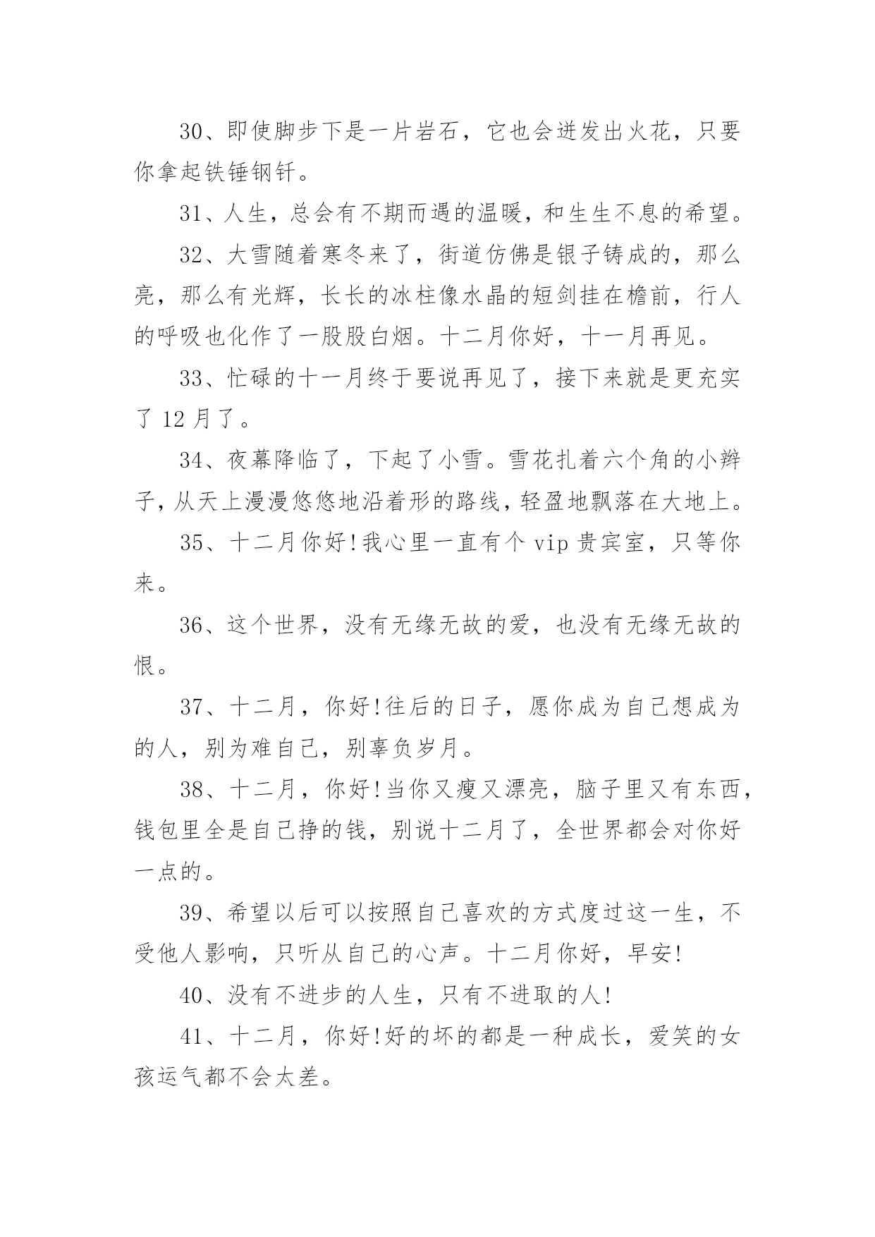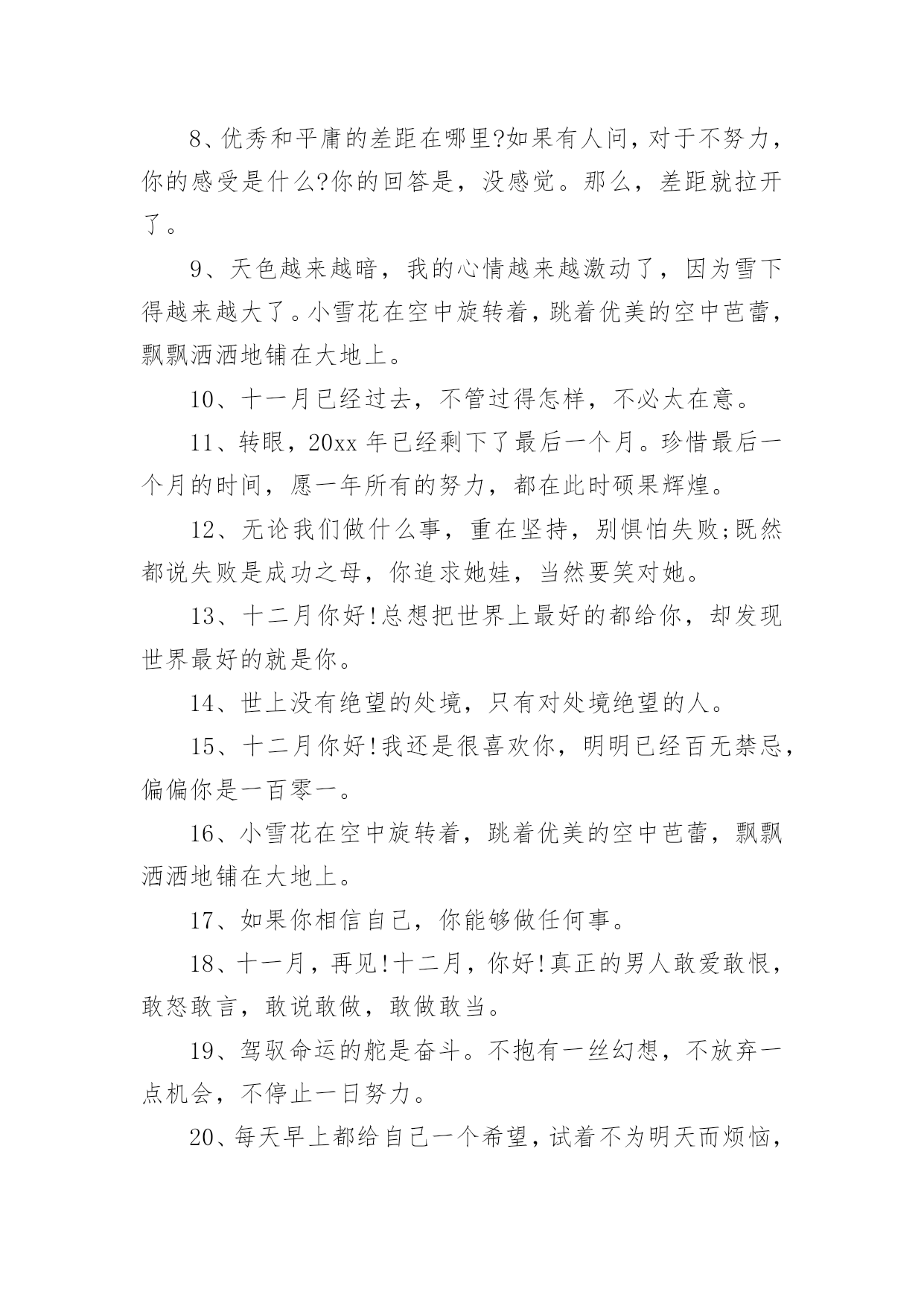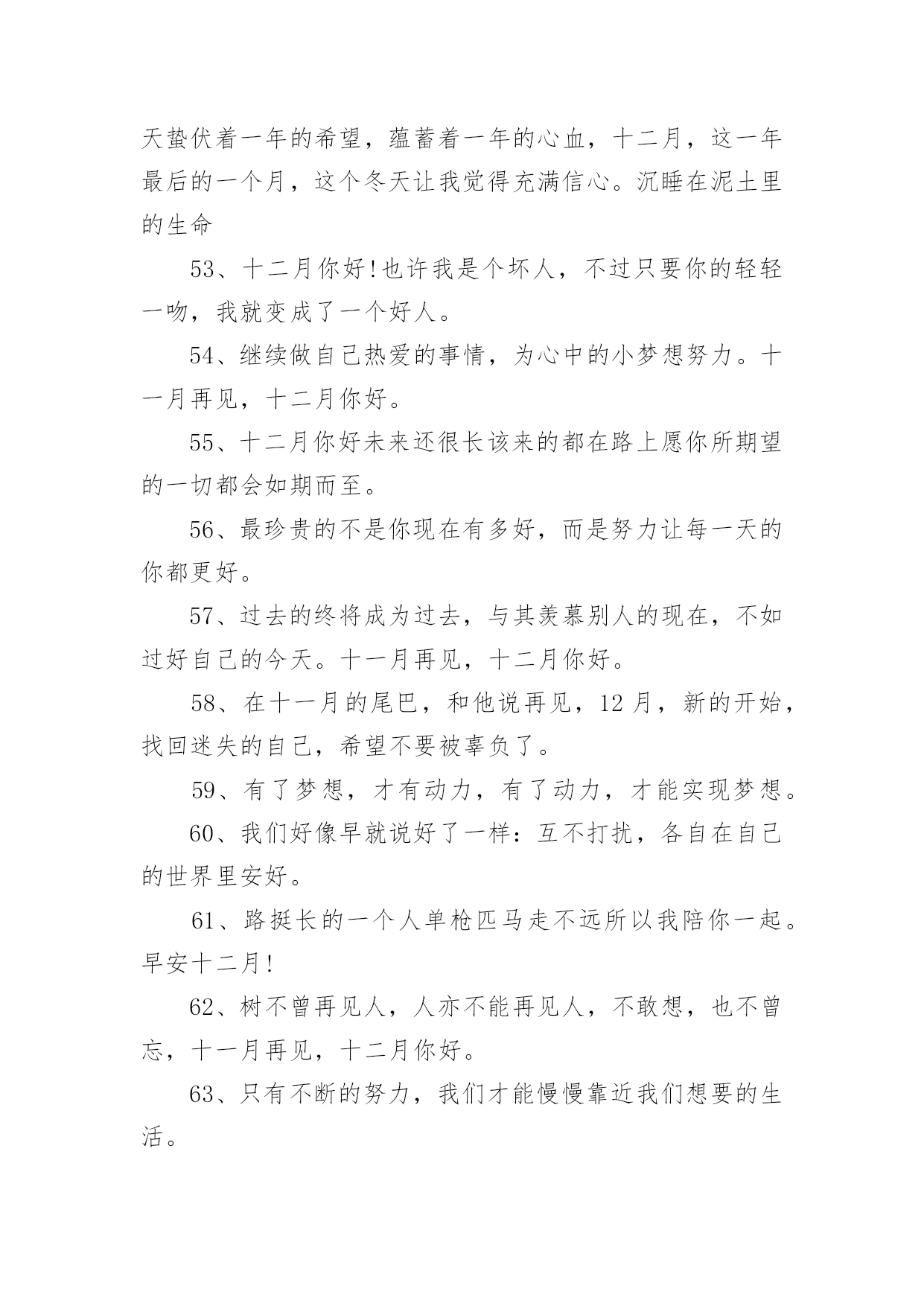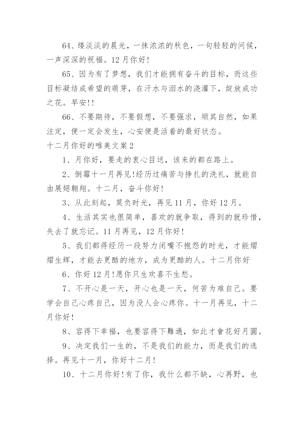 十二月你好的唯美文案十二月你好的唯美文案在平平淡淡的日常中,大家对文案都再熟悉不过了吧,文案用于分享自己的生活状态。还苦于找不到好的文案?下面是小编为大家收集的十二月你好的唯美文案,欢迎阅读,希望大家能够喜欢。十二月你好的唯美文案11、十二月你好!愿你足够的强大,一个人的路上也有勇气前行。2、新的一月开始了,也是20xx年最后一个月,今早依旧雾霾没看到阳光,只有心中充满阳光了。3、冬天,户外那粘满霜雪的柳树上尽是树挂,像是一根根银条悬挂在树上,格外壮观。十二月你好。4、十二月你好!不忆过往,不念未来,只想你陪我到海角天涯,地老天荒。5、我有我的梦想,所以我要努力。只有坚持这阵子,才不会辛苦一辈子,我发誓会努力,我会让自己过得很好。十一月,再见;十二月,你好!6、不论你在什么时候开始,重要的是开始之后就不要轻言放弃。7、十二月你好!恰似无边心海,我身陷其中,唯有你能渡我。恰似烈日灼灼,我喉咙干涩,唯有你能解渴。8、优秀和平庸的差距在哪里?如果有人问,对于不努力,你的感受是什么?你的回答是,没感觉。那么,差距就拉开了。9、天色越来越暗,我的心情越来越激动了,因为雪下得越来越大了。小雪花在空中旋转着,跳着优美的空中芭蕾,飘飘洒洒地铺在大地上。10、十一月已经过去,不管过得怎样,不必太在意。11、转眼,20xx年已经剩下了最后一个月。珍惜最后一个月的时间,愿一年所有的努力,都在此时硕果辉煌。12、无论我们做什么事,重在坚持,别惧怕失败;既然都说失败是成功之母,你追求她娃,当然要笑对她。13、十二月你好!总想把世界上最好的都给你,却发现世界最好的就是你。14、世上没有绝望的处境,只有对处境绝望的人。15、十二月你好!我还是很喜欢你,明明已经百无禁忌,偏偏你是一百零一。16、小雪花在空中旋转着,跳着优美的空中芭蕾,飘飘洒洒地铺在大地上。17、如果你相信自己,你能够做任何事。18、十一月,再见!十二月,你好!真正的男人敢爱敢恨,敢怒敢言,敢说敢做,敢做敢当。19、驾驭命运的舵是奋斗。不抱有一丝幻想,不放弃一点机会,不停止一日努力。20、每天早上都给自己一个希望,试着不为明天而烦恼,不为昨天而叹息,只为今天更美好。十一月,再见!十二月,早安!21、十二月你好!新的一天,新的开始,新的一月,新的心情,感谢朋友圈让我们互相祝福,感谢你我之间情谊一直都在,愿你的每天都幸福。22、我的家乡是一片黑色的土地,铺在地里的麦子揣着春天的绿意。十二月的罡风提着剪刀,疯狂地把日子修剪。雀鸟归隐山林,呜咽的风呼唤放牧的孩子。炊烟,把天空熏得黝黑黝黑的。23、很多时候,为了求得真正的幸福,我们需要保持耐心。因为真正的幸福不会很快到来,也不会轻易到来,但它值得等待。24、你现在不为自己以后想过的生活努力,以后全是你不想过的生活。25、让自信和坚持成为一种品质和内涵,在意多了,乐趣就少了;看得淡了,一切皆释然。十二月你好,早安。26、未来的路很长,我们一起走。你好十二月。27、窗外纷飞的蝶儿缓缓落下,洁白的羽翼在空中闪烁着光芒。窗内,窗外,在这一刹那间,忽都成了无边的静寂。28、最痛苦的不是失败的泪水,而是不曾竭尽全力的懊悔,别让明天的你,讨厌今天的自己,十一月再见,十二月:你好,别来无恙。还有一个月,想做什么依旧来得及!12月,早安!29、生活有好有坏,我们努力将坏的变成好的。30、即使脚步下是一片岩石,它也会迸发出火花,只要你拿起铁锤钢钎。31、人生,总会有不期而遇的温暖,和生生不息的希望。32、大雪随着寒冬来了,街道仿佛是银子铸成的,那么亮,那么有光辉,长长的冰柱像水晶的短剑挂在檐前,行人的呼吸也化作了一股股白烟。十二月你好,十一月再见。33、忙碌的十一月终于要说再见了,接下来就是更充实了12月了。34、夜幕降临了,下起了小雪。雪花扎着六个角的小辫子,从天上漫漫悠悠地沿着形的路线,轻盈地飘落在大地上。35、十二月你好!我心里一直有个vip贵宾室,只等你来。36、这个世界,没有无缘无故的爱,也没有无缘无故的恨。37、十二月,你好!往后的日子,愿你成为自己想成为的人,别为难自己,别辜负岁月。38、十二月,你好!当你又瘦又漂亮,脑子里又有东西,钱包里全是自己挣的钱,别说十二月了,全世界都会对你好一点的。39、希望以后可以按照自己喜欢的方式度过这一生,不受他人影响,只听从自己的心声。十二月你好,早安!40、没有不进步的人生,只有不进取的人!41、十二月,你好!好的坏的都是一种成长,爱笑的女孩运气都不会太差。42、我们都在时光里跌跌撞撞的成长,然后一点点离开最初的模样。当成熟代替了幼稚,当脆弱败给了坚强,我们一定会走到自己曾经憧憬过的地方。12月,早安!43、十一月再见,十二月你好。努力的女人总是会告诉自己:所有的美好都会不期而遇。44、岁月更替,四季轮回,一叶知秋,