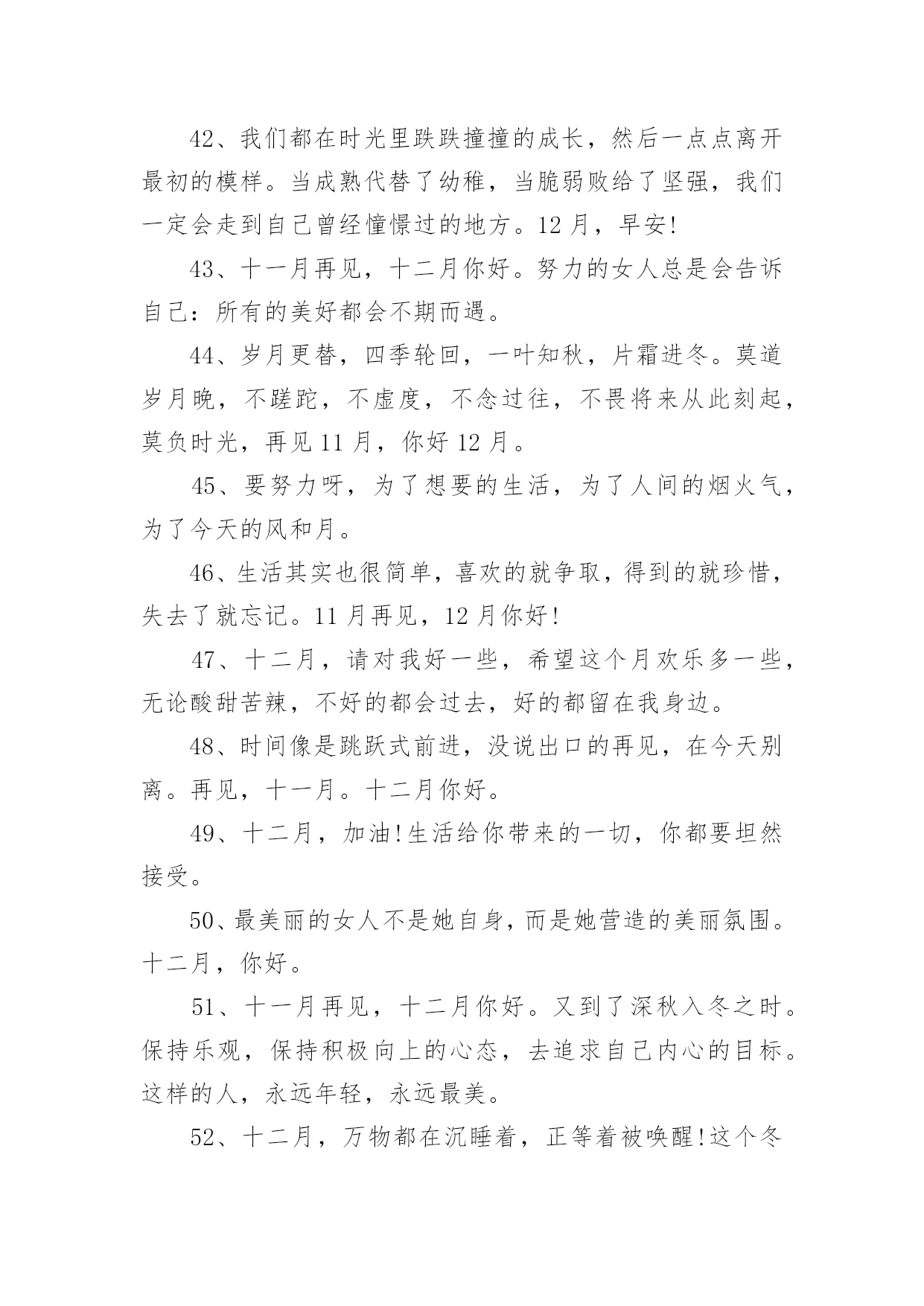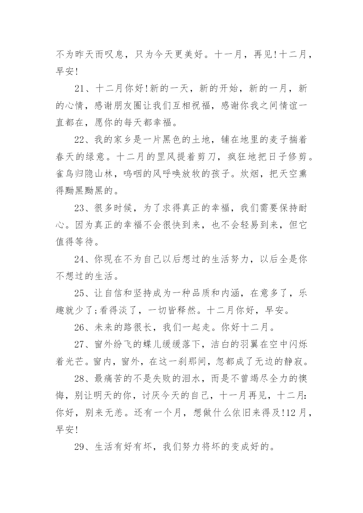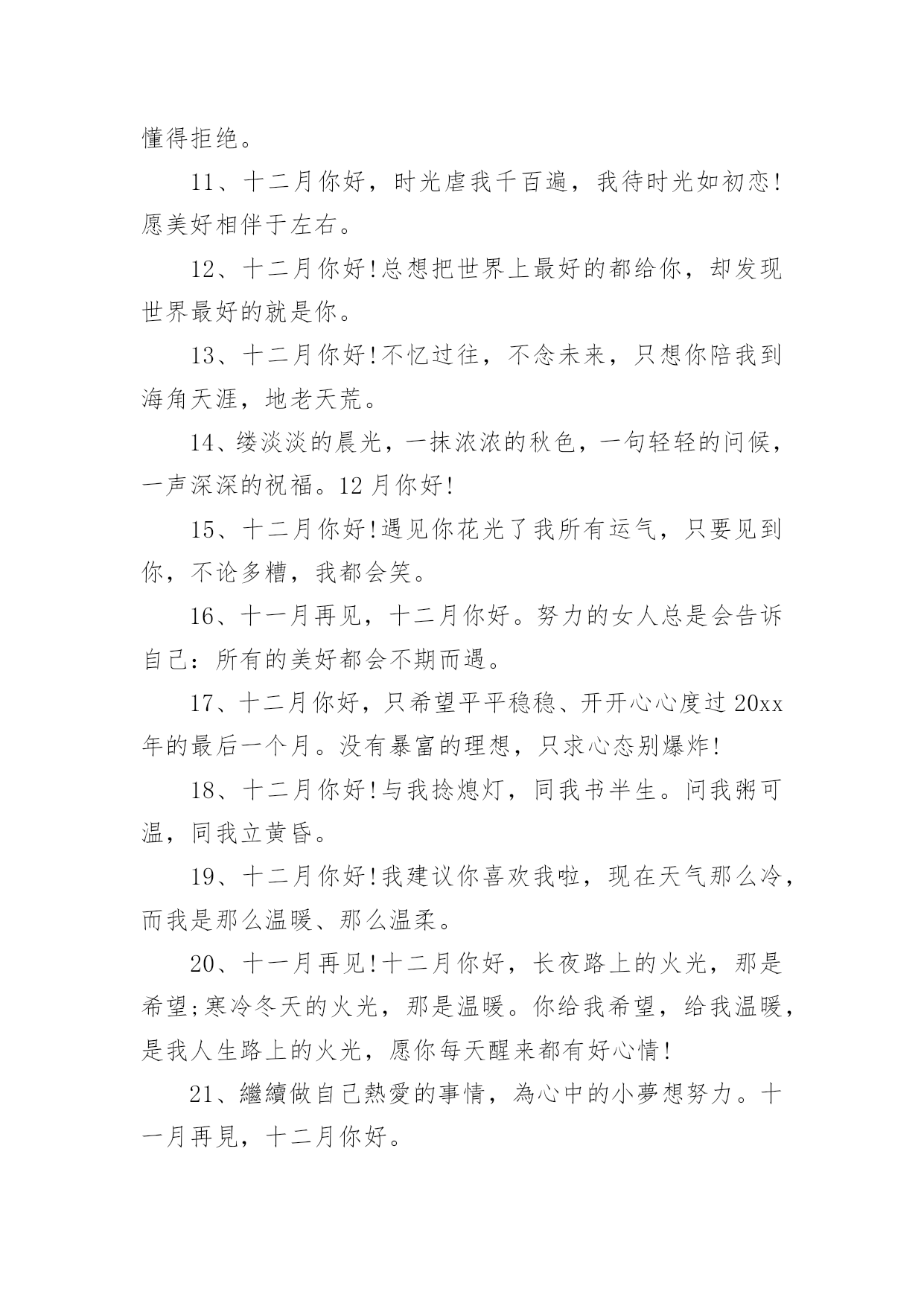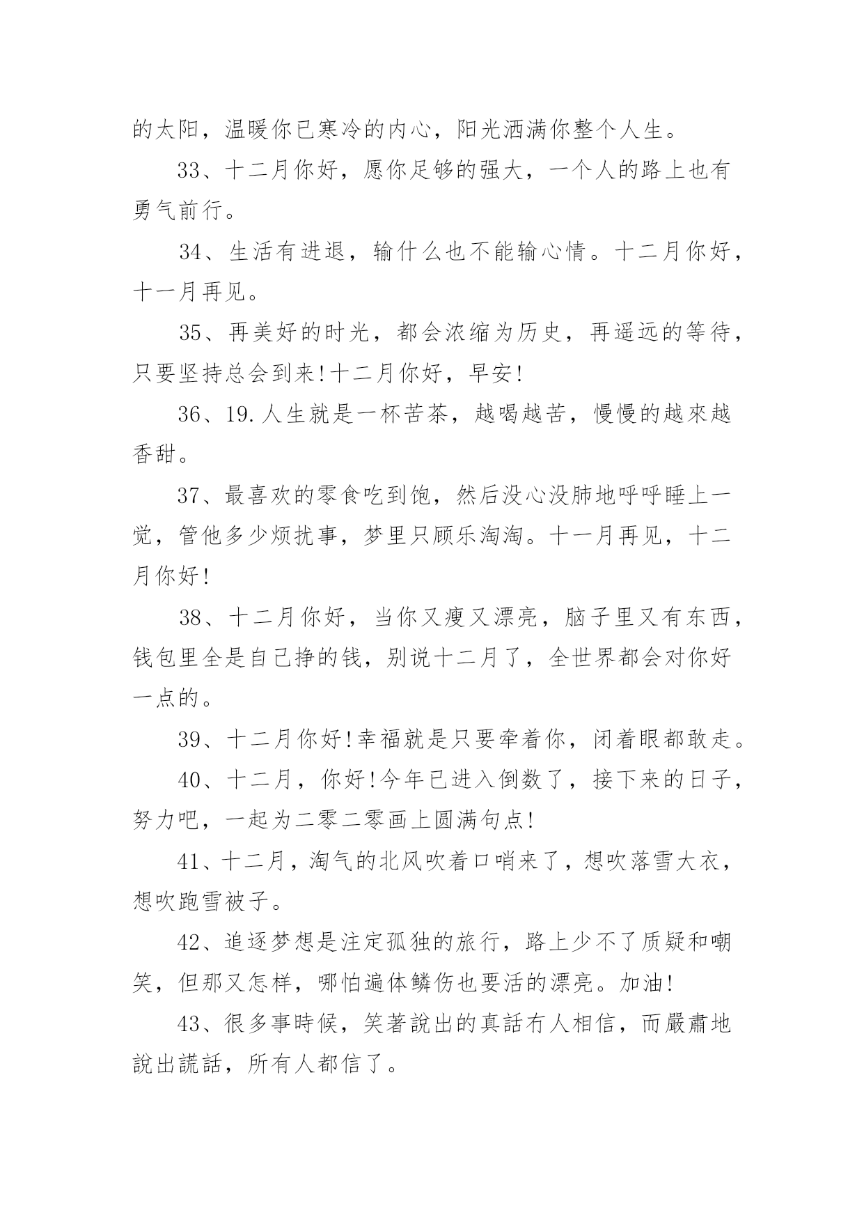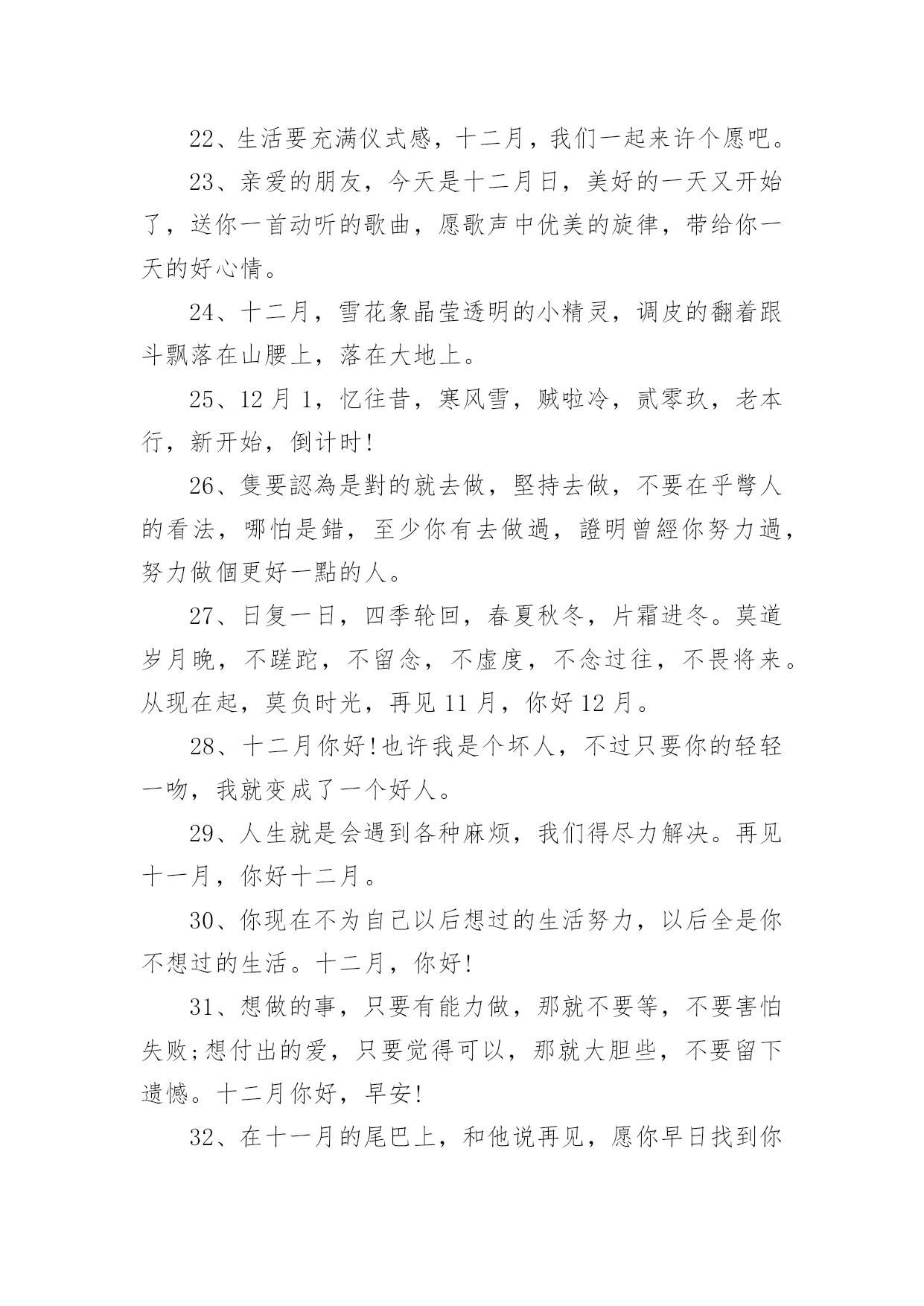 十二月你好的唯美文案十二月你好的唯美文案在平平淡淡的日常中,大家对文案都再熟悉不过了吧,文案用于分享自己的生活状态。还苦于找不到好的文案?下面是小编为大家收集的十二月你好的唯美文案,欢迎阅读,希望大家能够喜欢。十二月你好的唯美文案11、十二月你好!愿你足够的强大,一个人的路上也有勇气前行。2、新的一月开始了,也是20xx年最后一个月,今早依旧雾霾没看到阳光,只有心中充满阳光了。3、冬天,户外那粘满霜雪的柳树上尽是树挂,像是一根根银条悬挂在树上,格外壮观。十二月你好。4、十二月你好!不忆过往,不念未来,只想你陪我到海角天涯,地老天荒。5、我有我的梦想,所以我要努力。只有坚持这阵子,才不会辛苦一辈子,我发誓会努力,我会让自己过得很好。十一月,再见;十二月,你好!6、不论你在什么时候开始,重要的是开始之后就不要轻言放弃。7、十二月你好!恰似无边心海,我身陷其中,唯有你能渡我。恰似烈日灼灼,我喉咙干涩,唯有你能解渴。8、优秀和平庸的差距在哪里?如果有人问,对于不努力,你的感受是什么?你的回答是,没感觉。那么,差距就拉开了。9、天色越来越暗,我的心情越来越激动了,因为雪下得越来越大了。小雪花在空中旋转着,跳着优美的空中芭蕾,飘飘洒洒地铺在大地上。10、十一月已经过去,不管过得怎样,不必太在意。11、转眼,20xx年已经剩下了最后一个月。珍惜最后一个月的时间,愿一年所有的努力,都在此时硕果辉煌。12、无论我们做什么事,重在坚持,别惧怕失败;既然都说失败是成功之母,你追求她娃,当然要笑对她。13、十二月你好!总想把世界上最好的都给你,却发现世界最好的就是你。14、世上没有绝望的处境,只有对处境绝望的人。15、十二月你好!我还是很喜欢你,明明已经百无禁忌,偏偏你是一百零一。16、小雪花在空中旋转着,跳着优美的空中芭蕾,飘飘洒洒地铺在大地上。17、如果你相信自己,你能够做任何事。18、十一月,再见!十二月,你好!真正的男人敢爱敢恨,敢怒敢言,敢说敢做,敢做敢当。19、驾驭命运的舵是奋斗。不抱有一丝幻想,不放弃一点机会,不停止一日努力。20、每天早上都给自己一个希望,试着不为明天而烦恼,不为昨天而叹息,只为今天更美好。十一月,再见!十二月,早安!21、十二月你好!新的一天,新的开始,新的一月,新的心情,感谢朋友圈让我们互相祝福,感谢你我之间情谊一直都在,愿你的每天都幸福。22、我的家乡是一片黑色的土地,铺在地里的麦子揣着春天的绿意。十二月的罡风提着剪刀,疯狂地把日子修剪。雀鸟归隐山林,呜咽的风呼唤放牧的孩子。炊烟,把天空熏得黝黑黝黑的。23、很多时候,为了求得真正的幸福,我们需要保持耐心。因为真正的幸福不会很快到来,也不会轻易到来,但它值得等待。24、你现在不为自己以后想过的生活努力,以后全是你不想过的生活。25、让自信和坚持成为一种品质和内涵,在意多了,乐趣就少了;看得淡了,一切皆释然。十二月你好,早安。26、未来的路很长,我们一起走。你好十二月。27、窗外纷飞的蝶儿缓缓落下,洁白的羽翼在空中闪烁着光芒。窗内,窗外,在这一刹那间,忽都成了无边的静寂。28、最痛苦的不是失败的泪水,而是不曾竭尽全力的懊悔,别让明天的你,讨厌今天的自己,十一月再见,十二月:你好,别来无恙。还有一个月,想做什么依旧来得及!12月,早安!29、生活有好有坏,我们努力将坏的变成好的。30、即使脚步下是一片岩石,它也会迸发出火花,只要你拿起铁锤钢钎。31、人生,总会有不期而遇的温暖,和生生不息的希望。32、大雪随着寒冬来了,街道仿佛是银子铸成的,那么亮,那么有光辉,长长的冰柱像水晶的短剑挂在檐前,行人的呼吸也化作了一股股白烟。十二月你好,十一月再见。33、忙碌的十一月终于要说再见了,接下来就是更充实了12月了。34、夜幕降临了,下起了小雪。雪花扎着六个角的小辫子,从天上漫漫悠悠地沿着形的路线,轻盈地飘落在大地上。35、十二月你好!我心里一直有个vip贵宾室,只等你来。36、这个世界,没有无缘无故的爱,也没有无缘无故的恨。37、十二月,你好!往后的日子,愿你成为自己想成为的人,别为难自己,别辜负岁月。38、十二月,你好!当你又瘦又漂亮,脑子里又有东西,钱包里全是自己挣的钱,别说十二月了,全世界都会对你好一点的。39、希望以后可以按照自己喜欢的方式度过这一生,不受他人影响,只听从自己的心声。十二月你好,早安!40、没有不进步的人生,只有不进取的人!41、十二月,你好!好的坏的都是一种成长,爱笑的女孩运气都不会太差。42、我们都在时光里跌跌撞撞的成长,然后一点点离开最初的模样。当成熟代替了幼稚,当脆弱败给了坚强,我们一定会走到自己曾经憧憬过的地方。12月,早安!43、十一月再见,十二月你好。努力的女人总是会告诉自己:所有的美好都会不期而遇。44、岁月更替,四季轮回,一叶知秋,