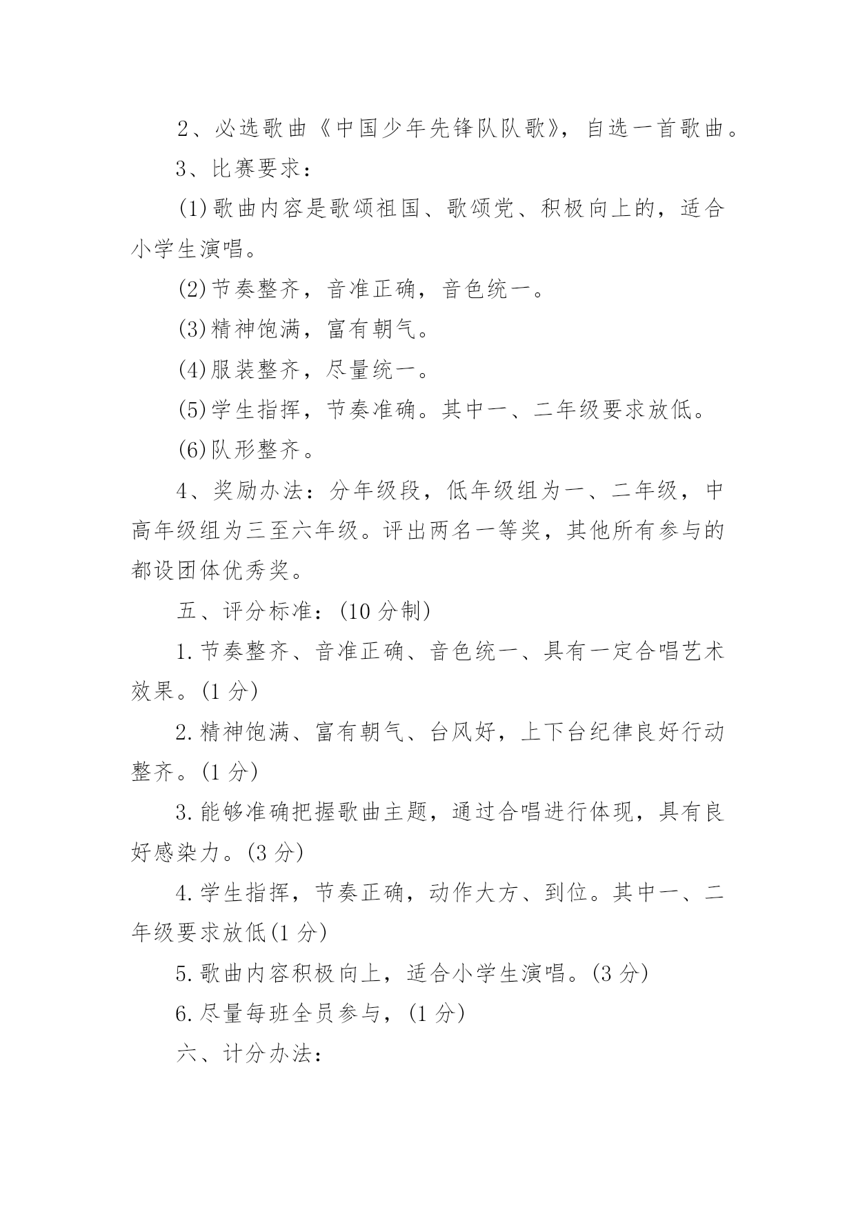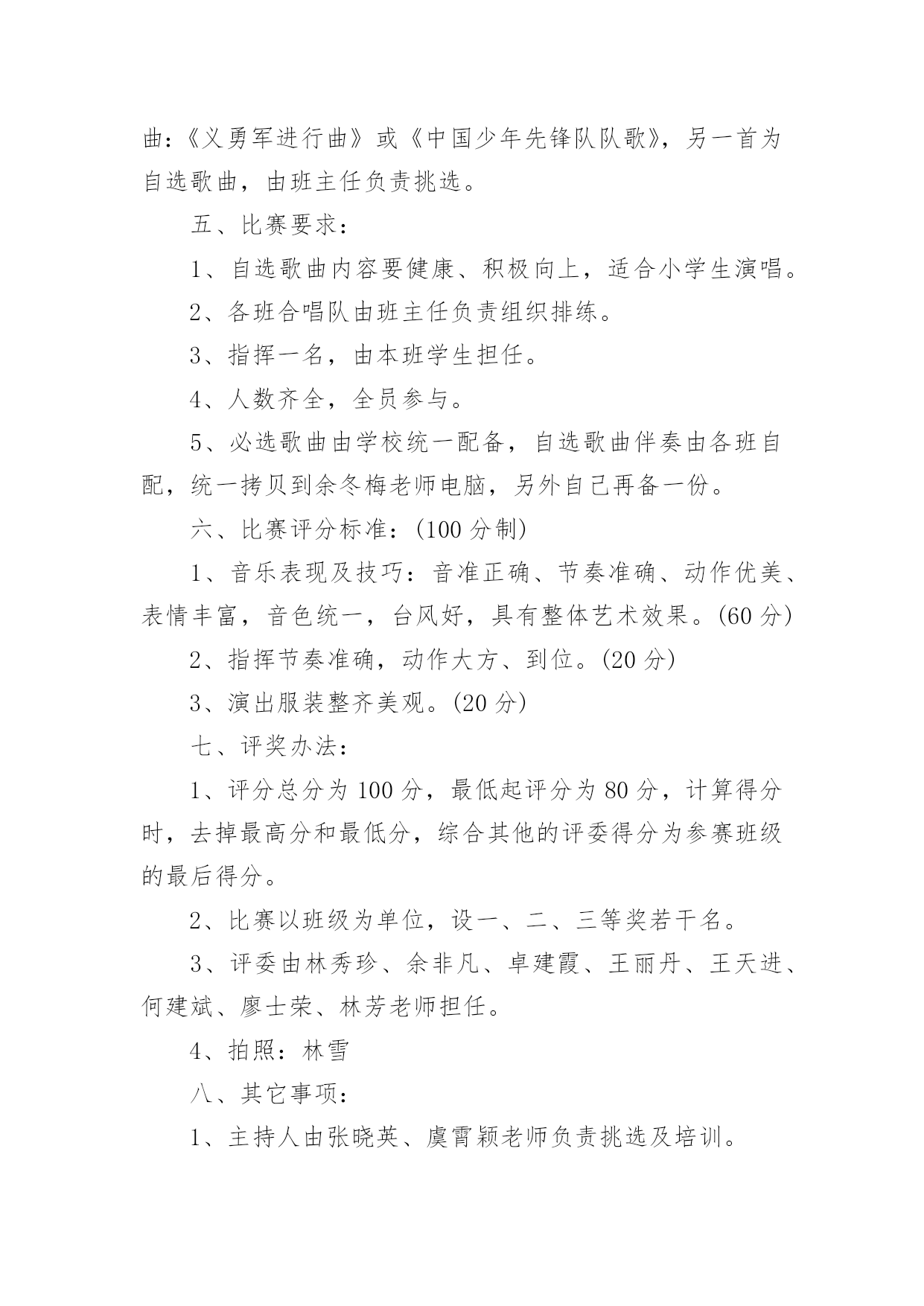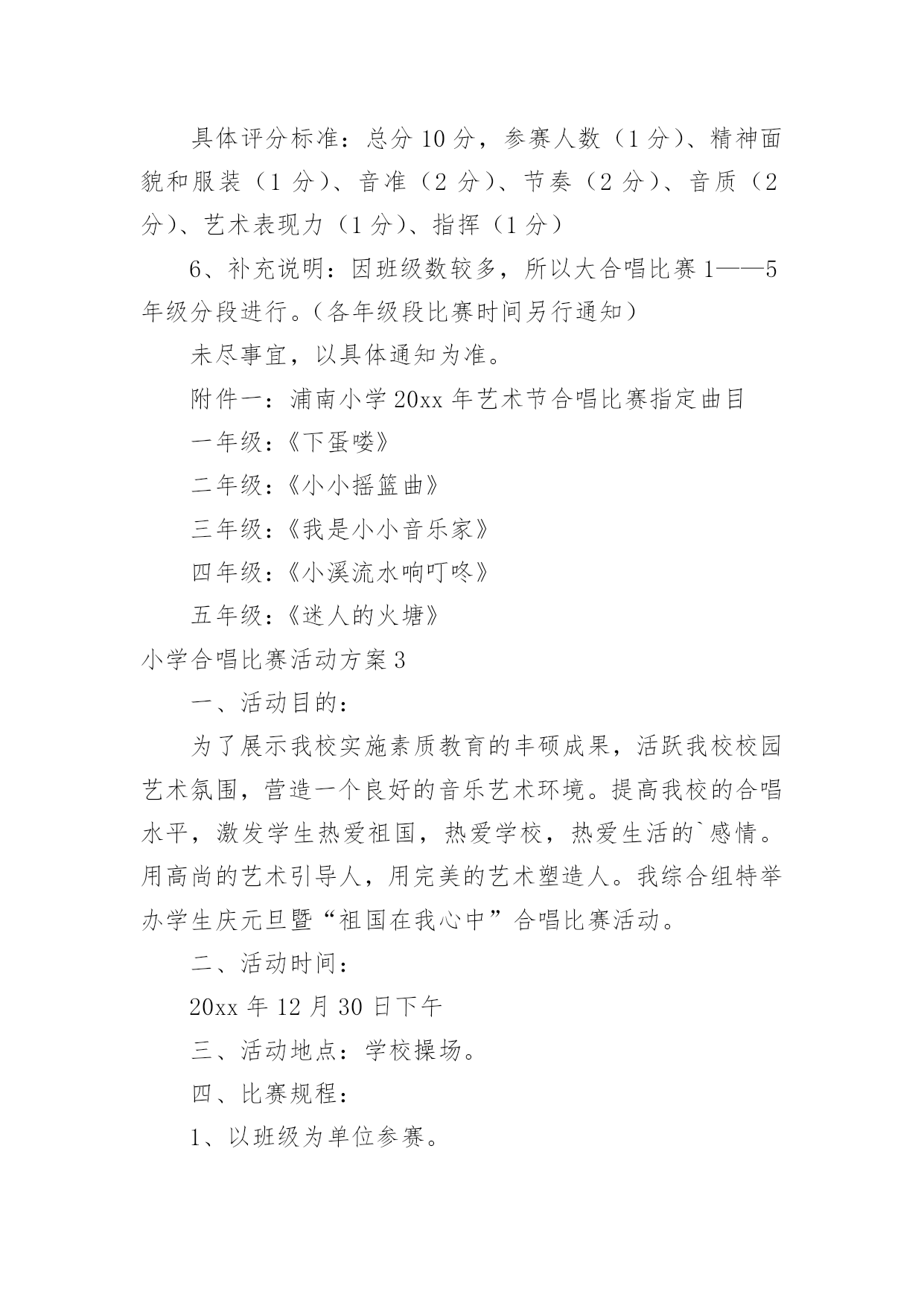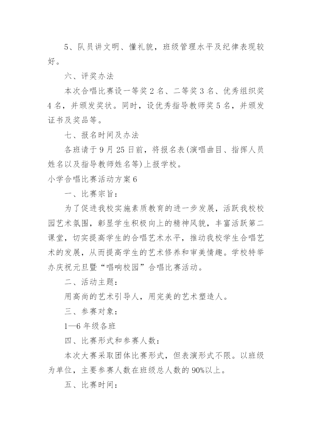 小学合唱比赛活动方案小学合唱比赛活动方案(9篇)为确保事情或工作高质量高水平开展,时常需要预先开展方案准备工作,方案一般包括指导思想、主要目标、工作重点、实施步骤、政策措施、具体要求等项目。那么什么样的方案才是好的呢?以下是小编为大家整理的小学合唱比赛活动方案,供大家参考借鉴,希望可以帮助到有需要的朋友。小学合唱比赛活动方案1为迎接建国六十周年,充分展示新区近7000余名小学生积极向上的精神风貌,并选拔推荐参加省市级比赛活动,决定举行浑南新区第二届小学生合唱比赛活动,具体方案如下:一、活动时间20xx年6月29日(暂定)二、参赛对象新区各小学、九年一贯制学校小学部的在校就读学生。三、比赛地点音乐学院南校区(暂定)四、比赛要求1、人数要求:此次合唱比赛除浑南三校合唱人数不少于30人外,其他学校则必须保证参加合唱的`人数为50人以上。其中男生比例不得低于10%。2、曲目要求:每支参赛队伍必须演唱两首曲目,其中一首为规定曲目——《春天在哪里》,另一首为自选曲目。自选曲目要求作品内容要健康向上,贴近学生生活,且合唱曲目的风格和难度要符合青少年儿童的年龄特点,具有较高的艺术性。3、伴奏、指挥要求:合唱比赛的伴奏原则上要求用钢琴伴奏,或至少用一种定音乐器,禁止用电声乐队等乐队伴奏。学生团队的伴奏和指挥一律由本校教师或学生担任。4、鼓励演唱形式的创新。五、评比标准1、符合本次合唱比赛活动的选曲要求,正确表达歌曲的思想内容,情绪饱满、表现力强,富有朝气。2、音准好、节奏感强,吐字清楚、声音和谐统一。3、歌曲处理得当,艺术表现力强,表现形式有创新。4、伴奏与合唱配合默契,指挥能真正成为合唱团的灵魂。5、服装整齐大方,体现师生风采,精神风貌好。6、队员讲文明、懂礼貌,队伍管理水平及纪律表现较好。六、评奖办法浑南新区第二届小学生合唱比赛设一等奖2名、二等奖3名、优秀组织奖4名,并颁发奖状。同时,设优秀指挥奖、优秀伴奏奖及优秀指导教师奖各1名,并颁发证书及奖品等。七、报名时间及办法各学校请于6月15日前,将报名表(演唱曲目及演唱时间、指挥人员姓名、伴奏人员姓名以及指导教师姓名等)上报浑南教育邮箱。八、其他比赛的领队会议则另行通知,望密切关注近期浑南教育网上的相关通知要求。小学合唱比赛活动方案2一、比赛时间:20xx年6月1日(具体时间由各校区安排)二、比赛地点:各校区自行安排。三、比赛要求:1、表演形式:演唱歌曲两首,一首指定(附件1:各年级段指定歌曲),一首自选,时间不超过8分钟,无扩音设备。2、伴奏形式:一律由cd或vcd伴奏。(指定歌曲伴奏带由音乐老师提供,自选歌曲由班主任准备。)3、参赛名额:全班参加。(本次比赛班级人数将作为评分标准之一,如有学生因身体患病无法参赛,需在比赛前及时告知)4、合唱指挥一人,可以由学生担任,也可以由班主任或家长指挥。(本校音乐老师除外)5、评分标准及得分安排:合唱计参赛分50分,一、二、三等奖记分为30分、20分、10分。具体评分标准:总分10分,参赛人数(1分)、精神面貌和服装(1分)、音准(2分)、节奏(2分)、音质(2分)、艺术表现力(1分)、指挥(1分)6、补充说明:因班级数较多,所以大合唱比赛1——5年级分段进行。(各年级段比赛时间另行通知)未尽事宜,以具体通知为准。附件一:浦南小学20xx年艺术节合唱比赛指定曲目一年级:《下蛋喽》二年级:《小小摇篮曲》三年级:《我是小小音乐家》四年级:《小溪流水响叮咚》五年级:《迷人的火塘》小学合唱比赛活动方案3一、活动目的:为了展示我校实施素质教育的丰硕成果,活跃我校校园艺术氛围,营造一个良好的音乐艺术环境。提高我校的合唱水平,激发学生热爱祖国,热爱学校,热爱生活的`感情。用高尚的艺术引导人,用完美的艺术塑造人。我综合组特举办学生庆元旦暨“祖国在我心中”合唱比赛活动。二、活动时间:20xx年12月30日下午三、活动地点:学校操场。四、比赛规程:1、以班级为单位参赛。2、必选歌曲《中国少年先锋队队歌》,自选一首歌曲。3、比赛要求:(1)歌曲内容是歌颂祖国、歌颂党、积极向上的,适合小学生演唱。(2)节奏整齐,音准正确,音色统一。(3)精神饱满,富有朝气。(4)服装整齐,尽量统一。(5)学生指挥,节奏准确。其中一、二年级要求放低。(6)队形整齐。4、奖励办法:分年级段,低年级组为一、二年级,中高年级组为三至六年级。评出两名一等奖,其他所有参与的都设团体优秀奖。五、评分标准:(10分制)1.节奏整齐、音准正确、音色统一、具有一定合唱艺术效果。(1分)2.精神饱满、富有朝气、台风好,上下台纪律良好行动整齐。(1分)3.能够准确把握歌曲主题,通过合唱进行体现,具有良好感染力。(3分)4.学生指挥,节奏正确,动作大方、到位。其中一、二年级要求放低(1分)5.歌曲内容积极向上,