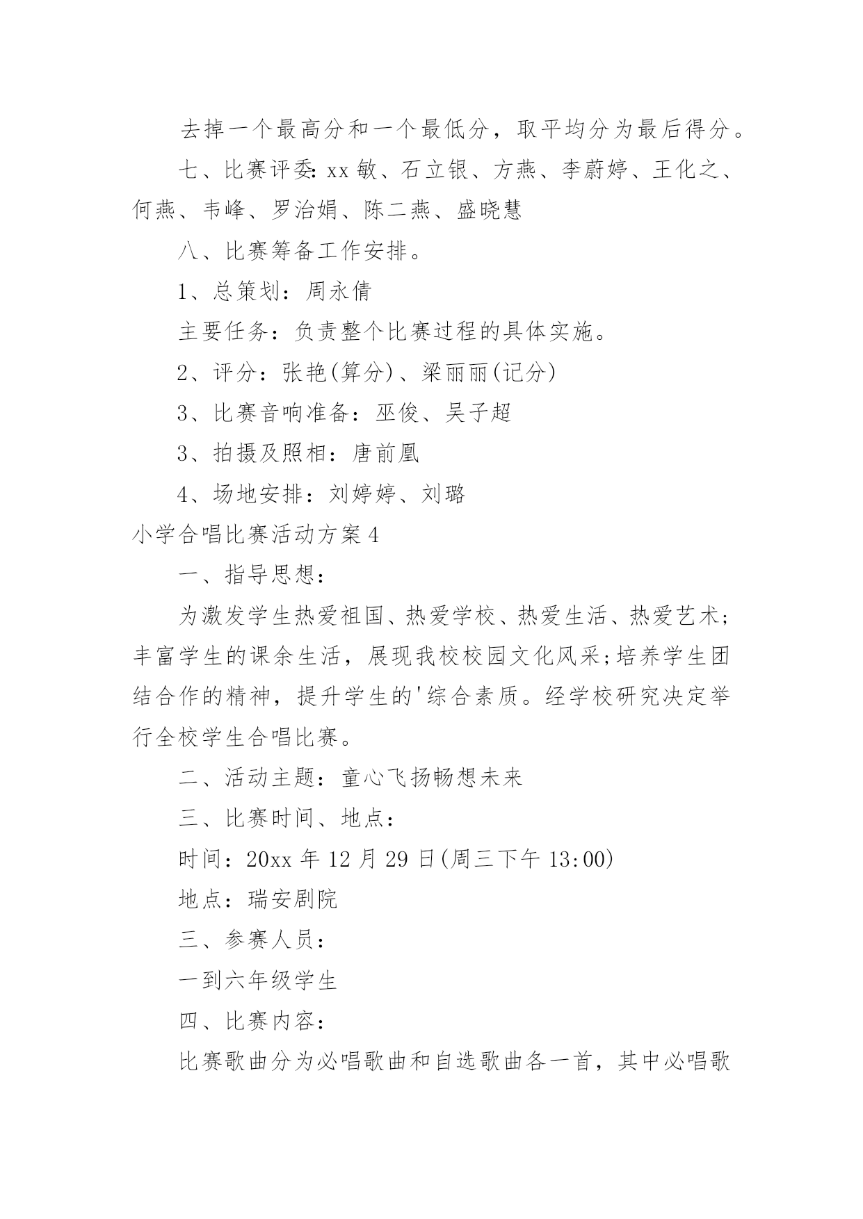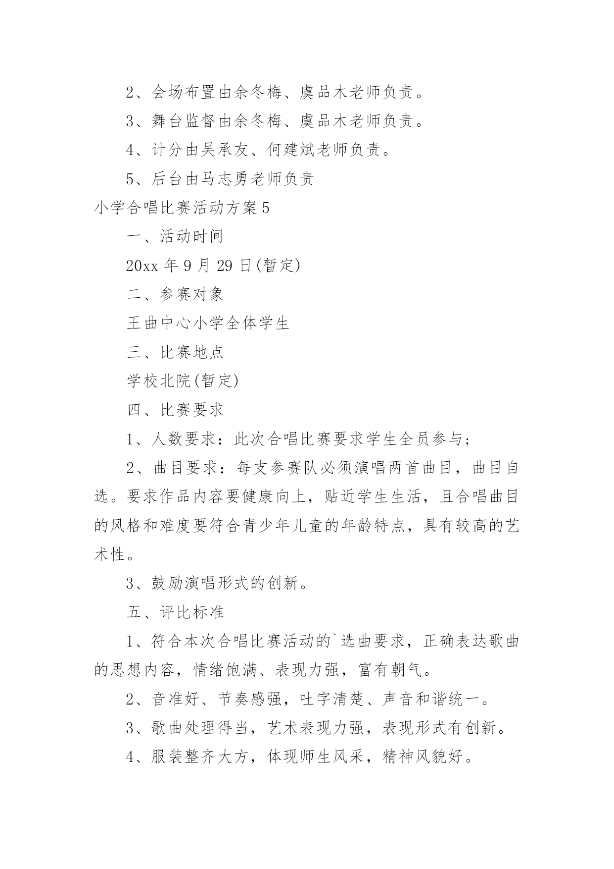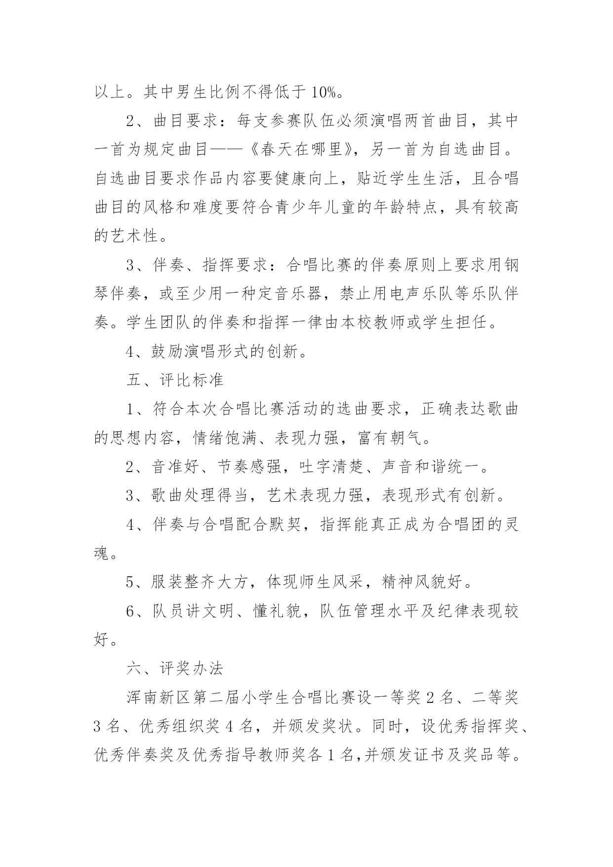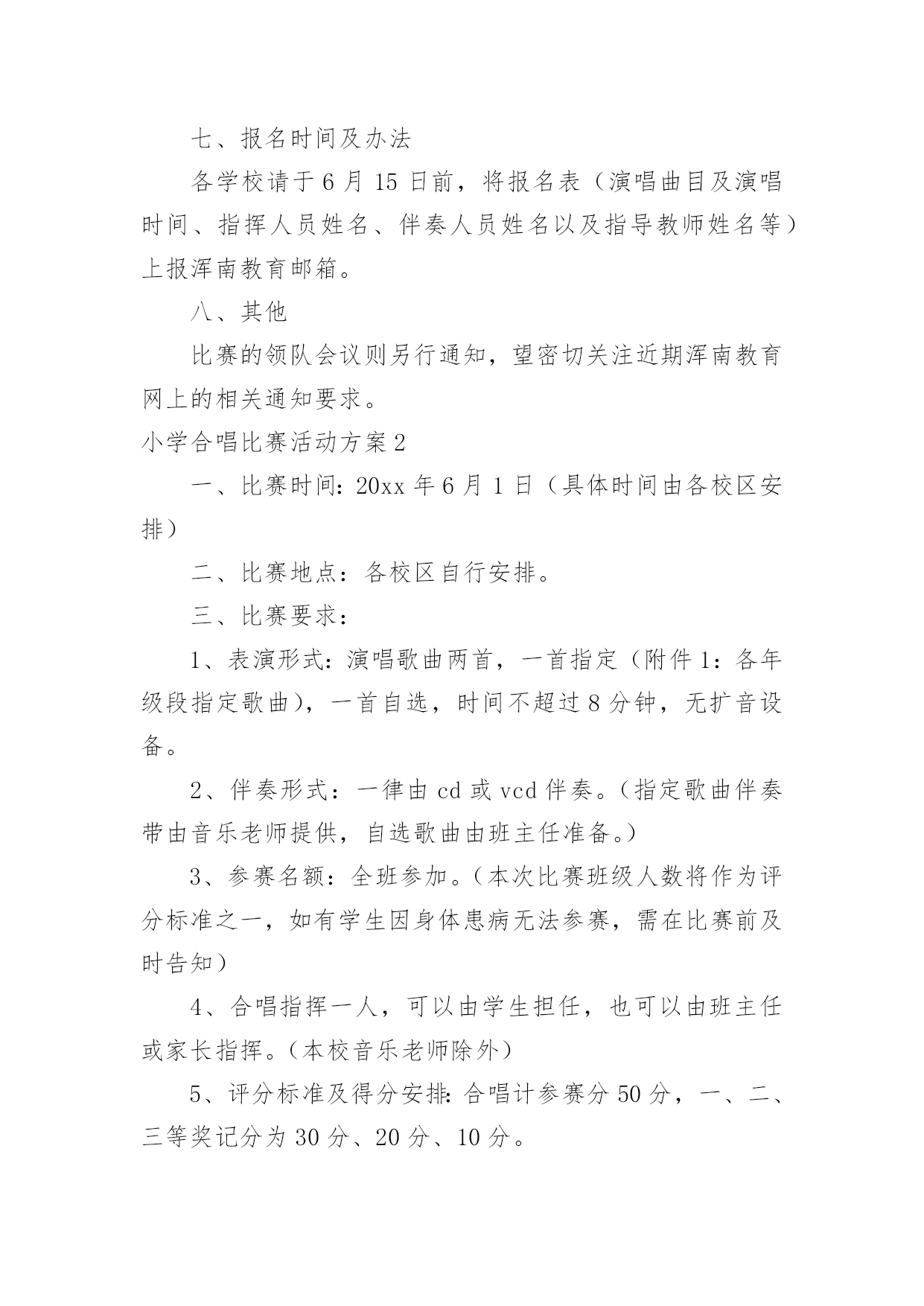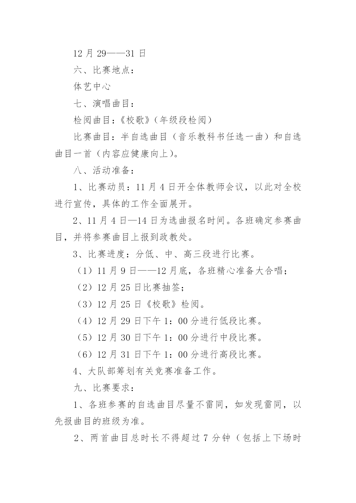 小学合唱比赛活动方案小学合唱比赛活动方案(9篇)为确保事情或工作高质量高水平开展,时常需要预先开展方案准备工作,方案一般包括指导思想、主要目标、工作重点、实施步骤、政策措施、具体要求等项目。那么什么样的方案才是好的呢?以下是小编为大家整理的小学合唱比赛活动方案,供大家参考借鉴,希望可以帮助到有需要的朋友。小学合唱比赛活动方案1为迎接建国六十周年,充分展示新区近7000余名小学生积极向上的精神风貌,并选拔推荐参加省市级比赛活动,决定举行浑南新区第二届小学生合唱比赛活动,具体方案如下:一、活动时间20xx年6月29日(暂定)二、参赛对象新区各小学、九年一贯制学校小学部的在校就读学生。三、比赛地点音乐学院南校区(暂定)四、比赛要求1、人数要求:此次合唱比赛除浑南三校合唱人数不少于30人外,其他学校则必须保证参加合唱的`人数为50人以上。其中男生比例不得低于10%。2、曲目要求:每支参赛队伍必须演唱两首曲目,其中一首为规定曲目——《春天在哪里》,另一首为自选曲目。自选曲目要求作品内容要健康向上,贴近学生生活,且合唱曲目的风格和难度要符合青少年儿童的年龄特点,具有较高的艺术性。3、伴奏、指挥要求:合唱比赛的伴奏原则上要求用钢琴伴奏,或至少用一种定音乐器,禁止用电声乐队等乐队伴奏。学生团队的伴奏和指挥一律由本校教师或学生担任。4、鼓励演唱形式的创新。五、评比标准1、符合本次合唱比赛活动的选曲要求,正确表达歌曲的思想内容,情绪饱满、表现力强,富有朝气。2、音准好、节奏感强,吐字清楚、声音和谐统一。3、歌曲处理得当,艺术表现力强,表现形式有创新。4、伴奏与合唱配合默契,指挥能真正成为合唱团的灵魂。5、服装整齐大方,体现师生风采,精神风貌好。6、队员讲文明、懂礼貌,队伍管理水平及纪律表现较好。六、评奖办法浑南新区第二届小学生合唱比赛设一等奖2名、二等奖3名、优秀组织奖4名,并颁发奖状。同时,设优秀指挥奖、优秀伴奏奖及优秀指导教师奖各1名,并颁发证书及奖品等。七、报名时间及办法各学校请于6月15日前,将报名表(演唱曲目及演唱时间、指挥人员姓名、伴奏人员姓名以及指导教师姓名等)上报浑南教育邮箱。八、其他比赛的领队会议则另行通知,望密切关注近期浑南教育网上的相关通知要求。小学合唱比赛活动方案2一、比赛时间:20xx年6月1日(具体时间由各校区安排)二、比赛地点:各校区自行安排。三、比赛要求:1、表演形式:演唱歌曲两首,一首指定(附件1:各年级段指定歌曲),一首自选,时间不超过8分钟,无扩音设备。2、伴奏形式:一律由cd或vcd伴奏。(指定歌曲伴奏带由音乐老师提供,自选歌曲由班主任准备。)3、参赛名额:全班参加。(本次比赛班级人数将作为评分标准之一,如有学生因身体患病无法参赛,需在比赛前及时告知)4、合唱指挥一人,可以由学生担任,也可以由班主任或家长指挥。(本校音乐老师除外)5、评分标准及得分安排:合唱计参赛分50分,一、二、三等奖记分为30分、20分、10分。具体评分标准:总分10分,参赛人数(1分)、精神面貌和服装(1分)、音准(2分)、节奏(2分)、音质(2分)、艺术表现力(1分)、指挥(1分)6、补充说明:因班级数较多,所以大合唱比赛1——5年级分段进行。(各年级段比赛时间另行通知)未尽事宜,以具体通知为准。附件一:浦南小学20xx年艺术节合唱比赛指定曲目一年级:《下蛋喽》二年级:《小小摇篮曲》三年级:《我是小小音乐家》四年级:《小溪流水响叮咚》五年级:《迷人的火塘》小学合唱比赛活动方案3一、活动目的:为了展示我校实施素质教育的丰硕成果,活跃我校校园艺术氛围,营造一个良好的音乐艺术环境。提高我校的合唱水平,激发学生热爱祖国,热爱学校,热爱生活的`感情。用高尚的艺术引导人,用完美的艺术塑造人。我综合组特举办学生庆元旦暨“祖国在我心中”合唱比赛活动。二、活动时间:20xx年12月30日下午三、活动地点:学校操场。四、比赛规程:1、以班级为单位参赛。2、必选歌曲《中国少年先锋队队歌》,自选一首歌曲。3、比赛要求:(1)歌曲内容是歌颂祖国、歌颂党、积极向上的,适合小学生演唱。(2)节奏整齐,音准正确,音色统一。(3)精神饱满,富有朝气。(4)服装整齐,尽量统一。(5)学生指挥,节奏准确。其中一、二年级要求放低。(6)队形整齐。4、奖励办法:分年级段,低年级组为一、二年级,中高年级组为三至六年级。评出两名一等奖,其他所有参与的都设团体优秀奖。五、评分标准:(10分制)1.节奏整齐、音准正确、音色统一、具有一定合唱艺术效果。(1分)2.精神饱满、富有朝气、台风好,上下台纪律良好行动整齐。(1分)3.能够准确把握歌曲主题,通过合唱进行体现,具有良好感染力。(3分)4.学生指挥,节奏正确,动作大方、到位。其中一、二年级要求放低(1分)5.歌曲内容积极向上,