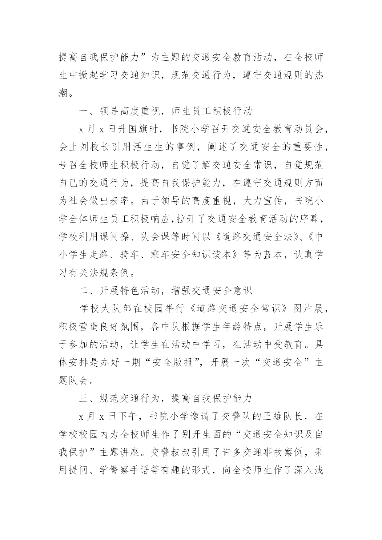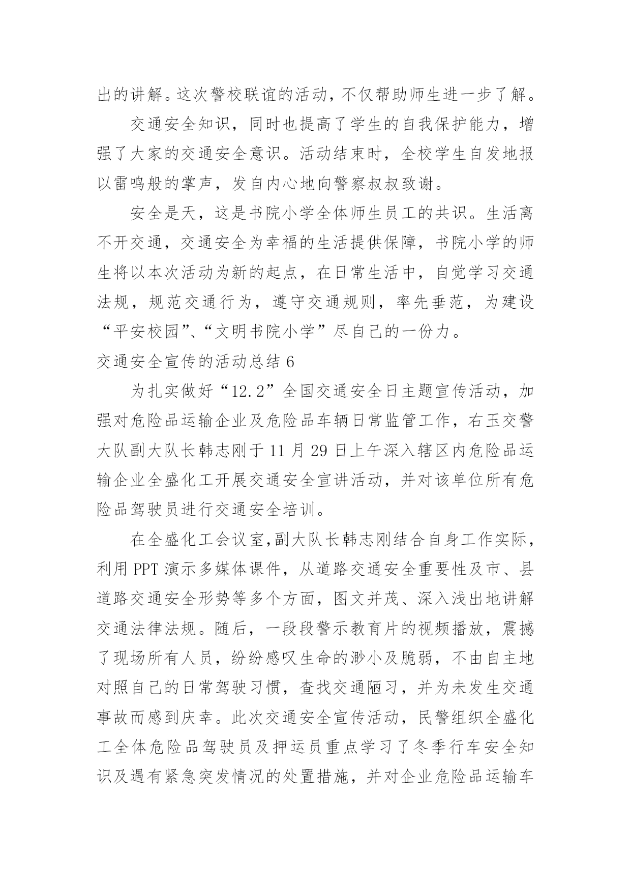 交通安全宣传的活动总结交通安全宣传的活动总结总结是事后对某一阶段的学习或工作情况作加以回顾检查并分析评价的书面材料,写总结有利于我们学习和工作能力的提高,不妨让我们认真地完成总结吧。总结一般是怎么写的呢?以下是小编收集整理的交通安全宣传的活动总结,供大家参考借鉴,希望可以帮助到有需要的朋友。交通安全宣传的活动总结111月27日,在12月2日第五个“全国交通安全日”来临之际,喀左县交警大队组织校车办、巧语口才表演艺术学校师生、学生家长共同开展了“小手拉大手、全家安全一起走”交通安全教育宣传活动。今年的活动主题是“社会协同治理、安全文明出行”。活动中,县交警大队民警通过讲解图片、提问、播放动漫视频等形式,给孩子们上了一堂生动的交通安全课。随后,在交通岗现场给孩子们示范如何安全过马路,并耐心解答孩子们对交通安全相关知识的提问。通过此次活动,增强了学生和家长们的交通安全意识,使孩子们意识到遵守交通安全的重要性,从而起到了“教育一个学生、带动一个家庭、文明整个社会”的良好社会效果。活动结束后,交警大队还给孩子们准备了小礼物。交通安全宣传的活动总结212月2日上午,山西省暨太原市20xx年122“全国交通安全日”主题宣传活动正式启动。社会各界群众、大学生文明交通志愿者代表、重点运输企业人员、基层公安交警200余人参加启动仪式。今年12月2日是国务院确定的第五个“全国交通安全日”,宣传主题为“社会协同治理、安全文明出行”。倡导全民、各行各业共同抵制超速、超员、醉酒驾驶等严重交通违法行为,抵制路怒、开车打电话、占用应急车道等危险驾驶行为,努力形成人人抵制交通违法,人人践行文明交通,全社会共建共享文明交通的良好风尚。活动现场,由大学生交通安全志愿者带来的交通安全快闪表演吸引了众多群众驻足观看。仪式上,与会领导向小学生代表发放了“让我看见你”反光书包和交通安全读本,并向交通运输企业赠送交通安全警示片、宣传挂图、大学交通安全志愿者代表作了倡议发言。省教育厅、省交通厅有关领导分别为新成立的山西省大学生交通安全志愿者联盟授旗、授匾。现场精心设置了“交通安全互动体验区”、“交通事故警示区”、“酒驾测试体验区”。在“交通安全互动体验区”,很多群众自发参与其中,咨询法律问题、学习交通安全知识、了解交通安全法律法规和安全出行常识,工作人员仔细回答群众的提问,并将交通知识宣传单等宣传资料发放到群众手中。启动仪式结束后,与会人员深入太原市晋阳街小学现场观摩了交通安全体验课。交通安全体验课上,孩子们通过设定情景表演交通安全小品,让更多的孩子学到了日常生活中应知、应会的交通安全常识。随后,交警叔叔带着孩子们共同完成交通标志拼图比赛等各种有趣的小游戏,课堂气氛十分异常活跃,让孩子们在40分里,学到了很多交通安全常识。课后,孩子们纷纷表示,今后要自觉遵守道路交通安全法律法规,按道路标志标线通行、不在路上嬉戏打闹,避免发生情景剧中同学们犯的交通错误,同时还要让家长也自觉遵守交通法规,争做文明交通参与者。交通安全宣传的活动总结3抓好交通安全教育,帮助学生从小养成良好的交通行为习惯,是关系到下一代能否健康成长的“造福工程”,也是道路交通管理工作的一项长远之计。安全工作“责任重于泰山”,在活动月期间,我校根据教育局交通安全教育宣传月的文件精神,贯彻“以人为本、安全第一”的方针,以“安全乘车、安全乘船、安全骑车、安全走路”养成教育为主要内容,营造全社会关注中小学生交通安全的良好氛围,开展丰富多彩的宣传教育活动,进一步提高了中小学生交通安全法制意识和自我防护能力,维护了中小学校正常教育教学秩序,保障和促进了青少年的健康成长,取得了较好的效果。一、提高认识,统一思想。随着全省经济持续快速发展,车辆和道路交通流量大幅度增长,人车路等矛盾日趋突出,涉及中小学生的交通事故不断增多。经分析,发生涉及学生交通事故的主要原因,是对学生交通安全教育不够重视,学生交通安全意识淡薄,校内外交通安全设施不完善,交通安全管理措施不够落实。少年儿童是祖国的未来,加强学生交通安全教育工作,为学生创造一个良好的交通安全环境,事关下一代的健康成长和千家万户的幸福安宁,为此,全校各有关部门和全体师生员工要充分认识加强学生交通安全教育工作的极端重要性,把保障学生交通安全作为创先争优活动、构建和谐社会的实际行动,切实抓好“宣传月活动”。二、加强领导,精心组织。学校把开展“宣传月活动”列入重要议事日程,切实加强领导,精心组织实施。结合我校实际,认真制定“宣传月活动”的实施方案和具体措施,并认真做好各项准备工作。通过交通安全教育宣小广播,每天中午、下午放学时的教师亲自送队,“交通安全在心中”主题班队会,交通安全教育为主题的板报评比,以及日常教学工作中的渗透,使我们的交通安全教育宣传润物细无声,起到了良好的教育效果。三、建