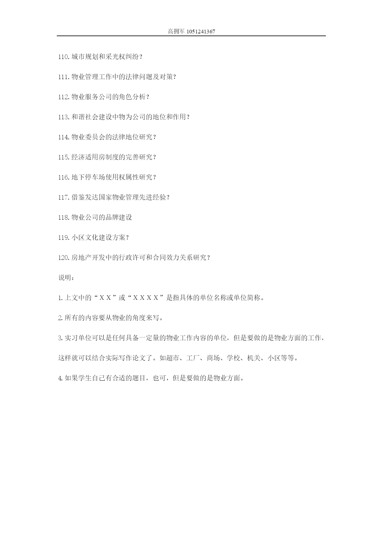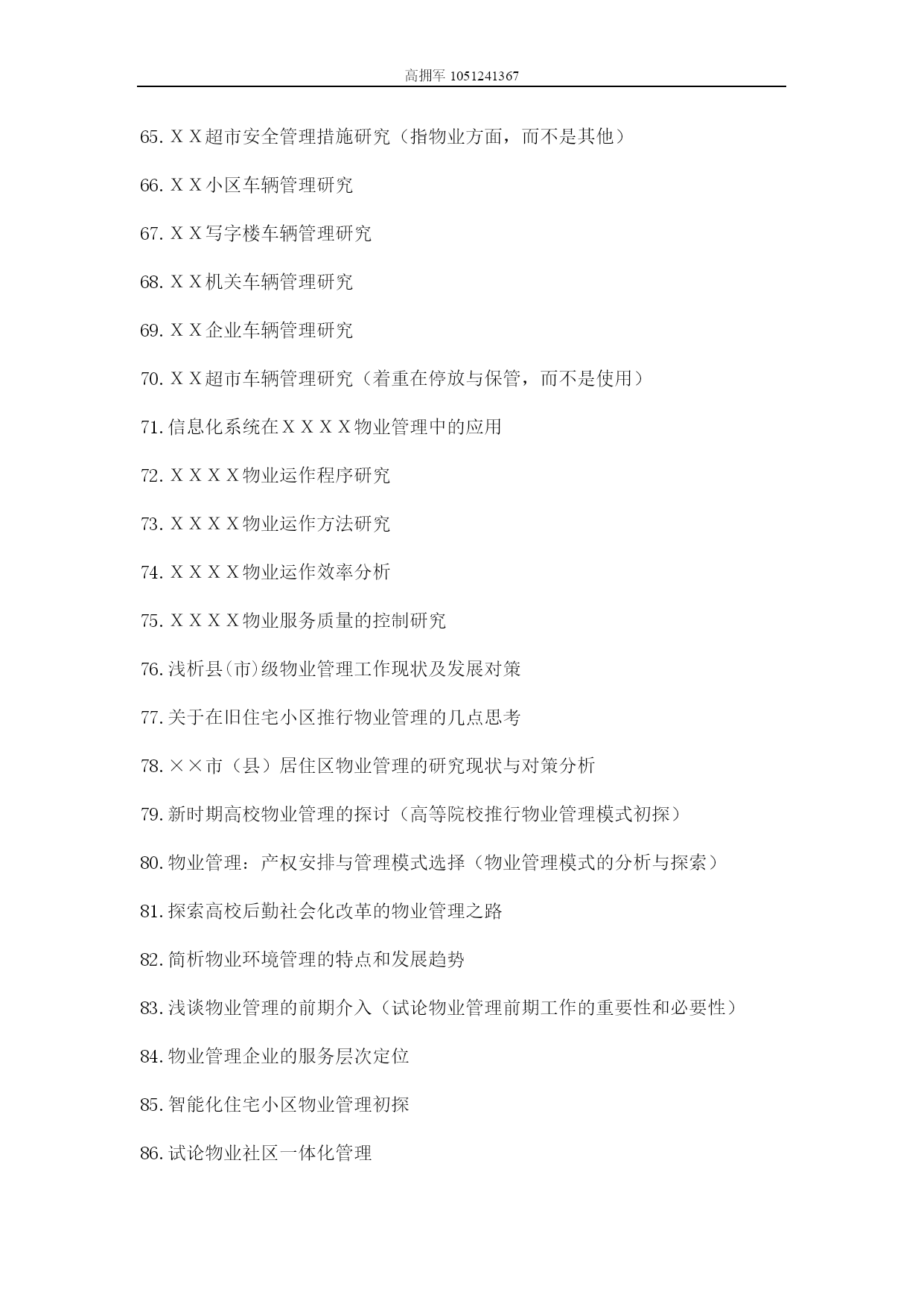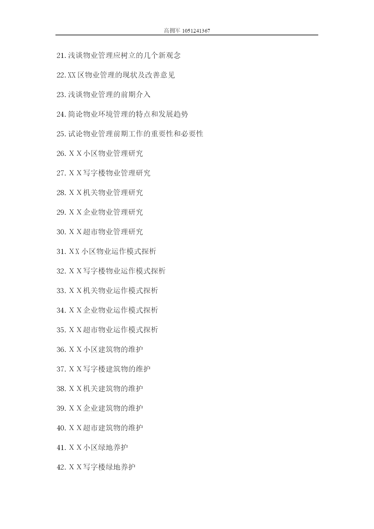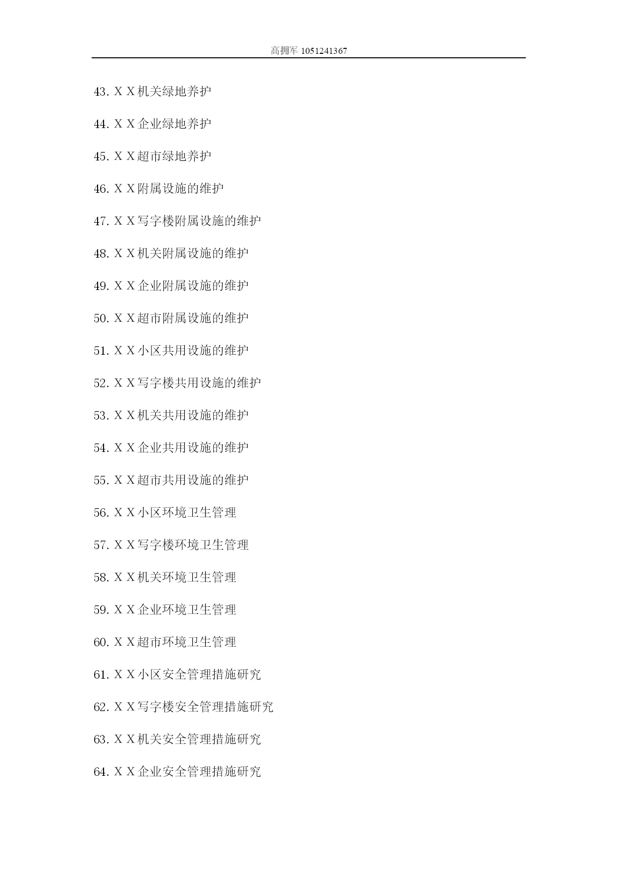 高拥军1051241367物业管理论文题目物业管理论文题目1.高等院校推行物业管理模式初探;2.浅谈物业管理中专项维修基金的管理问题3.物业管理中的问题及对策4.物业管理在城市管理中的地位和作用5.论中国物业管理的市场化6.城市住宅小区物业管理存在的问题与对策7.关于物业管理具体内容的初步探讨8.智能大厦物业管理系统分析与设计9.试论标准工业厂房物业管理中的消防安全10.物业管理的认识误区及其突破途径11.试论物业管理与传统房地产管理的区别12.物业管理现代化的途径13.对物业管理重要性认识和推行途径的思考14.物业管理的文化基础15.后勤服务社会化与物业管理的联系与区别16.试论提高普通居民住房的物业管理水准17.论我国物业管理的发展、问题与对策建议18.发展和完善住宅小区物业管理的思考19.我国物业管理模式转换分析20.物业管理中存在的问题及解决方法21.浅谈物业管理应树立的几个新观念22.XX区物业管理的现状及改善意见23.浅谈物业管理的前期介入24.简论物业环境管理的特点和发展趋势25.试论物业管理前期工作的重要性和必要性26.XX小区物业管理研究27.XX写字楼物业管理研究28.XX机关物业管理研究29.XX企业物业管理研究30.XX超市物业管理研究31.XX小区物业运作模式探析32.XX写字楼物业运作模式探析33.XX机关物业运作模式探析34.XX企业物业运作模式探析35.XX超市物业运作模式探析36.XX小区建筑物的维护37.XX写字楼建筑物的维护38.XX机关建筑物的维护39.XX企业建筑物的维护40.XX超市建筑物的维护41.XX小区绿地养护42.XX写字楼绿地养护43.XX机关绿地养护44.XX企业绿地养护45.XX超市绿地养护46.XX附属设施的维护47.XX写字楼附属设施的维护48.XX机关附属设施的维护49.XX企业附属设施的维护50.XX超市附属设施的维护51.XX小区共用设施的维护52.XX写字楼共用设施的维护53.XX机关共用设施的维护54.XX企业共用设施的维护55.XX超市共用设施的维护56.XX小区环境卫生管理57.XX写字楼环境卫生管理58.XX机关环境卫生管理59.XX企业环境卫生管理60.XX超市环境卫生管理61.XX小区安全管理措施研究62.XX写字楼安全管理措施研究63.XX机关安全管理措施研究64.XX企业安全管理措施研究65.XX超市安全管理措施研究(指物业方面,而不是其他)66.XX小区车辆管理研究67.XX写字楼车辆管理研究68.XX机关车辆管理研究69.XX企业车辆管理研究70.XX超市车辆管理研究(着重在停放与保管,而不是使用)71.信息化系统在XXXX物业管理中的应用72.XXXX物业运作程序研究73.XXXX物业运作方法研究74.XXXX物业运作效率分析75.XXXX物业服务质量的控制研究76.浅析县(市)级物业管理工作现状及发展对策77.关于在旧住宅小区推行物业管理的几点思考78.××市(县)居住区物业管理的研究现状与对策分析79.新时期高校物业管理的探讨(高等院校推行物业管理模式初探)80.物业管理:产权安排与管理模式选择(物业管理模式的分析与探索)81.探索高校后勤社会化改革的物业管理之路82.简析物业环境管理的特点和发展趋势83.浅谈物业管理的前期介入(试论物业管理前期工作的重要性和必要性)84.物业管理企业的服务层次定位85.智能化住宅小区物业管理初探86.试论物业社区一体化管理87.物业管理法制化的紧迫性88.××(如香港、澳门、美国等)的物业管理及对我国的启示89.关于物业管理具体内容的初步探讨90.物业设施管理初探91.物业小区多种经营管理?92.高级综合大厦管理?93.高层楼宇管理?95.小区综合管理?96.新物业公司如何进行前期介入?97.对焦作地区物业管理现状分析?98.物业服务公司如何以人为本?99.写字楼管理?100.物业前期管理中开发商的责任?101.前期管理中物业公司的责任?102.社区环境管理?103.学生公寓管理?104.别墅区管理?105.物业收费难的对策研究?106.焦作地区物业收费标准及其建设?107.物业公司的人才意识?108.物业公司和业主委员会的关系研究?109.物业管理人员应具备的能力研究?110.城市规划和采光权纠纷?111.物业管理工作中的法律问题及对策?112.物业服务公司的角色分析?113.和谐社会建设中物为公司的地位和作用?114.物业委员会的法律地位研究?115.经济适用房制度的完善研究?116.地下停车场使用权属性研究?117.借鉴发达国家物业管理先进经验?118.物业公司的品牌建设119.小区文化建设方案?120.房地产开发中的行政许可和合同效力关系研究?说明:1.上文中的“XX”或“XXXX”是