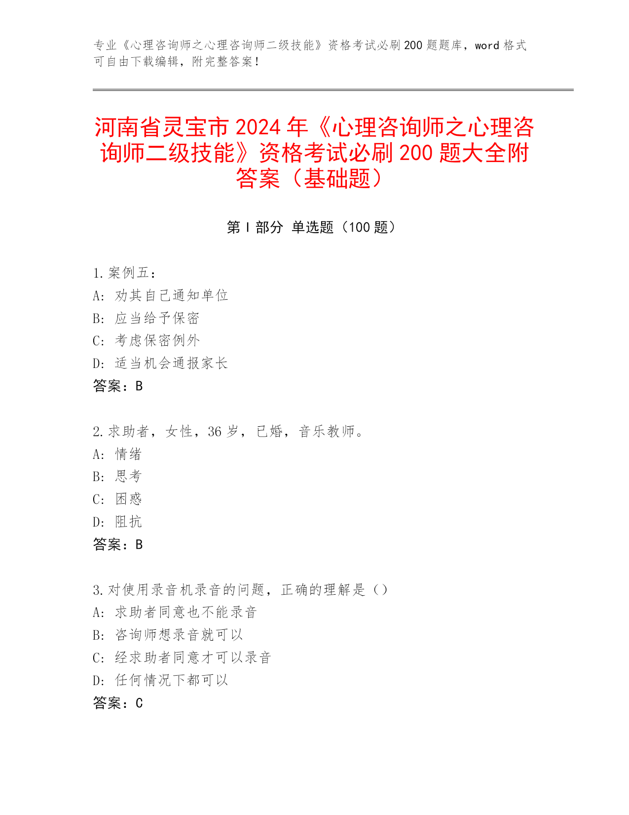 河南省灵宝市2024年《心理咨询师之心理咨询师二级技能》资格考试必刷200题题库及答案解析