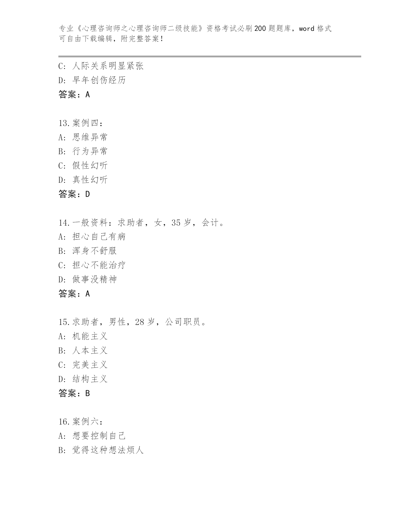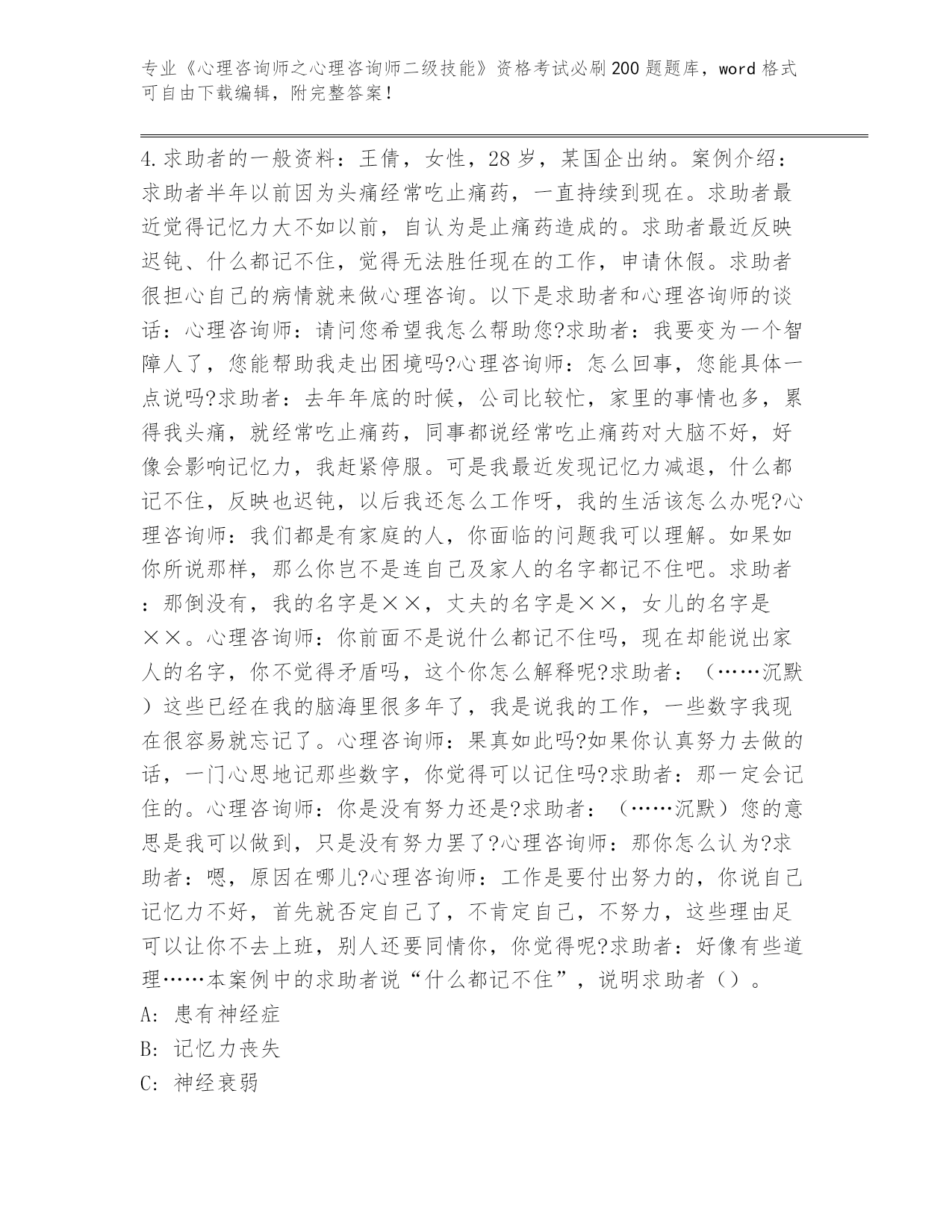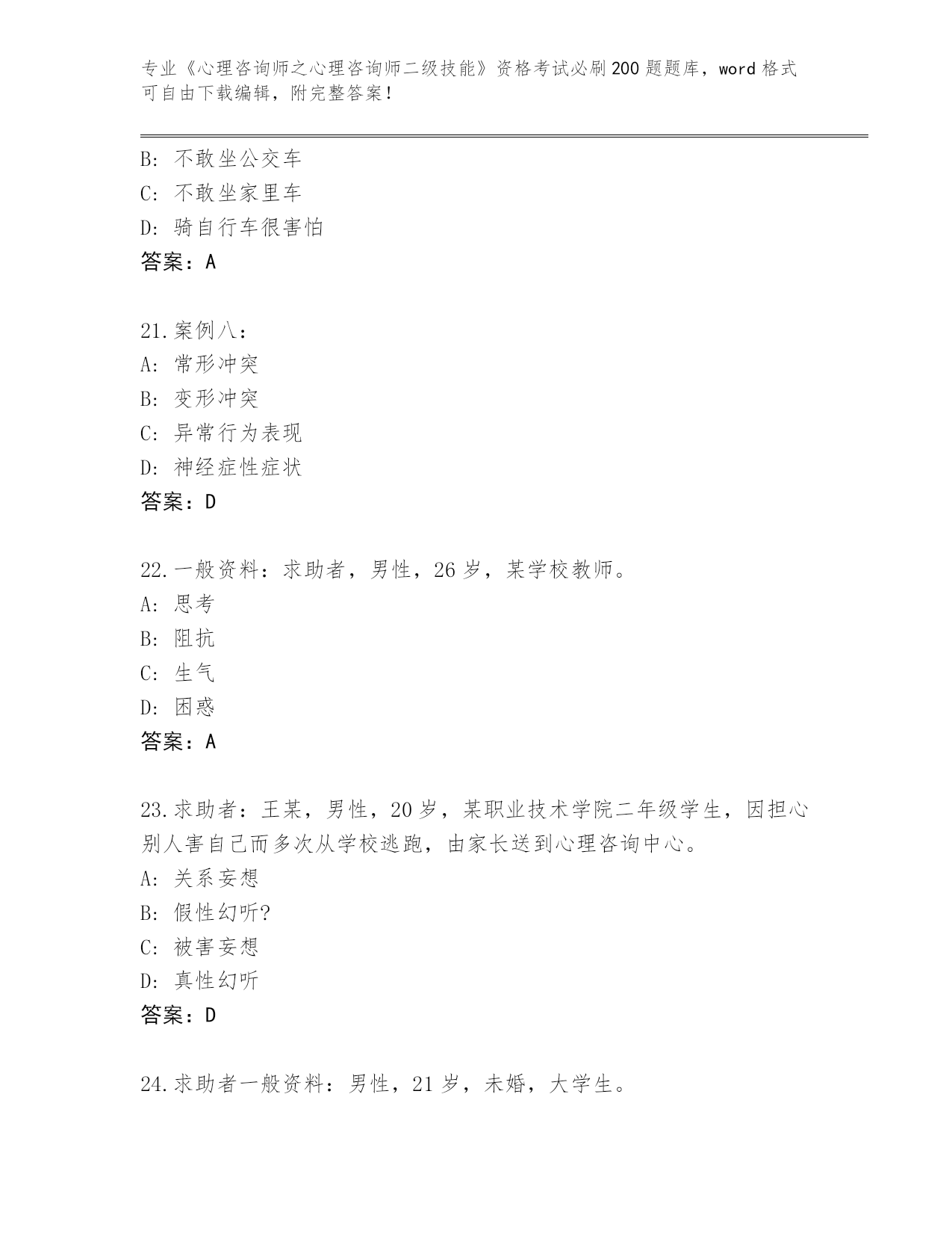 河南省川汇区2024《心理咨询师之心理咨询师二级技能》资格考试必刷200题真题题库附答案【基础题】