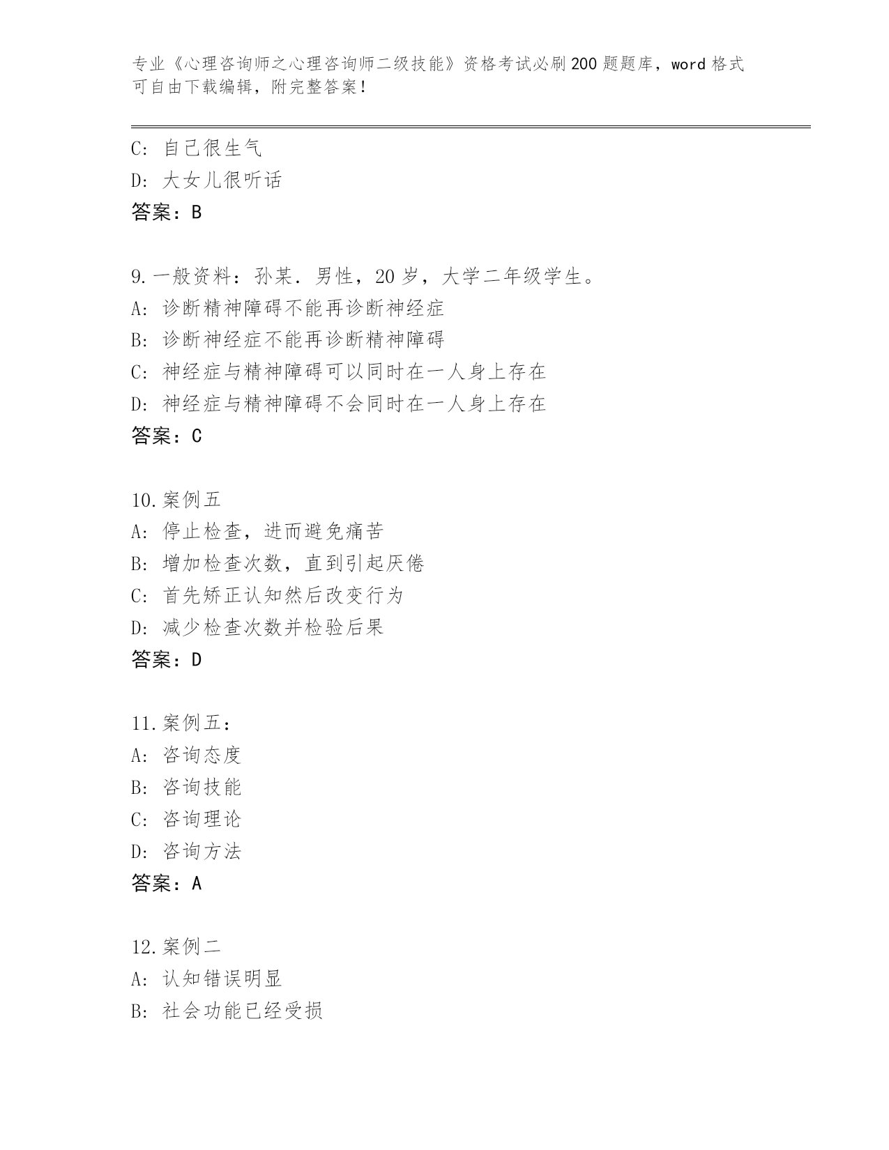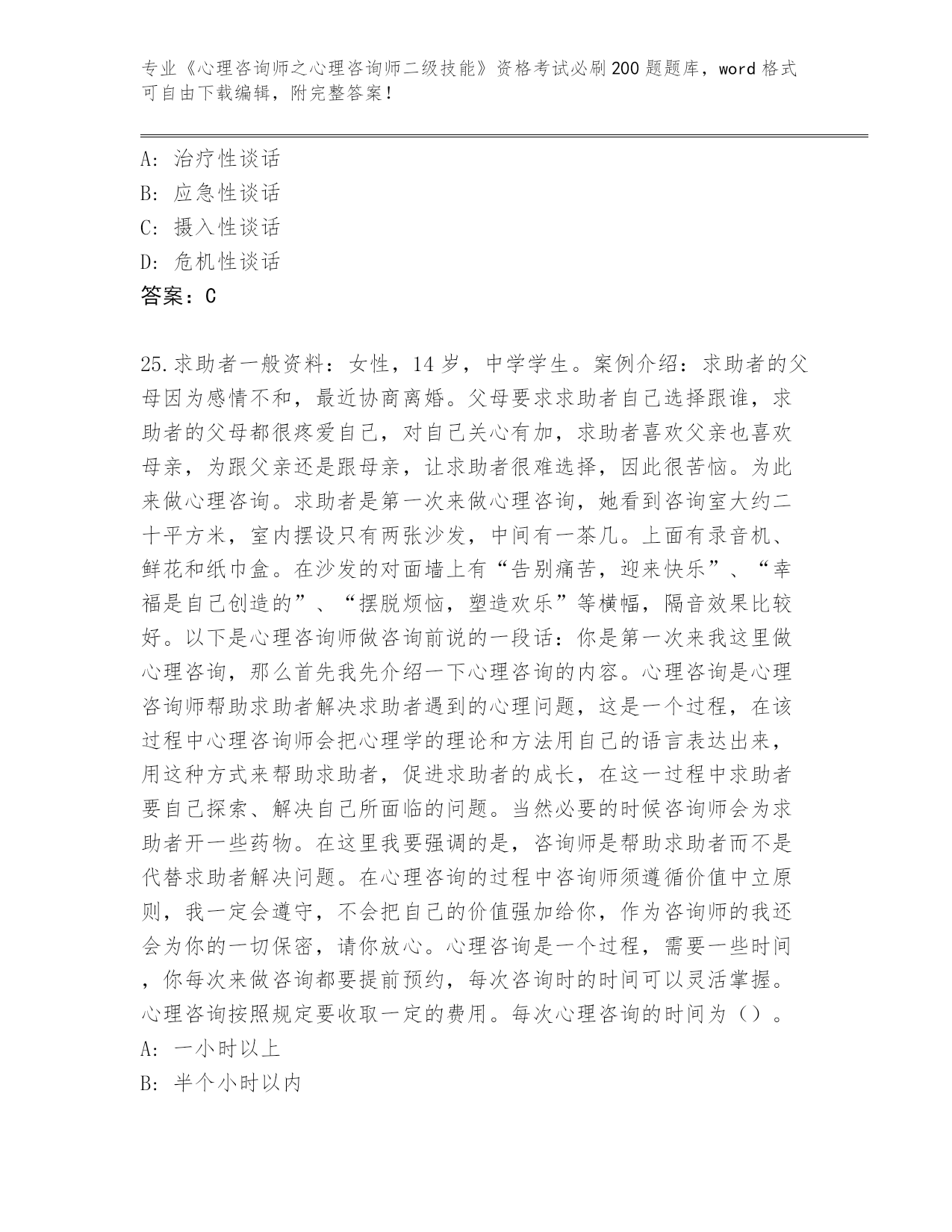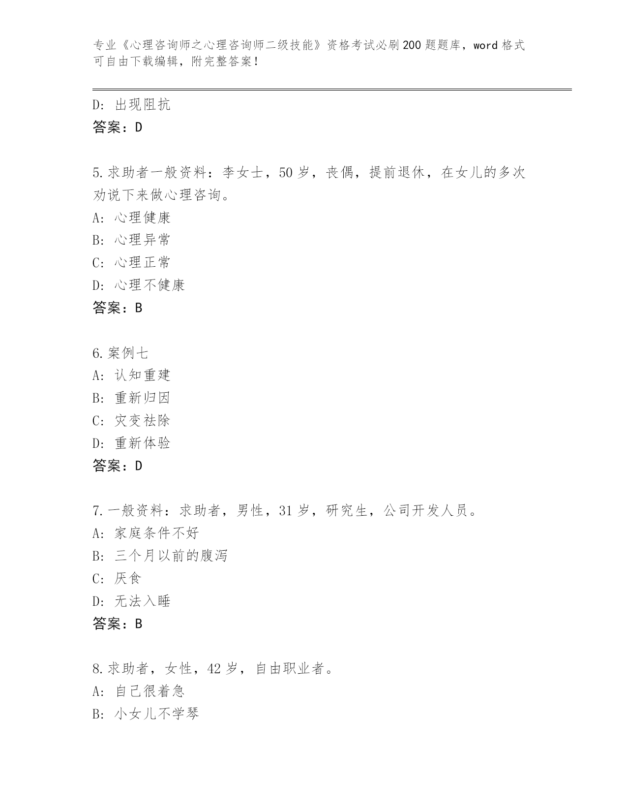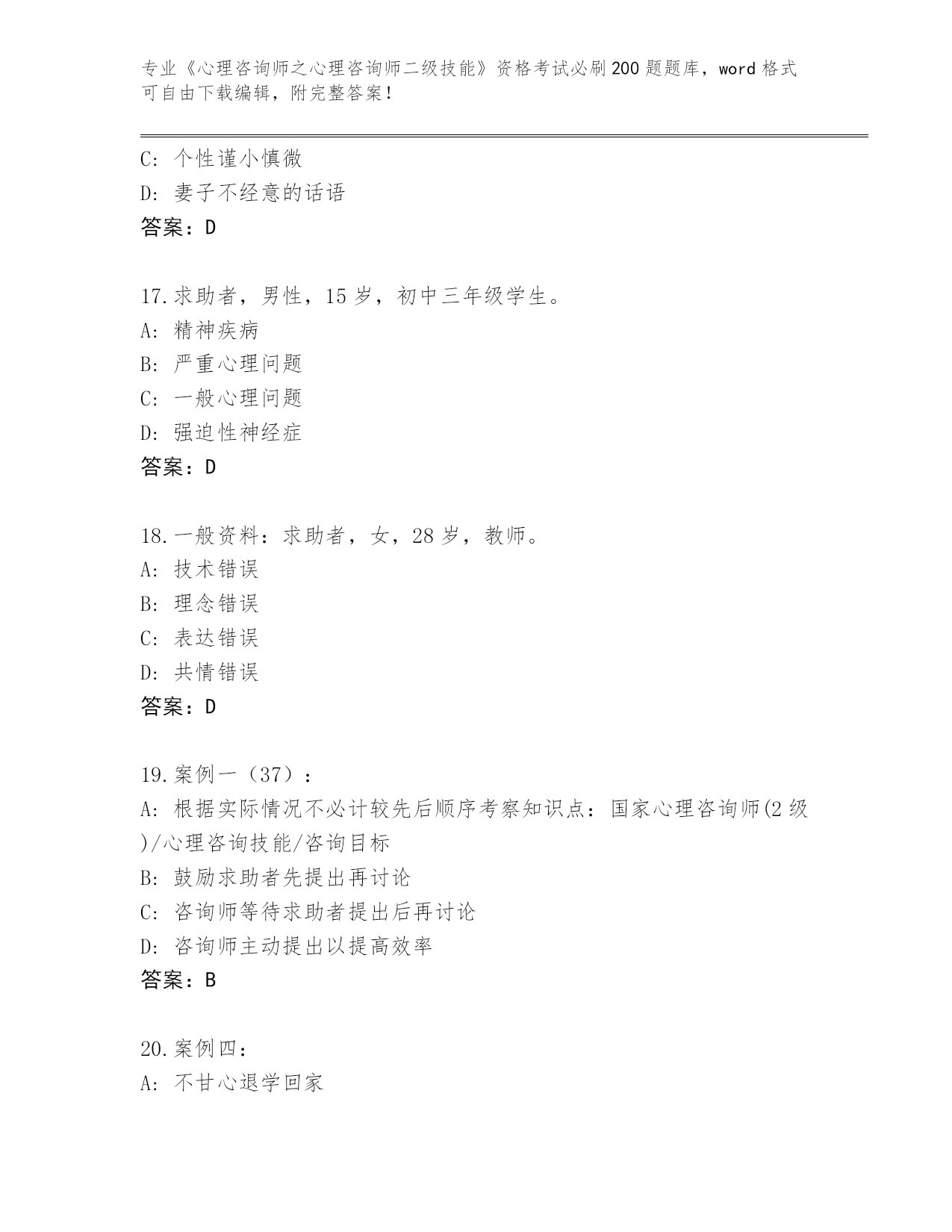 河南省川汇区2024《心理咨询师之心理咨询师二级技能》资格考试必刷200题真题题库附答案【基础题】