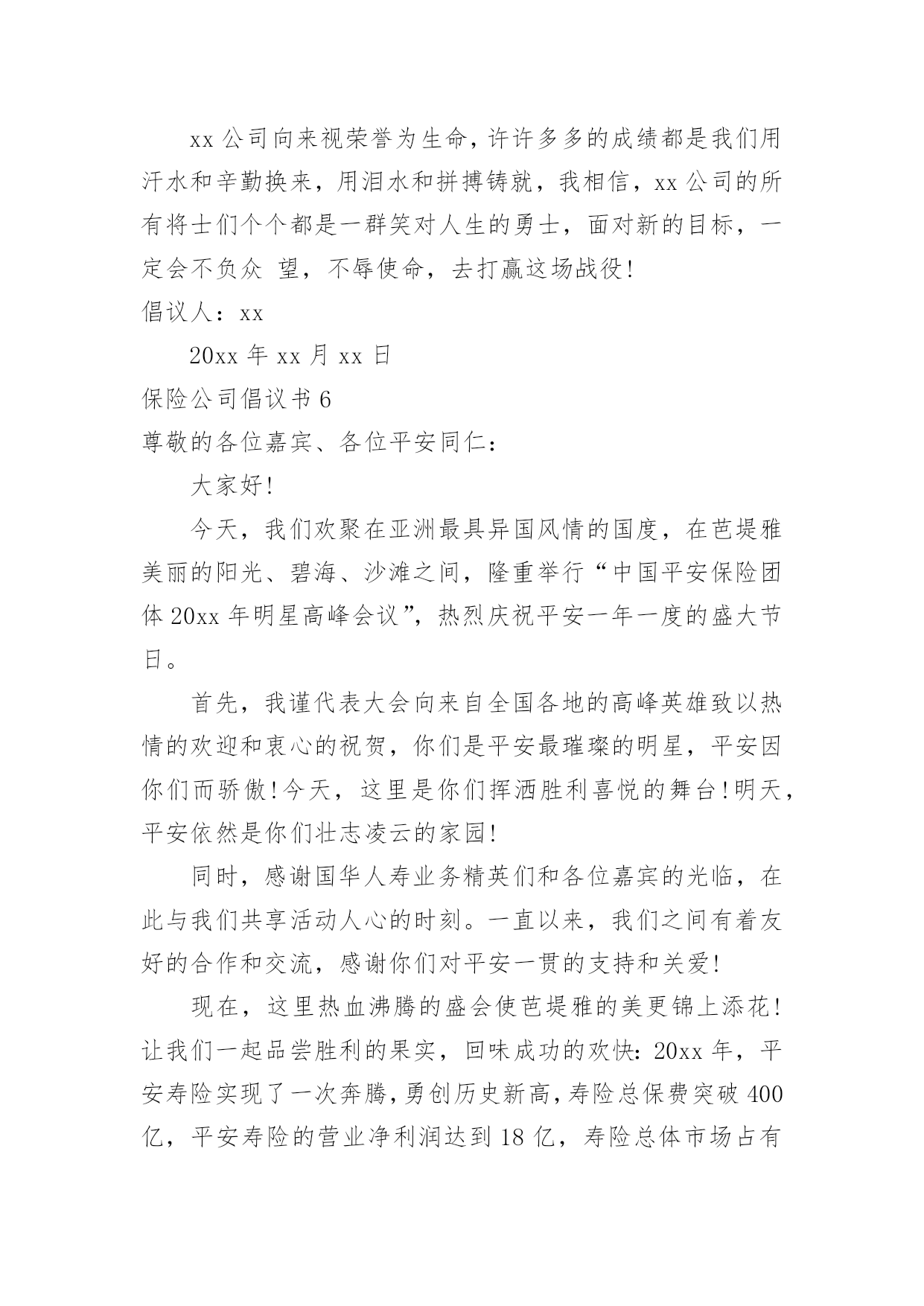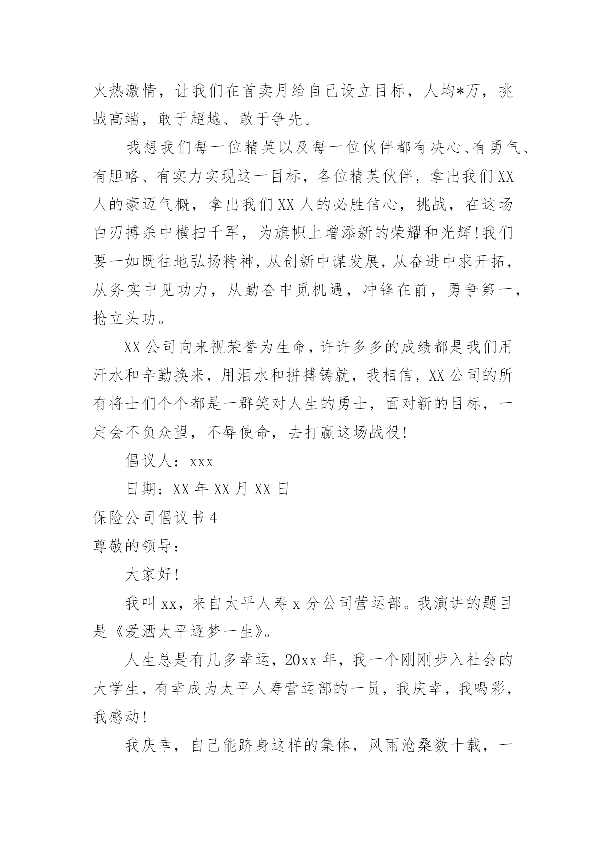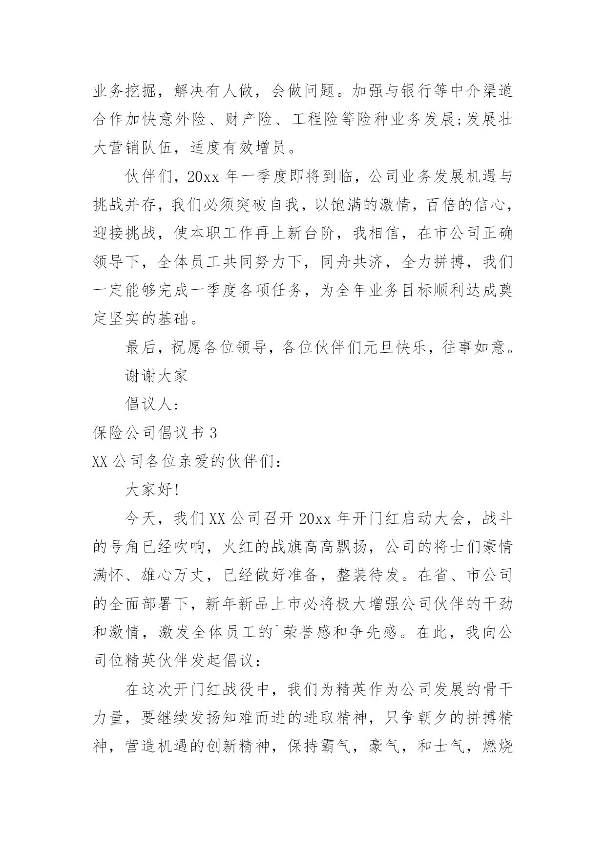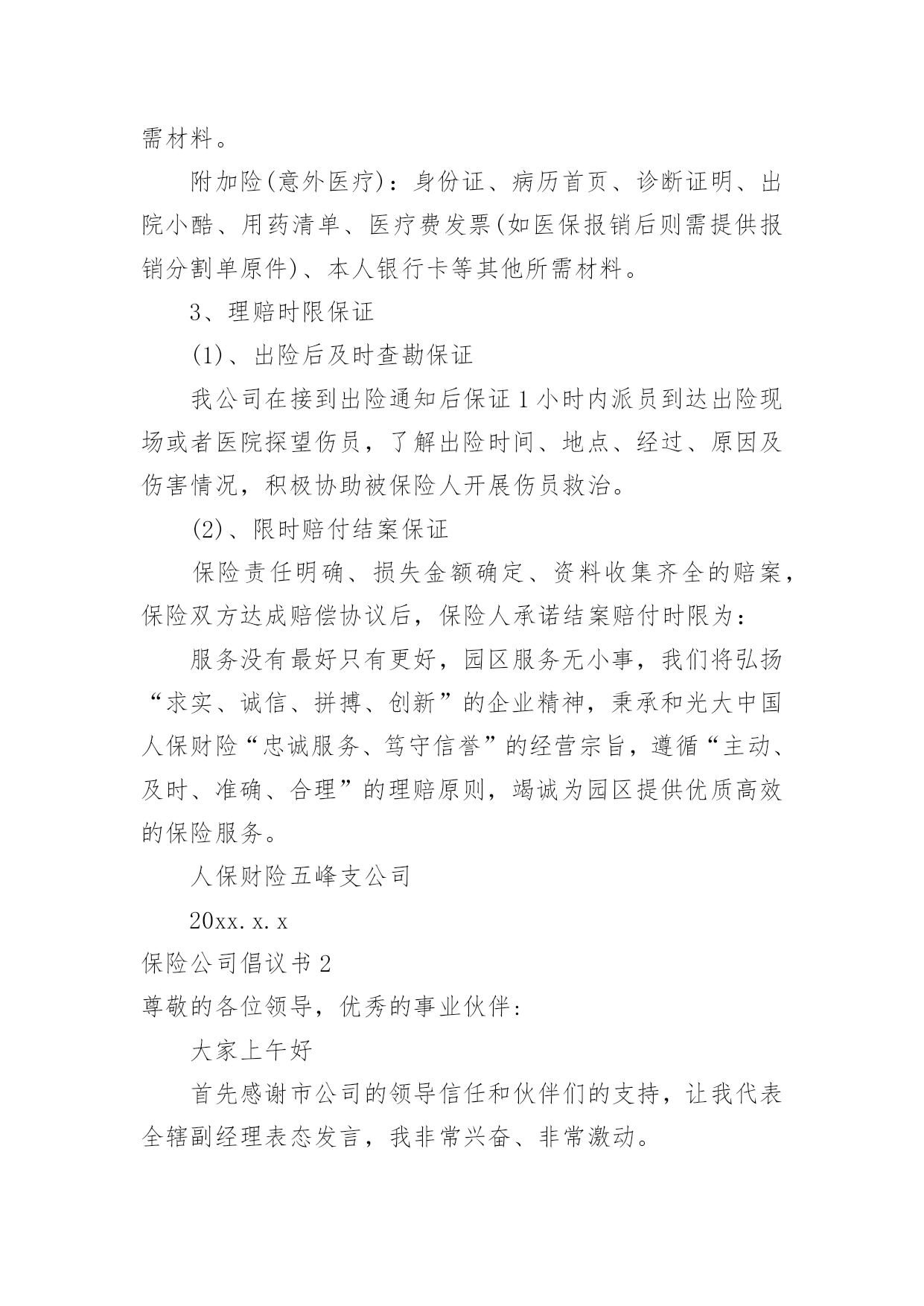 保险公司倡议书保险公司倡议书在日新月异的现代社会中,很多地方都会使用到倡议书,倡议书作为一种公开提议性的专用书信,其在写作上有一定的规范。那么问题来了,到底应如何写一份恰当的倡议书呢?下面是小编为大家整理的保险公司倡议书,希望对大家有所帮助。保险公司倡议书1尊敬的湖北五洋新型建材有限公司领导:您们好!首先在这里对您们来五峰民族工业园办企业,支持五峰经济发展深表感谢!同时衷心感谢您们长期对中国人保财险的信任与支持!俗话说:“天有不测风云,人有旦夕祸福”,意外事故的发生不以人的意志为转移。例如我县20xx年7月30日客车意外事故,还有傅家堰乡干部谭静意外事故以及前不久到园区指导安保培训的退休警察顾代全意外事故等等,谁都不愿它发生但还是发生了。意外事故不为人愿,事故处理需要保障,参加保险以防万一,参加保险利国利民。在您们为五峰经济发展挥洒汗水发挥智慧的同时,作为入住园区的保险服务部门,我们以专业的知识和优质的服务理念为您们精心设计和量身定制了意外保险方案,为您们最大限度防范风险、化解风险、解除后顾之忧提供服务,期待您的'选择。一、主要风险贵公司员工所面对的意外伤害风险主要有以下三个方面不容忽视:1、公司属机械设备生产企业,多数员工工作都与机械设备接触,遭受意外伤害的风险较高;2、由于工业园区设在异地,公司员工家庭多半不在园区所在地,回家探亲路途远,乘坐各类交通工具的频率远比普通人高,遭受交通工具意外事故的风险较高;3、日常普通意外风险。风险无处不在,保险分担风险。二、保险方案三、适用条款意外方案A/B/C主险适用:《中国人民财产保险股份有限公司团体意外伤害保险条款(20xx)版》附加险适用:《中国人民财产保险股份有限公司附加意外伤害保险条款(20xx)版》四、理赔服务1、理赔程序2、理赔所需材料主险(意外身故、残疾、烧伤):身份证、户口簿、死亡证明、户口注销证明、伤残鉴定书、受益人银行卡等其他所需材料。附加险(意外医疗):身份证、病历首页、诊断证明、出院小酷、用药清单、医疗费发票(如医保报销后则需提供报销分割单原件)、本人银行卡等其他所需材料。3、理赔时限保证(1)、出险后及时查勘保证我公司在接到出险通知后保证1小时内派员到达出险现场或者医院探望伤员,了解出险时间、地点、经过、原因及伤害情况,积极协助被保险人开展伤员救治。(2)、限时赔付结案保证保险责任明确、损失金额确定、资料收集齐全的赔案,保险双方达成赔偿协议后,保险人承诺结案赔付时限为:服务没有最好只有更好,园区服务无小事,我们将弘扬“求实、诚信、拼搏、创新”的企业精神,秉承和光大中国人保财险“忠诚服务、笃守信誉”的经营宗旨,遵循“主动、及时、准确、合理”的理赔原则,竭诚为园区提供优质高效的保险服务。人保财险五峰支公司20xx.x.x保险公司倡议书2尊敬的各位领导,优秀的事业伙伴:大家上午好首先感谢市公司的领导信任和伙伴们的支持,让我代表全辖副经理表态发言,我非常兴奋、非常激动。为进一步全面关切落实市公司一季度《》首季开门红业务竞赛活动方案,确保公司在全年市场竞争中掌握主动、抢占先机,为全年业务目标顺利达成奠定坚实的基础。我作为基层公司一名副经理,深感责任重大,首季开门红业务竞赛活动不是口号,是实实在在的`目标,是沉甸甸的责任,是日照人保将士的荣誉,在发展关键时期,我们基层管理者要有一种迎难而上,勇往直前的精神状态和敢挑重担、敢当大任的气魄。一、首先我们分管经理要在各方面率先垂范,提高执行力,树立“人讲称职,事争一流”的新境界,形成“扎扎实实做工作、认认真真抓落实”的良好习惯。要全员发动,全司发力,激发全员共创首季开门红动力和活力。对贯彻奋战90天,首季开门红,要做出了更加深入细致的部署和计划安排。二、是倒排一季度90天工作,加快业务发展,围绕保费计划,制定推进业务大发展的具体目标和措施,并对任务逐天逐旬逐月分解,盯紧每一笔业务,确保实现每一天的的发展目标。三、加快车险业务快速发展,以“电销网销”和“散单团做”为总抓手,提升渠道产出成效。在盯续保、抓新增、搞竟回等方面制定钢性指标及考核办法。四、紧盯市场,全险种,多渠道发力,推进非车险业务快速发展,确保优质业务续保率100%,加大竟回和规模以上业务挖掘,解决有人做,会做问题。加强与银行等中介渠道合作加快意外险、财产险、工程险等险种业务发展;发展壮大营销队伍,适度有效增员。伙伴们,20xx年一季度即将到临,公司业务发展机遇与挑战并存,我们必须突破自我,以饱满的激情,百倍的信心,迎接挑战,使本职工作再上新台阶,我相信,在市公司正确领导下,全体员工共同努力下,同舟共济,全力拼搏,我们一定能够完成一季度各项任务,为全年业务目标顺利达成奠定坚实的基础。最后,祝愿各位领导,各位伙伴们元旦快乐,往事如意。谢谢大家倡议人:保险公司倡议书3X