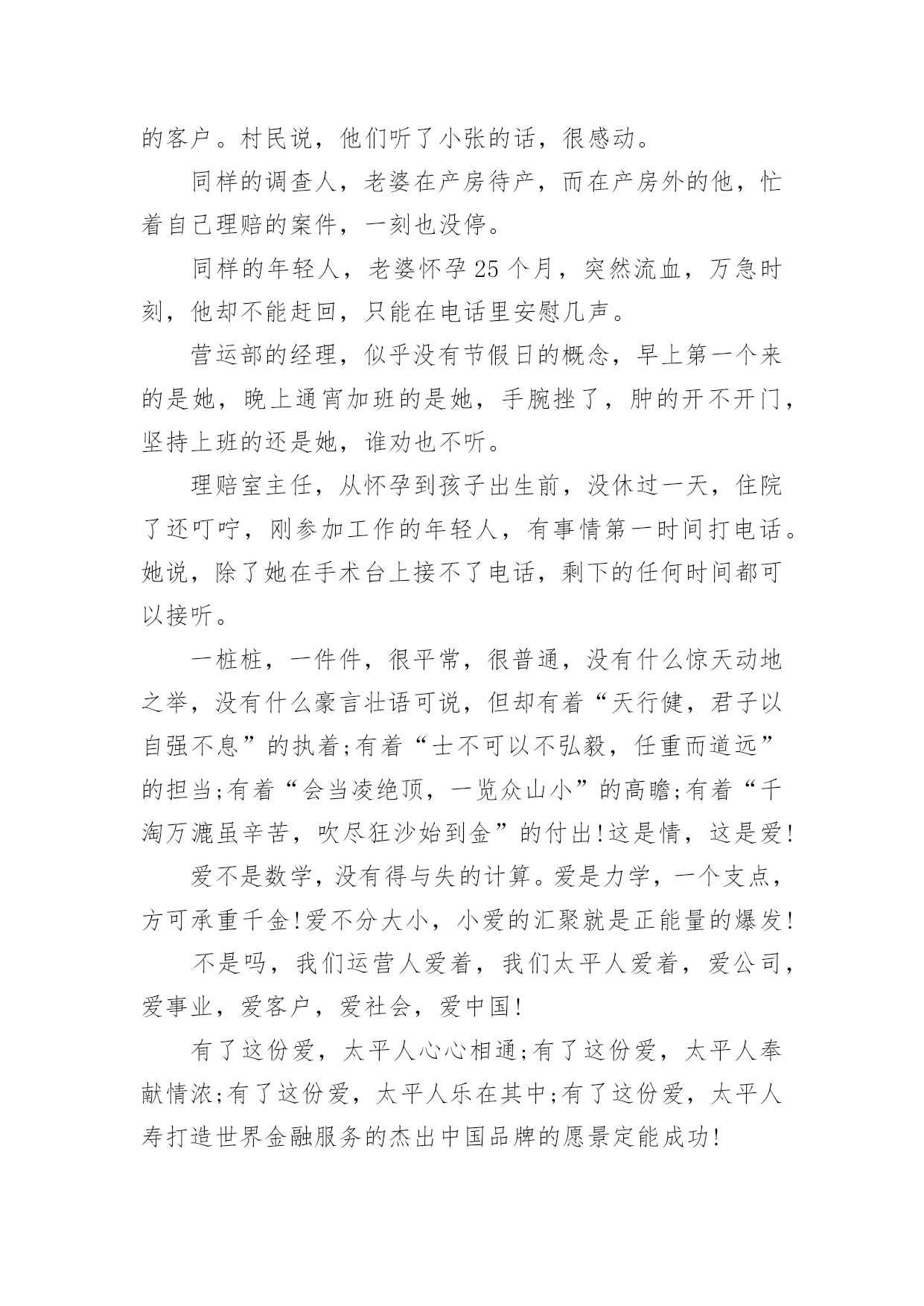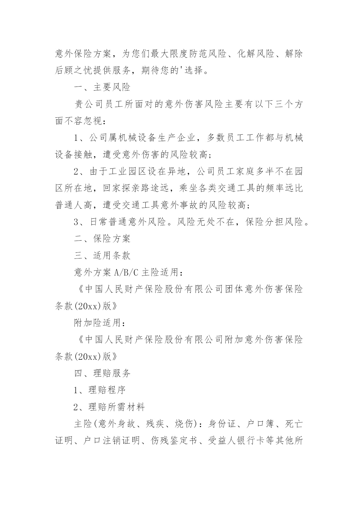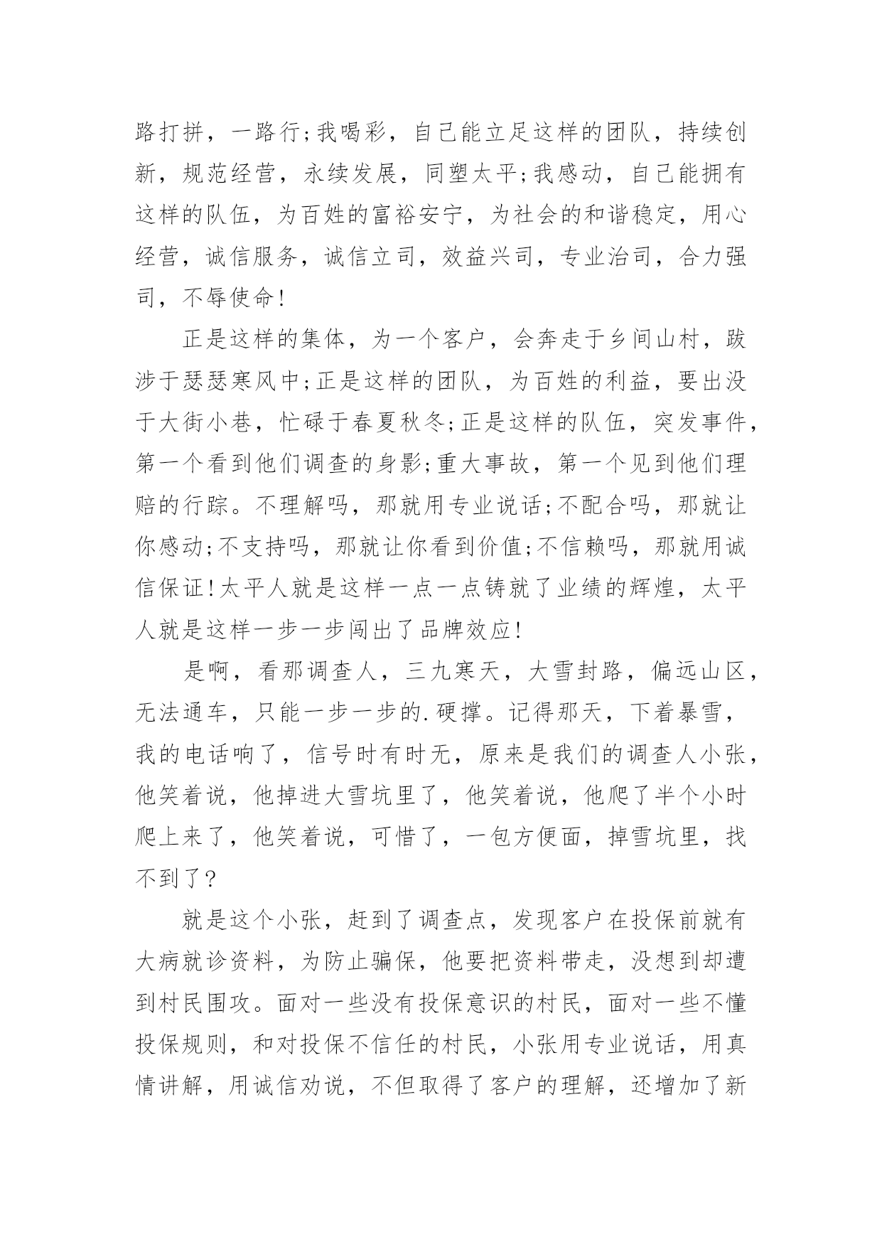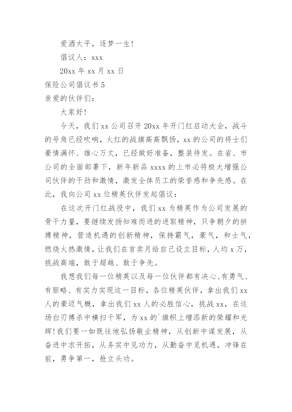 保险公司倡议书保险公司倡议书在日新月异的现代社会中,很多地方都会使用到倡议书,倡议书作为一种公开提议性的专用书信,其在写作上有一定的规范。那么问题来了,到底应如何写一份恰当的倡议书呢?下面是小编为大家整理的保险公司倡议书,希望对大家有所帮助。保险公司倡议书1尊敬的湖北五洋新型建材有限公司领导:您们好!首先在这里对您们来五峰民族工业园办企业,支持五峰经济发展深表感谢!同时衷心感谢您们长期对中国人保财险的信任与支持!俗话说:“天有不测风云,人有旦夕祸福”,意外事故的发生不以人的意志为转移。例如我县20xx年7月30日客车意外事故,还有傅家堰乡干部谭静意外事故以及前不久到园区指导安保培训的退休警察顾代全意外事故等等,谁都不愿它发生但还是发生了。意外事故不为人愿,事故处理需要保障,参加保险以防万一,参加保险利国利民。在您们为五峰经济发展挥洒汗水发挥智慧的同时,作为入住园区的保险服务部门,我们以专业的知识和优质的服务理念为您们精心设计和量身定制了意外保险方案,为您们最大限度防范风险、化解风险、解除后顾之忧提供服务,期待您的'选择。一、主要风险贵公司员工所面对的意外伤害风险主要有以下三个方面不容忽视:1、公司属机械设备生产企业,多数员工工作都与机械设备接触,遭受意外伤害的风险较高;2、由于工业园区设在异地,公司员工家庭多半不在园区所在地,回家探亲路途远,乘坐各类交通工具的频率远比普通人高,遭受交通工具意外事故的风险较高;3、日常普通意外风险。风险无处不在,保险分担风险。二、保险方案三、适用条款意外方案A/B/C主险适用:《中国人民财产保险股份有限公司团体意外伤害保险条款(20xx)版》附加险适用:《中国人民财产保险股份有限公司附加意外伤害保险条款(20xx)版》四、理赔服务1、理赔程序2、理赔所需材料主险(意外身故、残疾、烧伤):身份证、户口簿、死亡证明、户口注销证明、伤残鉴定书、受益人银行卡等其他所需材料。附加险(意外医疗):身份证、病历首页、诊断证明、出院小酷、用药清单、医疗费发票(如医保报销后则需提供报销分割单原件)、本人银行卡等其他所需材料。3、理赔时限保证(1)、出险后及时查勘保证我公司在接到出险通知后保证1小时内派员到达出险现场或者医院探望伤员,了解出险时间、地点、经过、原因及伤害情况,积极协助被保险人开展伤员救治。(2)、限时赔付结案保证保险责任明确、损失金额确定、资料收集齐全的赔案,保险双方达成赔偿协议后,保险人承诺结案赔付时限为:服务没有最好只有更好,园区服务无小事,我们将弘扬“求实、诚信、拼搏、创新”的企业精神,秉承和光大中国人保财险“忠诚服务、笃守信誉”的经营宗旨,遵循“主动、及时、准确、合理”的理赔原则,竭诚为园区提供优质高效的保险服务。人保财险五峰支公司20xx.x.x保险公司倡议书2尊敬的各位领导,优秀的事业伙伴:大家上午好首先感谢市公司的领导信任和伙伴们的支持,让我代表全辖副经理表态发言,我非常兴奋、非常激动。为进一步全面关切落实市公司一季度《》首季开门红业务竞赛活动方案,确保公司在全年市场竞争中掌握主动、抢占先机,为全年业务目标顺利达成奠定坚实的基础。我作为基层公司一名副经理,深感责任重大,首季开门红业务竞赛活动不是口号,是实实在在的`目标,是沉甸甸的责任,是日照人保将士的荣誉,在发展关键时期,我们基层管理者要有一种迎难而上,勇往直前的精神状态和敢挑重担、敢当大任的气魄。一、首先我们分管经理要在各方面率先垂范,提高执行力,树立“人讲称职,事争一流”的新境界,形成“扎扎实实做工作、认认真真抓落实”的良好习惯。要全员发动,全司发力,激发全员共创首季开门红动力和活力。对贯彻奋战90天,首季开门红,要做出了更加深入细致的部署和计划安排。二、是倒排一季度90天工作,加快业务发展,围绕保费计划,制定推进业务大发展的具体目标和措施,并对任务逐天逐旬逐月分解,盯紧每一笔业务,确保实现每一天的的发展目标。三、加快车险业务快速发展,以“电销网销”和“散单团做”为总抓手,提升渠道产出成效。在盯续保、抓新增、搞竟回等方面制定钢性指标及考核办法。四、紧盯市场,全险种,多渠道发力,推进非车险业务快速发展,确保优质业务续保率100%,加大竟回和规模以上业务挖掘,解决有人做,会做问题。加强与银行等中介渠道合作加快意外险、财产险、工程险等险种业务发展;发展壮大营销队伍,适度有效增员。伙伴们,20xx年一季度即将到临,公司业务发展机遇与挑战并存,我们必须突破自我,以饱满的激情,百倍的信心,迎接挑战,使本职工作再上新台阶,我相信,在市公司正确领导下,全体员工共同努力下,同舟共济,全力拼搏,我们一定能够完成一季度各项任务,为全年业务目标顺利达成奠定坚实的基础。最后,祝愿各位领导,各位伙伴们元旦快乐,往事如意。谢谢大家倡议人:保险公司倡议书3X