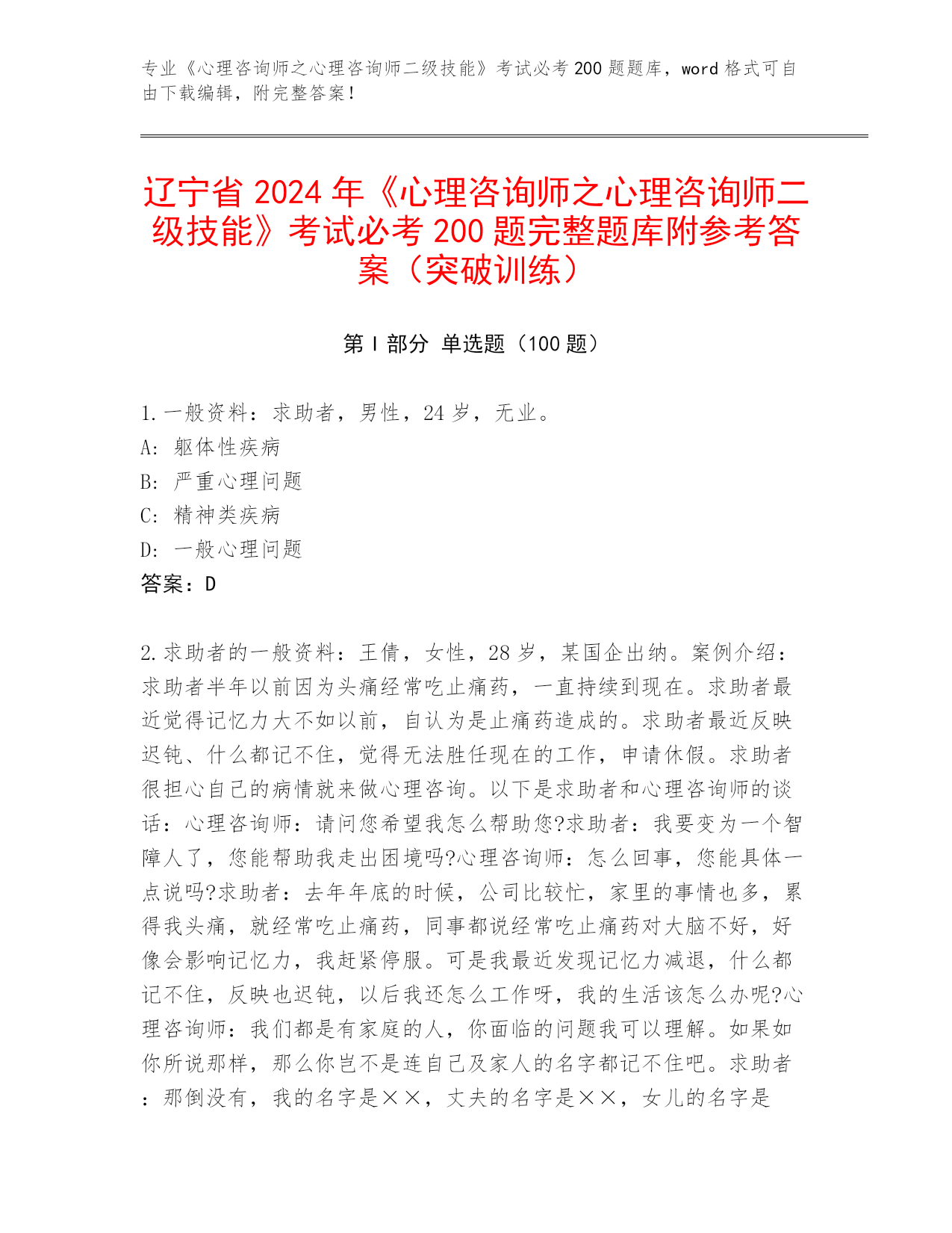 辽宁省2024年《心理咨询师之心理咨询师二级技能》考试必考200题完整题库附参考答案(突破训练)