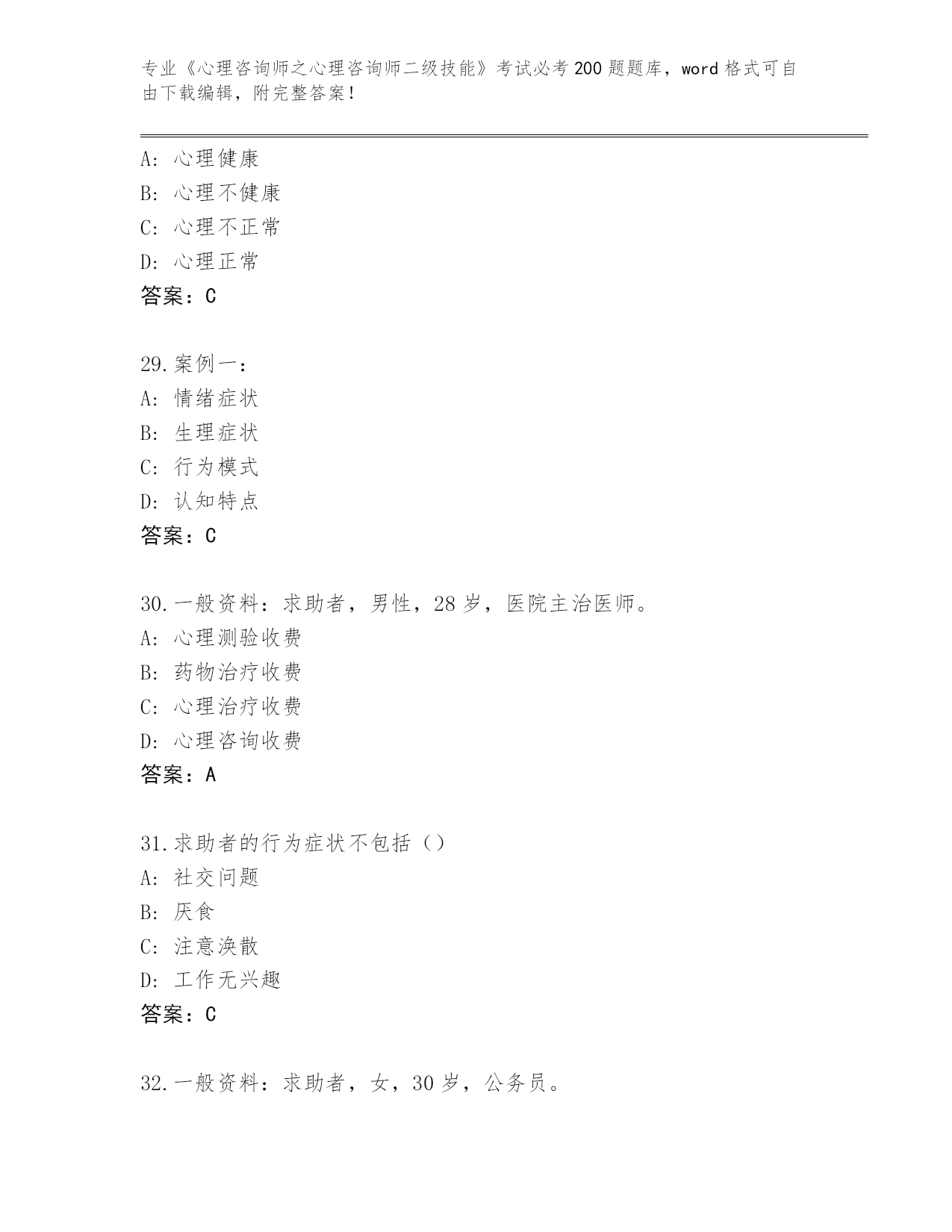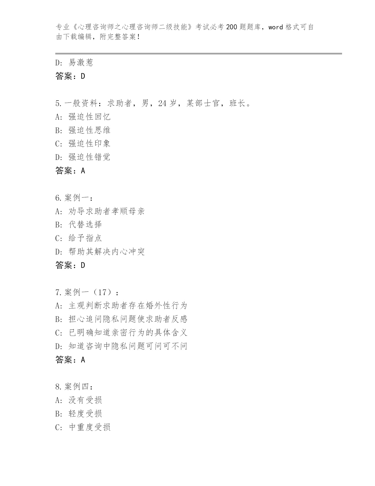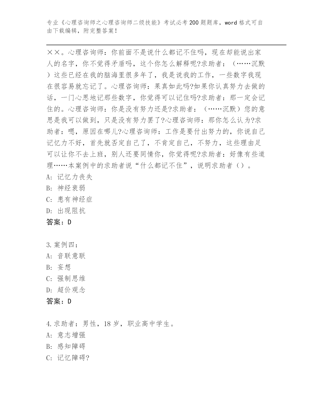 陕西省2024年《心理咨询师之心理咨询师二级技能》考试必考200题内部题库(突破训练)