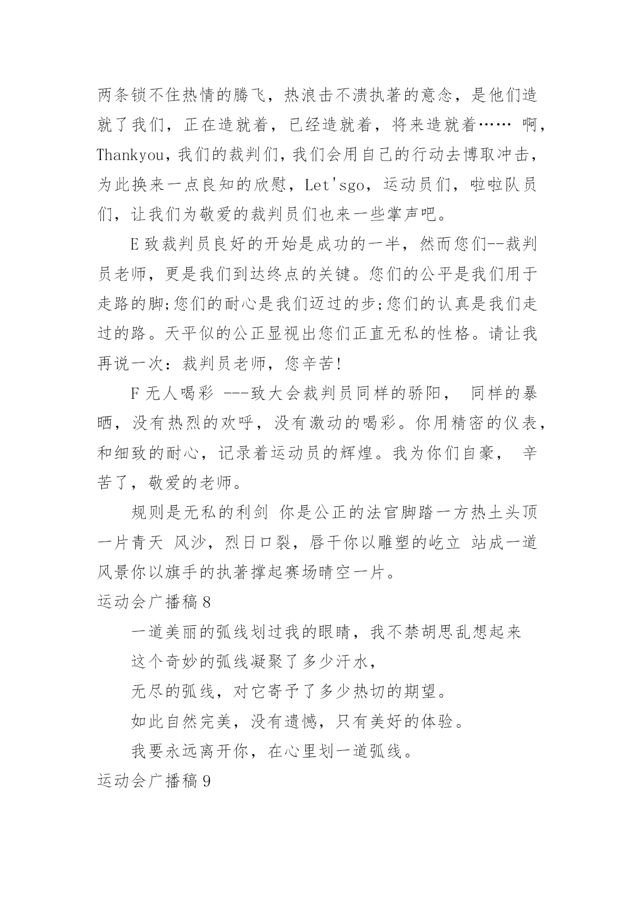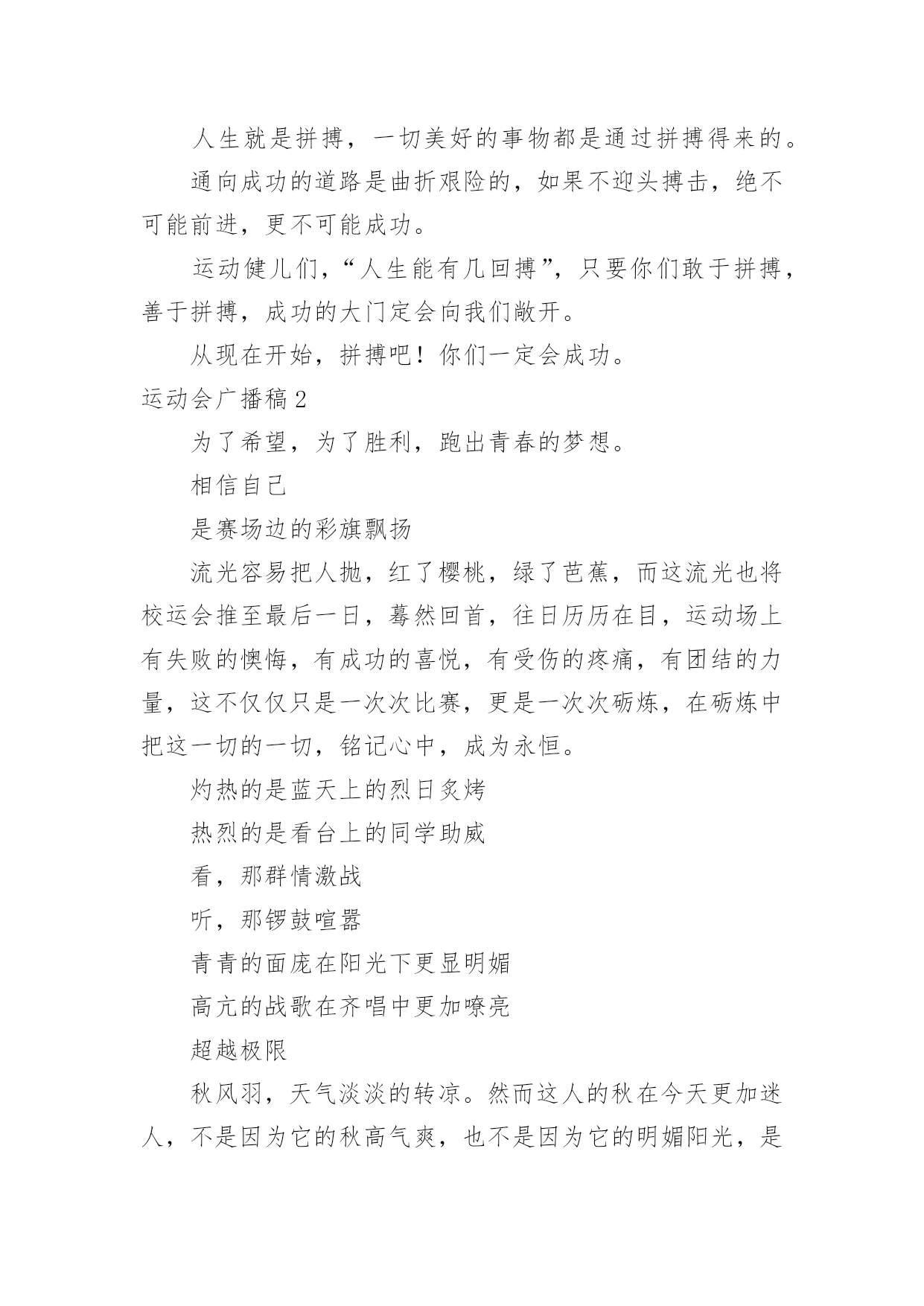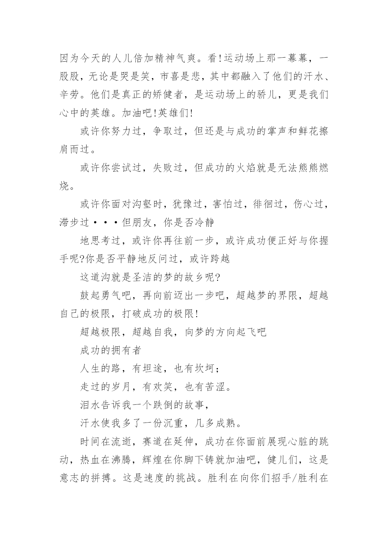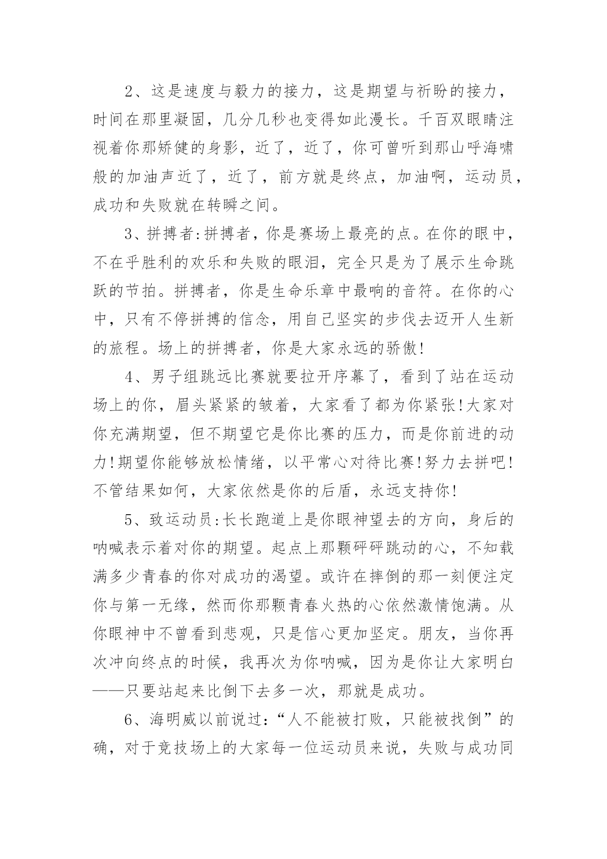 运动会广播稿运动会广播稿汇编15篇在广播站锻炼的学生,我们广播前一般都会提前做好广播稿,广播稿写得好才会有好的节目效果,广播稿应该怎么写才好呢?下面是小编精心整理的运动会广播稿,欢迎阅读,希望大家能够喜欢。运动会广播稿1痛并快乐着,是你们赛场上龙腾虎跃的心灵写照;累并感动着,是你们同台竞技争先的切身体验;忍并振奋着,被关注期待的你们在坚持和前进。成败得失远不能与竞技快感相比,跌倒爬起,重新开始,比拼的是毅力和意志。无形的考验让你们不知所措,但竞技的遗憾让你们清醒自明,焕发挑战的斗志和激情。重在参与,享受这样的直白体验。淬炼自身,升华面对不快的心境。每段青春都要风吹雨打,才会别致;每寸记忆只有心存感恩,才会感动。年华似水,充实让生命精彩,努力让目标实现。雄鹰展翅,天空是舞台;音符跳动,青春因你们而悠扬婉转。我们为你喝彩!人生就是拼搏,一切美好的事物都是通过拼搏得来的。通向成功的道路是曲折艰险的,如果不迎头搏击,绝不可能前进,更不可能成功。运动健儿们,“人生能有几回搏”,只要你们敢于拼搏,善于拼搏,成功的大门定会向我们敞开。从现在开始,拼搏吧!你们一定会成功。运动会广播稿2为了希望,为了胜利,跑出青春的梦想。相信自己是赛场边的彩旗飘扬流光容易把人抛,红了樱桃,绿了芭蕉,而这流光也将校运会推至最后一日,蓦然回首,往日历历在目,运动场上有失败的懊悔,有成功的喜悦,有受伤的疼痛,有团结的力量,这不仅仅只是一次次比赛,更是一次次砺炼,在砺炼中把这一切的一切,铭记心中,成为永恒。灼热的是蓝天上的烈日炙烤热烈的是看台上的同学助威看,那群情激战听,那锣鼓喧嚣青青的面庞在阳光下更显明媚高亢的战歌在齐唱中更加嘹亮超越极限秋风羽,天气淡淡的转凉。然而这人的秋在今天更加迷人,不是因为它的秋高气爽,也不是因为它的明媚阳光,是因为今天的人儿倍加精神气爽。看!运动场上那一幕幕,一股股,无论是哭是笑,市喜是悲,其中都融入了他们的汗水、辛劳。他们是真正的矫健者,是运动场上的骄儿,更是我们心中的英雄。加油吧!英雄们!或许你努力过,争取过,但还是与成功的掌声和鲜花擦肩而过。或许你尝试过,失败过,但成功的火焰就是无法熊熊燃烧。或许你面对沟壑时,犹豫过,害怕过,徘徊过,伤心过,滞步过···但朋友,你是否冷静地思考过,或许你再往前一步,或许成功便正好与你握手呢?你是否平静地反问过,或许跨越这道沟就是圣洁的梦的故乡呢?鼓起勇气吧,再向前迈出一步吧,超越梦的界限,超越自己的极限,打破成功的极限!超越极限,超越自我,向梦的方向起飞吧成功的拥有者人生的路,有坦途,也有坎坷;走过的岁月,有欢笑,也有苦涩。泪水告诉我一个跌倒的故事,汗水使我多了一份沉重,几多成熟。时间在流逝,赛道在延伸,成功在你面前展现心脏的跳动,热血在沸腾,辉煌在你脚下铸就加油吧,健儿们,这是意志的拼搏。这是速度的挑战。胜利在向你们招手/胜利在向你们呼唤理想毕竟不同于现实,失败是生活的一部分,谁也无法选择,无法拒绝。人生要自己去拼搏,去奋斗,在风雨中百屈不挠、勇往直前,在自己的每个驿站都留下一段无悔的回忆。流泪不是失落,徘徊不是迷惑,成功属于那些战胜失败,坚持不懈,勇于追求梦想的人。感谢您的阅读,祝您生活愉快。运动会广播稿3运动会的最后一个项目——800米女子组比赛开始了,我班选手黄馨霏站在起点,只听“轰”的一声,六名选手立刻发力,谁也不让着谁。各班的啦啦队们与选手们一起奔跑,不断地给她们加油鼓劲。落后的黄馨霏看着这么多人为她加油,瞬间充满了力量,加速前进,一个、二个、三个,对手一个接一个地被她超越,最终得了第二名。虽然没能得第一,可你在我们心中是最棒的!运动会广播稿41、数不请你跨出了多少坚实的步履,数不请你留下了多少汗滴。只有那悦耳的加油声,在你耳边环绕,激励你超越极限,超越自我。应对成功你从不自傲,应对失败你也只是轻轻一笑,你明白,你是大家永远的骄傲!2、这是速度与毅力的接力,这是期望与祈盼的接力,时间在那里凝固,几分几秒也变得如此漫长。千百双眼睛注视着你那矫健的身影,近了,近了,你可曾听到那山呼海啸般的加油声近了,近了,前方就是终点,加油啊,运动员,成功和失败就在转瞬之间。3、拼搏者:拼搏者,你是赛场上最亮的点。在你的眼中,不在乎胜利的欢乐和失败的眼泪,完全只是为了展示生命跳跃的节拍。拼搏者,你是生命乐章中最响的音符。在你的心中,只有不停拼搏的信念,用自己坚实的步伐去迈开人生新的旅程。场上的拼搏者,你是大家永远的骄傲!4、男子组跳远比赛就要拉开序幕了,看到了站在运动场上的你,眉头紧紧的皱着,大家看了都为你紧张!大家对你充满期望,但不期望它是你比赛的压力,而是你前进的动力!期望你能够放松情绪,以平常心对待比赛!努力去拼吧!不管结果如何,大家依然是你的后盾,永远支持你!5、致运动员:长长跑道上是你眼神望去的