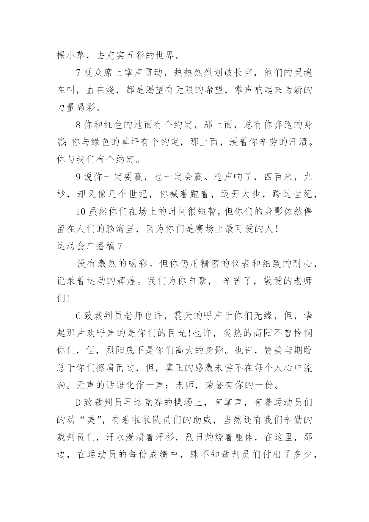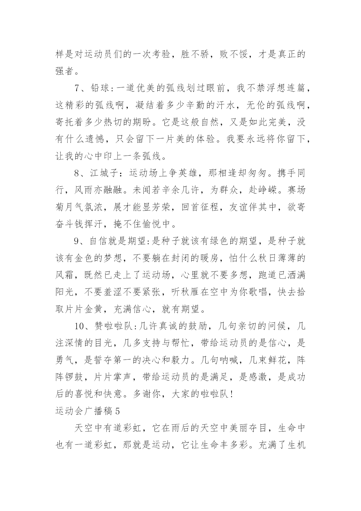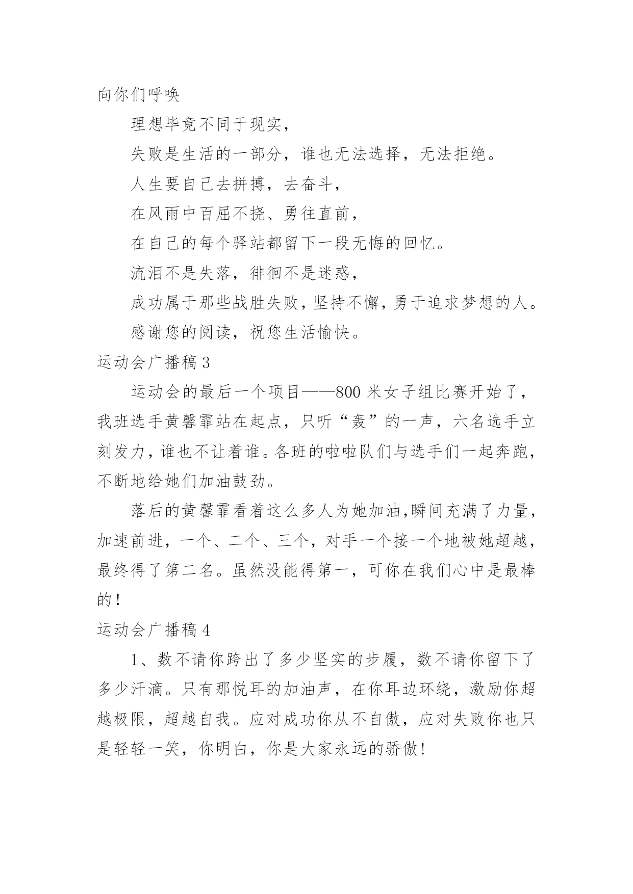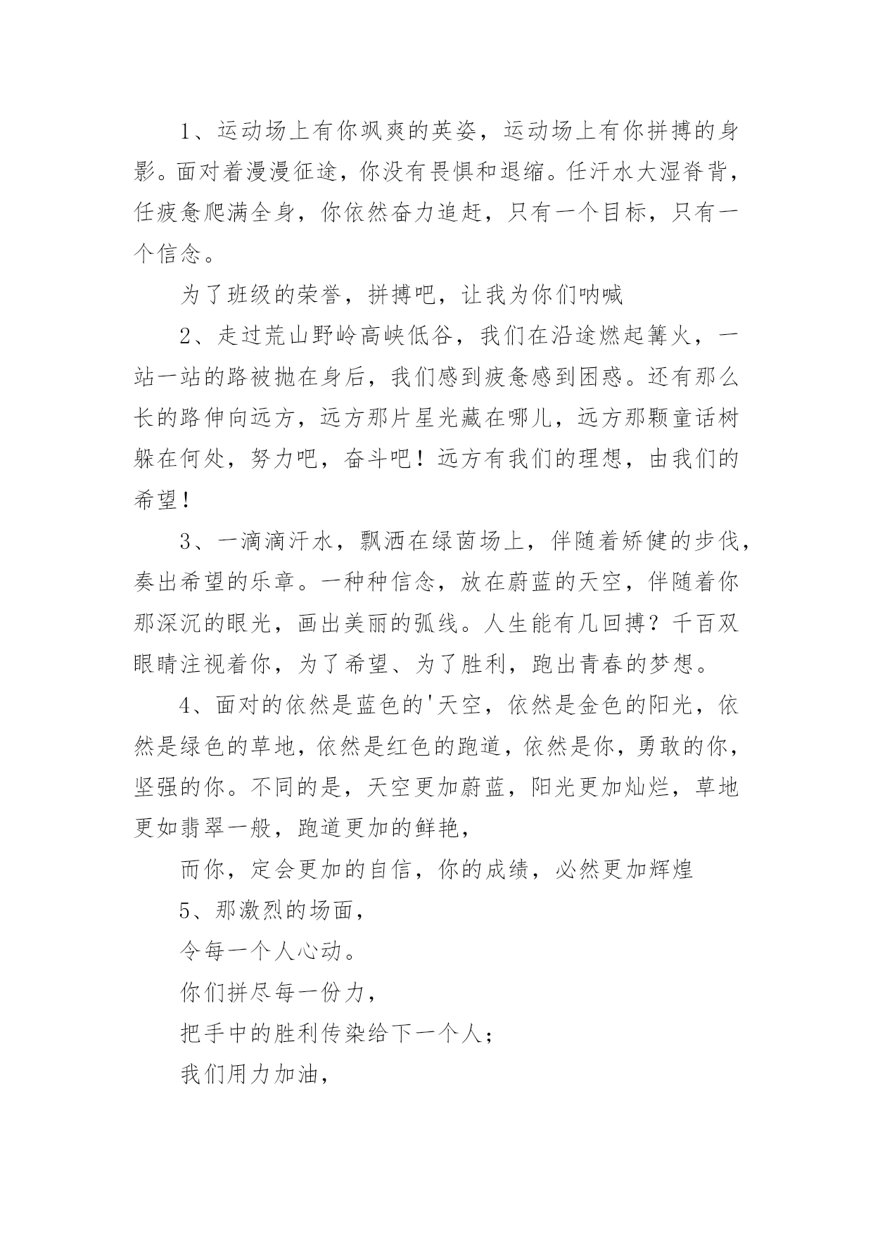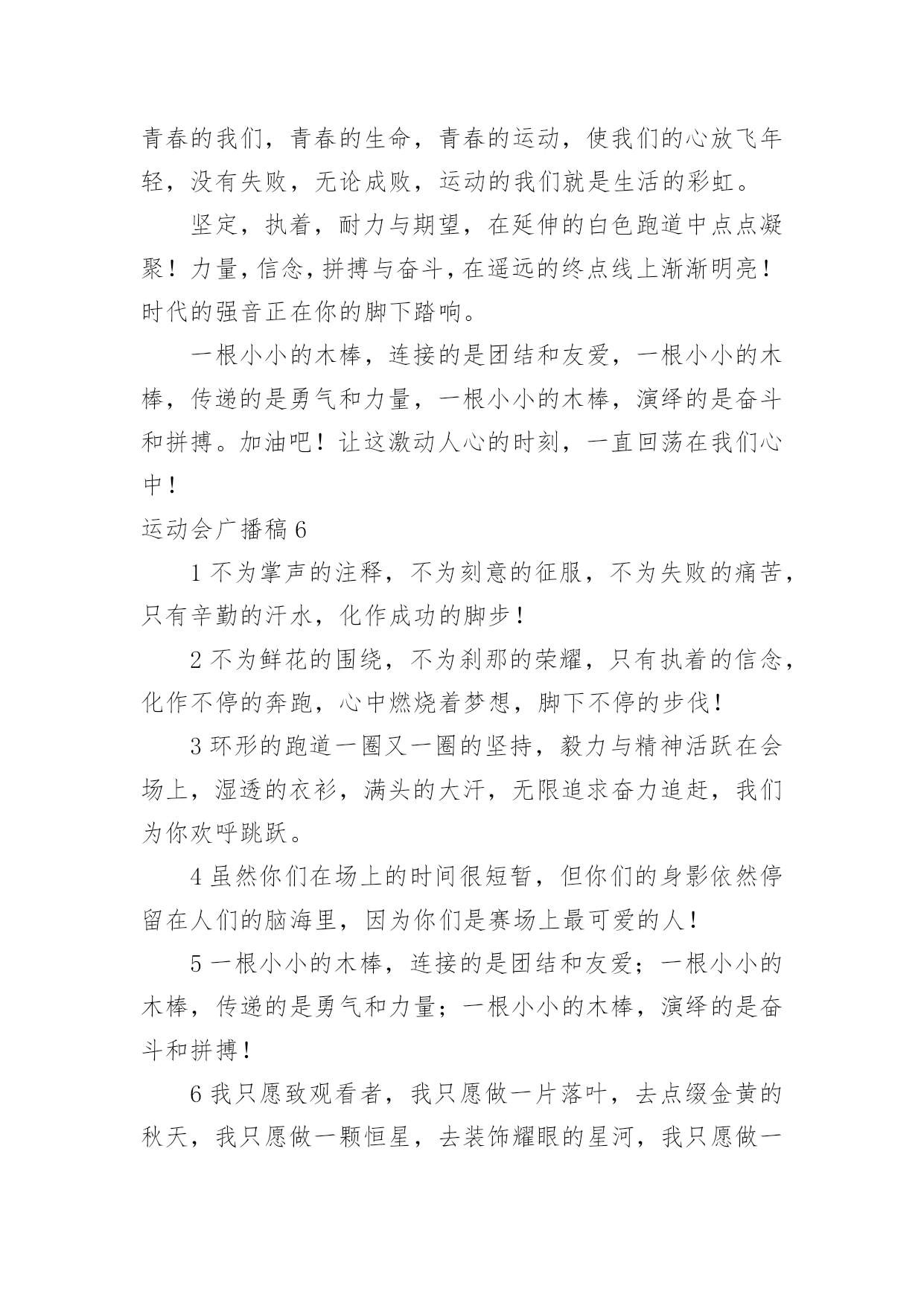 运动会广播稿运动会广播稿汇编15篇在广播站锻炼的学生,我们广播前一般都会提前做好广播稿,广播稿写得好才会有好的节目效果,广播稿应该怎么写才好呢?下面是小编精心整理的运动会广播稿,欢迎阅读,希望大家能够喜欢。运动会广播稿1痛并快乐着,是你们赛场上龙腾虎跃的心灵写照;累并感动着,是你们同台竞技争先的切身体验;忍并振奋着,被关注期待的你们在坚持和前进。成败得失远不能与竞技快感相比,跌倒爬起,重新开始,比拼的是毅力和意志。无形的考验让你们不知所措,但竞技的遗憾让你们清醒自明,焕发挑战的斗志和激情。重在参与,享受这样的直白体验。淬炼自身,升华面对不快的心境。每段青春都要风吹雨打,才会别致;每寸记忆只有心存感恩,才会感动。年华似水,充实让生命精彩,努力让目标实现。雄鹰展翅,天空是舞台;音符跳动,青春因你们而悠扬婉转。我们为你喝彩!人生就是拼搏,一切美好的事物都是通过拼搏得来的。通向成功的道路是曲折艰险的,如果不迎头搏击,绝不可能前进,更不可能成功。运动健儿们,“人生能有几回搏”,只要你们敢于拼搏,善于拼搏,成功的大门定会向我们敞开。从现在开始,拼搏吧!你们一定会成功。运动会广播稿2为了希望,为了胜利,跑出青春的梦想。相信自己是赛场边的彩旗飘扬流光容易把人抛,红了樱桃,绿了芭蕉,而这流光也将校运会推至最后一日,蓦然回首,往日历历在目,运动场上有失败的懊悔,有成功的喜悦,有受伤的疼痛,有团结的力量,这不仅仅只是一次次比赛,更是一次次砺炼,在砺炼中把这一切的一切,铭记心中,成为永恒。灼热的是蓝天上的烈日炙烤热烈的是看台上的同学助威看,那群情激战听,那锣鼓喧嚣青青的面庞在阳光下更显明媚高亢的战歌在齐唱中更加嘹亮超越极限秋风羽,天气淡淡的转凉。然而这人的秋在今天更加迷人,不是因为它的秋高气爽,也不是因为它的明媚阳光,是因为今天的人儿倍加精神气爽。看!运动场上那一幕幕,一股股,无论是哭是笑,市喜是悲,其中都融入了他们的汗水、辛劳。他们是真正的矫健者,是运动场上的骄儿,更是我们心中的英雄。加油吧!英雄们!或许你努力过,争取过,但还是与成功的掌声和鲜花擦肩而过。或许你尝试过,失败过,但成功的火焰就是无法熊熊燃烧。或许你面对沟壑时,犹豫过,害怕过,徘徊过,伤心过,滞步过···但朋友,你是否冷静地思考过,或许你再往前一步,或许成功便正好与你握手呢?你是否平静地反问过,或许跨越这道沟就是圣洁的梦的故乡呢?鼓起勇气吧,再向前迈出一步吧,超越梦的界限,超越自己的极限,打破成功的极限!超越极限,超越自我,向梦的方向起飞吧成功的拥有者人生的路,有坦途,也有坎坷;走过的岁月,有欢笑,也有苦涩。泪水告诉我一个跌倒的故事,汗水使我多了一份沉重,几多成熟。时间在流逝,赛道在延伸,成功在你面前展现心脏的跳动,热血在沸腾,辉煌在你脚下铸就加油吧,健儿们,这是意志的拼搏。这是速度的挑战。胜利在向你们招手/胜利在向你们呼唤理想毕竟不同于现实,失败是生活的一部分,谁也无法选择,无法拒绝。人生要自己去拼搏,去奋斗,在风雨中百屈不挠、勇往直前,在自己的每个驿站都留下一段无悔的回忆。流泪不是失落,徘徊不是迷惑,成功属于那些战胜失败,坚持不懈,勇于追求梦想的人。感谢您的阅读,祝您生活愉快。运动会广播稿3运动会的最后一个项目——800米女子组比赛开始了,我班选手黄馨霏站在起点,只听“轰”的一声,六名选手立刻发力,谁也不让着谁。各班的啦啦队们与选手们一起奔跑,不断地给她们加油鼓劲。落后的黄馨霏看着这么多人为她加油,瞬间充满了力量,加速前进,一个、二个、三个,对手一个接一个地被她超越,最终得了第二名。虽然没能得第一,可你在我们心中是最棒的!运动会广播稿41、数不请你跨出了多少坚实的步履,数不请你留下了多少汗滴。只有那悦耳的加油声,在你耳边环绕,激励你超越极限,超越自我。应对成功你从不自傲,应对失败你也只是轻轻一笑,你明白,你是大家永远的骄傲!2、这是速度与毅力的接力,这是期望与祈盼的接力,时间在那里凝固,几分几秒也变得如此漫长。千百双眼睛注视着你那矫健的身影,近了,近了,你可曾听到那山呼海啸般的加油声近了,近了,前方就是终点,加油啊,运动员,成功和失败就在转瞬之间。3、拼搏者:拼搏者,你是赛场上最亮的点。在你的眼中,不在乎胜利的欢乐和失败的眼泪,完全只是为了展示生命跳跃的节拍。拼搏者,你是生命乐章中最响的音符。在你的心中,只有不停拼搏的信念,用自己坚实的步伐去迈开人生新的旅程。场上的拼搏者,你是大家永远的骄傲!4、男子组跳远比赛就要拉开序幕了,看到了站在运动场上的你,眉头紧紧的皱着,大家看了都为你紧张!大家对你充满期望,但不期望它是你比赛的压力,而是你前进的动力!期望你能够放松情绪,以平常心对待比赛!努力去拼吧!不管结果如何,大家依然是你的后盾,永远支持你!5、致运动员:长长跑道上是你眼神望去的