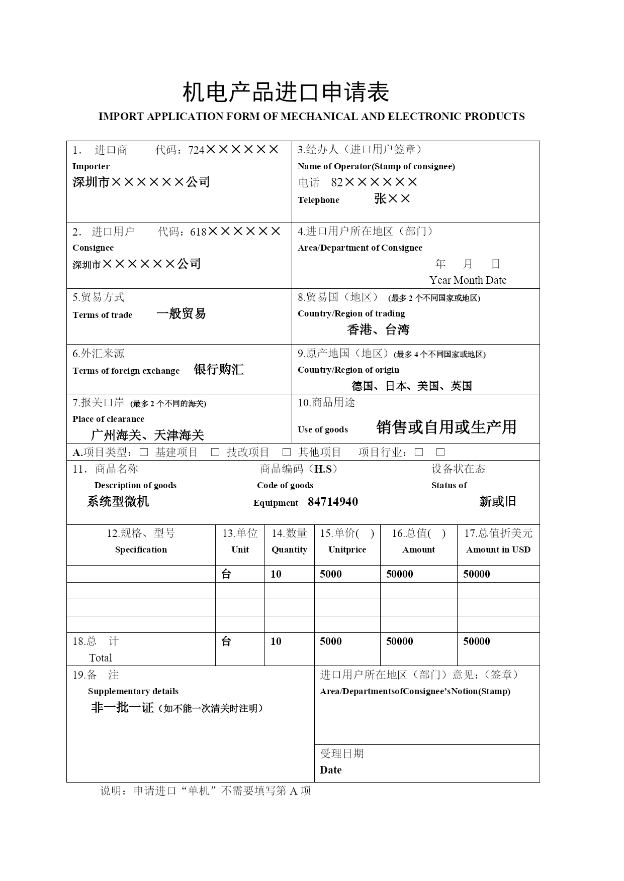 机电产品进口申请表IMPORTAPPLICATIONFORMOFMECHANICALANDELECTRONICPRODUCTS进口商代码:724××××××Importer深圳市××××××公司3.经办人(进口用户签章)NameofOperator(Stampofconsignee)电话82××××××Telephone张××进口用户代码:618××××××Consignee深圳市××××××公司4.进口用户所在地区(部门)Area/DepartmentofConsignee年月日YearMonthDate5.贸易方式Termsoftrade一般贸易8.贸易国(地区)(最多2个不同国家或地区)Country/Regionoftrading香港、台湾6.外汇来源Termsofforeignexchange银行购汇9.原产地国(地区)(最多4个不同国家或地区)Country/Regionoforigin德国、日本、美国、英国7.报关口岸(最多2个不同的海关)Placeofclearance广州海关、天津海关10.商品用途Useofgoods销售或自用或生产用A.项目类型:□基建项目□技改项目□其他项目项目行业:□□11.商品名称商品编码(H.S)设备状在态DescriptionofgoodsCodeofgoodsStatusof系统型微机Equipment84714940新或旧12.规格、型号Specification13.单位Unit14.数量Quantity15.单价()Unitprice16.总值()Amount17.总值折美元AmountinUSD台105000500005000018.总计Total台105000500005000019.备注Supplementarydetails非一批一证(如不能一次清关时注明)进口用户所在地区(部门)意见:(签章)Area/DepartmentsofConsignee’sNotion(Stamp)受理日期Date说明:申请进口“单机”不需要填写第A项机电产品进口附表IMPORTAPPENDIXOFMECHANICALANDELECTRONICPRODUCTS共页第页商品名称×××零配件商品编码(H.S)87××××××设备状态新DescriptionofgoodsCodeofgoodsStatusofequipment序号SN规格、型号Specification单位Unit数量Quantity单价(美元)UnitPrice总值()Amount总值折美元AmountinUSD1×××××台22××4××4××2×××××台12××2××2××3×××××台13××3××3××4×××××台41××4××4××合计台××××××××××××注:此表必须电脑打印一式两份。
