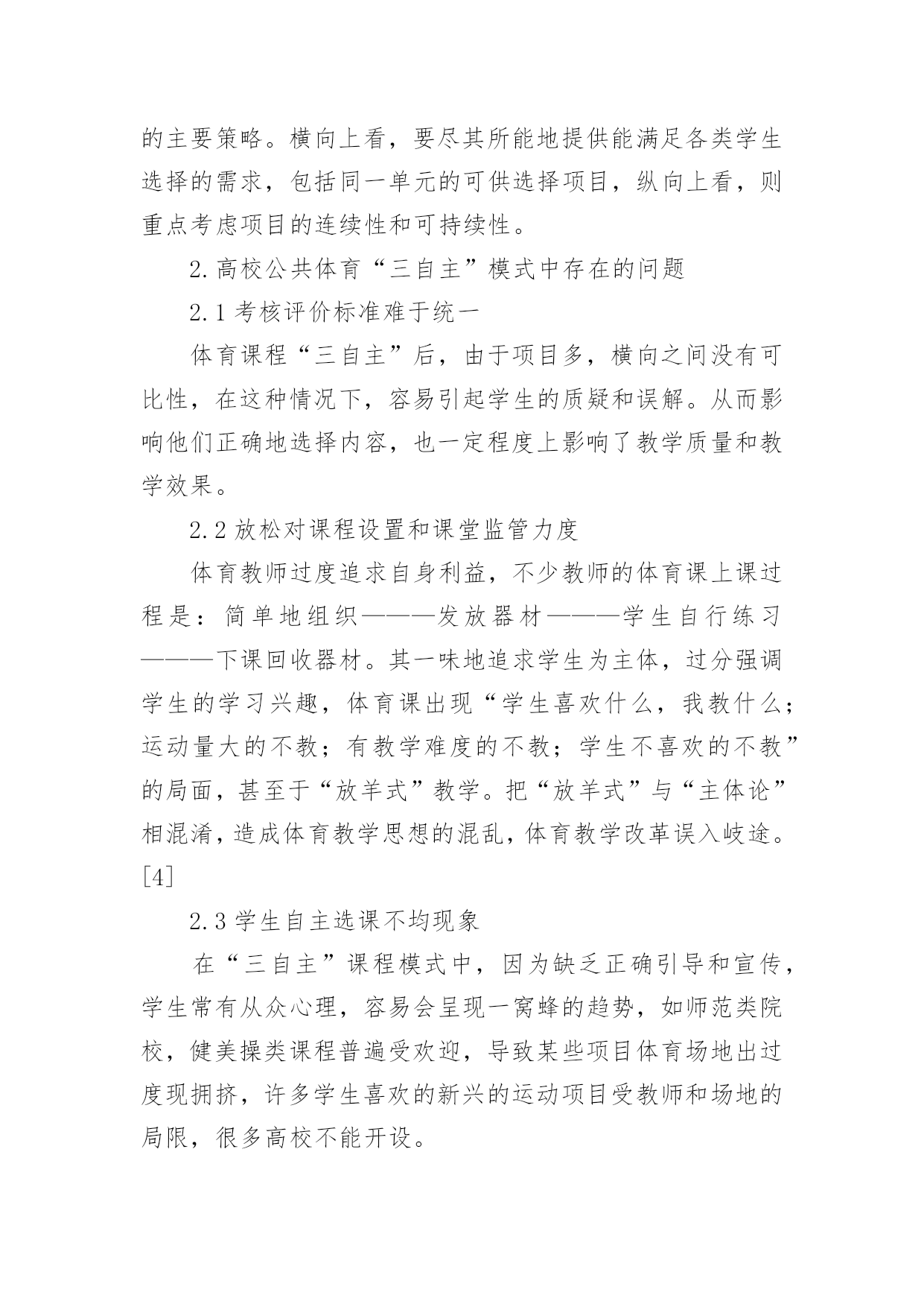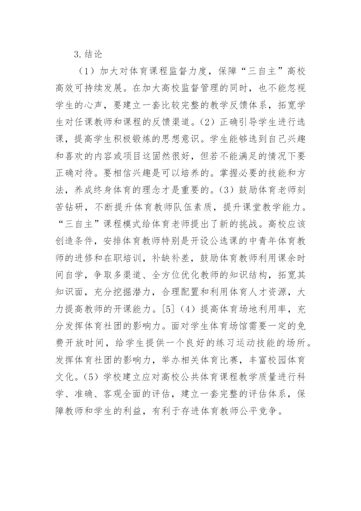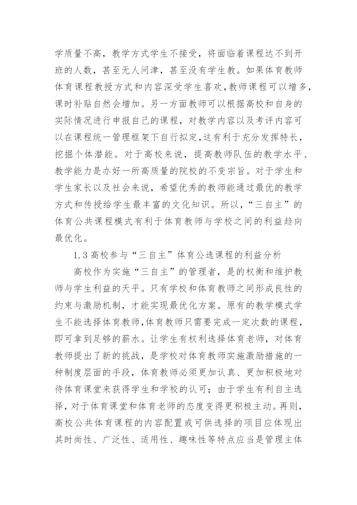 高校公共体育的三自主教学模式的论文关于高校公共体育的三自主教学模式的论文1.“三自主”模式下博弈主体利益分析1.1学生参与“三自主”公选体育课程的利益分析在传统教学模式下,学生没有选择体育教师的权利,不能保证一定会喜欢体育教师,在一定程度影响了教师的教学,学生想获得高分,体育教师不一定认同,师生矛盾突显。而“三自主”教学模式下,学生有权力选择老师,教师也有权利设置自己的教学内容,学生学习自己喜欢的体育课程,选择自己喜欢的体育老师,话说“兴趣是最好的老师”,有了兴趣,课堂的气氛和教学质量有相对保证,使学生与体育教师的博弈中达到纳什均衡点,学生与体育教师达到最优化。但是,学生之间属于纳什“公共地悲剧”模型的博弈模式。即在老师和空间资源固定的情况下,随着学生人数的增加,有一个最优化的师生比例出现,持续增加学生数量,会导致博弈主体各方利益受损,而达不到利益最优化。1.2体育教师参与“三自主”体育公选课程的利益分析体育教师本身是教育的主要执行者与参与者,体育教师的最大利益是获得足够教学课时费,获得学校、同行以及学生尊重和认可,体现自身价值。[3]高校体育“三自主”后,打破体育教师了原有的“霸主”地位,体育教师而言,机遇与挑战并存。一方面在高校实施了绩效工程后,体育教师教学质量不高,教学方式学生不接受,将面临着课程达不到开班的人数,甚至无人问津,甚至没有学生教。如果体育教师体育课程教授方式和内容深受学生喜欢,教师课程可以增多,课时补贴自然会增加。另一方面教师可以根据高校和自身的实际情况进行申报自己的课程,对教学内容以及考评内容可以在课程统一管理框架下自行拟定,这有利于充分发挥特长,挖掘个体潜能。对于高校来说,提高教师队伍的教学水平、教学能力是办好一所高质量的院校的不变宗旨。对于学生和学生家长以及社会来说,希望优秀的教师能通过最优的教学方式和传授给学生最丰富的文化知识。所以,“三自主”的体育公共课程模式有利于体育教师与学校之间的利益趋向最优化。1.3高校参与“三自主”体育公选课程的利益分析高校作为实施“三自主”的管理者,是的权衡和维护教师与学生利益的天平。只有学校和体育教师之间形成良性的约束与激励机制,才能实现最优化方案。原有的教学模式学生不能选择体育教师,体育教师只需要完成一定次数的课程,即可拿到足够的薪水。让学生有权利选择体育老师,对体育教师提出了新的挑战,是学校对体育教师实施激励措施的一种制度层面的手段,体育教师必须更加认真、更加积极地对待体育课堂来获得学生和学校的认可;由于学生有利自主选择,对于体育课堂和体育老师的态度变得更积极主动。再则,高校公共体育课程的内容配置或可供选择的项目应体现出其时尚性、广泛性、适用性、趣味性等特点应当是管理主体的主要策略。横向上看,要尽其所能地提供能满足各类学生选择的需求,包括同一单元的可供选择项目,纵向上看,则重点考虑项目的连续性和可持续性。2.高校公共体育“三自主”模式中存在的问题2.1考核评价标准难于统一体育课程“三自主”后,由于项目多,横向之间没有可比性,在这种情况下,容易引起学生的质疑和误解。从而影响他们正确地选择内容,也一定程度上影响了教学质量和教学效果。2.2放松对课程设置和课堂监管力度体育教师过度追求自身利益,不少教师的体育课上课过程是:简单地组织———发放器材———学生自行练习———下课回收器材。其一味地追求学生为主体,过分强调学生的学习兴趣,体育课出现“学生喜欢什么,我教什么;运动量大的不教;有教学难度的不教;学生不喜欢的不教”的局面,甚至于“放羊式”教学。把“放羊式”与“主体论”相混淆,造成体育教学思想的混乱,体育教学改革误入岐途。[4]2.3学生自主选课不均现象在“三自主”课程模式中,因为缺乏正确引导和宣传,学生常有从众心理,容易会呈现一窝蜂的趋势,如师范类院校,健美操类课程普遍受欢迎,导致某些项目体育场地出过度现拥挤,许多学生喜欢的新兴的运动项目受教师和场地的局限,很多高校不能开设。3.结论(1)加大对体育课程监督力度,保障“三自主”高校高效可持续发展。在加大高校监督管理的同时,也不能忽视学生的心声,要建立一套比较完整的教学反馈体系,拓宽学生对任课教师和课程的反馈渠道。(2)正确引导学生进行选课,提高学生积极锻炼的思想意识。学生能够选到自己兴趣和喜欢的内容或项目这固然很好,但若不能满足的情况下要正确对待。要相信兴趣是可以培养的。掌握必要的技能和方法,养成终身体育的理念才是重要的。(3)鼓励体育老师刻苦钻研,不断提升体育教师队伍素质,提升课堂教学能力。“三自主”课程模式给体育老师提出了新的挑战。高校应该创造条件,安排体育教师特别是开设公选课的中青年体育教师的进修和在职培训,补缺补差,鼓励体育教师利用课余时间自学,争取多渠道、全方位优化教师的知识结构,拓宽其知识面,充分挖掘潜力