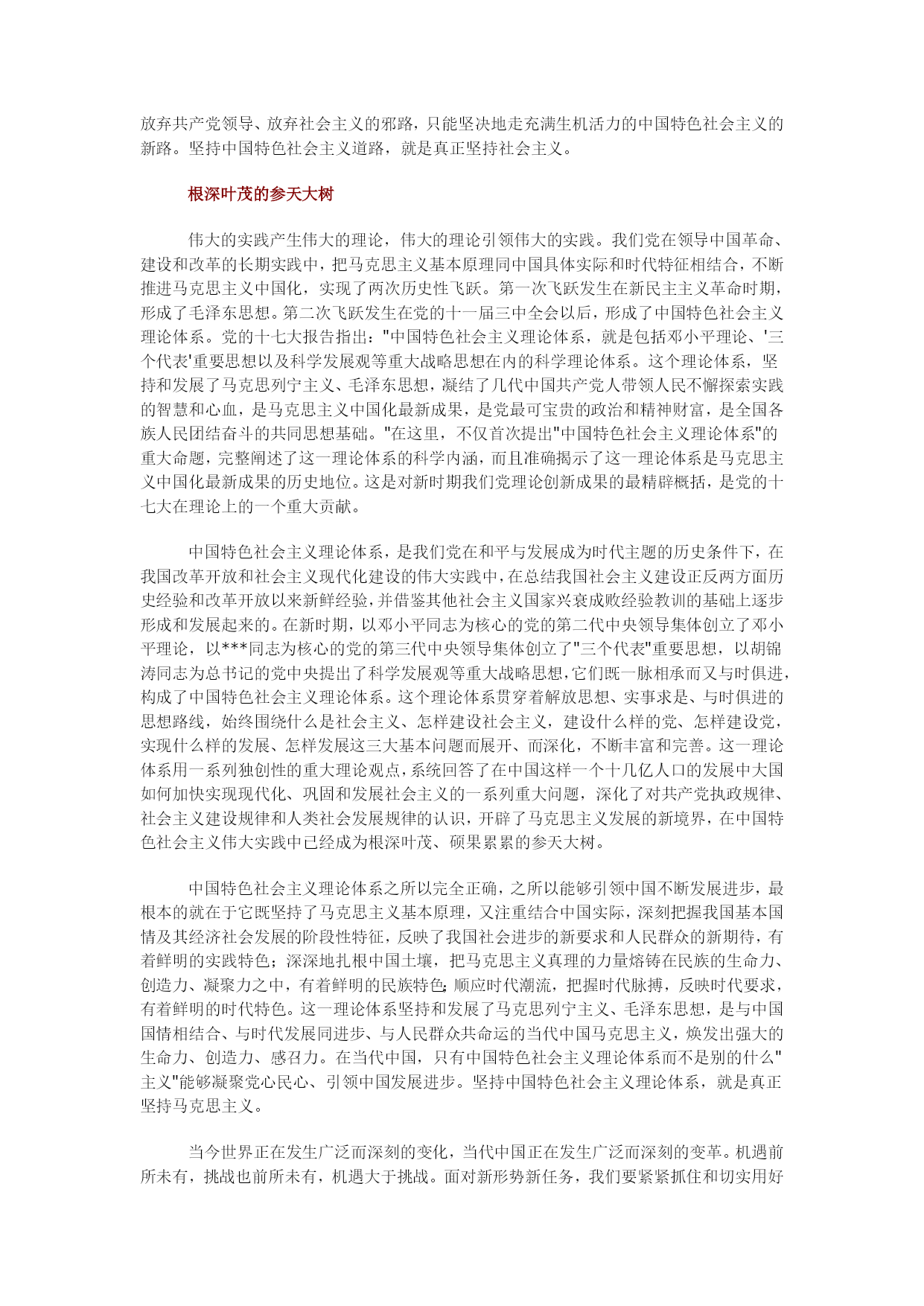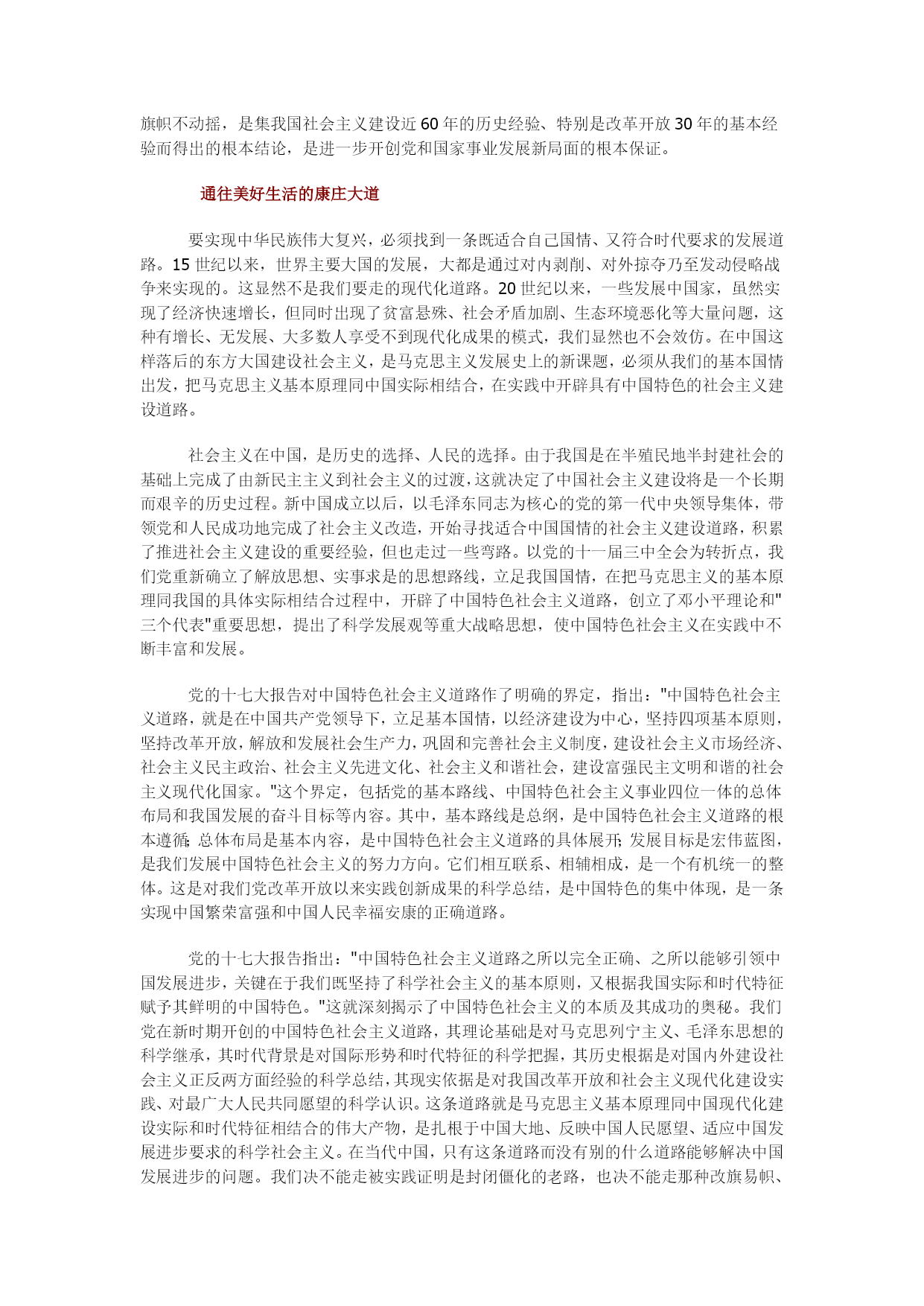 理论热点面对面之一:凝聚在中国特色社会主义伟大旗帜下为什么要坚持和发展中国特色社会主义党的十七大是在我国改革发展关键阶段召开的一次十分重要的会议。这次大会最重要的历史贡献和最引人注目的亮点,就是进一步阐明了中国特色社会主义这一党在新时期的理论主题和实践主题,高高举起中国特色社会主义伟大旗帜。在我们党的历史上,党的十七大不仅第一次鲜明地提出了要高举中国特色社会主义伟大旗帜,将其载入党章,而且第一次高度概括了高举中国特色社会主义伟大旗帜的根本要求,明确提出最根本的就是要坚持"中国特色社会主义道路"和"中国特色社会主义理论体系"。这就向世人郑重宣示了我们党坚持和发展中国特色社会主义的决心和信心,充分体现了全党全国各族人民的共同意志和愿望。伟大旗帜在神州大地高高飘扬放眼全球,风云变幻,时代潮流滚滚向前,中华大地风光无限美好。如果说世界社会主义运动仍然处于低潮,那么,一个面向现代化、面向世界、面向未来的社会主义中国则巍然屹立在世界东方,创造了举世瞩目的人间奇迹,越来越显示出蓬勃生机和活力。改革开放30年,弹指一挥间,中华民族却沧桑巨变,摆脱了贫困,告别了落后,大踏步赶上时代潮流,迎来伟大复兴的光明前景。到底是什么推动了中国的腾飞?归结起来,就是我们党高举中国特色社会主义伟大旗帜,把亿万人民凝聚在这一旗帜下,开展了中国特色社会主义的伟大实践。进入改革开放新时期,我们党的全部理论和实践探索都是围绕坚持和发展中国特色社会主义来展开、来深化的。中国特色社会主义作为新时期以来我们党继续推进马克思主义中国化的伟大历史性创造,体现在实践上,就是开辟了中国特色社会主义道路;体现在理论上,就是形成了中国特色社会主义理论体系;体现在政治上,就是要高举中国特色社会主义伟大旗帜。在党的十二大上,邓小平同志第一次明确提出"中国特色社会主义"这个重大命题,强调走自己的道路,建设有中国特色的社会主义。从那时起,"中国特色社会主义"就成为党的历次全国代表大会的"主题词"。党的十三大系统阐述了社会主义初级阶段理论,明确提出建设有中国特色社会主义理论,确立了党的"一个中心、两个基本点"的基本路线。党的十四大系统概括了建设有中国特色社会主义理论的主要内容,明确了我国经济体制的改革目标是建立社会主义市场经济体制。党的十五大明确提出邓小平理论这一科学概念,确立邓小平理论为党的指导思想并写入党章。党的十六大科学阐述了"三个代表"重要思想,并将这一重大理论成果作为党的指导思想写入党章。党的十七大高举中国特色社会主义伟大旗帜,全面阐述了科学发展观,并把改革开放以来党的理论创新成果统一概括为中国特色社会主义理论体系,对中国特色社会主义道路的内涵作出了更加完整、更加系统的概括,把我们党对中国特色社会主义的认识提升到一个新的高度。胡锦涛同志指出:"中国特色社会主义伟大旗帜,是当代中国发展进步的旗帜,是全党全国各族人民团结奋斗的旗帜。"在当代中国,只有中国特色社会主义旗帜而不是别的什么旗帜能够最大限度地团结和凝聚全国各族人民的智慧和力量。高举中国特色社会主义伟大旗帜不动摇,是集我国社会主义建设近60年的历史经验、特别是改革开放30年的基本经验而得出的根本结论,是进一步开创党和国家事业发展新局面的根本保证。通往美好生活的康庄大道要实现中华民族伟大复兴,必须找到一条既适合自己国情、又符合时代要求的发展道路。15世纪以来,世界主要大国的发展,大都是通过对内剥削、对外掠夺乃至发动侵略战争来实现的。这显然不是我们要走的现代化道路。20世纪以来,一些发展中国家,虽然实现了经济快速增长,但同时出现了贫富悬殊、社会矛盾加剧、生态环境恶化等大量问题,这种有增长、无发展、大多数人享受不到现代化成果的模式,我们显然也不会效仿。在中国这样落后的东方大国建设社会主义,是马克思主义发展史上的新课题,必须从我们的基本国情出发,把马克思主义基本原理同中国实际相结合,在实践中开辟具有中国特色的社会主义建设道路。社会主义在中国,是历史的选择、人民的选择。由于我国是在半殖民地半封建社会的基础上完成了由新民主主义到社会主义的过渡,这就决定了中国社会主义建设将是一个长期而艰辛的历史过程。新中国成立以后,以毛泽东同志为核心的党的第一代中央领导集体,带领党和人民成功地完成了社会主义改造,开始寻找适合中国国情的社会主义建设道路,积累了推进社会主义建设的重要经验,但也走过一些弯路。以党的十一届三中全会为转折点,我们党重新确立了解放思想、实事求是的思想路线,立足我国国情,在把马克思主义的基本原理同我国的具体实际相结合过程中,开辟了中国特色社会主义道路,创立了邓小平理论和"三个代表"重要思想,提出了科学发展观等重大战略思想,使中国特色社会主义在实践中不断丰富和发展。党的十七大报告对中国特色社会主义道路作了明确的界定,指出