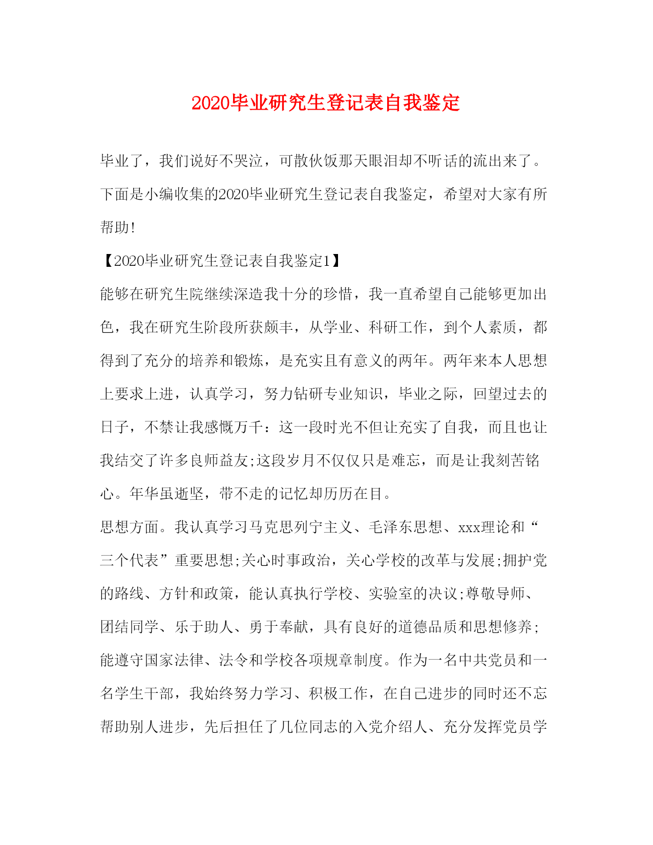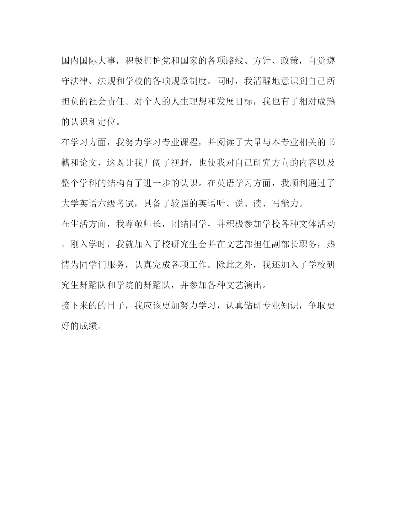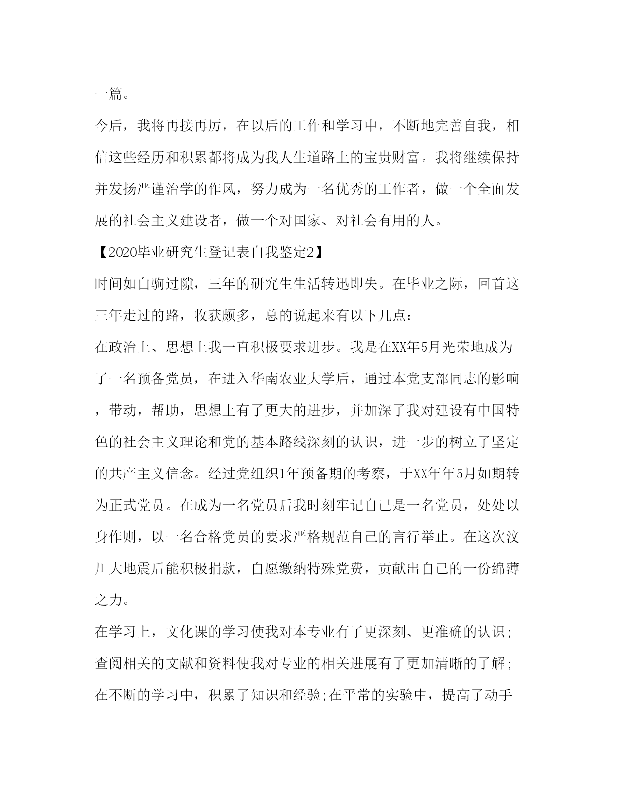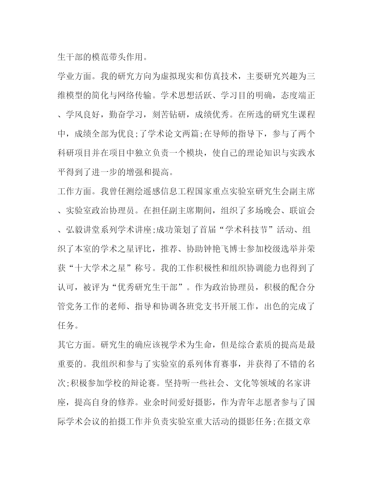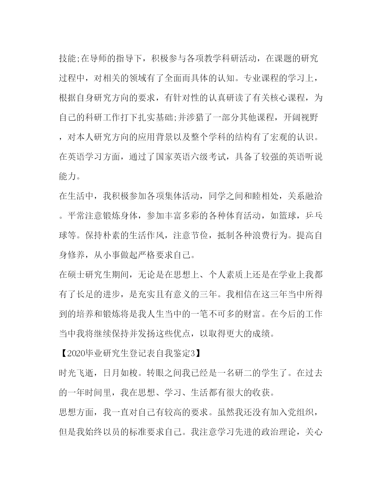 PAGE此资料由网络收集而来,如有侵权请告知上传者立即删除。资料共分享,我们负责传递知识。2020毕业研究生登记表自我鉴定毕业了,我们说好不哭泣,可散伙饭那天眼泪却不听话的流出来了。下面是小编收集的2020毕业研究生登记表自我鉴定,希望对大家有所帮助!【2020毕业研究生登记表自我鉴定1】能够在研究生院继续深造我十分的珍惜,我一直希望自己能够更加出色,我在研究生阶段所获颇丰,从学业、科研工作,到个人素质,都得到了充分的培养和锻炼,是充实且有意义的两年。两年来本人思想上要求上进,认真学习,努力钻研专业知识,毕业之际,回望过去的日子,不禁让我感慨万千:这一段时光不但让充实了自我,而且也让我结交了许多良师益友;这段岁月不仅仅只是难忘,而是让我刻苦铭心。年华虽逝坚,带不走的记忆却历历在目。思想方面。我认真学习马克思列宁主义、毛泽东思想、xxx理论和“三个代表”重要思想;关心时事政治,关心学校的改革与发展;拥护党的路线、方针和政策,能认真执行学校、实验室的决议;尊敬导师、团结同学、乐于助人、勇于奉献,具有良好的道德品质和思想修养;能遵守国家法律、法令和学校各项规章制度。作为一名中共党员和一名学生干部,我始终努力学习、积极工作,在自己进步的同时还不忘帮助别人进步,先后担任了几位同志的入党介绍人、充分发挥党员学生干部的模范带头作用。学业方面。我的研究方向为虚拟现实和仿真技术,主要研究兴趣为三维模型的简化与网络传输。学术思想活跃、学习目的明确,态度端正、学风良好,勤奋学习,刻苦钻研,成绩优秀。在所选的研究生课程中,成绩全部为优良;了学术论文两篇;在导师的指导下,参与了两个科研项目并在项目中独立负责一个模块,使自己的理论知识与实践水平得到了进一步的增强和提高。工作方面。我曾任测绘遥感信息工程国家重点实验室研究生会副主席、实验室政治协理员。在担任副主席期间,组织了多场晚会、联谊会、弘毅讲堂系列学术讲座;成功策划了首届“学术科技节”活动、组织了本室的学术之星评比,推荐、协助钟艳飞博士参加校级选举并荣获“十大学术之星”称号。我的工作积极性和组织协调能力也得到了认可,被评为“优秀研究生干部”。作为政治协理员,积极的配合分管党务工作的老师、指导和协调各班党支书开展工作,出色的完成了任务。其它方面。研究生的确应该视学术为生命,但是综合素质的提高是最重要的。我组织和参与了实验室的系列体育赛事,并获得了不错的名次;积极参加学校的辩论赛。坚持听一些社会、文化等领域的名家讲座,提高自身的修养。业余时间爱好摄影,作为青年志愿者参与了国际学术会议的拍摄工作并负责实验室重大活动的摄影任务;在摄文章一篇。今后,我将再接再厉,在以后的工作和学习中,不断地完善自我,相信这些经历和积累都将成为我人生道路上的宝贵财富。我将继续保持并发扬严谨治学的作风,努力成为一名优秀的工作者,做一个全面发展的社会主义建设者,做一个对国家、对社会有用的人。【2020毕业研究生登记表自我鉴定2】时间如白驹过隙,三年的研究生生活转迅即失。在毕业之际,回首这三年走过的路,收获颇多,总的说起来有以下几点:在政治上、思想上我一直积极要求进步。我是在XX年5月光荣地成为了一名预备党员,在进入华南农业大学后,通过本党支部同志的影响,带动,帮助,思想上有了更大的进步,并加深了我对建设有中国特色的社会主义理论和党的基本路线深刻的认识,进一步的树立了坚定的共产主义信念。经过党组织1年预备期的考察,于XX年年5月如期转为正式党员。在成为一名党员后我时刻牢记自己是一名党员,处处以身作则,以一名合格党员的要求严格规范自己的言行举止。在这次汶川大地震后能积极捐款,自愿缴纳特殊党费,贡献出自己的一份绵薄之力。在学习上,文化课的学习使我对本专业有了更深刻、更准确的认识;查阅相关的文献和资料使我对专业的相关进展有了更加清晰的了解;在不断的学习中,积累了知识和经验;在平常的实验中,提高了动手技能;在导师的指导下,积极参与各项教学科研活动,在课题的研究过程中,对相关的领域有了全面而具体的认知。专业课程的学习上,根据自身研究方向的要求,有针对性的认真研读了有关核心课程,为自己的科研工作打下扎实基础;并涉猎了一部分其他课程,开阔视野,对本人研究方向的应用背景以及整个学科的结构有了宏观的认识。在英语学习方面,通过了国家英语六级考试,具备了较强的英语听说能力。在生活中,我积极参加各项集体活动,同学之间和睦相处,关系融洽。平常注意锻炼身体,参加丰富多彩的各种体育活动,如篮球,乒乓球等。保持朴素的生活作风,注意节俭,抵制各种浪费行为。提高自身修养,从小事做起严格要求自己。在硕士研究生期间,无论是在思想上、个人素质上还是在学业上我都有了长足的进步,是充实且有意义的三年。我相信在这三年当中所得到的培养和锻炼将是我