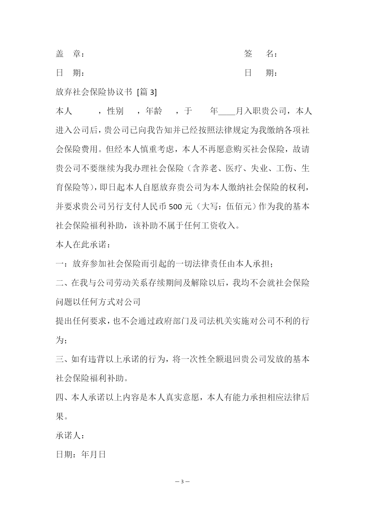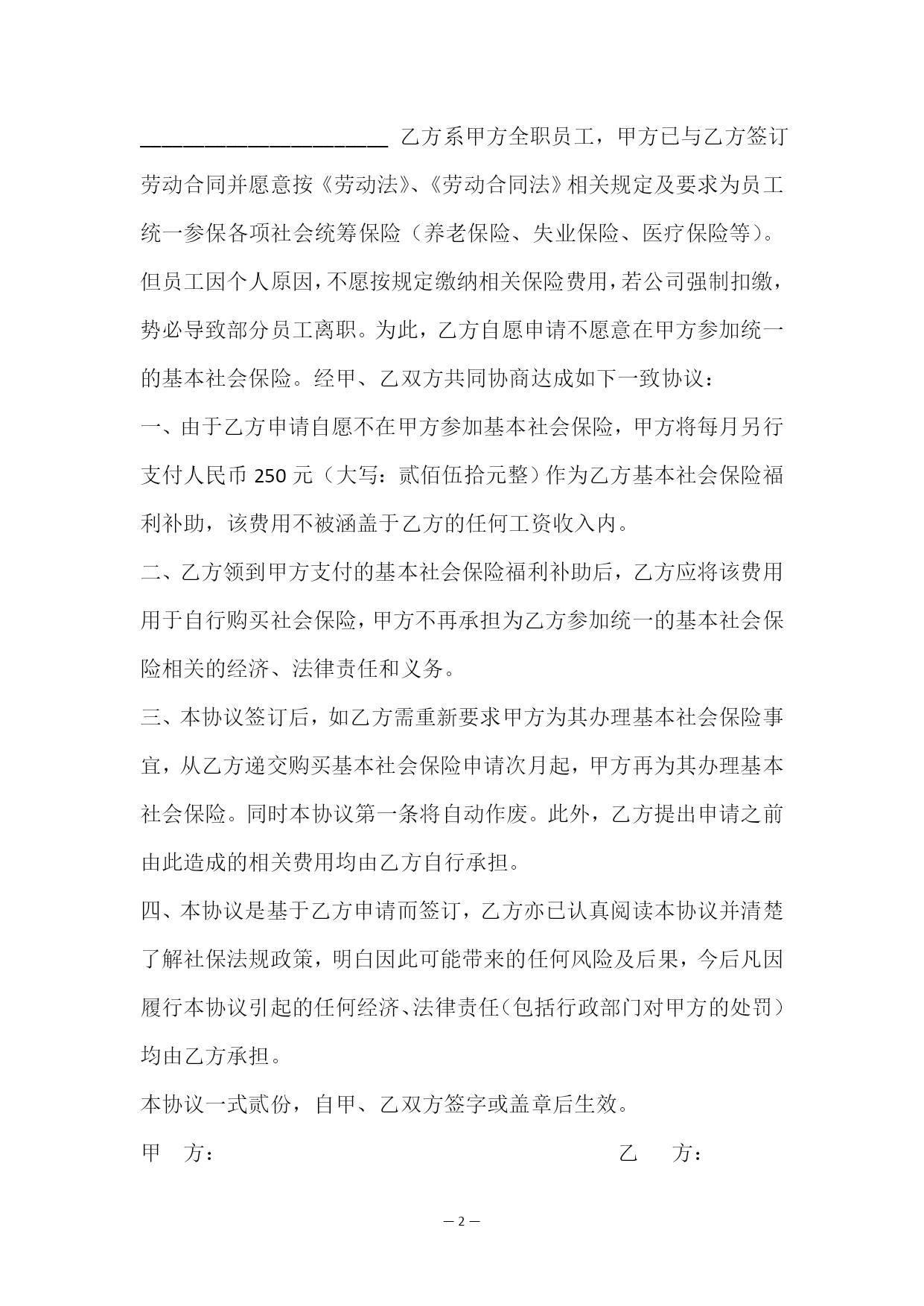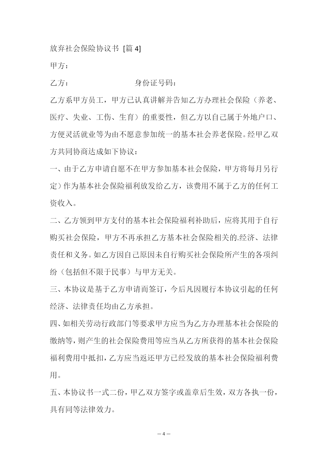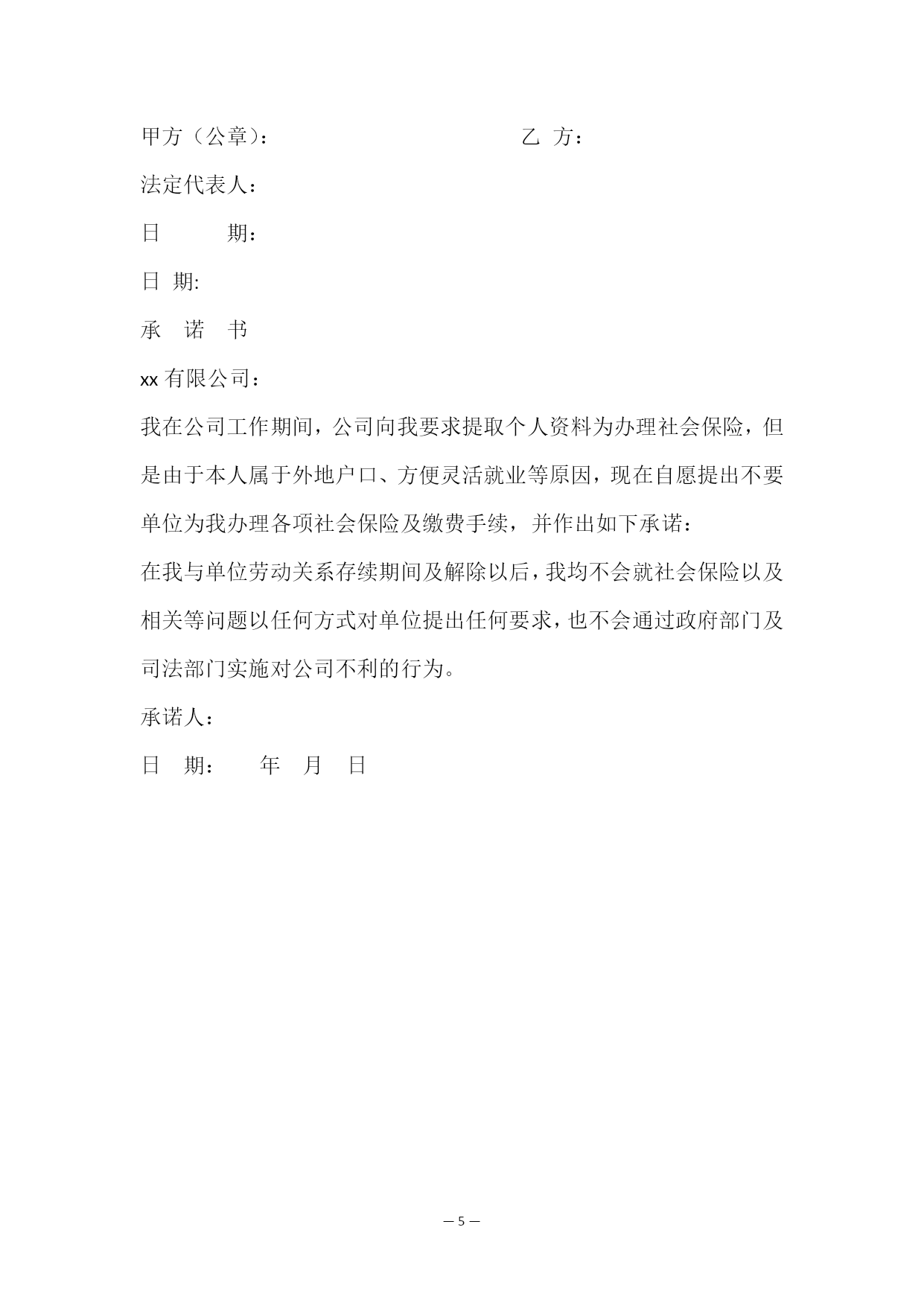 —PAGE\*MERGEFORMAT5—放弃社会保险协议书乙方:(员工姓名)身份证号:甲方同意乙方缴纳养老保险、失业保险、工伤及医疗等社会保险,因乙方考虑从工资中扣除个人承担的缴交部分会影响工资收入,经双方协商,乙方自愿放弃甲方为乙方办理社保,甲方按济南市社保缴费标准给予乙方一定的社保补贴,社保补贴每月随本人工资一同发放,如日后员工反悔要求单位补交社保的,单位有权不予办理,如员工已领取社保补贴而未参加其他形式的社保或商业保险,造成社保无法享受的后果由员工自行承担。员工已仔细阅读并充分理解说明内容的,请签字确认。特立此协议,协议书一式两份,甲乙双方各执一份。本协议未尽事宜由双方协商解决。甲方签字:乙方签字:放弃社会保险协议书[篇2]甲方:乙方:___________________________办公地址:_身份证号码:_____________________法定代表人:_________联系电话:_______________________委托代理人:_____________________家庭住址:_______________________乙方系甲方全职员工,甲方已与乙方签订劳动合同并愿意按《劳动法》、《劳动合同法》相关规定及要求为员工统一参保各项社会统筹保险(养老保险、失业保险、医疗保险等)。但员工因个人原因,不愿按规定缴纳相关保险费用,若公司强制扣缴,势必导致部分员工离职。为此,乙方自愿申请不愿意在甲方参加统一的基本社会保险。经甲、乙双方共同协商达成如下一致协议:一、由于乙方申请自愿不在甲方参加基本社会保险,甲方将每月另行支付人民币250元(大写:贰佰伍拾元整)作为乙方基本社会保险福利补助,该费用不被涵盖于乙方的任何工资收入内。二、乙方领到甲方支付的基本社会保险福利补助后,乙方应将该费用用于自行购买社会保险,甲方不再承担为乙方参加统一的基本社会保险相关的经济、法律责任和义务。三、本协议签订后,如乙方需重新要求甲方为其办理基本社会保险事宜,从乙方递交购买基本社会保险申请次月起,甲方再为其办理基本社会保险。同时本协议第一条将自动作废。此外,乙方提出申请之前由此造成的相关费用均由乙方自行承担。四、本协议是基于乙方申请而签订,乙方亦已认真阅读本协议并清楚了解社保法规政策,明白因此可能带来的任何风险及后果,今后凡因履行本协议引起的任何经济、法律责任(包括行政部门对甲方的处罚)均由乙方承担。本协议一式贰份,自甲、乙双方签字或盖章后生效。甲方:乙方:盖章:签名:日期:日期:放弃社会保险协议书[篇3]本人,性别,年龄,于年__月入职贵公司,本人进入公司后,贵公司已向我告知并已经按照法律规定为我缴纳各项社会保险费用。但经本人慎重考虑,本人不再愿意购买社会保险,故请贵公司不要继续为我办理社会保险(含养老、医疗、失业、工伤、生育保险等),即日起本人自愿放弃贵公司为本人缴纳社会保险的权利,并要求贵公司另行支付人民币500元(大写:伍佰元)作为我的基本社会保险福利补助,该补助不属于任何工资收入。本人在此承诺:一:放弃参加社会保险而引起的一切法律责任由本人承担;二、在我与公司劳动关系存续期间及解除以后,我均不会就社会保险问题以任何方式对公司提出任何要求,也不会通过政府部门及司法机关实施对公司不利的行为;三、如有违背以上承诺的行为,将一次性全额退回贵公司发放的基本社会保险福利补助。四、本人承诺以上内容是本人真实意愿,本人有能力承担相应法律后果。承诺人:日期:年月日放弃社会保险协议书[篇4]甲方:乙方:身份证号码:乙方系甲方员工,甲方已认真讲解并告知乙方办理社会保险(养老、医疗、失业、工伤、生育)的重要性,但乙方以自己属于外地户口、方便灵活就业等为由不愿意参加统一的基本社会养老保险。经甲乙双方共同协商达成如下协议:一、由于乙方申请自愿不在甲方参加基本社会保险,甲方将每月另行定)作为基本社会保险福利放发给乙方,该费用不属于乙方的任何工资收入。二、乙方领到甲方支付的基本社会保险福利补助后,应将其用于自行购买社会保险,甲方不再承担乙方基本社会保险相关的.经济、法律责任和义务。如乙方因自己原因未自行购买社会保险所产生的各项纠纷(包括但不限于民事)与甲方无关。三、本协议是基于乙方申请而签订,今后凡因履行本协议引起的任何经济、法律责任均由乙方承担。四、如相关劳动行政部门等要求甲方应当为乙方办理基本社会保险的缴纳等,则产生的社会保险费用等应当从乙方所获得的基本社会保险福利费用中抵扣,乙方应当返还甲方已经发放的基本社会保险福利费用。五、本协议书一式二份,甲乙双方签字或盖章后生效,双方各执一份,具有同等法律效力。甲方(公章):乙方:法定代表人:日期:日期:承诺书