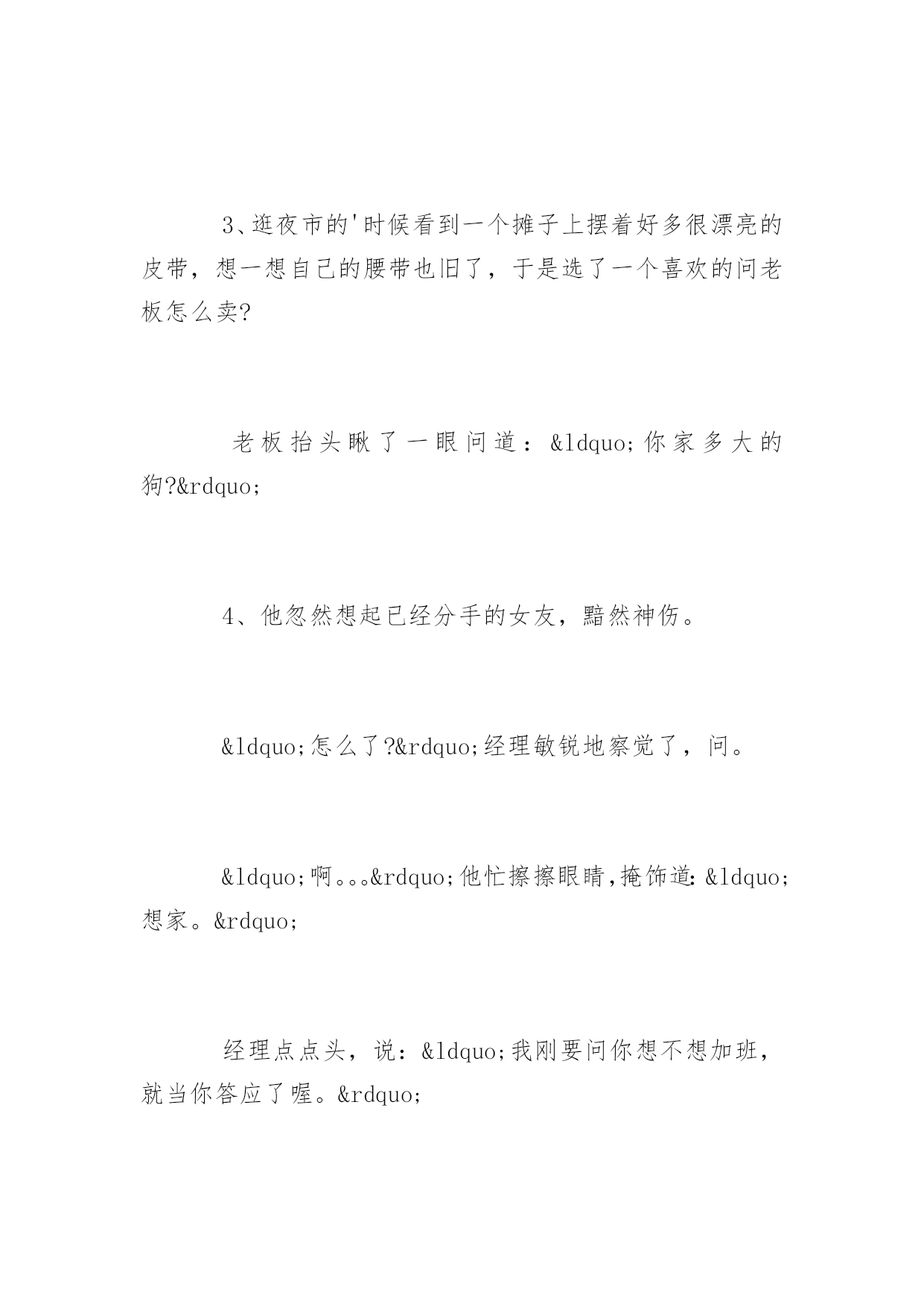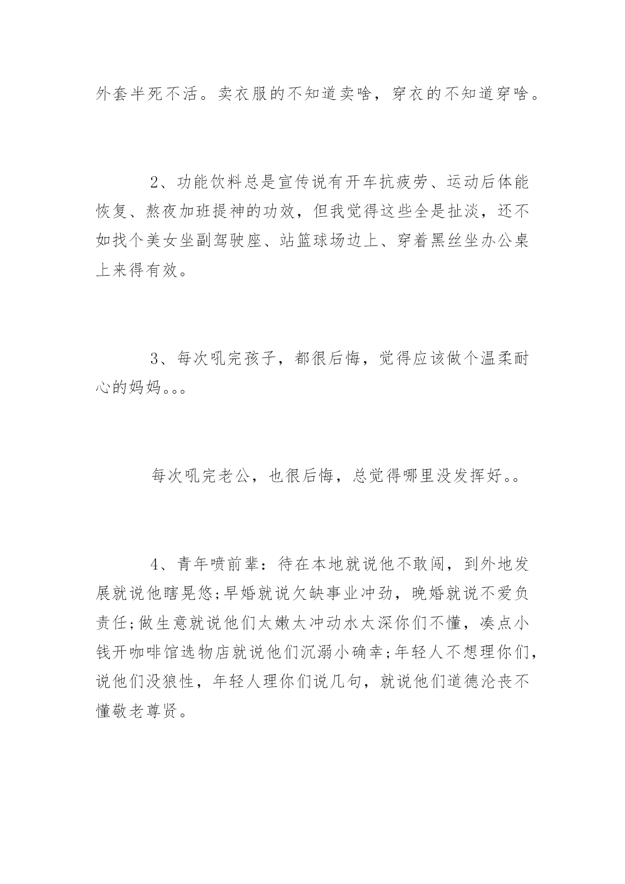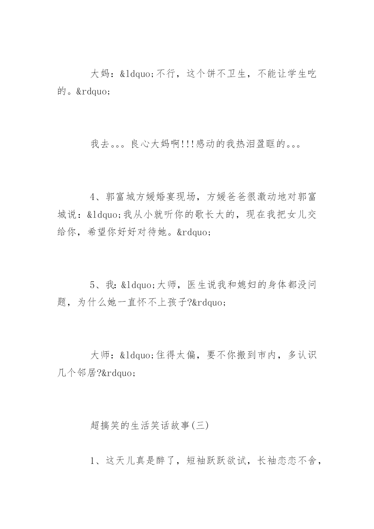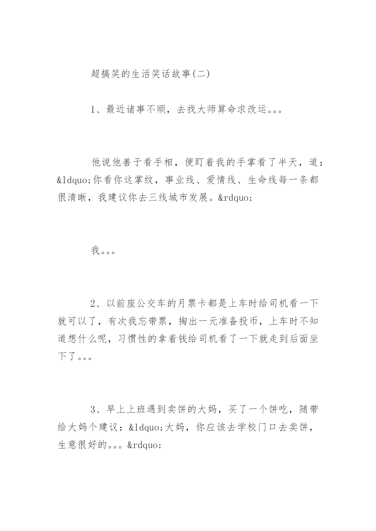 超搞笑的生活笑话故事超搞笑的生活笑话故事现在活佛太多了,我也打算认证个,然后弄一批陶瓷杯子,号称开过光的,挂网上出售,名字就叫“我佛瓷杯”。以下是yjbys笑话栏目准备的超搞笑的生活笑话故事,一起来爆笑吧!超搞笑的生活笑话故事(一)1、今天给好友发了一张我抱着狗的照片,这二货回了句:哪个是你啊。尼妹,绝交!2、运动会跑1000米。士力架吃了,脉动喝了,红牛喝了,加得乐喝了,耐克穿了。。。结果热身的时侯把脚崴了。。。3、逛夜市的'时候看到一个摊子上摆着好多很漂亮的皮带,想一想自己的腰带也旧了,于是选了一个喜欢的问老板怎么卖?老板抬头瞅了一眼问道:“你家多大的狗?”4、他忽然想起已经分手的女友,黯然神伤。“怎么了?”经理敏锐地察觉了,问。“啊。。。”他忙擦擦眼睛,掩饰道:“想家。”经理点点头,说:“我刚要问你想不想加班,就当你答应了喔。”超搞笑的生活笑话故事(二)1、最近诸事不顺,去找大师算命求改运。。。他说他善于看手相,便盯着我的手掌看了半天,道:“你看你这掌纹,事业线、爱情线、生命线每一条都很清晰,我建议你去三线城市发展。”我。。。2、以前座公交车的月票卡都是上车时给司机看一下就可以了,有次我忘带票,掏出一元准备投币,上车时不知道想什么呢,习惯性的拿着钱给司机看了一下就走到后面坐下了。。。3、早上上班遇到卖饼的大妈,买了一个饼吃,随带给大妈个建议:“大妈,你应该去学校门口去卖饼,生意很好的。。。”大妈:“不行,这个饼不卫生,不能让学生吃的。”我去。。。良心大妈啊!!!感动的我热泪盈眶的。。。4、郭富城方媛婚宴现场,方媛爸爸很激动地对郭富城说:“我从小就听你的歌长大的,现在我把女儿交给你,希望你好好对待她。”5、我:“大师,医生说我和媳妇的身体都没问题,为什么她一直怀不上孩子?”大师:“住得太偏,要不你搬到市内,多认识几个邻居?”超搞笑的生活笑话故事(三)1、这天儿真是醉了,短袖跃跃欲试,长袖恋恋不舍,外套半死不活。卖衣服的不知道卖啥,穿衣的不知道穿啥。2、功能饮料总是宣传说有开车抗疲劳、运动后体能恢复、熬夜加班提神的功效,但我觉得这些全是扯淡,还不如找个美女坐副驾驶座、站篮球场边上、穿着黑丝坐办公桌上来得有效。3、每次吼完孩子,都很后悔,觉得应该做个温柔耐心的妈妈。。。每次吼完老公,也很后悔,总觉得哪里没发挥好。。4、青年喷前辈:待在本地就说他不敢闯,到外地发展就说他瞎晃悠;早婚就说欠缺事业冲劲,晚婚就说不爱负责任;做生意就说他们太嫩太冲动水太深你们不懂,凑点小钱开咖啡馆选物店就说他们沉溺小确幸;年轻人不想理你们,说他们没狼性,年轻人理你们说几句,就说他们道德沦丧不懂敬老尊贤。5、演技精湛吴亦凡,一米八零黄晓明,从未整容是杨颖,冰清玉洁钟欣桐,男儿本色是鹿晗,摇滚教父是汪峰,用情专一章子怡,不近女色曾志伟,从一而终郭富城,不靠老子王思聪,爱国艺人杜海涛,清纯美女白百合,阖家欢乐王宝强,不用替身是杨洋,坚持原创郭小四,从不吸毒柯震东,百花影帝李易峰,铁血硬汉黄子韬,贤妻良母是马蓉。6、朋友圈,国内最大的商品展销中心和拍照P图技术交流平台。