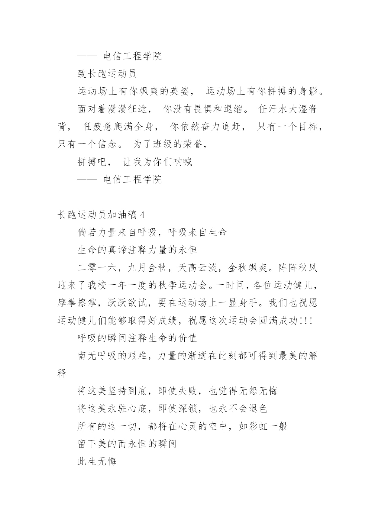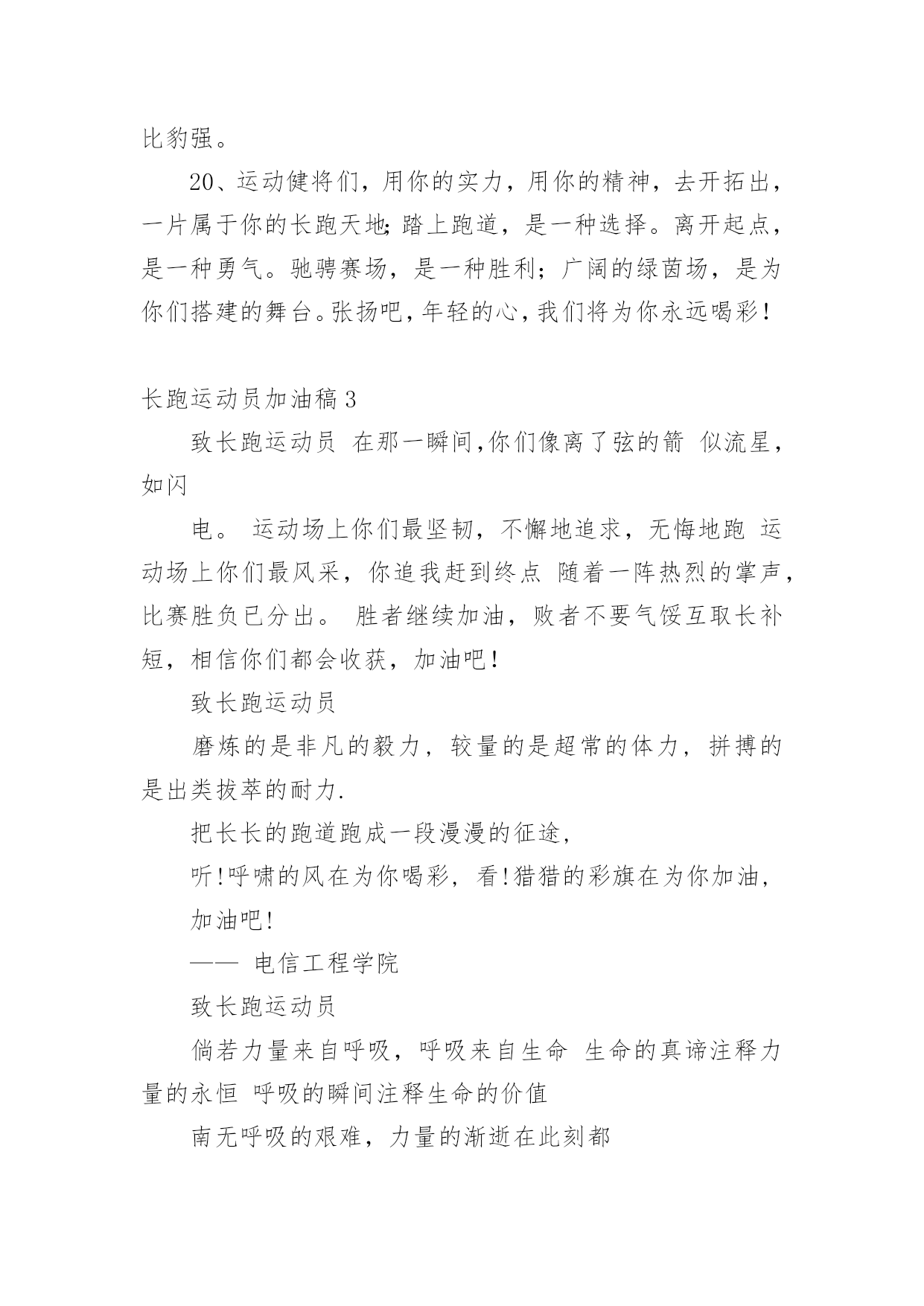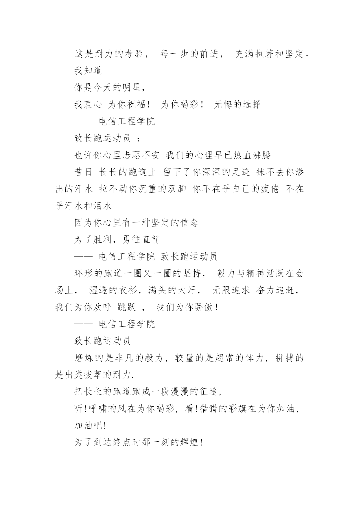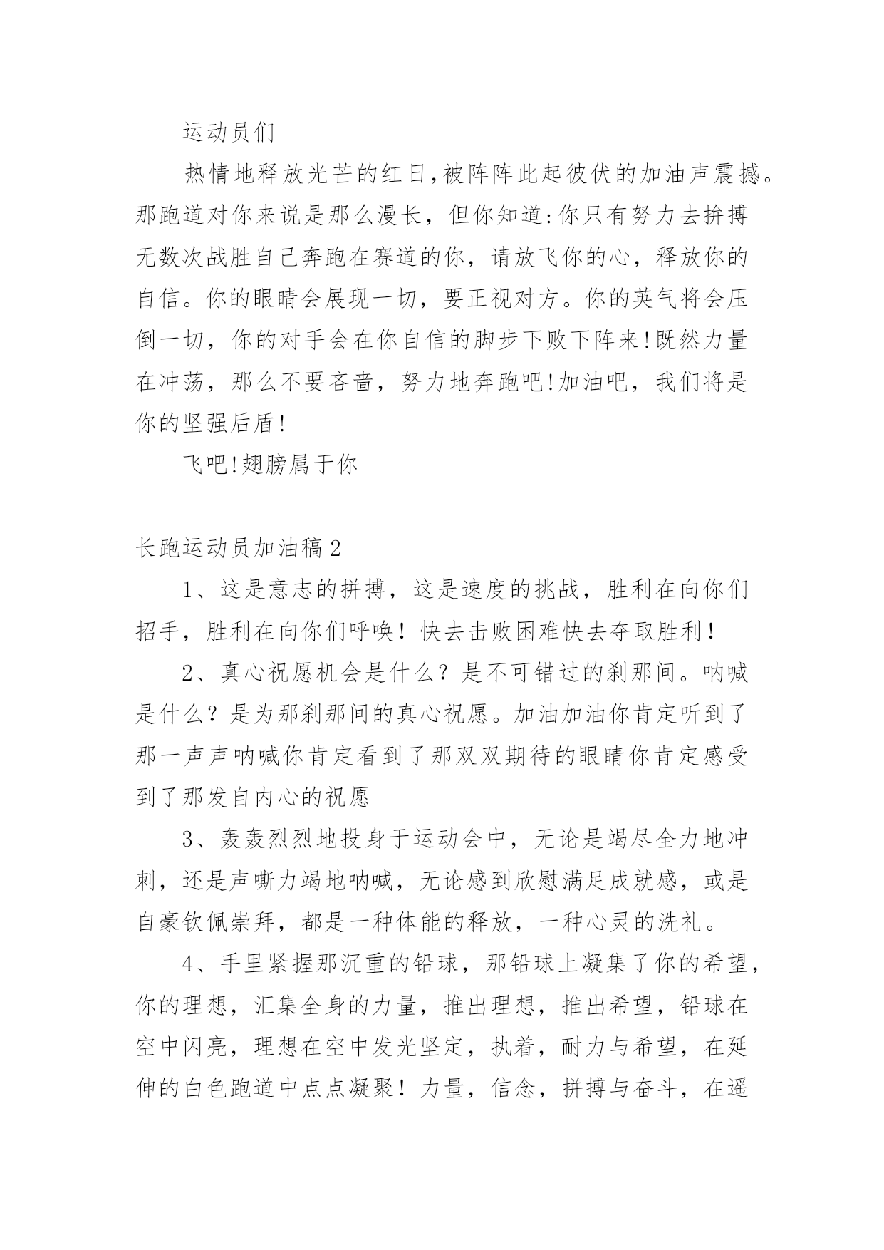 长跑运动员加油稿在社会发展不断提速的今天,很多情况下我们需要用到加油稿,借助加油稿可以更好地为他人加油打气。你写加油稿时总是无从下笔?下面是小编精心整理的长跑运动员加油稿,仅供参考,大家一起来看看吧。长跑运动员加油稿1人类的力量在那一刹那展现,拚搏在那一瞬间化为生命的起点,在那一须臾万物化为虚有,只知道,胜利并不遥远,抬起头望望前面,终点线已依稀可见,无数个日日夜夜的辛劳,将在今日兑现。深深的呼吸,等待你的是艰难的800米。相信胜利会属于你们。但在这征途上,需要你用勇敢的心去面对。我们在为你加油,你是否听到了我们发自心中的呐喊?困难和胜利都在向你招手,去呀,快去呀,不要犹豫。快去击败困难、快去夺取胜利!相信你会送给我们一个汗水浸湿的微笑!洒一把艰辛的汗水,继续抬起疲倦的脚步,爆发的一吼气贯长虹,继续向前,不论成功与否,你已曾经拥有,曾记否,然你们在场上的时间很短暂,但你们的身影依然停留在人们的脑海里,因为你们是赛场上最可爱的人,不为掌声的注释,不为刻意的征服,不为失败的痛苦,只有辛勤的汗水化作成功的脚步。在终点欢呼,震惊四周。三十人生的路,有坦途,也有坎坷,做过的岁月,有欢笑,也有苦涩,泪水告诉我一个跌倒的故事,汗水使我多了一份沉重,几多成熟。理想毕竟不同于现实,失败是生活的一部分,谁也无法选择,无法抗拒,人生要自己去拼搏,去奋斗,在风雨中百折不饶勇往直前。流泪不是失落,徘徊不是迷惑,成功属于那些战胜失败,坚持不懈,勇于追求梦想的人。无悔的选择无论结局是好是坏无怨无悔是我们的选择每当运动员奔驰在400米跑道上时我们为你祝福为你喝彩不到最后一刻绝不轻言放弃责成了你们的信仰也成了我们的信仰运动员们热情地释放光芒的红日,被阵阵此起彼伏的加油声震撼。那跑道对你来说是那么漫长,但你知道:你只有努力去拚搏无数次战胜自己奔跑在赛道的你,请放飞你的心,释放你的自信。你的眼睛会展现一切,要正视对方。你的英气将会压倒一切,你的对手会在你自信的脚步下败下阵来!既然力量在冲荡,那么不要吝啬,努力地奔跑吧!加油吧,我们将是你的坚强后盾!飞吧!翅膀属于你长跑运动员加油稿21、这是意志的拼搏,这是速度的挑战,胜利在向你们招手,胜利在向你们呼唤!快去击败困难快去夺取胜利!2、真心祝愿机会是什么?是不可错过的刹那间。呐喊是什么?是为那刹那间的真心祝愿。加油加油你肯定听到了那一声声呐喊你肯定看到了那双双期待的眼睛你肯定感受到了那发自内心的祝愿3、轰轰烈烈地投身于运动会中,无论是竭尽全力地冲刺,还是声嘶力竭地呐喊,无论感到欣慰满足成就感,或是自豪钦佩崇拜,都是一种体能的释放,一种心灵的洗礼。4、手里紧握那沉重的铅球,那铅球上凝集了你的希望,你的理想,汇集全身的力量,推出理想,推出希望,铅球在空中闪亮,理想在空中发光坚定,执着,耐力与希望,在延伸的白色跑道中点点凝聚!力量,信念,拼搏与奋斗,在遥远的终点线上渐渐明亮!时代的强音正在你的脚下踏响。步子迈开,让我们飞驰在红色跑道上,用我们的泪水和热血,更改历史的记录,起立吧,歌唱吧!为我们的勇士加油!5、运动场上有你们的飒爽英姿,运动场上有你们拼搏的身影,面对漫漫的征程,你没有畏惧和退缩,任汗水打湿脊背,任疲惫爬满全身,依然分离追赶,只有一个目标,只有一个信念,为班级赢得荣誉,拼搏吧,我为你们呐喊,加油。6、等待你的,是慢慢征途,勇敢冲吧!勇士们!付出的汗水就要得到回报!胜利的泪水就要顺颊而下,春风会为你喝彩,阳光会为你庆功,掌声已为你响起!7、你是运动场的心脏,跳动梦想;你是漫长路的精神,激励辉煌;你们是将上下求索的人!风为你加油,云为你助兴,坚定,执着,耐力与希望,在延伸的白色跑道中点点凝聚!力量,信念,拼搏与奋斗,在遥远的终点线上渐渐明亮!时代的强音正在你的脚下踏响。8、每一份辛劳都有一份收获,每一次的痛苦都是快乐的开始,没一声呐喊都是力量的呼唤。我们有着大浪拍岸的豪迈,所以你不必在乎小荷初露的恬静,我们有着春日的阳光明媚,所以不用去羡慕冬日乱玉碎琼,我们是雨天的一把伞,是寒冷冬日里的一盆碳火,温暖的不只是你我,而是大家的心。运动场上的健儿,掌声属于你们,鲜花属于你们,成功也是属于你们!9、象一出舞台剧,有主角,配角,也有无名的幕后工作者,我们的运动会也在这样的配合中进行着,在赛场上展现英姿的是那些运动员,还有那些为比赛筹措,进行贡献的工作人员们。还有那些拉拉队员们。10、秋风羽,天气淡淡的转凉。然而这人的秋在今天更加迷人,不是因为它的秋高气爽,也不是因为它的明媚阳光,是因为今天的人儿倍加精神气爽。看!运动场上那一幕幕,一股股,无论是哭是笑,市喜是悲,其中都融入了他们的汗水、辛劳。他们是真正的矫健者,是运动场上的骄儿,更是我们心中的英雄。加油吧!英雄们!11、时间在流逝,赛道在延伸,成功在你面前展现心脏的跳动,