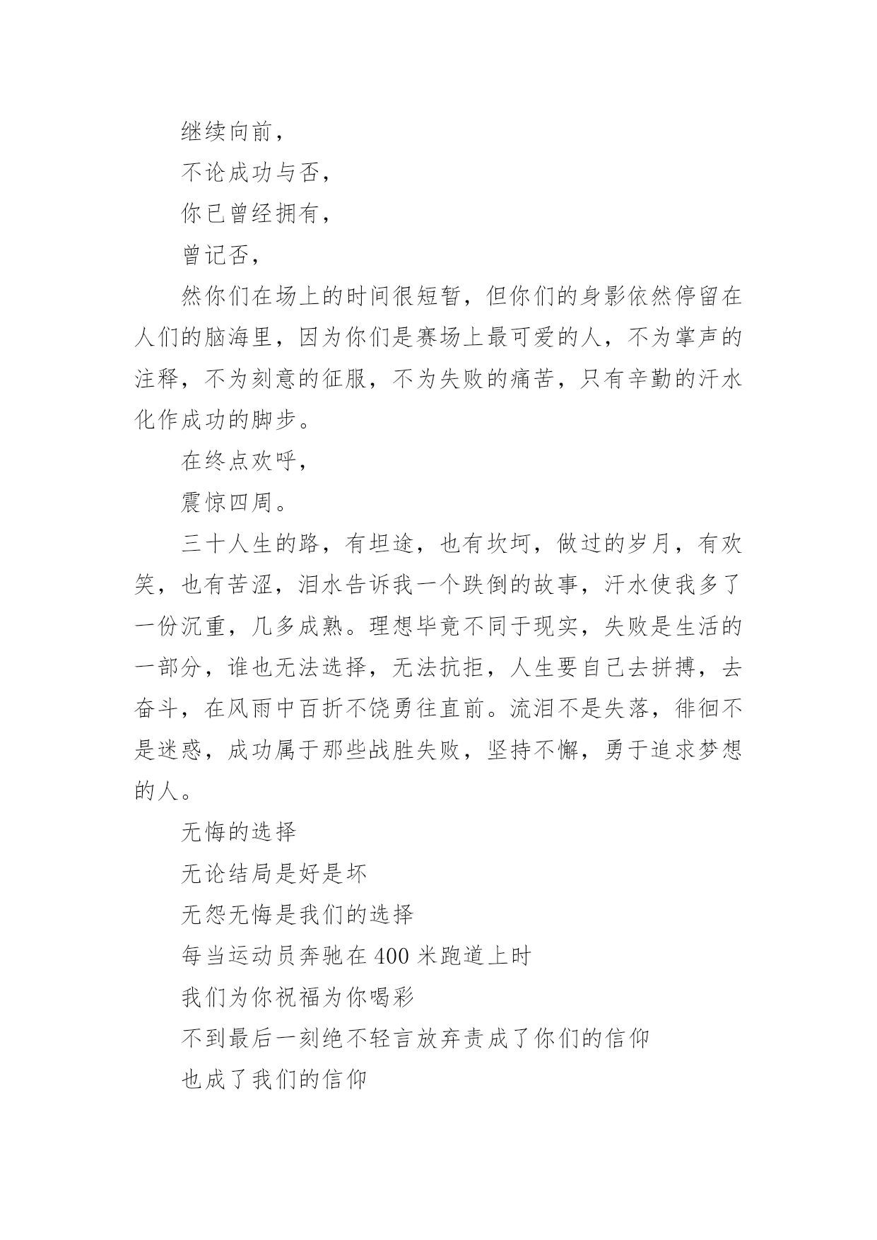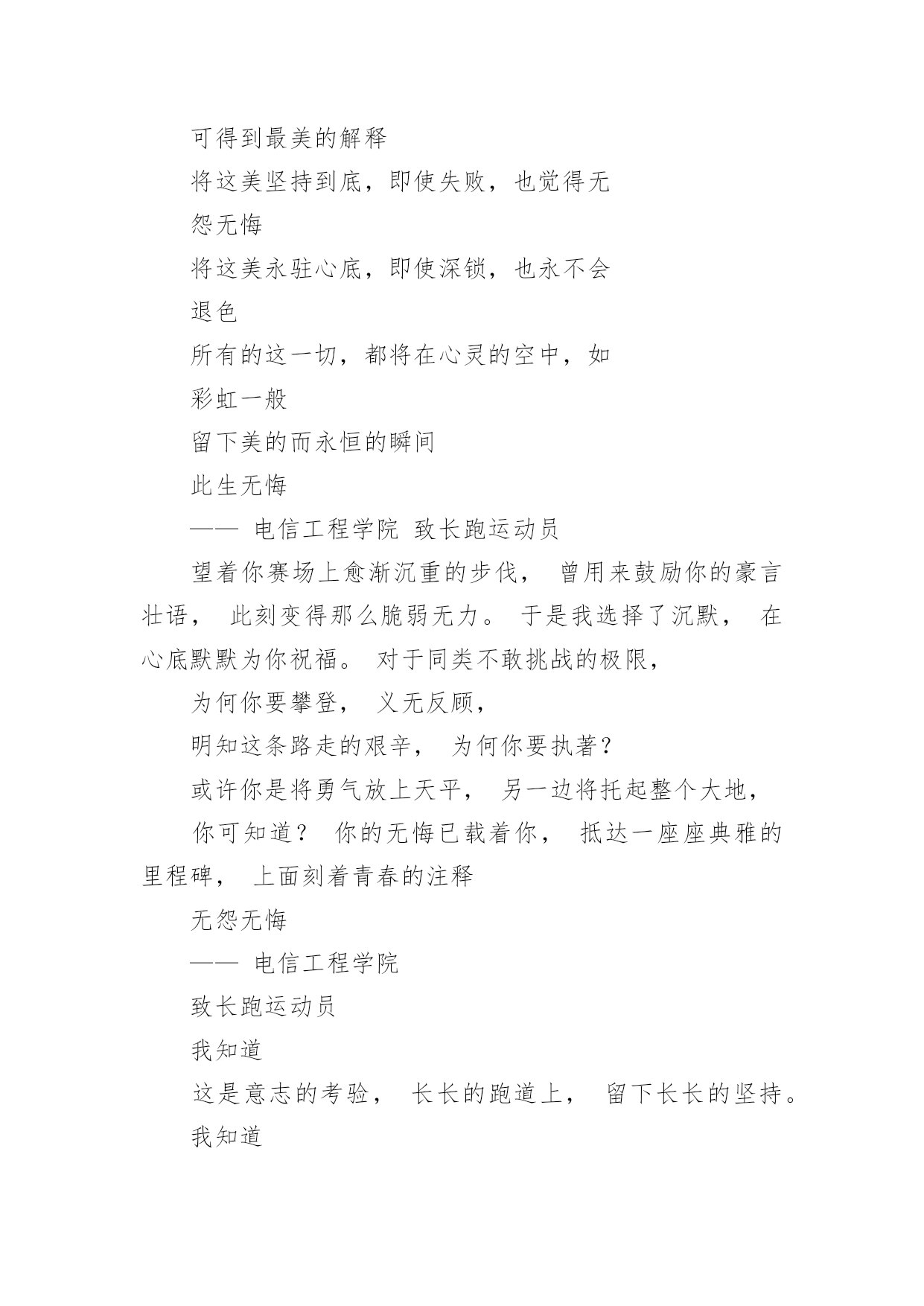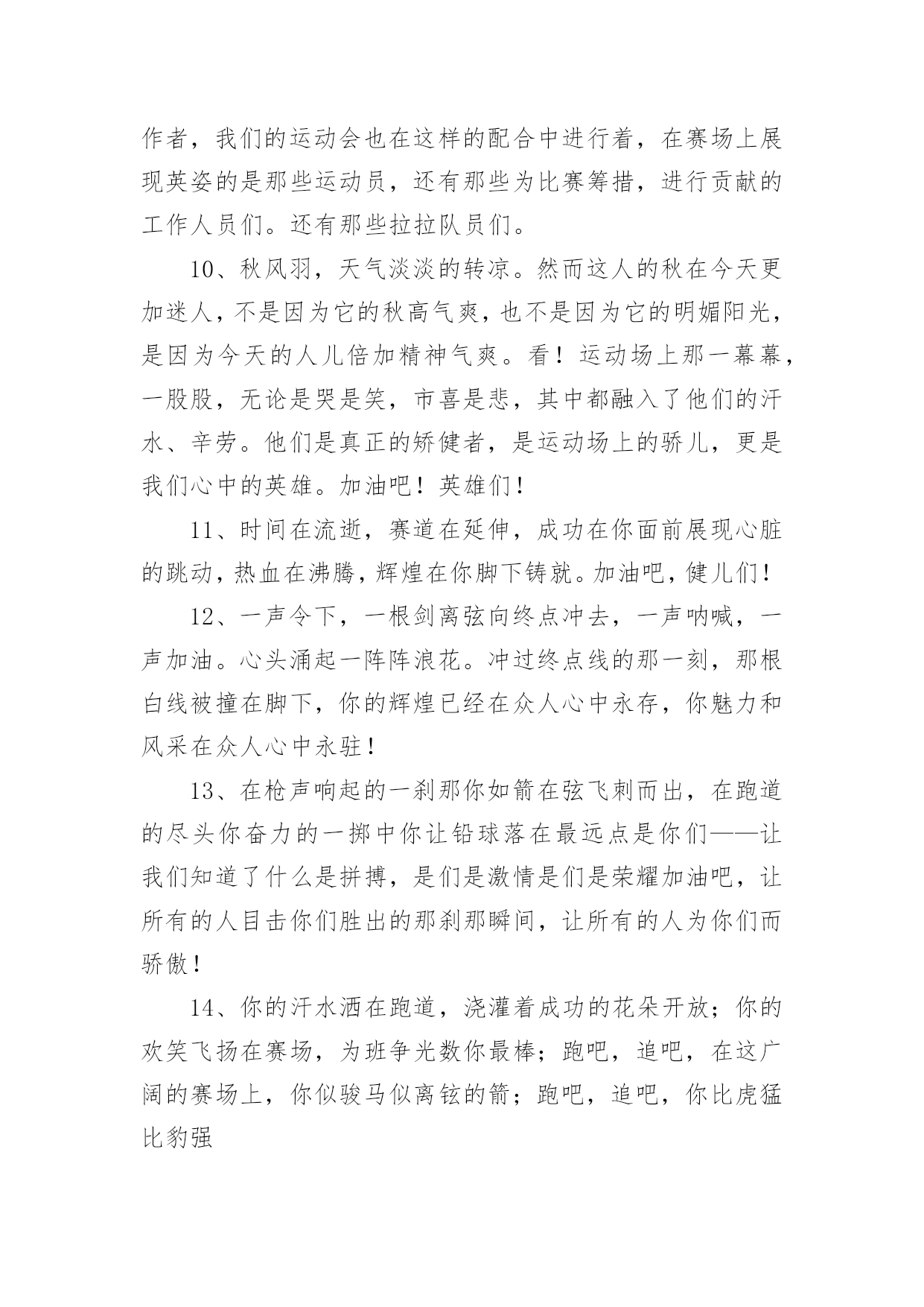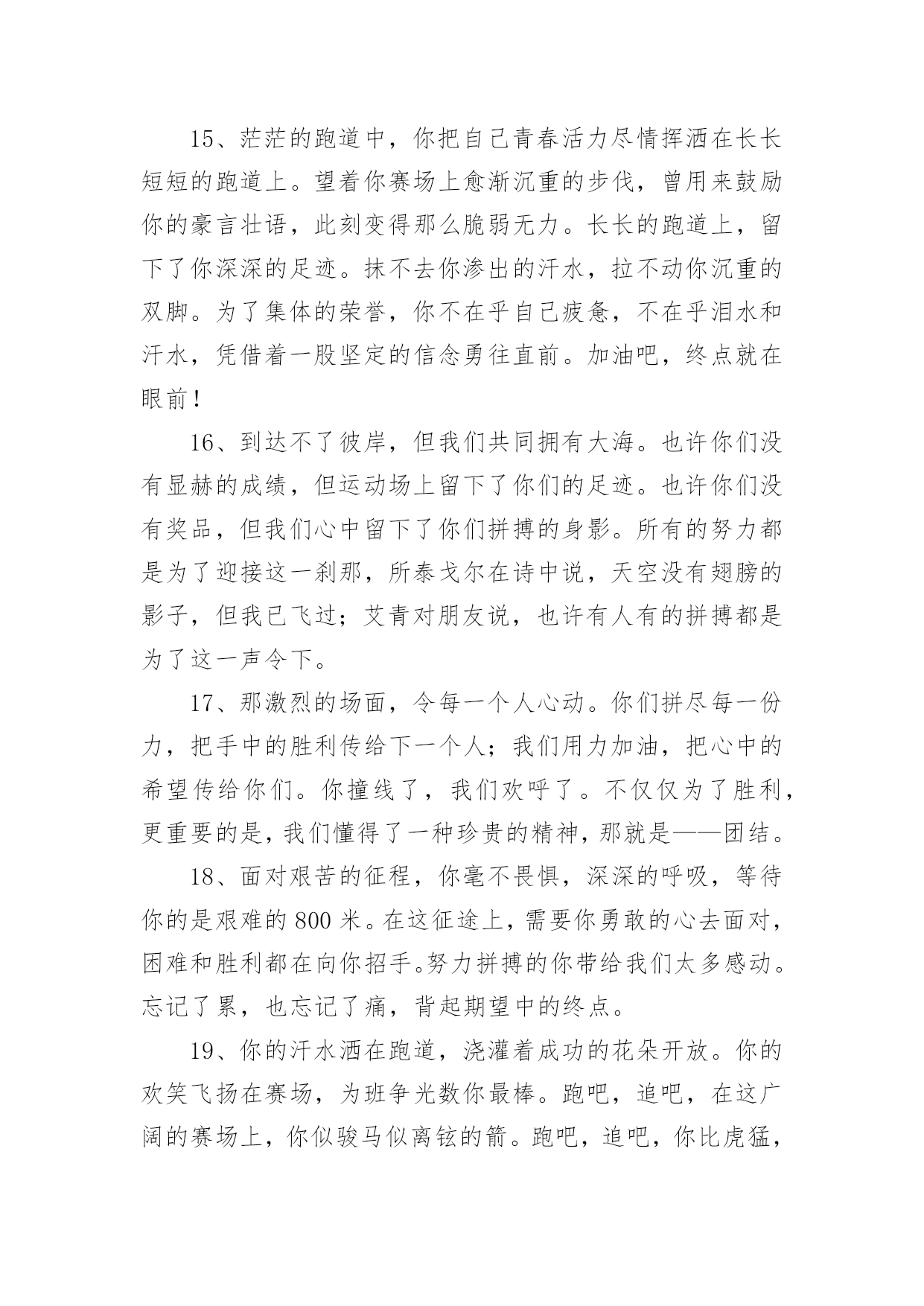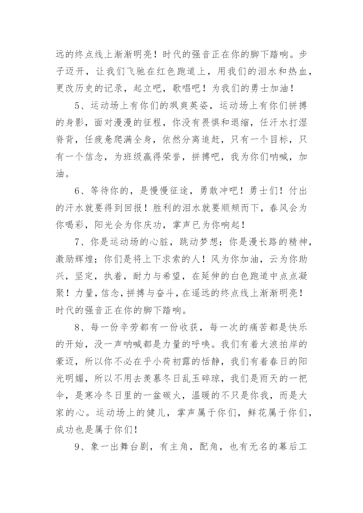 长跑运动员加油稿在社会发展不断提速的今天,很多情况下我们需要用到加油稿,借助加油稿可以更好地为他人加油打气。你写加油稿时总是无从下笔?下面是小编精心整理的长跑运动员加油稿,仅供参考,大家一起来看看吧。长跑运动员加油稿1人类的力量在那一刹那展现,拚搏在那一瞬间化为生命的起点,在那一须臾万物化为虚有,只知道,胜利并不遥远,抬起头望望前面,终点线已依稀可见,无数个日日夜夜的辛劳,将在今日兑现。深深的呼吸,等待你的是艰难的800米。相信胜利会属于你们。但在这征途上,需要你用勇敢的心去面对。我们在为你加油,你是否听到了我们发自心中的呐喊?困难和胜利都在向你招手,去呀,快去呀,不要犹豫。快去击败困难、快去夺取胜利!相信你会送给我们一个汗水浸湿的微笑!洒一把艰辛的汗水,继续抬起疲倦的脚步,爆发的一吼气贯长虹,继续向前,不论成功与否,你已曾经拥有,曾记否,然你们在场上的时间很短暂,但你们的身影依然停留在人们的脑海里,因为你们是赛场上最可爱的人,不为掌声的注释,不为刻意的征服,不为失败的痛苦,只有辛勤的汗水化作成功的脚步。在终点欢呼,震惊四周。三十人生的路,有坦途,也有坎坷,做过的岁月,有欢笑,也有苦涩,泪水告诉我一个跌倒的故事,汗水使我多了一份沉重,几多成熟。理想毕竟不同于现实,失败是生活的一部分,谁也无法选择,无法抗拒,人生要自己去拼搏,去奋斗,在风雨中百折不饶勇往直前。流泪不是失落,徘徊不是迷惑,成功属于那些战胜失败,坚持不懈,勇于追求梦想的人。无悔的选择无论结局是好是坏无怨无悔是我们的选择每当运动员奔驰在400米跑道上时我们为你祝福为你喝彩不到最后一刻绝不轻言放弃责成了你们的信仰也成了我们的信仰运动员们热情地释放光芒的红日,被阵阵此起彼伏的加油声震撼。那跑道对你来说是那么漫长,但你知道:你只有努力去拚搏无数次战胜自己奔跑在赛道的你,请放飞你的心,释放你的自信。你的眼睛会展现一切,要正视对方。你的英气将会压倒一切,你的对手会在你自信的脚步下败下阵来!既然力量在冲荡,那么不要吝啬,努力地奔跑吧!加油吧,我们将是你的坚强后盾!飞吧!翅膀属于你长跑运动员加油稿21、这是意志的拼搏,这是速度的挑战,胜利在向你们招手,胜利在向你们呼唤!快去击败困难快去夺取胜利!2、真心祝愿机会是什么?是不可错过的刹那间。呐喊是什么?是为那刹那间的真心祝愿。加油加油你肯定听到了那一声声呐喊你肯定看到了那双双期待的眼睛你肯定感受到了那发自内心的祝愿3、轰轰烈烈地投身于运动会中,无论是竭尽全力地冲刺,还是声嘶力竭地呐喊,无论感到欣慰满足成就感,或是自豪钦佩崇拜,都是一种体能的释放,一种心灵的洗礼。4、手里紧握那沉重的铅球,那铅球上凝集了你的希望,你的理想,汇集全身的力量,推出理想,推出希望,铅球在空中闪亮,理想在空中发光坚定,执着,耐力与希望,在延伸的白色跑道中点点凝聚!力量,信念,拼搏与奋斗,在遥远的终点线上渐渐明亮!时代的强音正在你的脚下踏响。步子迈开,让我们飞驰在红色跑道上,用我们的泪水和热血,更改历史的记录,起立吧,歌唱吧!为我们的勇士加油!5、运动场上有你们的飒爽英姿,运动场上有你们拼搏的身影,面对漫漫的征程,你没有畏惧和退缩,任汗水打湿脊背,任疲惫爬满全身,依然分离追赶,只有一个目标,只有一个信念,为班级赢得荣誉,拼搏吧,我为你们呐喊,加油。6、等待你的,是慢慢征途,勇敢冲吧!勇士们!付出的汗水就要得到回报!胜利的泪水就要顺颊而下,春风会为你喝彩,阳光会为你庆功,掌声已为你响起!7、你是运动场的心脏,跳动梦想;你是漫长路的精神,激励辉煌;你们是将上下求索的人!风为你加油,云为你助兴,坚定,执着,耐力与希望,在延伸的白色跑道中点点凝聚!力量,信念,拼搏与奋斗,在遥远的终点线上渐渐明亮!时代的强音正在你的脚下踏响。8、每一份辛劳都有一份收获,每一次的痛苦都是快乐的开始,没一声呐喊都是力量的呼唤。我们有着大浪拍岸的豪迈,所以你不必在乎小荷初露的恬静,我们有着春日的阳光明媚,所以不用去羡慕冬日乱玉碎琼,我们是雨天的一把伞,是寒冷冬日里的一盆碳火,温暖的不只是你我,而是大家的心。运动场上的健儿,掌声属于你们,鲜花属于你们,成功也是属于你们!9、象一出舞台剧,有主角,配角,也有无名的幕后工作者,我们的运动会也在这样的配合中进行着,在赛场上展现英姿的是那些运动员,还有那些为比赛筹措,进行贡献的工作人员们。还有那些拉拉队员们。10、秋风羽,天气淡淡的转凉。然而这人的秋在今天更加迷人,不是因为它的秋高气爽,也不是因为它的明媚阳光,是因为今天的人儿倍加精神气爽。看!运动场上那一幕幕,一股股,无论是哭是笑,市喜是悲,其中都融入了他们的汗水、辛劳。他们是真正的矫健者,是运动场上的骄儿,更是我们心中的英雄。加油吧!英雄们!11、时间在流逝,赛道在延伸,成功在你面前展现心脏的跳动,