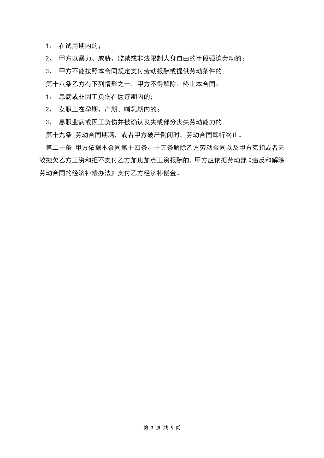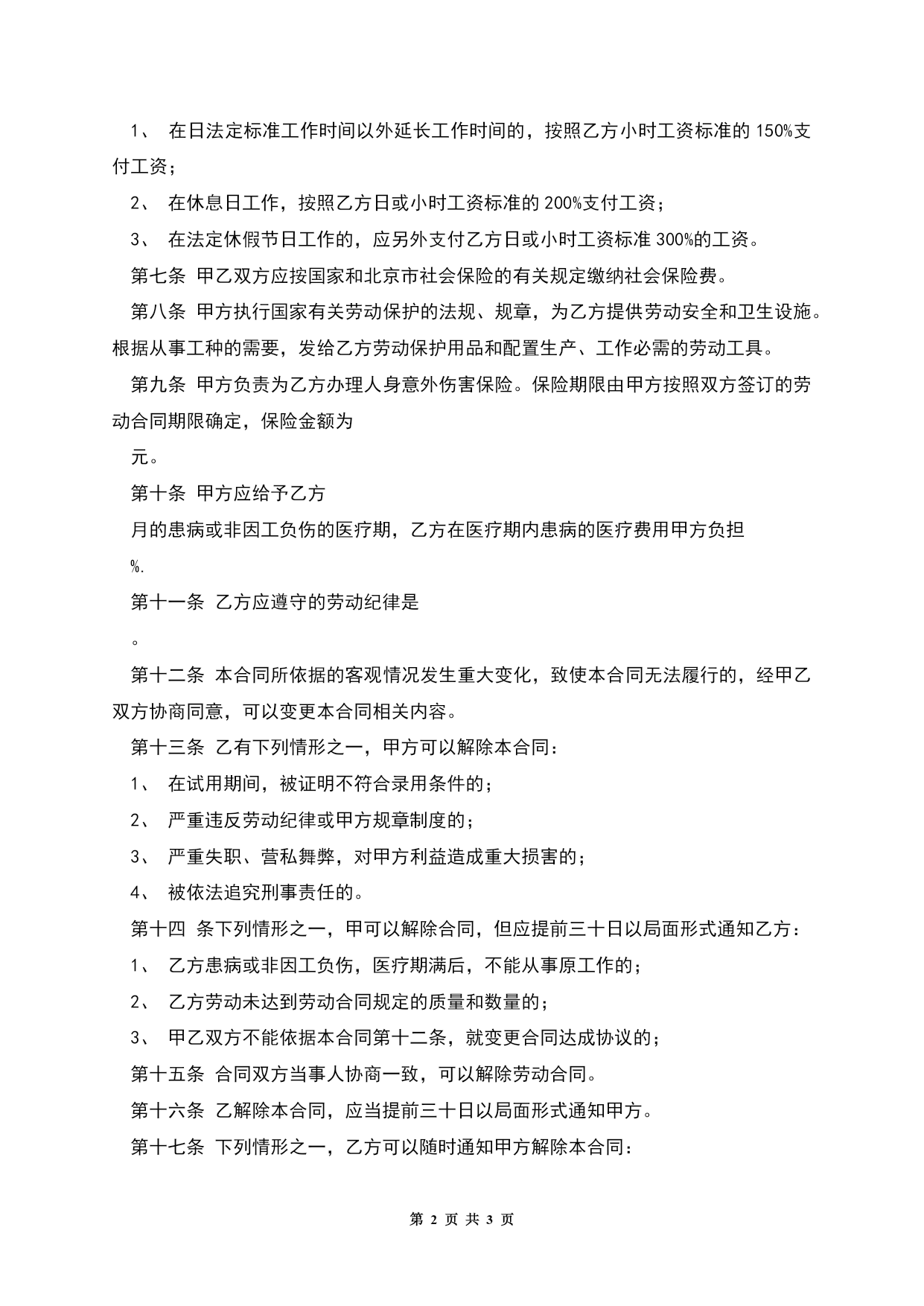 第PAGE\*MERGEFORMAT3页共NUMPAGES\*MERGEFORMAT3页个体工商户雇工劳动合同甲方:乙方:雇主(以下简称甲方)与受雇职工(以下简称乙方)根据《中华人民共和国劳动法》和《北京市个体工商户、私营企业雇工劳动管理暂行办法》,甲乙双方以平等协商同意,自愿签订本合同,共同遵守本合同所列条款。第一条本合同期限自年月日开始,至年月日终止,其中试用期天。第二条乙方同意在甲方从事工作。第三条甲方对乙方的劳动质量和数量要求是第四条甲方每月日以货币形式支付乙方工资,工资不低不元,其中试用期间工资为元。第五条甲方安排乙方每日工作时间不超过8小时,每周不超过40小时,甲方保证乙方至少休息一日,因工作需要延长工作时间的,经乙方同意延长工作时间每日不得超过3小时,每月不得超过36小时。第六条甲方安排乙方加班加点的,甲应依法支付加玫加点工资,按以下标准支付工资;1、在日法定标准工作时间以外延长工作时间的,按照乙方小时工资标准的150%支付工资;2、在休息日工作,按照乙方日或小时工资标准的200%支付工资;3、在法定休假节日工作的,应另外支付乙方日或小时工资标准300%的工资。第七条甲乙双方应按国家和北京市社会保险的有关规定缴纳社会保险费。第八条甲方执行国家有关劳动保护的法规、规章,为乙方提供劳动安全和卫生设施。根据从事工种的需要,发给乙方劳动保护用品和配置生产、工作必需的劳动工具。第九条甲方负责为乙方办理人身意外伤害保险。保险期限由甲方按照双方签订的劳动合同期限确定,保险金额为元。第十条甲方应给予乙方月的患病或非因工负伤的医疗期,乙方在医疗期内患病的医疗费用甲方负担%.第十一条乙方应遵守的劳动纪律是。第十二条本合同所依据的客观情况发生重大变化,致使本合同无法履行的,经甲乙双方协商同意,可以变更本合同相关内容。第十三条乙有下列情形之一,甲方可以解除本合同:1、在试用期间,被证明不符合录用条件的;2、严重违反劳动纪律或甲方规章制度的;3、严重失职、营私舞弊,对甲方利益造成重大损害的;4、被依法追究刑事责任的。第十四条下列情形之一,甲可以解除合同,但应提前三十日以局面形式通知乙方:1、乙方患病或非因工负伤,医疗期满后,不能从事原工作的;2、乙方劳动未达到劳动合同规定的质量和数量的;3、甲乙双方不能依据本合同第十二条,就变更合同达成协议的;第十五条合同双方当事人协商一致,可以解除劳动合同。第十六条乙解除本合同,应当提前三十日以局面形式通知甲方。第十七条下列情形之一,乙方可以随时通知甲方解除本合同:1、在试用期内的;2、甲方以暴力、威胁、监禁或非法限制人身自由的手段强迫劳动的;3、甲方不能按照本合同规定支付劳动报酬或提供劳动条件的。第十八条乙方有下列情形之一,甲方不得解除、终止本合同:1、患病或非因工负伤在医疗期内的;2、女职工在孕期、产期、哺乳期内的;3、患职业病或因工负伤并被确认丧失或部分丧失劳动能力的。第十九条劳动合同期满,或者甲方破产倒闭时,劳动合同即行终止。第二十条甲方依据本合同第十四条、十五条解除乙方劳动合同以及甲方克扣或者无故拖欠乙方工资和拒不支付乙方加班加点工资报酬的,甲方应依据劳动部《违反和解除劳动合同的经济补偿办法》支付乙方经济补偿金。