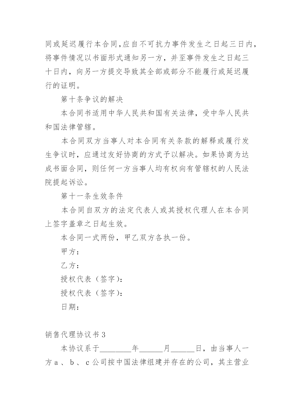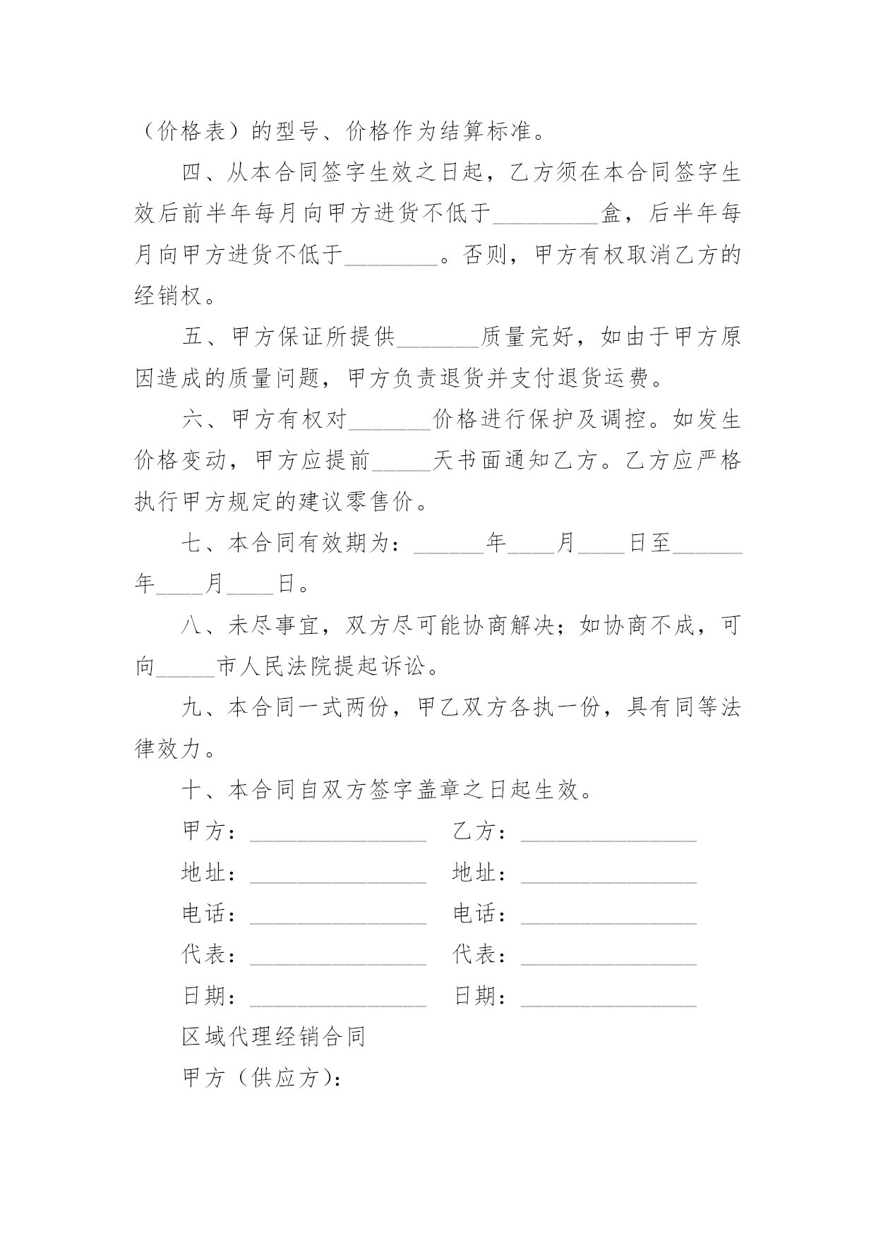 销售代理协议书销售代理协议书15篇(优秀)在充满活力,日益开放的今天,协议的使用成为日常生活的常态,签订协议能够较为有效的约束违约行为。那么写协议真的很难吗?下面是小编为大家收集的销售代理协议书,希望能够帮助到大家。销售代理协议书1合同编号:__________甲方:___________________________乙方:___________________________甲、乙双方本着互利互惠的原则,经友好协商,达成如下协议:一、甲方授权乙方为_______在_____地区进行经销,由于甲方以优惠的价格供货给乙方,所以乙方必须全面负责该地区的市场推广、产品销售、售后服务;甲方负责提供单张彩页宣传资料。二、乙方作为经销商,首批须向甲方定货_______货款金额为人民币(大写):_______________元(¥_________元)。三、此后乙方每次向甲方进货均采用先款后货的交易方式,运费及保险费由乙方负责。甲、乙双方根据本合同附件(价格表)的型号、价格作为结算标准。四、从本合同签字生效之日起,乙方须在本合同签字生效后前半年每月向甲方进货不低于_________盒,后半年每月向甲方进货不低于________。否则,甲方有权取消乙方的经销权。五、甲方保证所提供_______质量完好,如由于甲方原因造成的质量问题,甲方负责退货并支付退货运费。六、甲方有权对_______价格进行保护及调控。如发生价格变动,甲方应提前_____天书面通知乙方。乙方应严格执行甲方规定的建议零售价。七、本合同有效期为:______年____月____日至______年____月____日。八、未尽事宜,双方尽可能协商解决;如协商不成,可向_____市人民法院提起诉讼。九、本合同一式两份,甲乙双方各执一份,具有同等法律效力。十、本合同自双方签字盖章之日起生效。甲方:_______________乙方:_______________地址:_______________地址:_______________电话:_______________电话:_______________代表:_______________代表:_______________日期:_______________日期:_______________区域代理经销合同甲方(供应方):乙方(代理方):为使“”尽快推向全国,服务社会,甲乙双方本着互惠互利,诚信合作的原则,达成如下协议:一、甲乙双方的权利和义务1、甲方将省市(县、区)的“”经营权授权乙方全权代理,并长期按元/株供应产品。2、乙方在该行政区内的.经营具有独立性、唯一性,即甲方不再在该地区发展代理商、批发商,保护投资方利益不受损害,乙方不得跨地区经营。3、乙方有权在授权区内发展二级代理商或分销店,由乙方直接签定代理合同或供货。4、甲方向乙方传授相关技术,并常年提供咨询指导。5、甲方不得干涉乙方在授权区内合法合权的经营活动,产品销售价格由乙方自定,乙方不得有欺诈消费者的行为。二、供货1、为了保证及时供货,迅速占领市场,乙方需以传真或书面形式提前一个月向甲方提出购货计划。2、甲方可代办货运手续,并承担包装及km以内的运输。3、甲方在乙方款到后保证及时按量送货,不得延误。三、双方责任及违约处理1、甲乙双方作为合作伙伴,各自作为独立的经济单位经营,各自独立承担经济责任,乙方在授权区域内应以代理商的名义开展业务,未经许可,不得以甲方的名义从事业务活动。2、本合同有效期为壹年,期满须续签,如乙方不提出续签要求,此合同自动终止。四、在下述情况下,甲方有权通知乙方解除合同:1、乙方无力经营,宣告破产;2、合同期满,乙方不提出续签合同的;3、乙方用其它植物顶替“”销售,坑害消费者,非法牟取利润的;4、乙方采用其他非法手段销售被发现的。五、其它1、区域代理条件为:地区以上级(含地区)须承销万株以上,并在签定合同日首次提货株以上,县市级须承销万株以上,并在签定合同日首次提货株以上。2、在履行合同过程中发生纠纷,双方应协商解决,如协商不成,任何一方均可向当地人民法院提出诉讼。3、本合同一式二份,双方各执一份。4、本合同自双方签字(盖章)之时起生效。甲方:乙方:代表人:代表人:电话:电话:传真:传真:地址:地址:邮编:邮编:销售代理协议书2本保健食品委托加工合同书由下列各方于____年__月__日在_____市订立,本合同各方当事人如下所示:甲方:______________________乙方:______________________甲乙双方本着互惠互利、共同受益的原则,经过友好协商,根据《中华人民共和国合同法》的有关规定,就保健食品委托加工事宜,在互惠互利的基础上达成以下合同,并共同遵守。第一条委托加工产品名称、加工工序范围和产品规格委托生产产