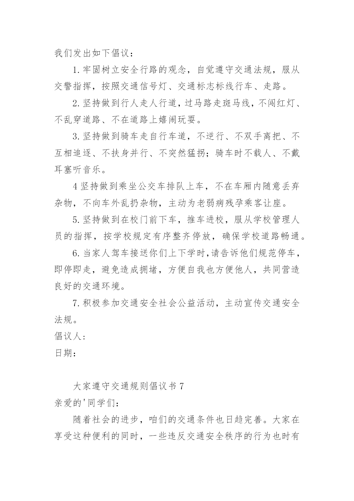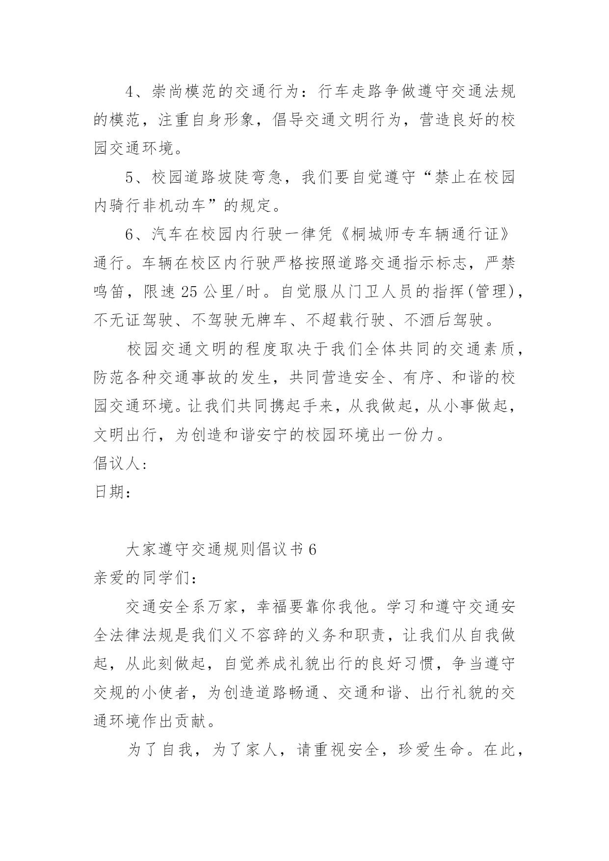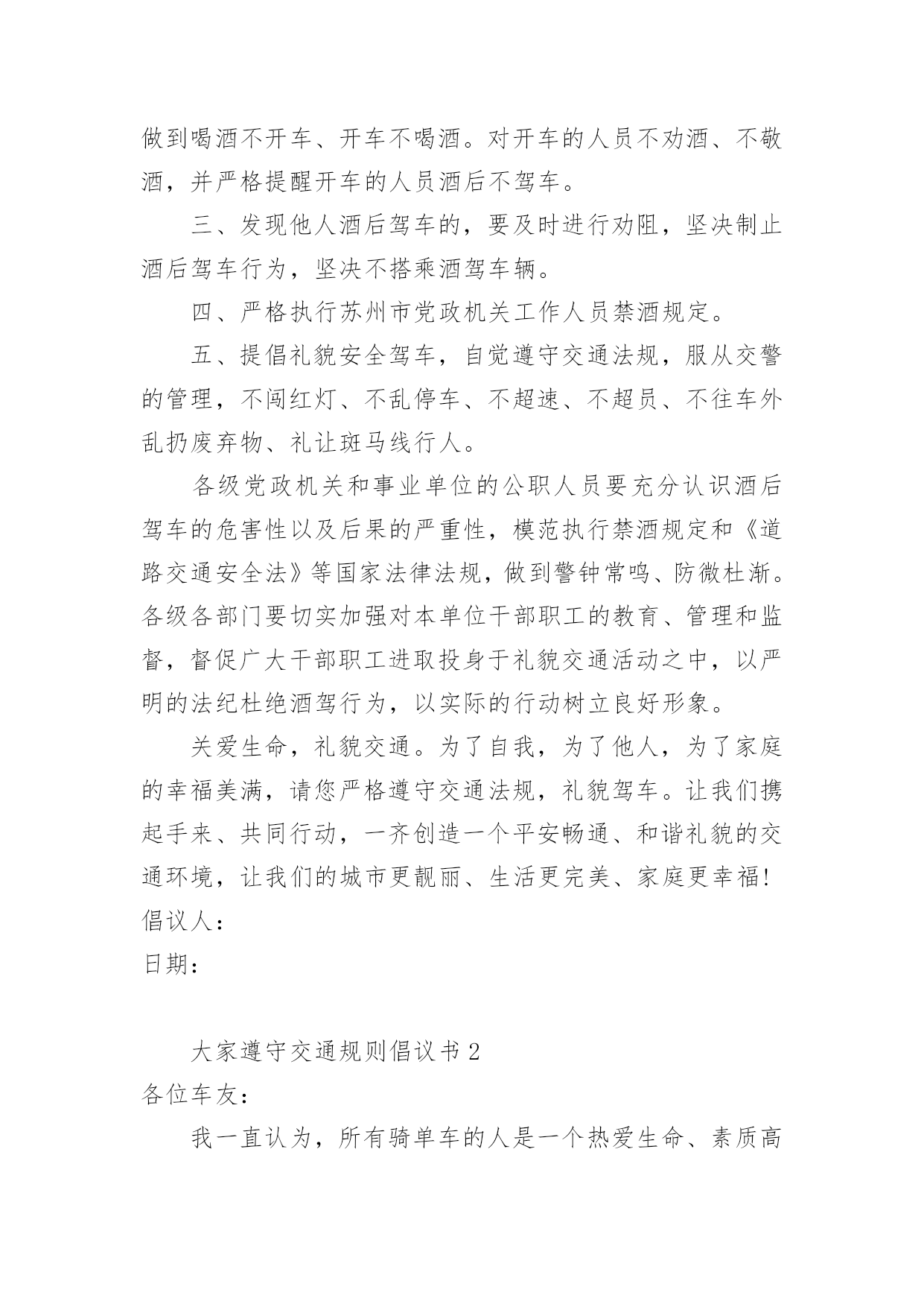 大家遵守交通规则倡议书大家遵守交通规则倡议书(精选8篇)在日常生活和工作中,需要使用倡议书的场合越来越多,倡议书有利于倡议者交代清楚倡议活动的原因,以及当时的各种背景事实。如何写一份恰当的倡议书呢?以下是小编帮大家整理的大家遵守交通规则倡议书(精选8篇),仅供参考,欢迎大家阅读。大家遵守交通规则倡议书1全市党政机关、事业单位公职人员:自今年5月1日起,《中华人民共和国道路交通安全法》最新修正案颁布,大幅提高了对酒后驾车的处罚力度,并进一步规定“饮酒后或者醉酒驾驶机动车发生重大交通事故,构成犯罪的,依法追究刑事职责”。《中华人民共和国刑法》修正案也规定“在道路上醉酒驾驶机动车的,处拘役,并处罚金”。为认真贯彻执行新修订的《中华人民共和国道路交通安全法》,进一步增强法纪观念,模范遵守国家法律法规,坚决杜绝酒后驾车行为,市廉政办、市礼貌办、市交巡警大队特向全市党政机关、事业单位公职人员提出如下倡议:一、带头学习、带头执行《中华人民共和国道路交通安全法》等国家法律法规,切实增强法律意识和纪律观念,坚决杜绝酒后驾车,争做礼貌交通的表率和践行者。二、在工作和生活中,严格自我约束,提高自控本事,做到喝酒不开车、开车不喝酒。对开车的人员不劝酒、不敬酒,并严格提醒开车的人员酒后不驾车。三、发现他人酒后驾车的,要及时进行劝阻,坚决制止酒后驾车行为,坚决不搭乘酒驾车辆。四、严格执行苏州市党政机关工作人员禁酒规定。五、提倡礼貌安全驾车,自觉遵守交通法规,服从交警的管理,不闯红灯、不乱停车、不超速、不超员、不往车外乱扔废弃物、礼让斑马线行人。各级党政机关和事业单位的公职人员要充分认识酒后驾车的危害性以及后果的严重性,模范执行禁酒规定和《道路交通安全法》等国家法律法规,做到警钟常鸣、防微杜渐。各级各部门要切实加强对本单位干部职工的教育、管理和监督,督促广大干部职工进取投身于礼貌交通活动之中,以严明的法纪杜绝酒驾行为,以实际的行动树立良好形象。关爱生命,礼貌交通。为了自我,为了他人,为了家庭的幸福美满,请您严格遵守交通法规,礼貌驾车。让我们携起手来、共同行动,一齐创造一个平安畅通、和谐礼貌的交通环境,让我们的城市更靓丽、生活更完美、家庭更幸福!倡议人:日期:大家遵守交通规则倡议书2各位车友:我一直认为,所有骑单车的人是一个热爱生命、素质高尚的群体。但今天早上上班的时候,经过凤城五路,一位骑捷安特的兄弟直接无视红灯,险些被右面过来的捷达撞个正着,看得我一身冷汗。生命诚可贵,人的生命只有一次,生命和健康永远是最宝贵的东西。可是,有多少年轻宝贵的生命丧失在拥挤的车道上,生命的意义又何在?因为疏忽交通规则而把生命健康毁于车轮下,多可惜,又多可悲啊。“遵守交通规则,珍爱生命健康”,本人在这里向各位车友发出如下倡议:一、自觉遵守交规坚持不闯红灯,二、尽量做到在非机动车道行驶,在没有划分非机动车道和机动车道的道路上行驶,应尽量靠右边行驶,不骑车在道路中间,更不要逆行;三、集体外出应列队乘车,不并排骑车四、骑车时不嬉笑打闹,不双手撒把;不相互攀扶,不追赶比赛,不戴耳机听音乐,不扒机动车。五、转弯前须减速慢行,向后瞭望,伸手示意,不要突然猛拐。倡议人:日期:大家遵守交通规则倡议书3亲爱的家长朋友们:作为父母,总会在孩子外出时,说一句:“注意安全!过马路时,看好红绿灯”,可是在那行人车辆拥挤的街道上,我们仍会看到一些令人胆战心惊的现象:早上,红灯亮了,一个背着书包、手拖着孩子的家长在车流中左右穿梭;放学路上,骑着自行车带着孩子逆向行驶、在马路中间与机动车抢速争时。父母是孩子的第一任老师,父母的言传身教直接影响着孩子品性的形成,而父母不遵守交通规则,不仅不利于孩子良好文明习惯的养成,更会使孩子陷入危险之中。“车祸猛于虎”!因为不遵守交通法规,我们多少次看到了血的事实,那一幕幕惨不忍睹的画面,那一个个因抢救无效而离我们远去的人们,最后留给我们的是无限的伤痛。我们在痛惜他们的同时,更应该清醒认识到:遵守交通法规,就是珍爱生命!俗话说得好:无规矩不成方圆。因此,凡在马路上进行与交通有关的活动的人都不能随心所欲,都必须严守交通法规,遵守交通法规是我们每个人的义务和责任。为此,我们濉溪县教育局向所有的家长发出以下倡议:1.过马路时,走人行横道,不乱穿马路、不翻越护栏、不闯红灯;在马路上行走,走人行道,没有人行道的靠道路右边行走。2.不要在人行道、机动车道上骑自行车、电动车;不要与机动车辆抢行;骑车时不要急转猛拐,低头疾驶;转弯时,放慢车速,向后张望,伸手示意行驶方向。3.乘公交车自觉遵守乘车秩序,排队等候,按先后顺序上车,不要拥挤;乘坐小汽车在前排就座系好安全带;不向车外抛洒物品。4.在学校门口接送孩子时,听从学校老师、志愿者和交警的指挥,不挤占机动车道、不堵塞交通。5.克服麻痹和侥