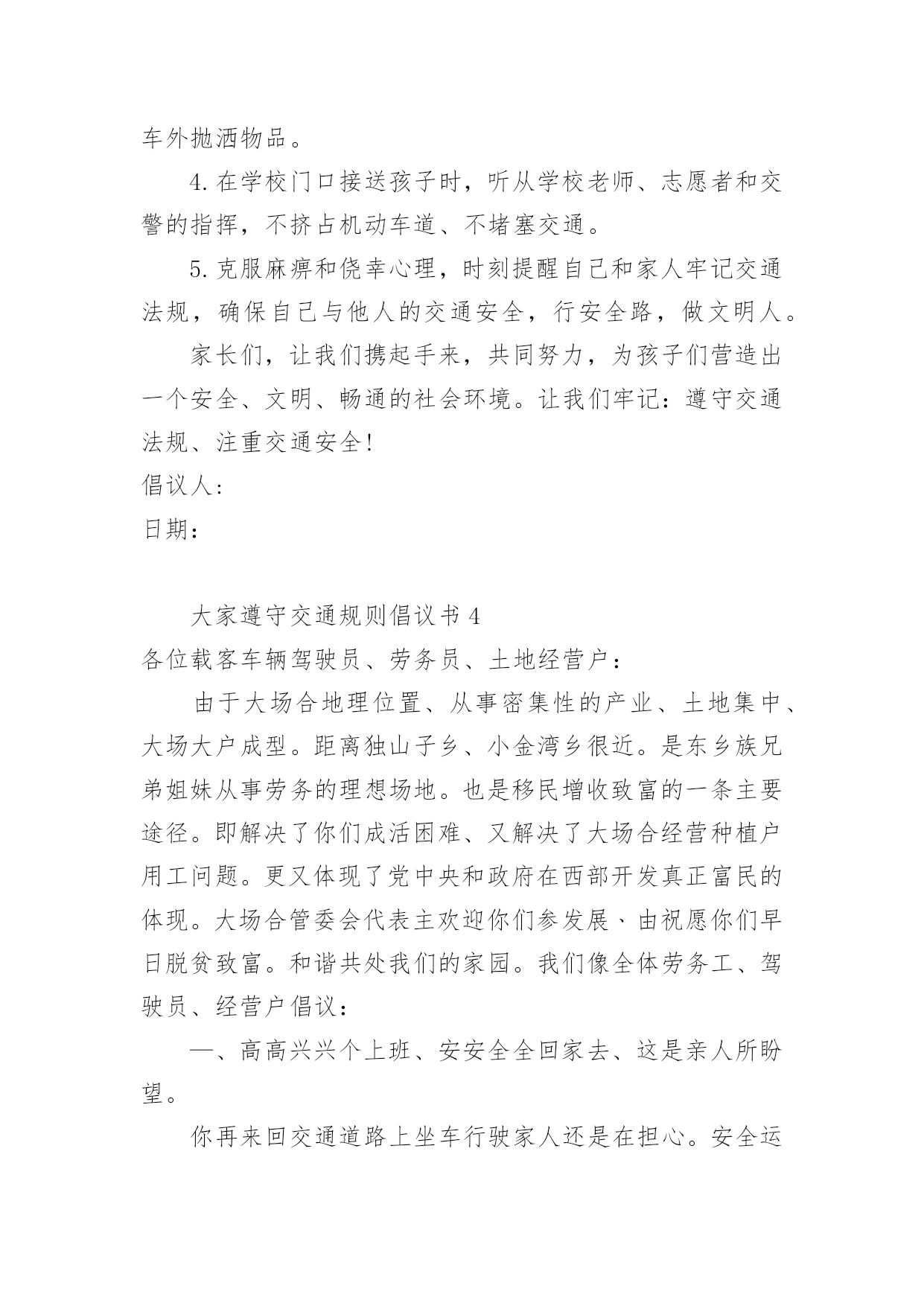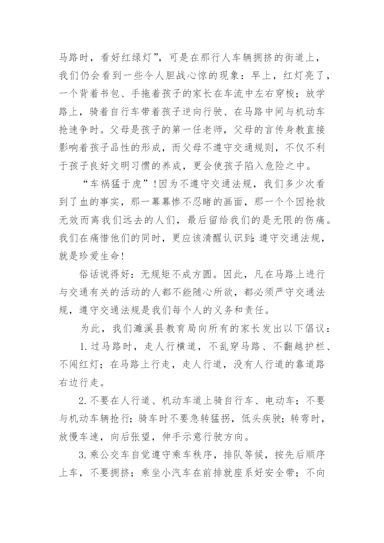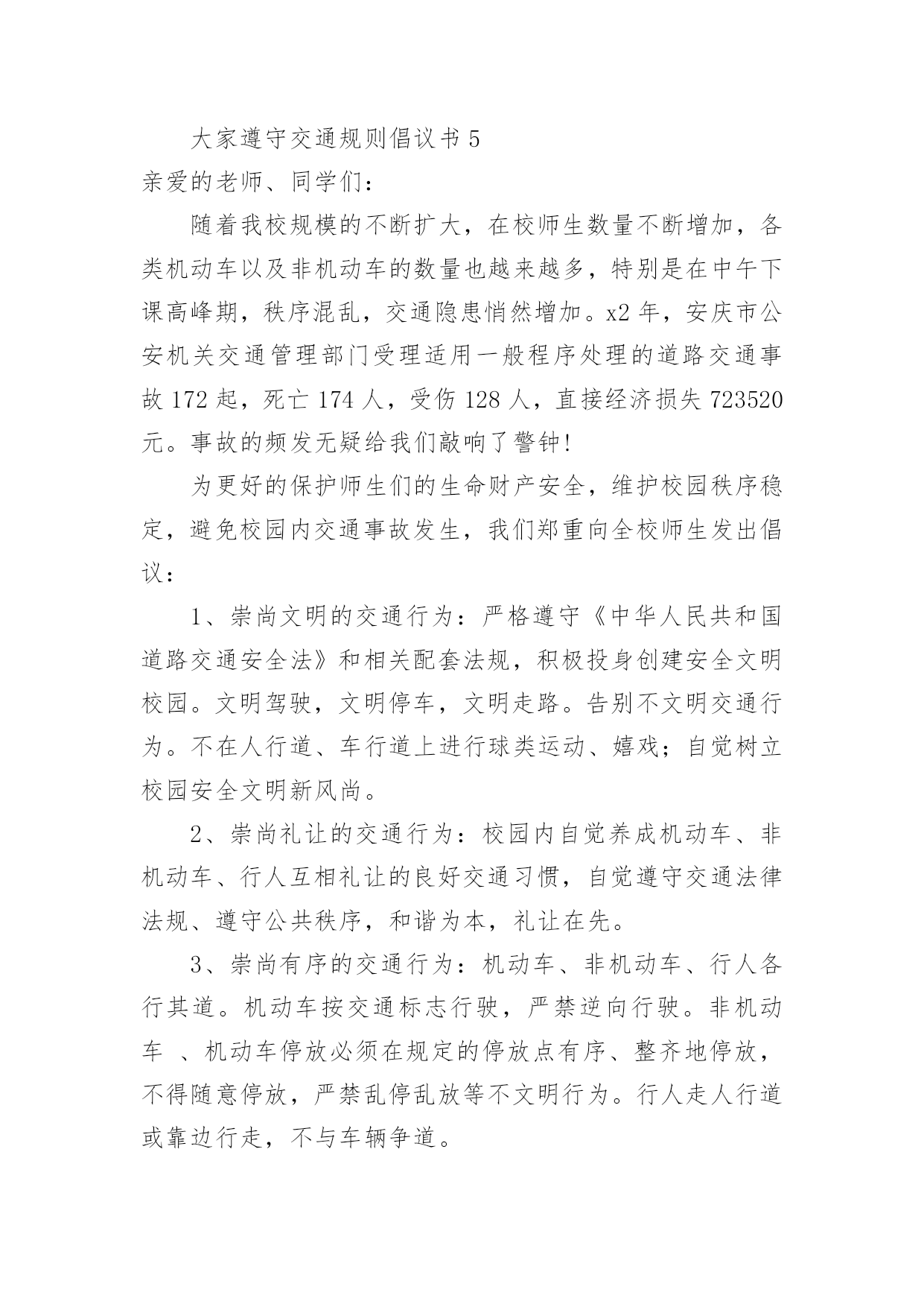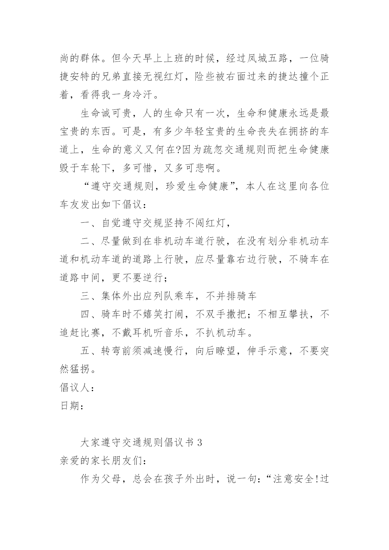 大家遵守交通规则倡议书大家遵守交通规则倡议书(精选8篇)在日常生活和工作中,需要使用倡议书的场合越来越多,倡议书有利于倡议者交代清楚倡议活动的原因,以及当时的各种背景事实。如何写一份恰当的倡议书呢?以下是小编帮大家整理的大家遵守交通规则倡议书(精选8篇),仅供参考,欢迎大家阅读。大家遵守交通规则倡议书1全市党政机关、事业单位公职人员:自今年5月1日起,《中华人民共和国道路交通安全法》最新修正案颁布,大幅提高了对酒后驾车的处罚力度,并进一步规定“饮酒后或者醉酒驾驶机动车发生重大交通事故,构成犯罪的,依法追究刑事职责”。《中华人民共和国刑法》修正案也规定“在道路上醉酒驾驶机动车的,处拘役,并处罚金”。为认真贯彻执行新修订的《中华人民共和国道路交通安全法》,进一步增强法纪观念,模范遵守国家法律法规,坚决杜绝酒后驾车行为,市廉政办、市礼貌办、市交巡警大队特向全市党政机关、事业单位公职人员提出如下倡议:一、带头学习、带头执行《中华人民共和国道路交通安全法》等国家法律法规,切实增强法律意识和纪律观念,坚决杜绝酒后驾车,争做礼貌交通的表率和践行者。二、在工作和生活中,严格自我约束,提高自控本事,做到喝酒不开车、开车不喝酒。对开车的人员不劝酒、不敬酒,并严格提醒开车的人员酒后不驾车。三、发现他人酒后驾车的,要及时进行劝阻,坚决制止酒后驾车行为,坚决不搭乘酒驾车辆。四、严格执行苏州市党政机关工作人员禁酒规定。五、提倡礼貌安全驾车,自觉遵守交通法规,服从交警的管理,不闯红灯、不乱停车、不超速、不超员、不往车外乱扔废弃物、礼让斑马线行人。各级党政机关和事业单位的公职人员要充分认识酒后驾车的危害性以及后果的严重性,模范执行禁酒规定和《道路交通安全法》等国家法律法规,做到警钟常鸣、防微杜渐。各级各部门要切实加强对本单位干部职工的教育、管理和监督,督促广大干部职工进取投身于礼貌交通活动之中,以严明的法纪杜绝酒驾行为,以实际的行动树立良好形象。关爱生命,礼貌交通。为了自我,为了他人,为了家庭的幸福美满,请您严格遵守交通法规,礼貌驾车。让我们携起手来、共同行动,一齐创造一个平安畅通、和谐礼貌的交通环境,让我们的城市更靓丽、生活更完美、家庭更幸福!倡议人:日期:大家遵守交通规则倡议书2各位车友:我一直认为,所有骑单车的人是一个热爱生命、素质高尚的群体。但今天早上上班的时候,经过凤城五路,一位骑捷安特的兄弟直接无视红灯,险些被右面过来的捷达撞个正着,看得我一身冷汗。生命诚可贵,人的生命只有一次,生命和健康永远是最宝贵的东西。可是,有多少年轻宝贵的生命丧失在拥挤的车道上,生命的意义又何在?因为疏忽交通规则而把生命健康毁于车轮下,多可惜,又多可悲啊。“遵守交通规则,珍爱生命健康”,本人在这里向各位车友发出如下倡议:一、自觉遵守交规坚持不闯红灯,二、尽量做到在非机动车道行驶,在没有划分非机动车道和机动车道的道路上行驶,应尽量靠右边行驶,不骑车在道路中间,更不要逆行;三、集体外出应列队乘车,不并排骑车四、骑车时不嬉笑打闹,不双手撒把;不相互攀扶,不追赶比赛,不戴耳机听音乐,不扒机动车。五、转弯前须减速慢行,向后瞭望,伸手示意,不要突然猛拐。倡议人:日期:大家遵守交通规则倡议书3亲爱的家长朋友们:作为父母,总会在孩子外出时,说一句:“注意安全!过马路时,看好红绿灯”,可是在那行人车辆拥挤的街道上,我们仍会看到一些令人胆战心惊的现象:早上,红灯亮了,一个背着书包、手拖着孩子的家长在车流中左右穿梭;放学路上,骑着自行车带着孩子逆向行驶、在马路中间与机动车抢速争时。父母是孩子的第一任老师,父母的言传身教直接影响着孩子品性的形成,而父母不遵守交通规则,不仅不利于孩子良好文明习惯的养成,更会使孩子陷入危险之中。“车祸猛于虎”!因为不遵守交通法规,我们多少次看到了血的事实,那一幕幕惨不忍睹的画面,那一个个因抢救无效而离我们远去的人们,最后留给我们的是无限的伤痛。我们在痛惜他们的同时,更应该清醒认识到:遵守交通法规,就是珍爱生命!俗话说得好:无规矩不成方圆。因此,凡在马路上进行与交通有关的活动的人都不能随心所欲,都必须严守交通法规,遵守交通法规是我们每个人的义务和责任。为此,我们濉溪县教育局向所有的家长发出以下倡议:1.过马路时,走人行横道,不乱穿马路、不翻越护栏、不闯红灯;在马路上行走,走人行道,没有人行道的靠道路右边行走。2.不要在人行道、机动车道上骑自行车、电动车;不要与机动车辆抢行;骑车时不要急转猛拐,低头疾驶;转弯时,放慢车速,向后张望,伸手示意行驶方向。3.乘公交车自觉遵守乘车秩序,排队等候,按先后顺序上车,不要拥挤;乘坐小汽车在前排就座系好安全带;不向车外抛洒物品。4.在学校门口接送孩子时,听从学校老师、志愿者和交警的指挥,不挤占机动车道、不堵塞交通。5.克服麻痹和侥