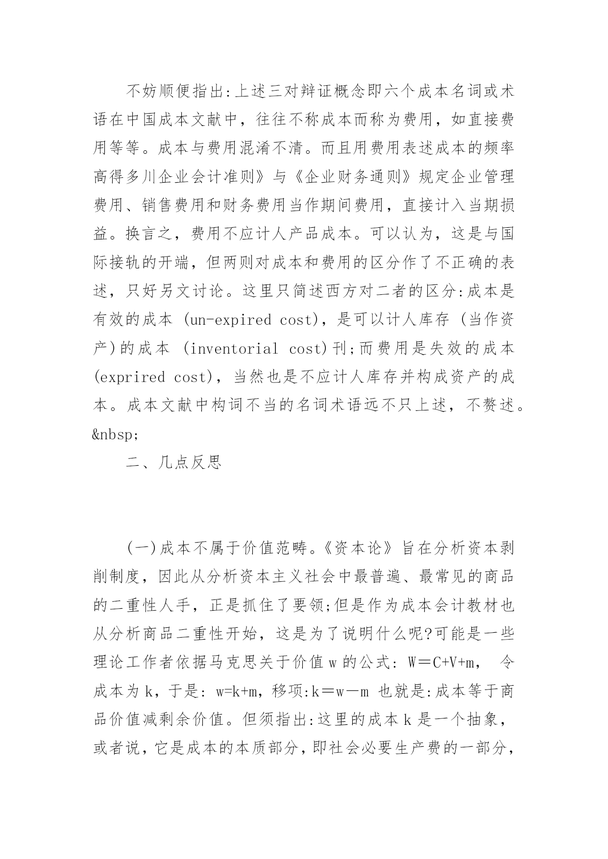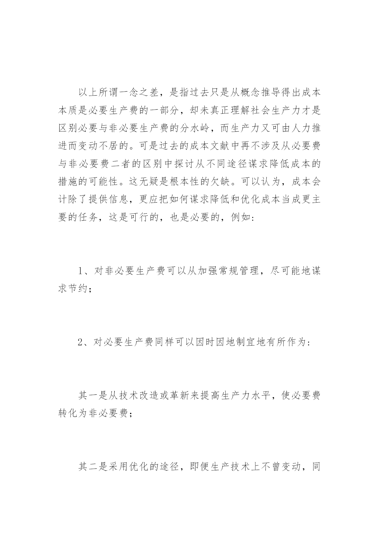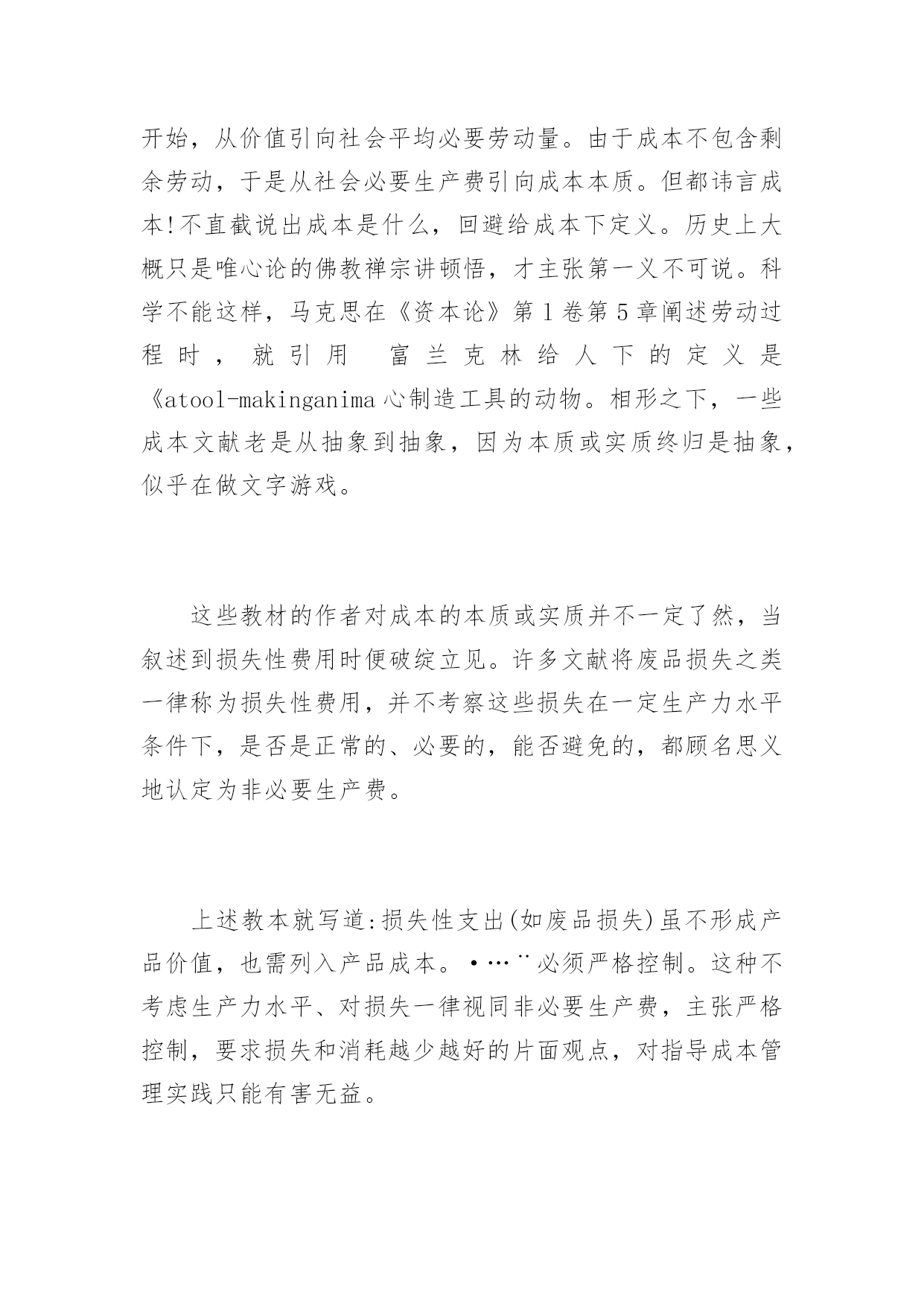 成本会计理论的基点问题关于成本会计理论的基点问题成本会计在旧中国只是粗具雏形,在新中国才有巨大发展。由于社会主义建设的伟大实践,我国培育了数代成本管理人才,且其中不乏校校者,但许多富有创造性的实践并不曾在理论上充分反映。相对地说,成本会计在理论上不仅先天不足,并且后天失调,这从数十年一贯的成本会计教材可见端倪。约言之,从20世纪50年代起关于成本会计的理论阐述就是错误的,此后半个世纪中略有修补,但抱残守缺的基本思路末变。本文仅先就阐述成本理论的起点即基点略抒己见。一、问题的提出每一学科都是一个概念系统,它并非概念的堆集,而是按客观逻辑依次展开。《资本论》就是从商品二重性--价值--交换--货币--资本……依次展开。半个世纪以来对成本会计的论述自不例外:这些教材都不约而同地从分析商品二重性开始,从价值引向社会平均必要劳动量。由于成本不包含剩余劳动,于是从社会必要生产费引向成本本质。但都讳言成本!不直截说出成本是什么,回避给成本下定义。历史上大概只是唯心论的佛教禅宗讲顿悟,才主张第一义不可说。科学不能这样,马克思在《资本论》第l卷第5章阐述劳动过程时,就引用富兰克林给人下的定义是《atool-makinganima心制造工具的动物。相形之下,一些成本文献老是从抽象到抽象,因为本质或实质终归是抽象,似乎在做文字游戏。这些教材的作者对成本的本质或实质并不一定了然,当叙述到损失性费用时便破绽立见。许多文献将废品损失之类一律称为损失性费用,并不考察这些损失在一定生产力水平条件下,是否是正常的、必要的,能否避免的,都顾名思义地认定为非必要生产费。上述教本就写道:损失性支出(如废品损失)虽不形成产品价值,也需列入产品成本。·…¨必须严格控制。这种不考虑生产力水平、对损失一律视同非必要生产费,主张严格控制,要求损失和消耗越少越好的片面观点,对指导成本管理实践只能有害无益。不妨设想,某种废品损失在当今生产力条件下是正常的,必要的;为了坚持严格控制的理论指导,生产中很可以一味精工细作,因而废品确实可能下降。但是为此精工细作的所费往往超出降低废品的所得。物料消耗也是如此,例如机械运转要添加润滑油,多加固然浪费,如果一味控制,添加过少便会导致部件磨损,甚至出现大事故。固定资产寿命以及炼钢炉龄也不是越长越好,明眼人都清楚,可是一些成本教材中却孤立、静止地重复严格控制的说教,这不是理论远落后于实践吗引以上只不过是就成本论成本,省小失大。事实发展还不尽如此。深圳有一家南方玻璃公司,公司股票上市称深南玻,在筹备股票上市时公司废品达40%以上。公司管理层居然宣称:必须坚持高废品率,赢得信誉,以便出口获得优价。这远不是传统的严格控制观念,也不是就成本论成本,而是就信誉,优价来看待废品。小荷刚露尖尖角!这正是一种成本管理的新视野,而成本会计理论是否值得更新呢!此外,如百接成本与间接成本、变动成本和固定成本,以及可控制成本和不可控制成本,都是一对对辩证概念,其间不存在不可逾越的界限。又如辅助车间的若干种分配方法之间,分明存在辩证的联系和关系。不妨顺便指出:上述三对辩证概念即六个成本名词或术语在中国成本文献中,往往不称成本而称为费用,如直接费用等等。成本与费用混淆不清。而且用费用表述成本的频率高得多川企业会计准则》与《企业财务通则》规定企业管理费用、销售费用和财务费用当作期间费用,直接计入当期损益。换言之,费用不应计人产品成本。可以认为,这是与国际接轨的开端,但两则对成本和费用的区分作了不正确的表述,只好另文讨论。这里只简述西方对二者的区分:成本是有效的成本(un-expiredcost),是可以计人库存(当作资产)的成本(inventorialcost)刊;而费用是失效的成本(expriredcost),当然也是不应计人库存并构成资产的成本。成本文献中构词不当的名词术语远不只上述,不赘述。 二、几点反思(一)成本不属于价值范畴。《资本论》旨在分析资本剥削制度,因此从分析资本主义社会中最普遍、最常见的商品的二重性人手,正是抓住了要领;但是作为成本会计教材也从分析商品二重性开始,这是为了说明什么呢?可能是一些理论工作者依据马克思关于价值w的公式:W=C+V+m,令成本为k,于是:w=k+m,移项:k=w-m也就是:成本等于商品价值减剩余价值。但须指出:这里的成本k是一个抽象,或者说,它是成本的本质部分,即社会必要生产费的一部分,并非成本会计作为对象的现实的历史成本。马克思早在《资本论》第3卷第1章指出,成本具有一种假象,似乎它是价值本身的一个范畴。不仅指明是假象,并且正面指出,成本这一范畴,同商品的价值的形成或同资本的增值过程毫无关系。(中共中央编译局译,人民出版社1978年版《资本论》第3卷)。换言之,成本只是生产过程中的耗费,资本借生产耗费的过程来对劳动