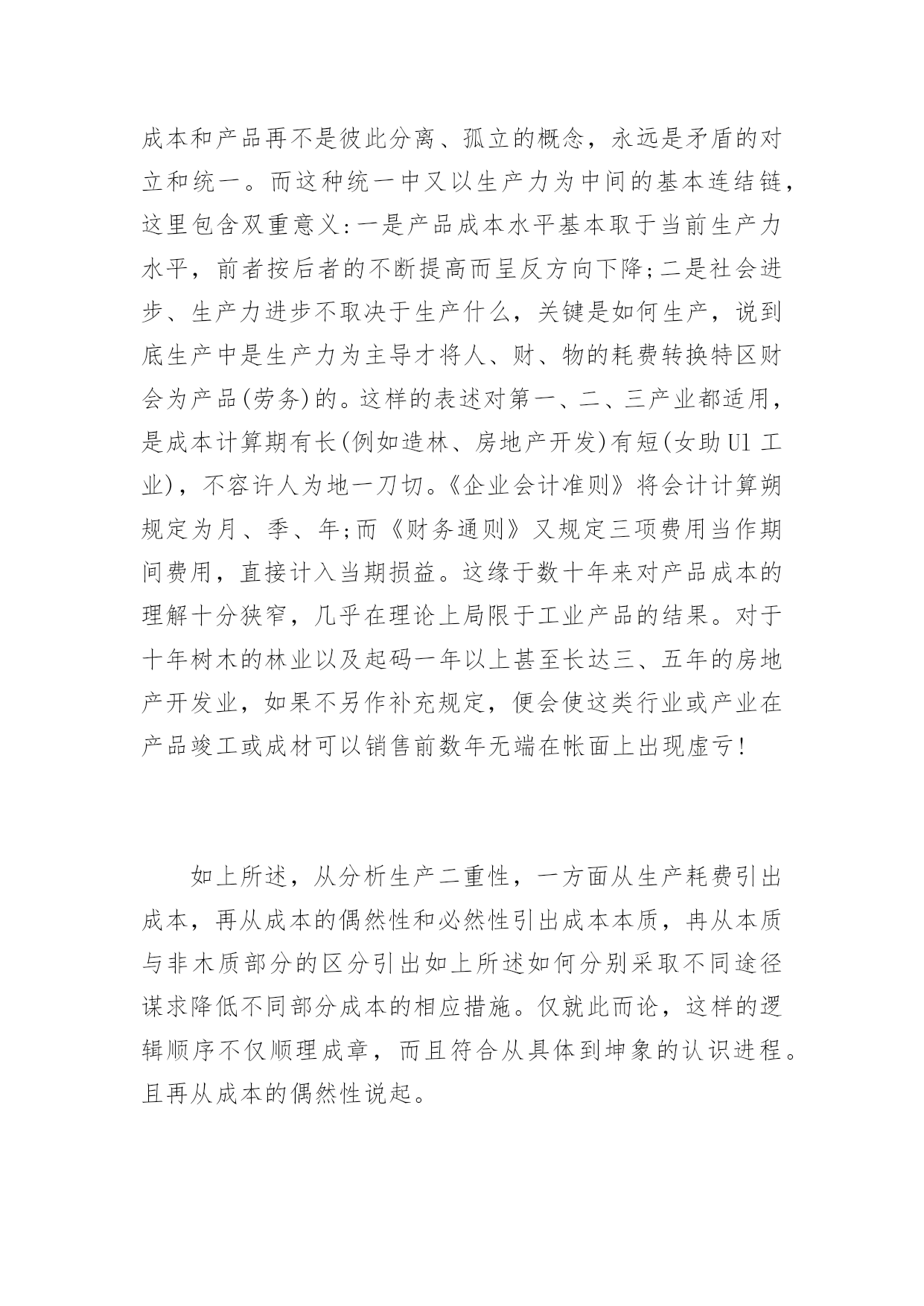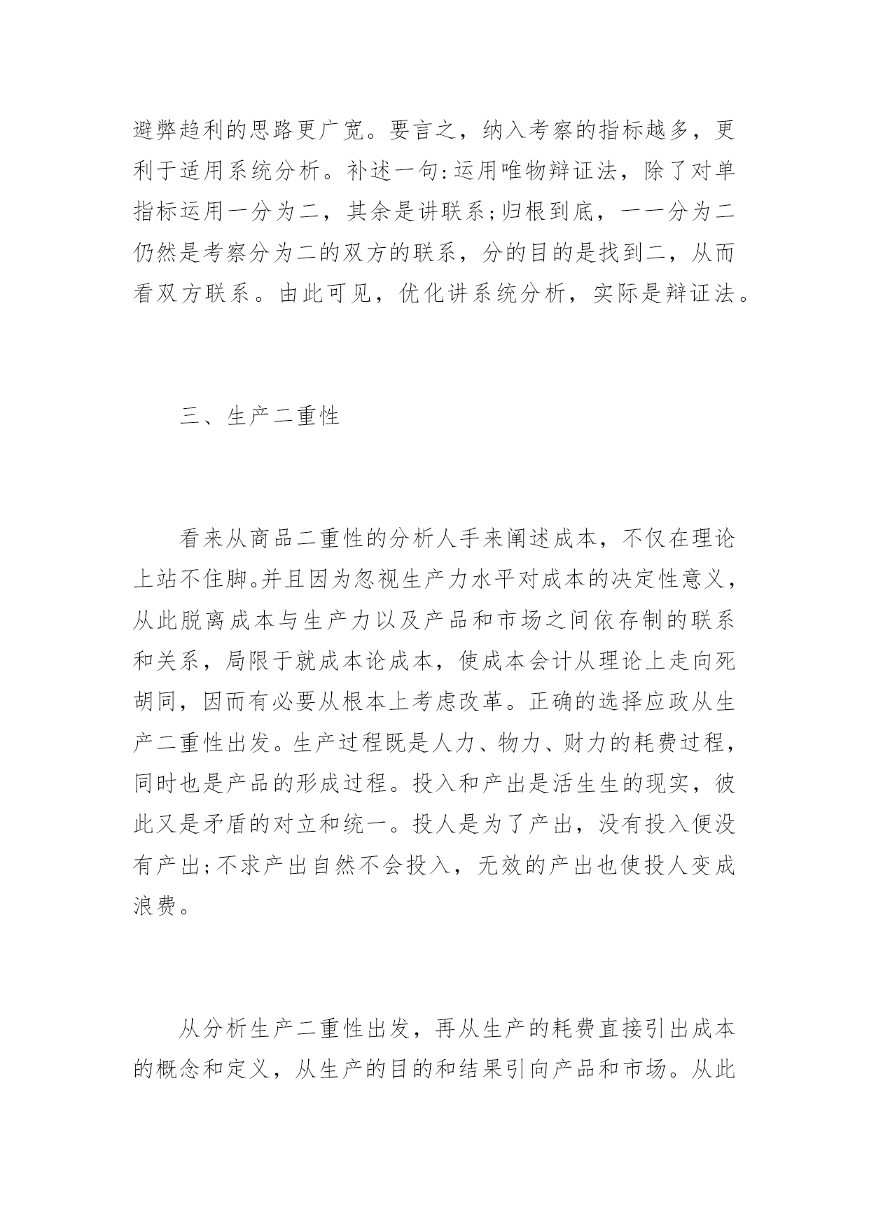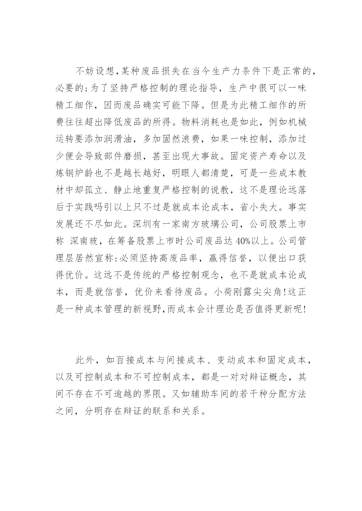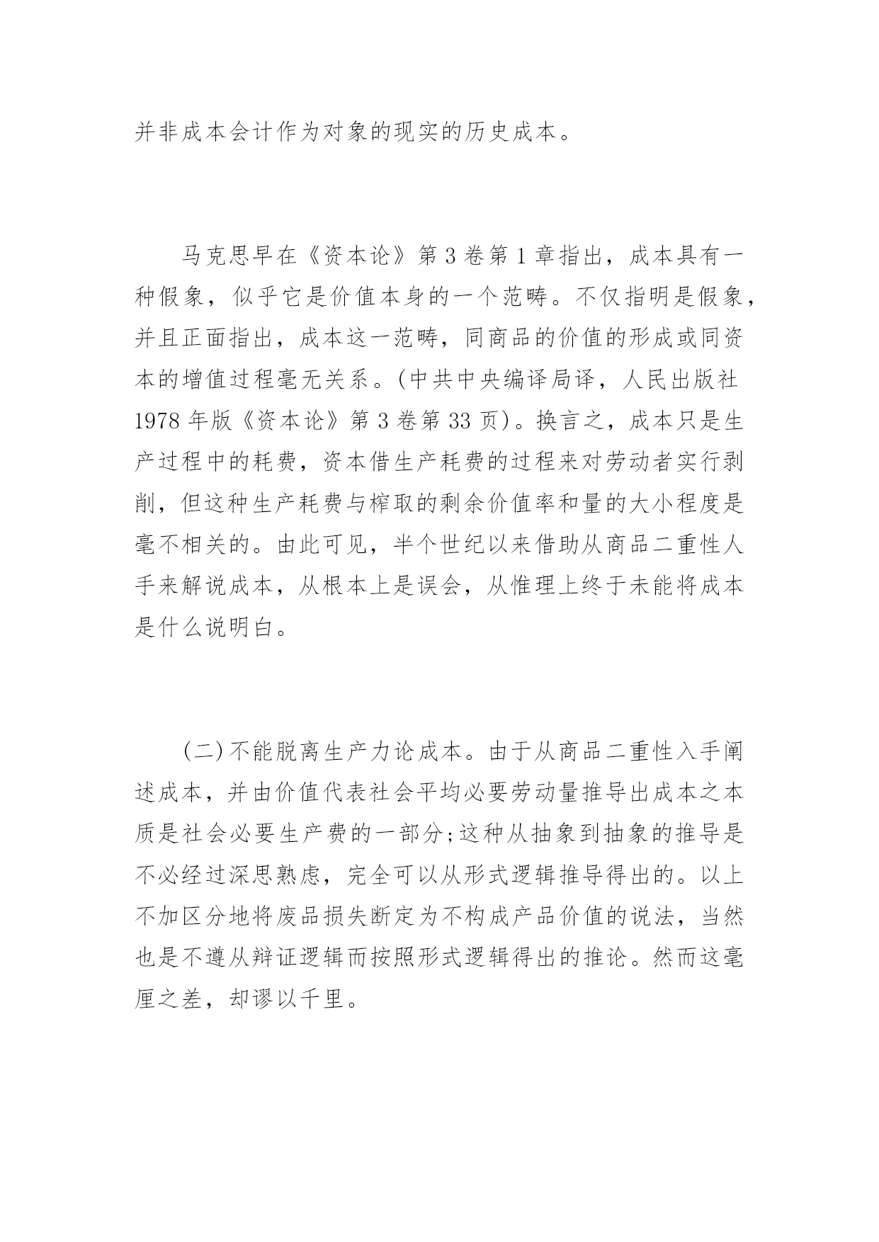 成本会计理论的基点问题关于成本会计理论的基点问题成本会计在旧中国只是粗具雏形,在新中国才有巨大发展。由于社会主义建设的伟大实践,我国培育了数代成本管理人才,且其中不乏校校者,但许多富有创造性的实践并不曾在理论上充分反映。相对地说,成本会计在理论上不仅先天不足,并且后天失调,这从数十年一贯的成本会计教材可见端倪。约言之,从20世纪50年代起关于成本会计的理论阐述就是错误的,此后半个世纪中略有修补,但抱残守缺的基本思路末变。本文仅先就阐述成本理论的起点即基点略抒己见。一、问题的提出每一学科都是一个概念系统,它并非概念的堆集,而是按客观逻辑依次展开。《资本论》就是从商品二重性--价值--交换--货币--资本……依次展开。半个世纪以来对成本会计的论述自不例外:这些教材都不约而同地从分析商品二重性开始,从价值引向社会平均必要劳动量。由于成本不包含剩余劳动,于是从社会必要生产费引向成本本质。但都讳言成本!不直截说出成本是什么,回避给成本下定义。历史上大概只是唯心论的佛教禅宗讲顿悟,才主张第一义不可说。科学不能这样,马克思在《资本论》第l卷第5章阐述劳动过程时,就引用富兰克林给人下的定义是《atool-makinganima心制造工具的动物。相形之下,一些成本文献老是从抽象到抽象,因为本质或实质终归是抽象,似乎在做文字游戏。这些教材的作者对成本的本质或实质并不一定了然,当叙述到损失性费用时便破绽立见。许多文献将废品损失之类一律称为损失性费用,并不考察这些损失在一定生产力水平条件下,是否是正常的、必要的,能否避免的,都顾名思义地认定为非必要生产费。上述教本就写道:损失性支出(如废品损失)虽不形成产品价值,也需列入产品成本。·…¨必须严格控制。这种不考虑生产力水平、对损失一律视同非必要生产费,主张严格控制,要求损失和消耗越少越好的片面观点,对指导成本管理实践只能有害无益。不妨设想,某种废品损失在当今生产力条件下是正常的,必要的;为了坚持严格控制的理论指导,生产中很可以一味精工细作,因而废品确实可能下降。但是为此精工细作的所费往往超出降低废品的所得。物料消耗也是如此,例如机械运转要添加润滑油,多加固然浪费,如果一味控制,添加过少便会导致部件磨损,甚至出现大事故。固定资产寿命以及炼钢炉龄也不是越长越好,明眼人都清楚,可是一些成本教材中却孤立、静止地重复严格控制的说教,这不是理论远落后于实践吗引以上只不过是就成本论成本,省小失大。事实发展还不尽如此。深圳有一家南方玻璃公司,公司股票上市称深南玻,在筹备股票上市时公司废品达40%以上。公司管理层居然宣称:必须坚持高废品率,赢得信誉,以便出口获得优价。这远不是传统的严格控制观念,也不是就成本论成本,而是就信誉,优价来看待废品。小荷刚露尖尖角!这正是一种成本管理的新视野,而成本会计理论是否值得更新呢!此外,如百接成本与间接成本、变动成本和固定成本,以及可控制成本和不可控制成本,都是一对对辩证概念,其间不存在不可逾越的界限。又如辅助车间的若干种分配方法之间,分明存在辩证的联系和关系。不妨顺便指出:上述三对辩证概念即六个成本名词或术语在中国成本文献中,往往不称成本而称为费用,如直接费用等等。成本与费用混淆不清。而且用费用表述成本的频率高得多川企业会计准则》与《企业财务通则》规定企业管理费用、销售费用和财务费用当作期间费用,直接计入当期损益。换言之,费用不应计人产品成本。可以认为,这是与国际接轨的开端,但两则对成本和费用的区分作了不正确的表述,只好另文讨论。这里只简述西方对二者的区分:成本是有效的成本(un-expiredcost),是可以计人库存(当作资产)的成本(inventorialcost)刊;而费用是失效的成本(expriredcost),当然也是不应计人库存并构成资产的成本。成本文献中构词不当的名词术语远不只上述,不赘述。 二、几点反思(一)成本不属于价值范畴。《资本论》旨在分析资本剥削制度,因此从分析资本主义社会中最普遍、最常见的商品的二重性人手,正是抓住了要领;但是作为成本会计教材也从分析商品二重性开始,这是为了说明什么呢?可能是一些理论工作者依据马克思关于价值w的公式:W=C+V+m,令成本为k,于是:w=k+m,移项:k=w-m也就是:成本等于商品价值减剩余价值。但须指出:这里的成本k是一个抽象,或者说,它是成本的本质部分,即社会必要生产费的一部分,并非成本会计作为对象的现实的历史成本。马克思早在《资本论》第3卷第1章指出,成本具有一种假象,似乎它是价值本身的一个范畴。不仅指明是假象,并且正面指出,成本这一范畴,同商品的价值的形成或同资本的增值过程毫无关系。(中共中央编译局译,人民出版社1978年版《资本论》第3卷)。换言之,成本只是生产过程中的耗费,资本借生产耗费的过程来对劳动