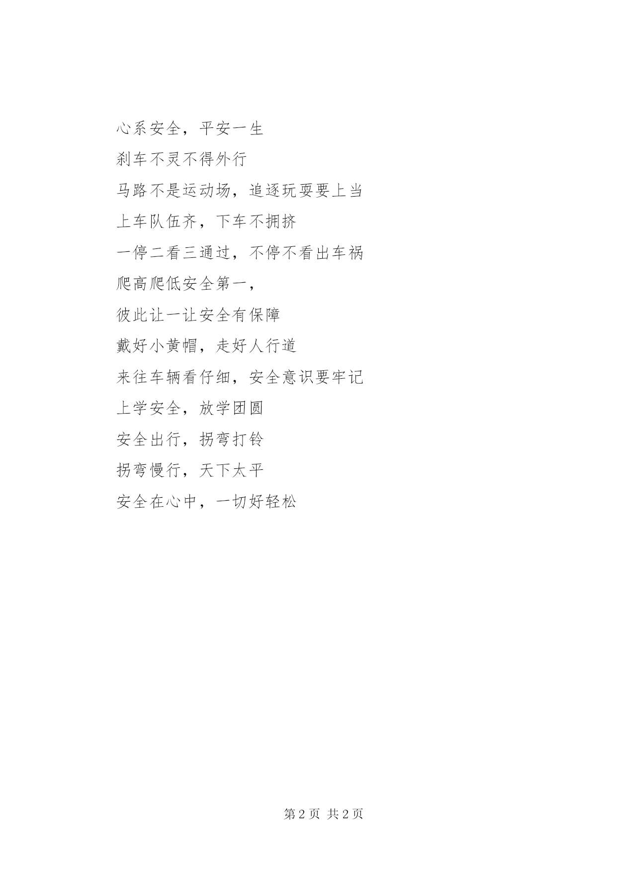 第PAGE\*Arabic\*MERGEFORMAT2页共NUMPAGES\*MERGEFORMAT2页交通安全标语大全(二)核心提示:别拿生命开玩笑,安全第一最重要车子向你招招手,千万不要向前走图一时痛快,将换来一生遗憾让一步桥宽路阔,等一时车顺人欢人过马路口,斑马线内走礼让礼让,人车无恙道路连着你我他,安全系着千万家...别拿生命开玩笑,安全第一最重要车子向你招招手,千万不要向前走图一时痛快,将换来一生遗憾让一步桥宽路阔,等一时车顺人欢人过马路口,斑马线内走礼让礼让,人车无恙道路连着你我他,安全系着千万家爱你爱我爱大家,注意安全靠大家天天讲交通安全不是玩笑头戴小黄帽上学必不可少让安全牢记心上,让生活洒满阳光平安为无价宝,当心为护身术车铃开口叫,请你让开道红灯停绿灯行,交通安全我能行彼此让一让,安全有保障安全来自警惕,你我必须牢记心系安全,平安一生刹车不灵不得外行马路不是运动场,追逐玩耍要上当上车队伍齐,下车不拥挤一停二看三通过,不停不看出车祸爬高爬低安全第一,彼此让一让安全有保障戴好小黄帽,走好人行道来往车辆看仔细,安全意识要牢记上学安全,放学团圆安全出行,拐弯打铃拐弯慢行,天下太平安全在心中,一切好轻松