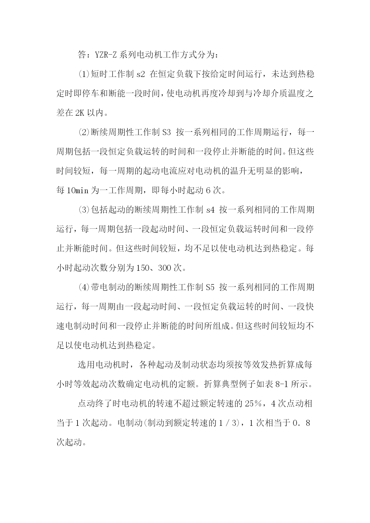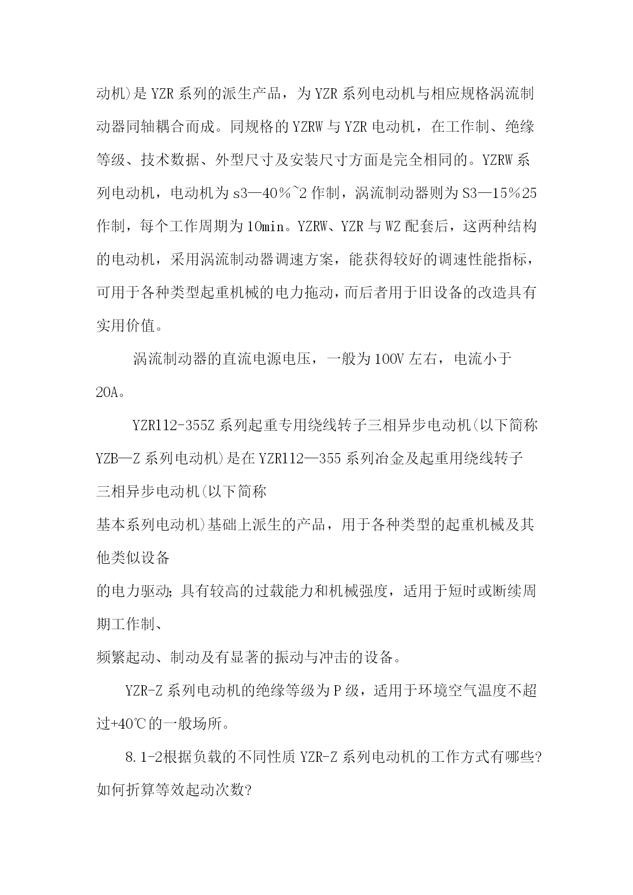 桥式起重机电气设备的维修第1节起重机用电动机8.1.1起重机用电动机有哪些特点?答:起重机用电动机有以下共同特点:1)起重电动机一般按断续周期工作制s3制造,基准丁作制为s3—40%(即工作制为S3,基准负载持续率FC为40%),或S3—25%。2)最大转矩Tmax倍数和最初起动转矩rst倍数大,以适应重载下频繁起动、制动和反转,满足经常过载和缩短起、制动时间的要求。3)转子长度i与其直径0之比,即L/D较大,飞轮力矩GD’小,加速时间短,起动损耗小。4)定、动转子具有较高的机械强度,允许的最大安全转速超过额定转速的倍数高。5)电动机防护等级不低于1P44,冶金电动机一般不低于IP54。不同型号的起重机用电动机有其各自的特点。YZR、YZ系列冶金及起重用三相异步电动机是我国20世纪80年代按照国际电工委员会(1EC)标准设计的新系列电动机。它具有高效率、节能、噪声低、振动小、体积小、重量轻、温升低、使用寿命长、性能可靠、安装维护方便等优点。近几年来,YZR、YZ系列电动机已取代JZR2、JZRH2、JZ2、JZH2系列电动机,是节约电能和提高运行可靠性的一种行之有效的措施。YZRW系列涡流制动绕线转子三相异步电动机(简称YZRW系列电动机)是YZR系列的派生产品,为YZR系列电动机与相应规格涡流制动器同轴耦合而成。同规格的YZRW与YZR电动机,在工作制、绝缘等级、技术数据、外型尺寸及安装尺寸方面是完全相同的。YZRW系列电动机,电动机为s3—40%~2作制,涡流制动器则为S3—15%25作制,每个工作周期为10min。YZRW、YZR与WZ配套后,这两种结构的电动机,采用涡流制动器调速方案,能获得较好的调速性能指标,可用于各种类型起重机械的电力拖动,而后者用于旧设备的改造具有实用价值。涡流制动器的直流电源电压,一般为100V左右,电流小于20A。YZRll2-355Z系列起重专用绕线转子三相异步电动机(以下简称YZB—Z系列电动机)是在YZRll2—355系列冶金及起重用绕线转子三相异步电动机(以下简称基本系列电动机)基础上派生的产品,用于各种类型的起重机械及其他类似设备的电力驱动;具有较高的过载能力和机械强度,适用于短时或断续周期工作制、频繁起动、制动及有显著的振动与冲击的设备。YZR-Z系列电动机的绝缘等级为P级,适用于环境空气温度不超过+40℃的一般场所。8.1-2根据负载的不同性质YZR-Z系列电动机的工作方式有哪些?如何折算等效起动次数?答:YZR-Z系列电动机工作方式分为:(1)短时工作制s2在恒定负载下按给定时间运行,未达到热稳定时即停车和断能一段时间,使电动机再度冷却到与冷却介质温度之差在2K以内。(2)断续周期性工作制S3按一系列相同的工作周期运行,每一周期包括一段恒定负载运转的时间和一段停止并断能的时间。但这些时间较短,每一周期的起动电流应对电动机的温升无明显的影响,每10min为一工作周期,即每小时起动6次。(3)包括起动的断续周期性工作制s4按一系列相同的工作周期运行,每一周期包括一段起动时间、一段恒定负载运转时间和一段停止并断能时间。但这些时间较短,均不足以使电动机达到热稳定。每小时起动次数分别为150、300次。(4)带电制动的断续周期性工作制S5按一系列相同的工作周期运行,每一周期由一段起动时间、一段恒定负载运转的时间、一段快速电制动时间和一段停止并断能的时间所组成。但这些时间较短均不足以使电动机达到热稳定。选用电动机时,各种起动及制动状态均须按等效发热折算成每小时等效起动次数确定电动机的定额。折算典型例子如表8-l所示。点动终了时电动机的转速不超过额定转速的25%,4次点动相当于1次起动。电制动(制动到额定转速的1/3),1次相当于0.8次起动。
