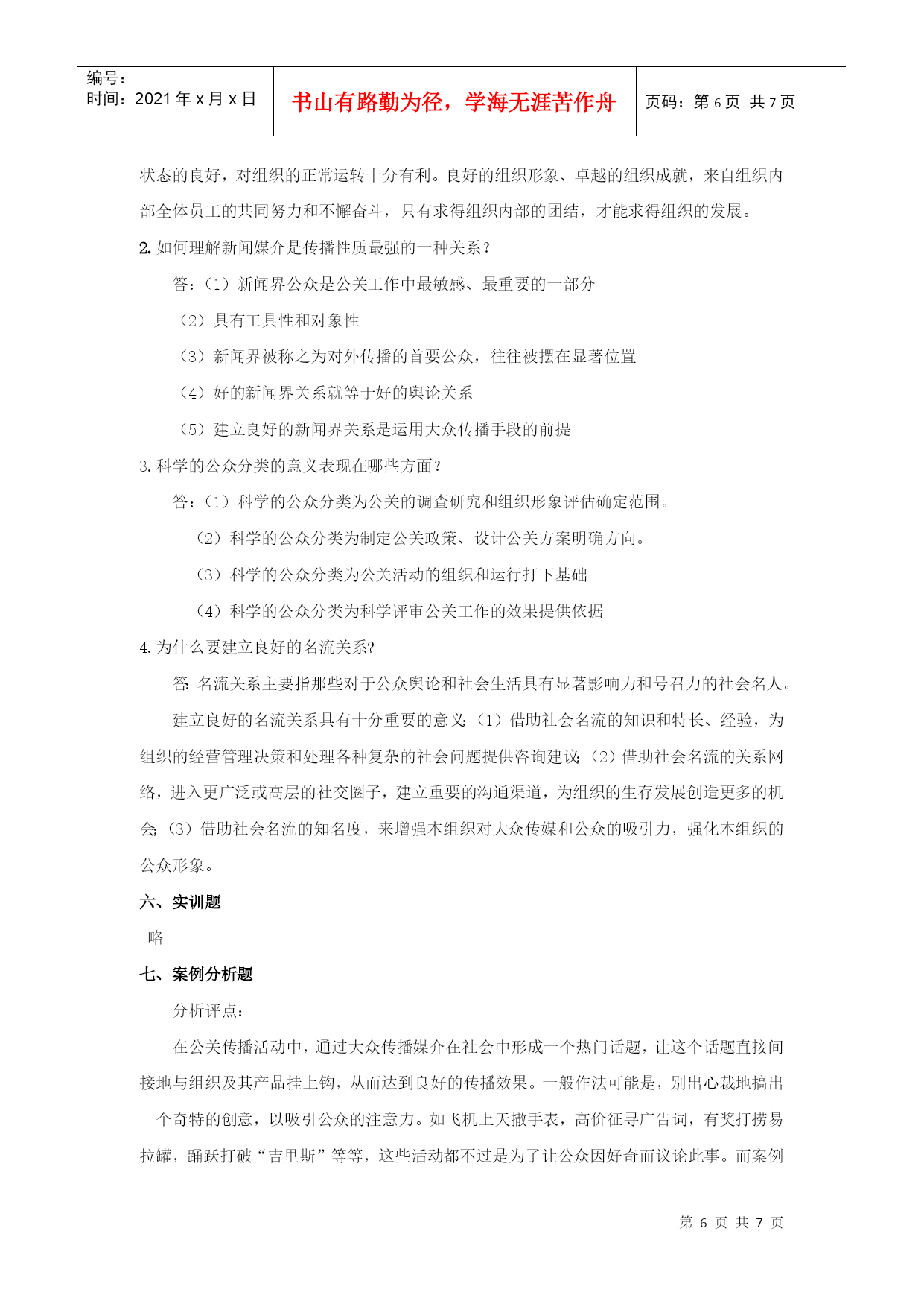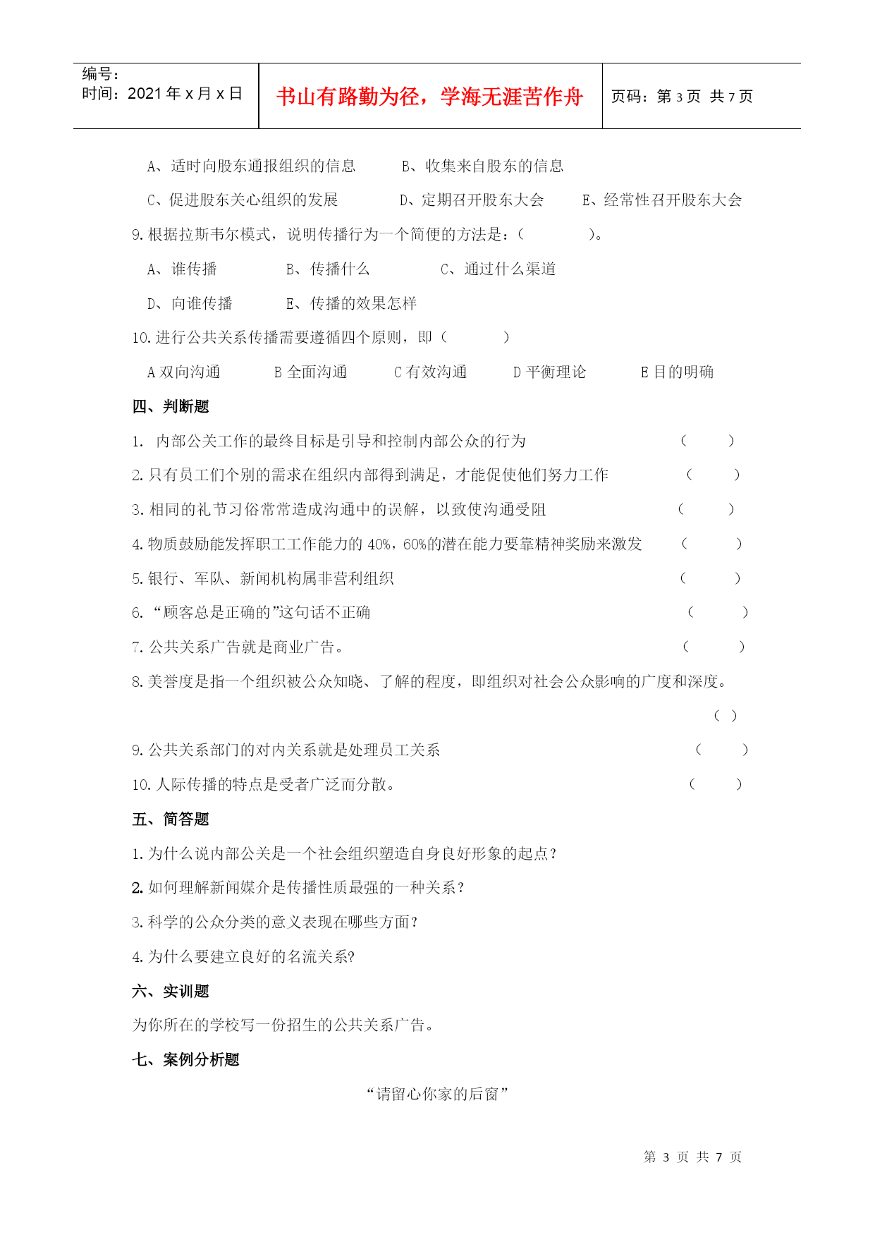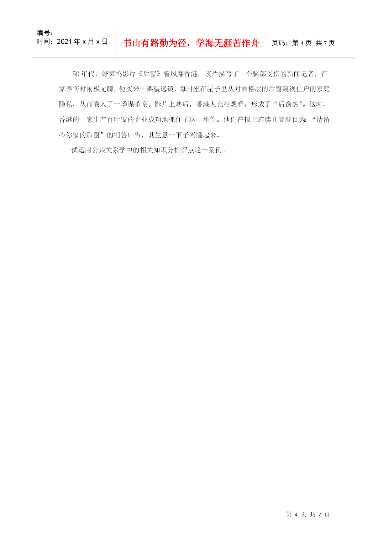编号:时间:2021年x月x日书山有路勤为径,学海无涯苦作舟页码:第PAGE7页共NUMPAGES7页第PAGE\*MERGEFORMAT7页共NUMPAGES\*MERGEFORMAT7页第三章公共关系的构成要素习题一、名词解释1.公关广告2.传播3.社会组织4.公众5.制造新闻二、单项选择题1.新型控制论传播模式的提出者是()。A、拉斯韦尔B、韦弗C、施拉姆D、香农2.公共关系意识的核心是()。A、塑造形象的意识B、沟通交流的意识C、服务公众的意识D、真诚互惠的意识3.与公共关系主体关系最密切的公众关系是()。A、员工关系B、社区关系C、名流关系D、政府关系4.把公众分为临时公众、周期公众和稳定公众的标准是()。A、公众对组织的态度B、公众对组织的价值C、公众对组织的稳定性D、公众对组织的重要性5.人的表情属于哪种符号媒介()。A、有声语言媒介B、无声语言媒介C、有声非语言媒介D、无声非语言媒介6.任何一个组织的生存和发展都必须依赖于()。A、形象B、环境C、传播D、信誉7.有利于解决多数公众的共性问题的传播媒介是()。A、个体传播媒介B、群体传播媒介C、大众传播媒介D、实物传播媒介8.某类企业的一种分散于外部的内部关系是指()。A、员工关系B、顾客关系C、社区关系D、股东关系9.既具有工具性,又具有对象性的公众关系是()。A、员工关系B、媒介关系C、顾客关系D、政府关系10.作为一种无声的号召的激励形式是()。A、奖励激励B、领导行为激励C、情感激励D、反馈激励11.老主顾、常客、社区居民属于()。A、个体公众B、临时公众C、周期公众D、稳定公众12.在公共关系信息传播中,公众传播应属于()类型A、人际传播B、组织传播C、媒介传播D、大众传播13.往往被置于最显著位置,甚至被称之为对外协调的首要公众关系是()。A、媒介关系B、顾客关系C、政府关系D、社区关系14.塑造组织形象的起点是()A、部门公共关系B、内部公共关系C、员工共同的价值观D、组织作风15.传播对于受者的影响程度有()A三种B四种C五种D六种三、多项选择题1.传播的基本要素包括()。A、信道B、媒介C、信息D、反馈E、信源和信宿2.公众的特征包括()。A、整体性B、同质性C、多样性D、多变性E、相关性3.按公众自身变化发展阶段公众可划分为()。A、非公众B、潜在公众C、获知公众D、知晓公众E、行动公众4.公关广告的主题内容有()。A、组织的声誉B、公共服务项目C、经济贡献D、员工关系E、特殊事项5.组织形象定位总是根据哪些要素来实现的()。A、组织的自身特点B、组织的内在素质C、组织的外显事物D、同类组织的情况E、目标公众的情况6.公共关系传播媒介从其物质形式看,可分为()。A、大众传播媒介B、符号媒介C、实物媒介D、人体媒介E、人际传播媒介7.传播的类型分为()。A、自身传播B、公众传播C、人际传播D、组织传播E、大众传播8.建立良好股东关系的方式有()。A、适时向股东通报组织的信息B、收集来自股东的信息C、促进股东关心组织的发展D、定期召开股东大会E、经常性召开股东大会9.根据拉斯韦尔模式,说明传播行为一个简便的方法是:()。A、谁传播B、传播什么C、通过什么渠道D、向谁传播E、传播的效果怎样10.进行公共关系传播需要遵循四个原则,即()A双向沟通B全面沟通C有效沟通D平衡理论E目的明确四、判断题1.内部公关工作的最终目标是引导和控制内部公众的行为()2.只有员工们个别的需求在组织内部得到满足,才能促使他们努力工作()3.相同的礼节习俗常常造成沟通中的误解,以致使沟通受阻()4.物质鼓励能发挥职工工作能力的40%,60%的潜在能力要靠精神奖励来激发()5.银行、军队、新闻机构属非营利组织()6.“顾客总是正确的”这句话不正确()7.公共关系广告就是商业广告。()8.美誉度是指一个组织被公众知晓、了解的程度,即组织对社会公众影响的广度和深度。()9.公共关系部门的对内关系就是处理员工关系()10.人际传播的特点是受者广泛而分散。()五、简答题1.为什么说内部公关是一个社会组织塑造自身良好形象的起点?2.如何理解新闻媒介是传播性质最强的一种关系?3.科学的公众分类的意义表现在哪些方面?4.为什么要建立良好的名流关系?六、实训题为你所在的学校写一份招生的公共关系广告。七、案例分析题“请留心你家的后窗”50年代,好莱坞影片《后窗》曾风靡香港,该片描写了一个脑部受伤的新闻记者,在家养伤时闲极无聊,便买来一架望远镜,每日坐在屋子里从对面楼层的后窗窥视住户的家庭隐私