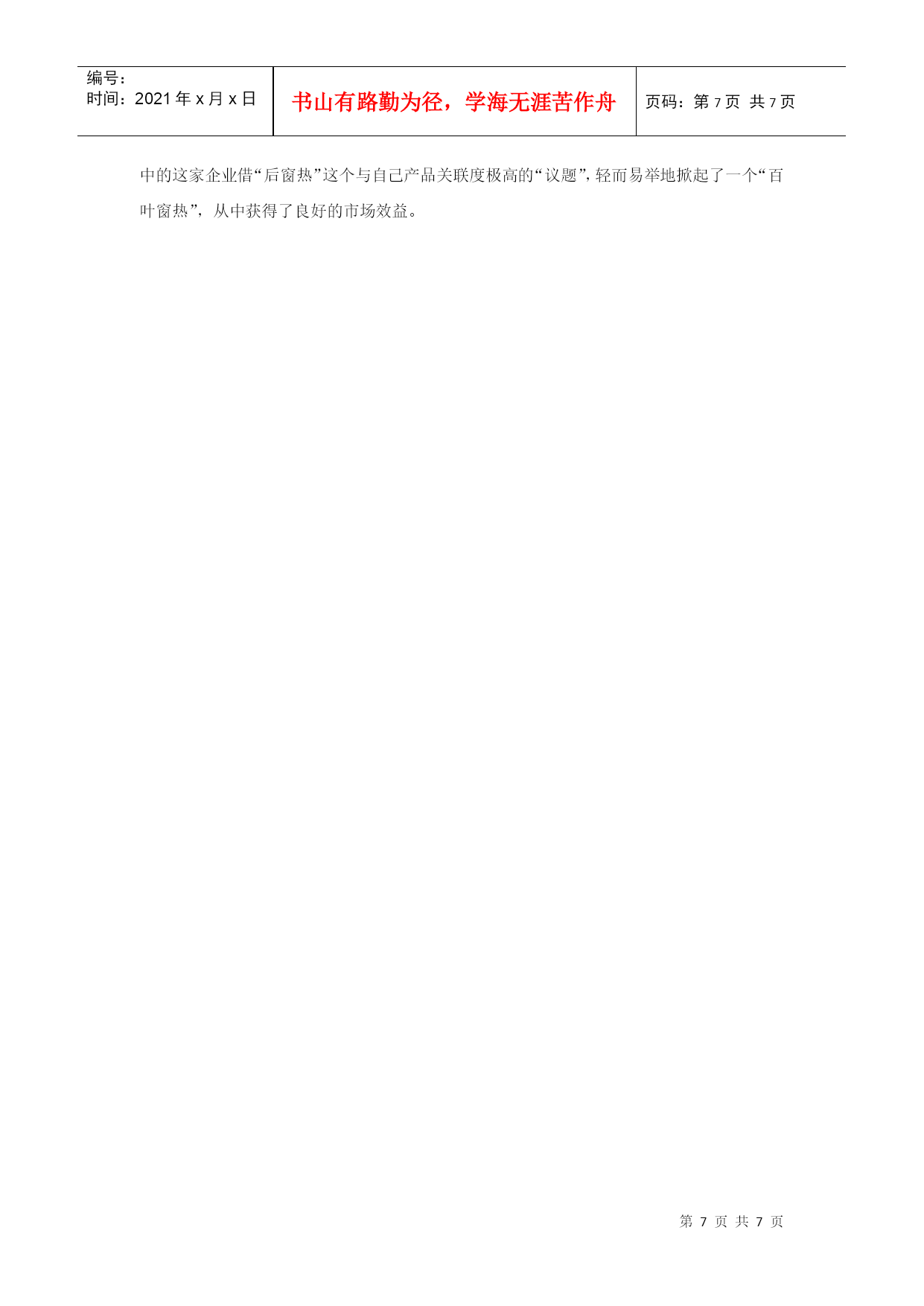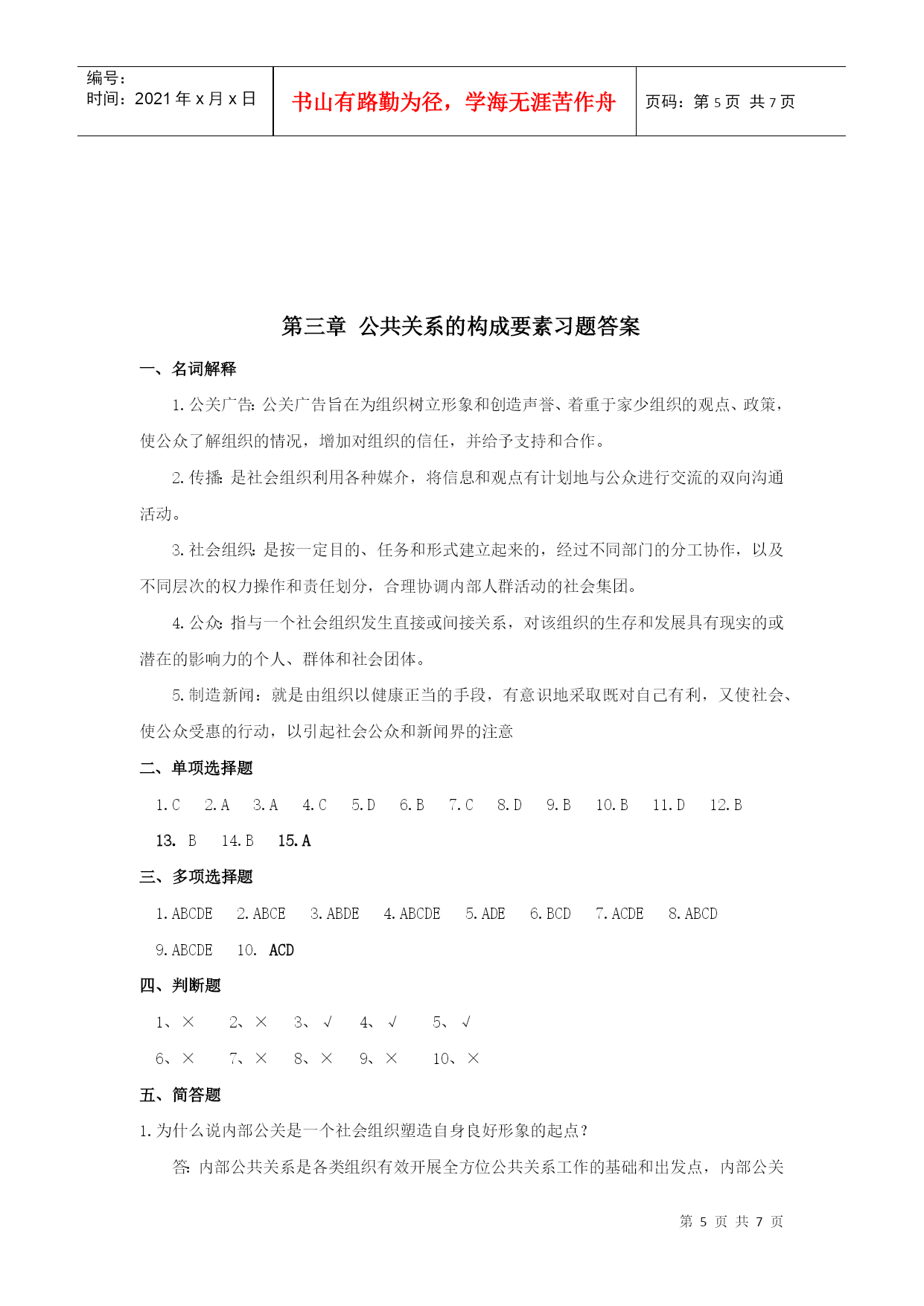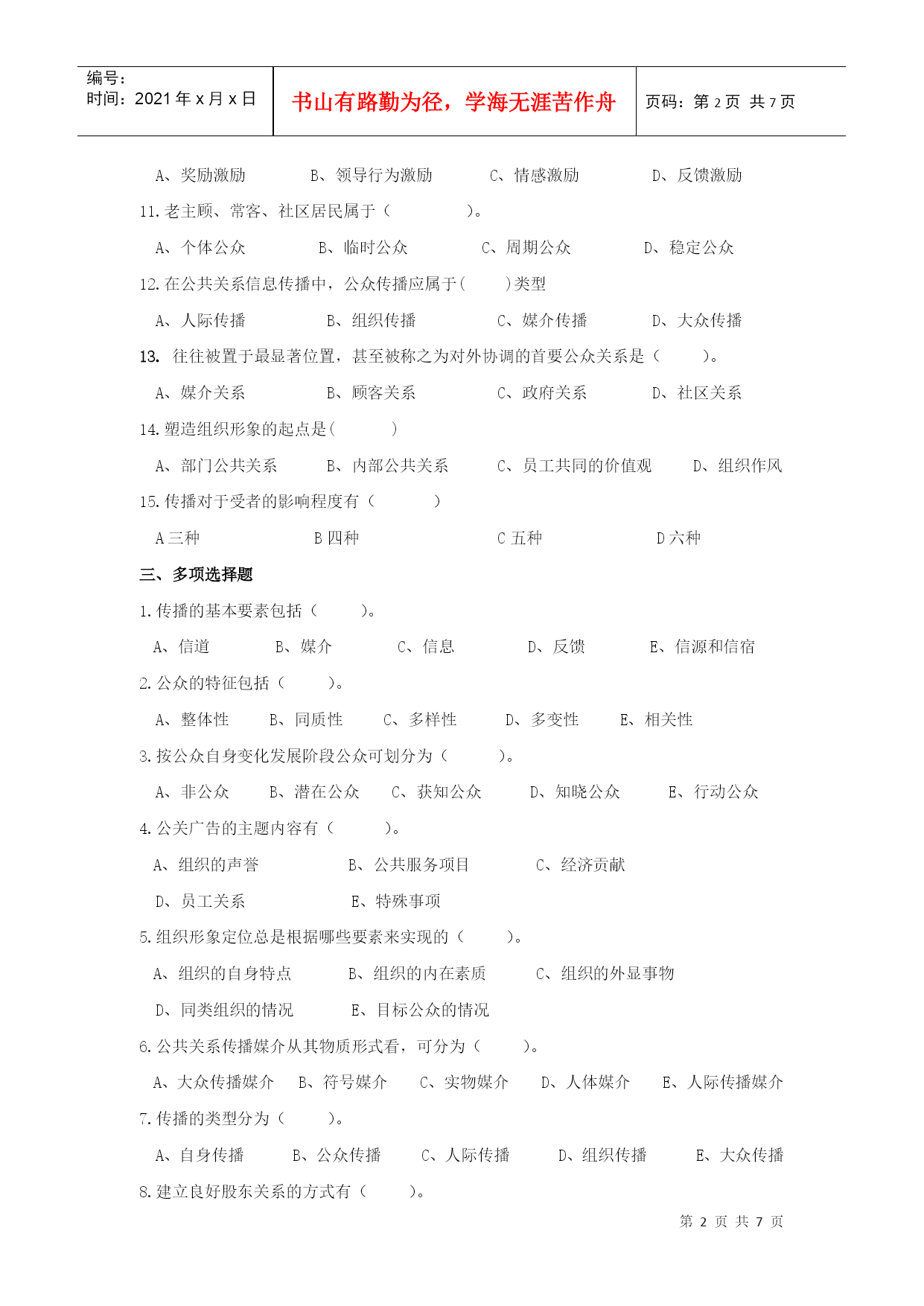 编号:时间:2021年x月x日书山有路勤为径,学海无涯苦作舟页码:第PAGE7页共NUMPAGES7页第PAGE\*MERGEFORMAT7页共NUMPAGES\*MERGEFORMAT7页第三章公共关系的构成要素习题一、名词解释1.公关广告2.传播3.社会组织4.公众5.制造新闻二、单项选择题1.新型控制论传播模式的提出者是()。A、拉斯韦尔B、韦弗C、施拉姆D、香农2.公共关系意识的核心是()。A、塑造形象的意识B、沟通交流的意识C、服务公众的意识D、真诚互惠的意识3.与公共关系主体关系最密切的公众关系是()。A、员工关系B、社区关系C、名流关系D、政府关系4.把公众分为临时公众、周期公众和稳定公众的标准是()。A、公众对组织的态度B、公众对组织的价值C、公众对组织的稳定性D、公众对组织的重要性5.人的表情属于哪种符号媒介()。A、有声语言媒介B、无声语言媒介C、有声非语言媒介D、无声非语言媒介6.任何一个组织的生存和发展都必须依赖于()。A、形象B、环境C、传播D、信誉7.有利于解决多数公众的共性问题的传播媒介是()。A、个体传播媒介B、群体传播媒介C、大众传播媒介D、实物传播媒介8.某类企业的一种分散于外部的内部关系是指()。A、员工关系B、顾客关系C、社区关系D、股东关系9.既具有工具性,又具有对象性的公众关系是()。A、员工关系B、媒介关系C、顾客关系D、政府关系10.作为一种无声的号召的激励形式是()。A、奖励激励B、领导行为激励C、情感激励D、反馈激励11.老主顾、常客、社区居民属于()。A、个体公众B、临时公众C、周期公众D、稳定公众12.在公共关系信息传播中,公众传播应属于()类型A、人际传播B、组织传播C、媒介传播D、大众传播13.往往被置于最显著位置,甚至被称之为对外协调的首要公众关系是()。A、媒介关系B、顾客关系C、政府关系D、社区关系14.塑造组织形象的起点是()A、部门公共关系B、内部公共关系C、员工共同的价值观D、组织作风15.传播对于受者的影响程度有()A三种B四种C五种D六种三、多项选择题1.传播的基本要素包括()。A、信道B、媒介C、信息D、反馈E、信源和信宿2.公众的特征包括()。A、整体性B、同质性C、多样性D、多变性E、相关性3.按公众自身变化发展阶段公众可划分为()。A、非公众B、潜在公众C、获知公众D、知晓公众E、行动公众4.公关广告的主题内容有()。A、组织的声誉B、公共服务项目C、经济贡献D、员工关系E、特殊事项5.组织形象定位总是根据哪些要素来实现的()。A、组织的自身特点B、组织的内在素质C、组织的外显事物D、同类组织的情况E、目标公众的情况6.公共关系传播媒介从其物质形式看,可分为()。A、大众传播媒介B、符号媒介C、实物媒介D、人体媒介E、人际传播媒介7.传播的类型分为()。A、自身传播B、公众传播C、人际传播D、组织传播E、大众传播8.建立良好股东关系的方式有()。A、适时向股东通报组织的信息B、收集来自股东的信息C、促进股东关心组织的发展D、定期召开股东大会E、经常性召开股东大会9.根据拉斯韦尔模式,说明传播行为一个简便的方法是:()。A、谁传播B、传播什么C、通过什么渠道D、向谁传播E、传播的效果怎样10.进行公共关系传播需要遵循四个原则,即()A双向沟通B全面沟通C有效沟通D平衡理论E目的明确四、判断题1.内部公关工作的最终目标是引导和控制内部公众的行为()2.只有员工们个别的需求在组织内部得到满足,才能促使他们努力工作()3.相同的礼节习俗常常造成沟通中的误解,以致使沟通受阻()4.物质鼓励能发挥职工工作能力的40%,60%的潜在能力要靠精神奖励来激发()5.银行、军队、新闻机构属非营利组织()6.“顾客总是正确的”这句话不正确()7.公共关系广告就是商业广告。()8.美誉度是指一个组织被公众知晓、了解的程度,即组织对社会公众影响的广度和深度。()9.公共关系部门的对内关系就是处理员工关系()10.人际传播的特点是受者广泛而分散。()五、简答题1.为什么说内部公关是一个社会组织塑造自身良好形象的起点?2.如何理解新闻媒介是传播性质最强的一种关系?3.科学的公众分类的意义表现在哪些方面?4.为什么要建立良好的名流关系?六、实训题为你所在的学校写一份招生的公共关系广告。七、案例分析题“请留心你家的后窗”50年代,好莱坞影片《后窗》曾风靡香港,该片描写了一个脑部受伤的新闻记者,在家养伤时闲极无聊,便买来一架望远镜,每日坐在屋子里从对面楼层的后窗窥视住户的家庭隐私