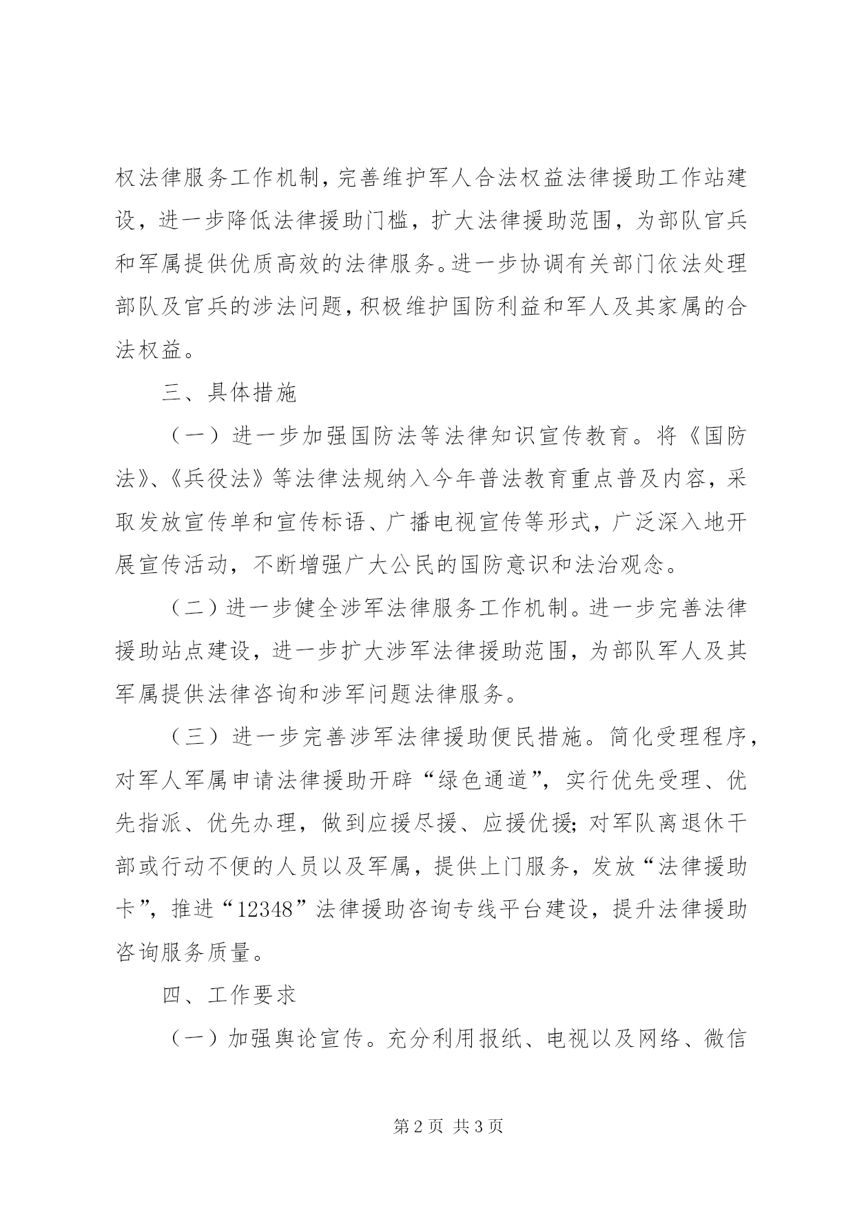 第PAGE\*Arabic\*MERGEFORMAT3页共NUMPAGES\*MERGEFORMAT3页司法局XX年双拥工作要点计划小编寄语。下面是我们文秘网的小编为大家整理的司法局2017年双拥工作要点计划,请大家参阅。为切实做好创建省级双拥模范城工作,将双拥工作做到实处,结合我局实际,特制定工作要点如下。一、指导思想以党的十八大、十八届五中、六中全会精神为指导,深入贯彻习近平总书记系列重要讲话精神,着眼于加强军政军民团结、推进军民融合深度发展,着眼于巩固发展同呼吸、同命运、心连心的新型军政军民关系,把拥军优属与拥政爱民结合起来,全面落实双拥政策,深入开展双拥创建、军民共建活动,不断开创我区双拥工作新局面,为推动我区经济社会又好又快发展和军队现代化建设提供坚强有力的保障。二、工作任务(一)加强国防教育和支持部队法治建设。加大涉军法律法规宣传教育力度,把《国防法》、《兵役法》等有关双拥工作的法律法规,列入全民普法内容,有计划、有步骤地组织开展系列法治宣传教育活动,在全区营造浓厚的双拥工作法治氛围。关心支持驻**部队的法治建设,安排律师、法律服务志愿者进军营开展法治宣讲活动,解疑释难,化解纠纷,巩固军政军民鱼水关系。(二)维护国防利益和军人军属合法权益。健全完善涉军维权法律服务工作机制,完善维护军人合法权益法律援助工作站建设,进一步降低法律援助门槛,扩大法律援助范围,为部队官兵和军属提供优质高效的法律服务。进一步协调有关部门依法处理部队及官兵的涉法问题,积极维护国防利益和军人及其家属的合法权益。三、具体措施(一)进一步加强国防法等法律知识宣传教育。将《国防法》、《兵役法》等法律法规纳入今年普法教育重点普及内容,采取发放宣传单和宣传标语、广播电视宣传等形式,广泛深入地开展宣传活动,不断增强广大公民的国防意识和法治观念。(二)进一步健全涉军法律服务工作机制。进一步完善法律援助站点建设,进一步扩大涉军法律援助范围,为部队军人及其军属提供法律咨询和涉军问题法律服务。(三)进一步完善涉军法律援助便民措施。简化受理程序,对军人军属申请法律援助开辟“绿色通道”,实行优先受理、优先指派、优先办理,做到应援尽援、应援优援;对军队离退休干部或行动不便的人员以及军属,提供上门服务,发放“法律援助卡”,推进“12348”法律援助咨询专线平台建设,提升法律援助咨询服务质量。四、工作要求(一)加强舆论宣传。充分利用报纸、电视以及网络、微信等各种媒体,加强法律拥军工作的宣传,营造浓厚拥军氛围。(二)注重统筹协调。把双拥工作与司法行政业务中心工作结合起来,做到统筹推进,科学安排,使双拥成效最终体现到推进各项工作上来。(三)建立工作台账。不断创新活动形式,做好资料整理,并报送局双拥办。