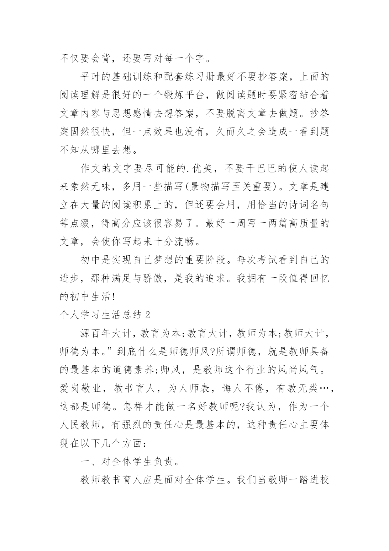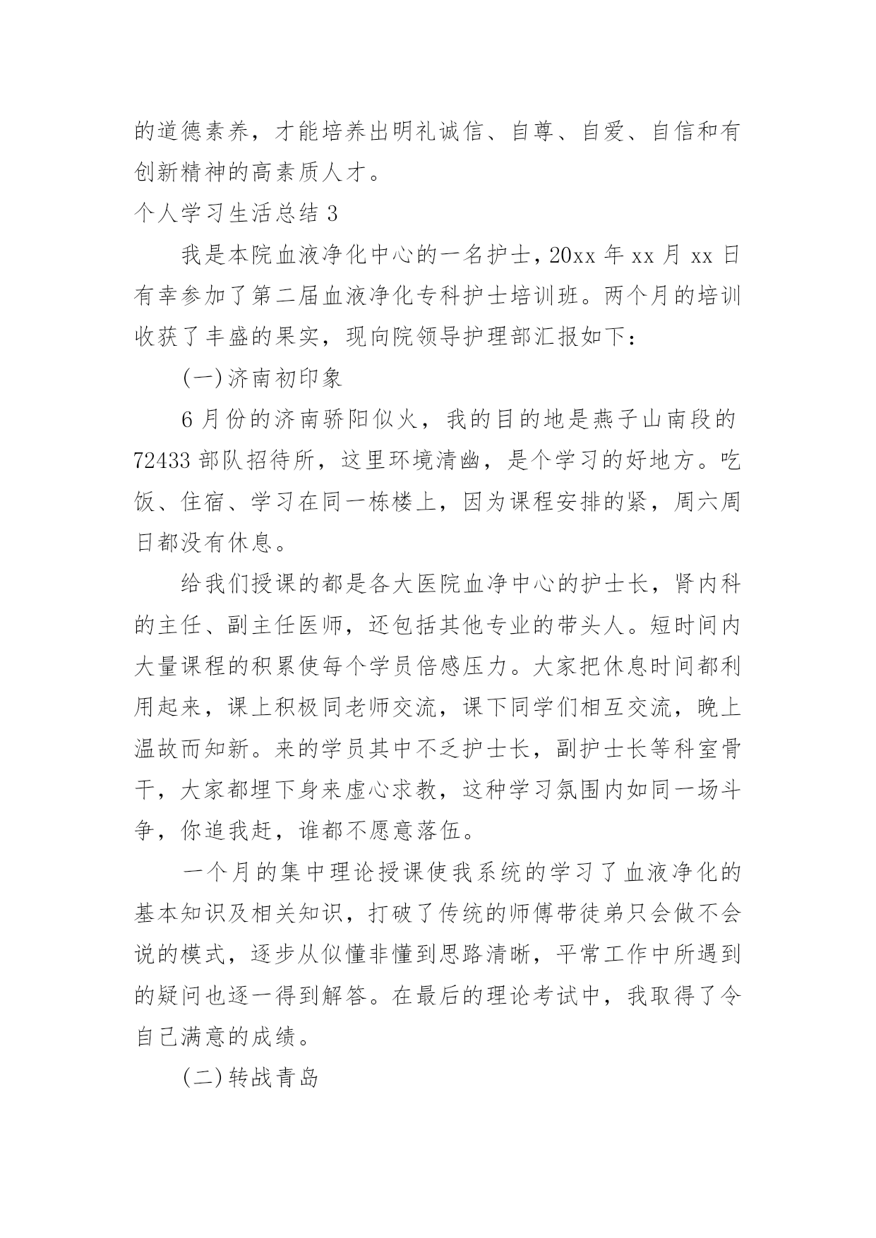 个人学习生活总结个人学习生活总结总结就是对一个时期的学习、工作或其完成情况进行一次全面系统的回顾和分析的书面材料,写总结有利于我们学习和工作能力的提高,不如静下心来好好写写总结吧。我们该怎么写总结呢?以下是小编为大家整理的个人学习生活总结,希望能够帮助到大家。个人学习生活总结1我认为我的初中生活是值得我铭记的,每一天的欢笑与泪水,每一次的成功与失败,许许多多珍贵的回忆,使我清晰的感受到感受到自己的成长。于是我便想把自己初中的学习经验教训一点一点写下来,就算是留下一份纪念。初中的语文成绩好的同学来说,是你与别人拉开差距的最重要学科,因为语文上相差十分、二十分很容易。学习语文并不是很难,我认为重在积累与训练。语文重在积累,努力学语文一个月,语文成绩不一定进步,你一个月不学语文,你的语文成绩也不一定会退步,但长此以往差距就会显现。对于课本上的现代汉字的字形、字音;标点符号的正确用法;词语、成语、熟语的正确使用;文言文相关知识(文言虚词、实词、文言文翻译等等)都应该牢牢掌握。在试卷上的第一个题一般就是字音字形题,若丢分岂不太可惜?诗词不仅要会背,还要写对每一个字。平时的基础训练和配套练习册最好不要抄答案,上面的阅读理解是很好的一个锻炼平台,做阅读题时要紧密结合着文章内容与思想感情去想答案,不要脱离文章去做题。抄答案固然很快,但一点效果也没有,久而久之会造成一看到题不知从哪里去想。作文的文字要尽可能的.优美,不要干巴巴的使人读起来索然无味,多用一些描写(景物描写至关重要)。文章是建立在大量的阅读积累上的,但还要会用,用恰当的诗词名句等点缀,得高分应该很容易了。最好一周写一两篇高质量的文章,会使你写起来十分流畅。初中是实现自己梦想的重要阶段。每次考试看到自己的进步,那种满足与骄傲,是我的追求。我拥有一段值得回忆的初中生活!个人学习生活总结2源百年大计,教育为本;教育大计,教师为本;教师大计,师德为本。”到底什么是师德师风?所谓师德,就是教师具备的最基本的道德素养;师风,是教师这个行业的风尚风气。爱岗敬业,教书育人,为人师表,诲人不倦,有教无类…,这都是师德。怎样才能做一名好教师呢?我认为,作为一个人民教师,有强烈的责任心是最基本的,这种责任心主要体现在以下几个方面:一、对全体学生负责。教师教书育人应是面对全体学生。我们当教师一踏进校门的那一天起,便对每一位学生负起责任,必须关爱学生,尊重学生人格,促进他们在品德、智力、体质各方面都得到发展。二、对学生未来负责。对于教育是一个长期发展过程,同时又是环环相扣的过程。一个环节出现缺陷会给其他环节构成困难,从而影响学生的正常成长。我们教师应该立足现今,着眼未来,以苦为乐,甘于寂寞,勤勤恳恳,充当人梯,负起我们这个光荣而艰巨的任务。为后代着想,为家长负责,为学生负责,为我们祖国千秋大业负责。三、对学生所授的知识负责。教师所传授,对学生来说都是新知识,对知识的第一印象会给学生留下根深蒂固的影响。教师的教授内容必须准确科学。教书育人是一项职责重大的严肃工作,来不得半点虚假,敷衍和马虎。不允许含有不清和错误的概念出现。要保证学生掌握真正知识,作为教师不能用照本宣科,满堂灌等方法来教学学生。这样,就要求教师自身应当有渊博的知识,通达的学识,应当能够对科学知识的严密系统有通透的理解,如此才能在教学过程中做到钩深致远,游刃有余,知识才能被学生所接受理解,内化为学生的'知识结构,并转化为学生解决问题的能力,才能完成了知识传授的过程。教师作为一种职业,在人类社会发展中起着桥梁和纽带作用,承担着人的思想文化传播,新生一代的培养,各种社会所需要的人才的造就等艰巨任务。我们只有不断提高自身的道德素养,才能培养出明礼诚信、自尊、自爱、自信和有创新精神的高素质人才。个人学习生活总结3我是本院血液净化中心的一名护士,20xx年xx月xx日有幸参加了第二届血液净化专科护士培训班。两个月的培训收获了丰盛的果实,现向院领导护理部汇报如下:(一)济南初印象6月份的济南骄阳似火,我的目的地是燕子山南段的72433部队招待所,这里环境清幽,是个学习的好地方。吃饭、住宿、学习在同一栋楼上,因为课程安排的紧,周六周日都没有休息。给我们授课的都是各大医院血净中心的护士长,肾内科的主任、副主任医师,还包括其他专业的带头人。短时间内大量课程的积累使每个学员倍感压力。大家把休息时间都利用起来,课上积极同老师交流,课下同学们相互交流,晚上温故而知新。来的学员其中不乏护士长,副护士长等科室骨干,大家都埋下身来虚心求教,这种学习氛围内如同一场斗争,你追我赶,谁都不愿意落伍。一个月的集中理论授课使我系统的学习了血液净化的基本知识及相关知识,打破了传统的师傅带徒弟只会做不会说的模式,逐步从似懂非懂到思路清晰,平常工作中所遇到的疑问也逐一得到解答。在最后的理