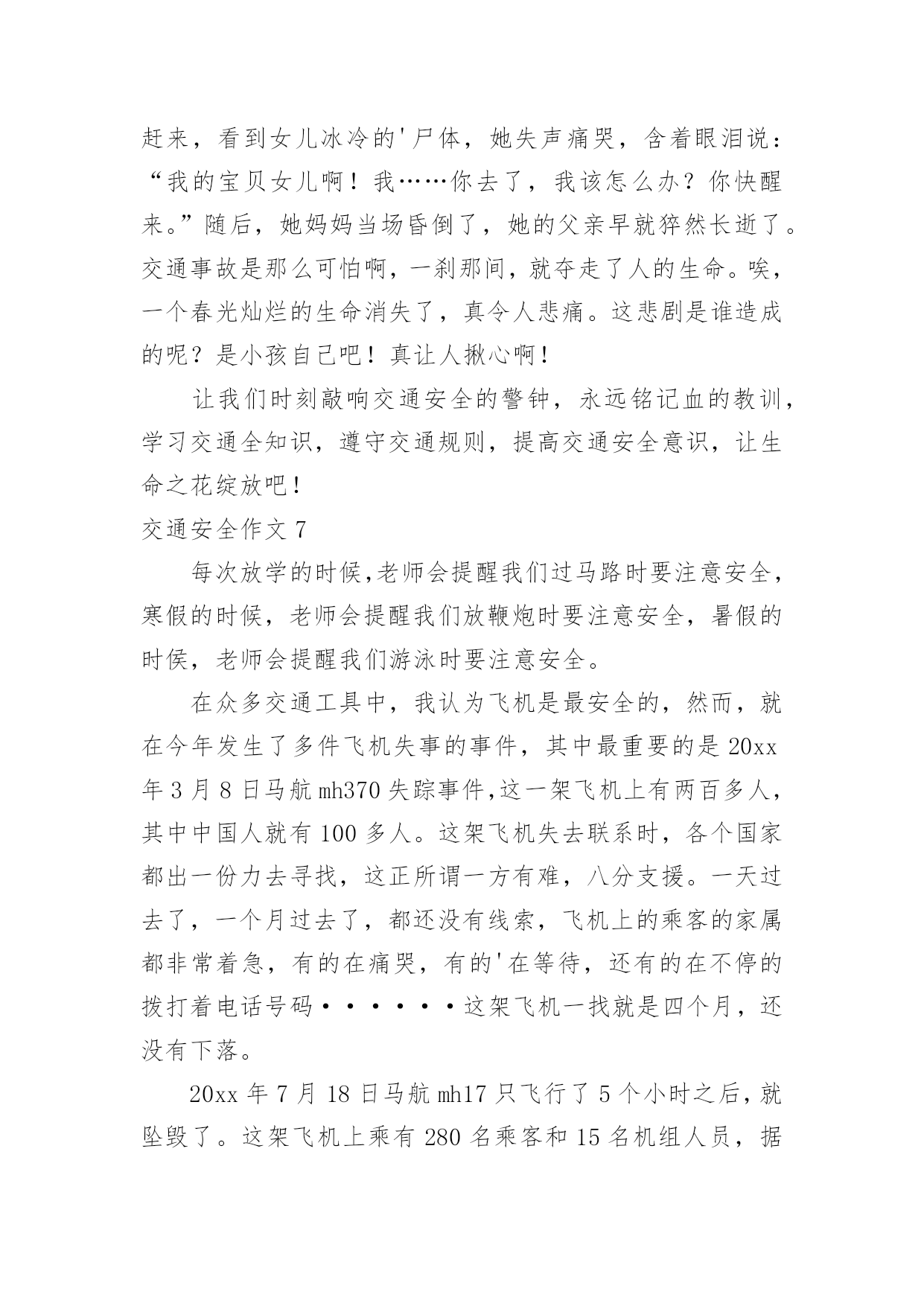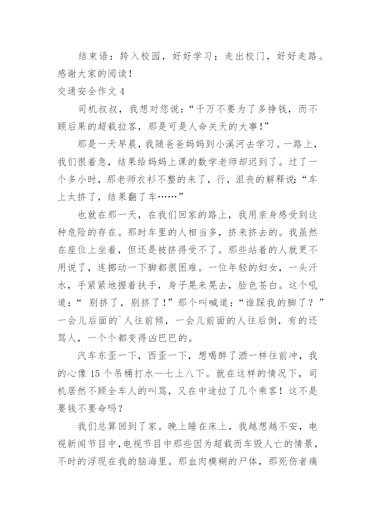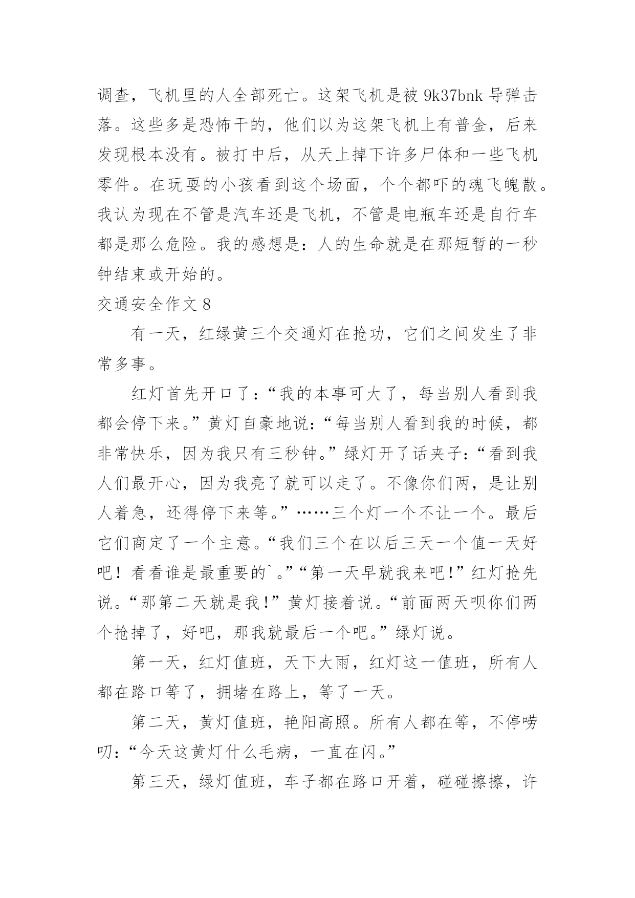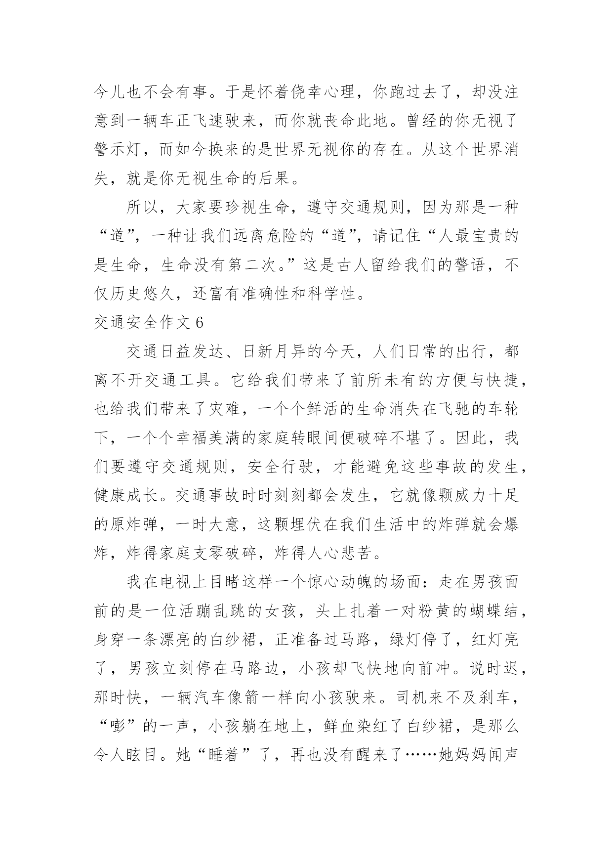 交通安全作文(实用)交通安全作文在平凡的学习、工作、生活中,大家一定都接触过作文吧,借助作文人们可以实现文化交流的目的。那么,怎么去写作文呢?以下是小编精心整理的交通安全作文,欢迎大家借鉴与参考,希望对大家有所帮助。交通安全作文1一些交通的事故,都是由于人们不遵守交通安全可造成的,下面这篇文章有一个非常典型的例子,虽然这是一件小小的交通事故,但也会小事化成大事的!每到节日的晚上,街道上可热闹!人来人往,还有来往的小轿车如织如梭,千盏万盏车灯汇成一条急驰的光河o在这一个场面上,我也在和妈妈、爸爸在山坡上散步,这时我的眼睛被车头灯射得不停地眨眼,像星星一样闪闪的o我们走过几个山坡,往下看,发现一辆吉普车的机器突然发出“吱吱”的怪声,像个哮喘的病人在喘气儿o我在想:这辆吉普车的机器已经很“老”了,得要换新的机器o突然,吉普车走着走着急忙停下来了,我走去前面一看,惊讶起来,原来是前面窜出了一条狗,司机急忙刹车,车外剧烈摇晃着o车轮与柏油路面剧烈摩擦,发出了一阵刺耳的、像困在大笼子上的野兽在尖叫着o但原来如此,吉普车还是没撞上那条狗,但是,吉普车的机器已经全坏掉了o那条狗跑得飞快的.走了o我想,如果那条狗换成一个人就可怕了o在山坡上看见的事,使我明白:我们以后要遵守交通规则,过马路要小心,司机们要知道如果两车相遇时,晚上开的车灯要大灯换成小灯,过路的人和车看清路面,减少事故的发生,在社会上做个文明的人o交通安全作文2”车祸“一个熟悉而又陌生的词语。每天的新闻报道中几乎都有它的存在,老师和学校也经常教育我们,要遵守交通规则,安全第一……但我总觉得车祸离我们很远,总是在电视中看到,甚至还觉得遥不可及……但就在星期三的上午,我们学校门口发生了一起触目惊心的交通事故。在十字路口的红绿灯旁,一辆大卡车撞死了一个人……大家都觉得好不可思议,车祸居然就发生在我们眼前……中午回到家,听妈妈谈论起这场车祸,”好端端的一条生命啊,就这样没了,可惜啊……“往常充满了欢声笑语的.餐桌在此时显得很沉重。我不禁鼻子一酸,那他的家人呢?会有多伤心、悲痛啊?生命是无价的,每个人只有一次啊!他怎么那么不爱惜自己的生命啊?只为了贪一时的方便,就闯红灯,不遵守交通规则,还赔上了自己的生命。这样值得吗?交通规则,人人遵守。这句话所有的人都要铭记在心!一刻也不能忘!珍惜自己的生命,安全第一!每天上下学,我都会看见十字路口上那一滩红色的血,那一个醒目的红色警告。它时刻提醒着我,提醒着当时所有的人,生命是多么可贵,遵守交通规则多么重要!交通安全作文3宽阔的马路,先进的道路安全设施,一直在更新的交通法规,难道真能对交通安全起到持久稳固的作用吗?如果是,那为何交通事故还是年年不断的频繁发生?可见交通安全保障并没有达到真正的效果。而这究竟又是谁的错呢?这是人们的错。国家给了我们交通安全的保障,可是我们往往却只顾自己的方便,只顾自己的利益,并未能好好的遵守交通法规。大家想过如此的`后果会是怎样的吗?看!那辆超载的大卡车正吃力的前进着,司机见了红灯也不停车,随意乱闯,只是为了赶交差,得一笔工钱,不顾违章的后果。可这位司机知道吗?只是为了这么一笔工钱违反交规,一刹那间就很有可能会葬送生命,而这无价的生命又岂是金钱可以买到的?看!那场悲剧终究还是上演了,鲜血染红了车轮,受害者的亲人悲痛万分……啊!又是一场悲剧!人行道上,一辆摩托车疾速行驶,将一位老奶奶撞倒在地,老奶奶立马气绝身亡。我不明白,摩托车司机为什么不按道行驶而偏偏要闯入非机动车道呢?只是图方便、图省事,却致使又一个宝贵的生命离开了这个世界。而这又会使多少人为受害者伤心泪流,使家庭因之而破碎啊!在交通安全的维护上,我们每个人都有责任和义务。生命可贵却脆弱,希望人人都能自觉遵守交通规则,让我们生活的环境更安全更美好。结束语:跨入校园,好好学习;走出校门,好好走路。感谢大家的阅读!交通安全作文4司机叔叔,我想对您说:“千万不要为了多挣钱,而不顾后果的超载拉客,那是可是人命关天的大事!”那是一天早晨,我随爸爸妈妈到小溪河去学习。一路上,我们很着急,结果给妈妈上课的数学老师却迟到了。过了一个多小时,那老师衣衫不整的来了,行,沮丧的解释说:“车上太挤了,结果翻了车……”也就在那一天,在我们回家的路上,我用亲身感受到这种危险的存在。那时车里的人相当多,挤来挤去的。我虽然在座位上坐着,但还是被挤得受不了。那些站着的人就更不用说了,连挪动一下脚都很困难。一位年轻的妇女,一头汗水,手紧紧地握着扶手,身子晃来晃去,脸色苍白。这个吼道:“别挤了,别挤了!”那个叫喊道:“谁踩我的脚了?”一会儿后面的`人往前倾,一会儿前面的人往后倒,有的还骂人,一个个都变得凶巴巴的。汽车东歪一下,西歪一下,想喝醉了酒一样往前冲,我的心像15个吊桶打水—七上八下。就在这样的情况