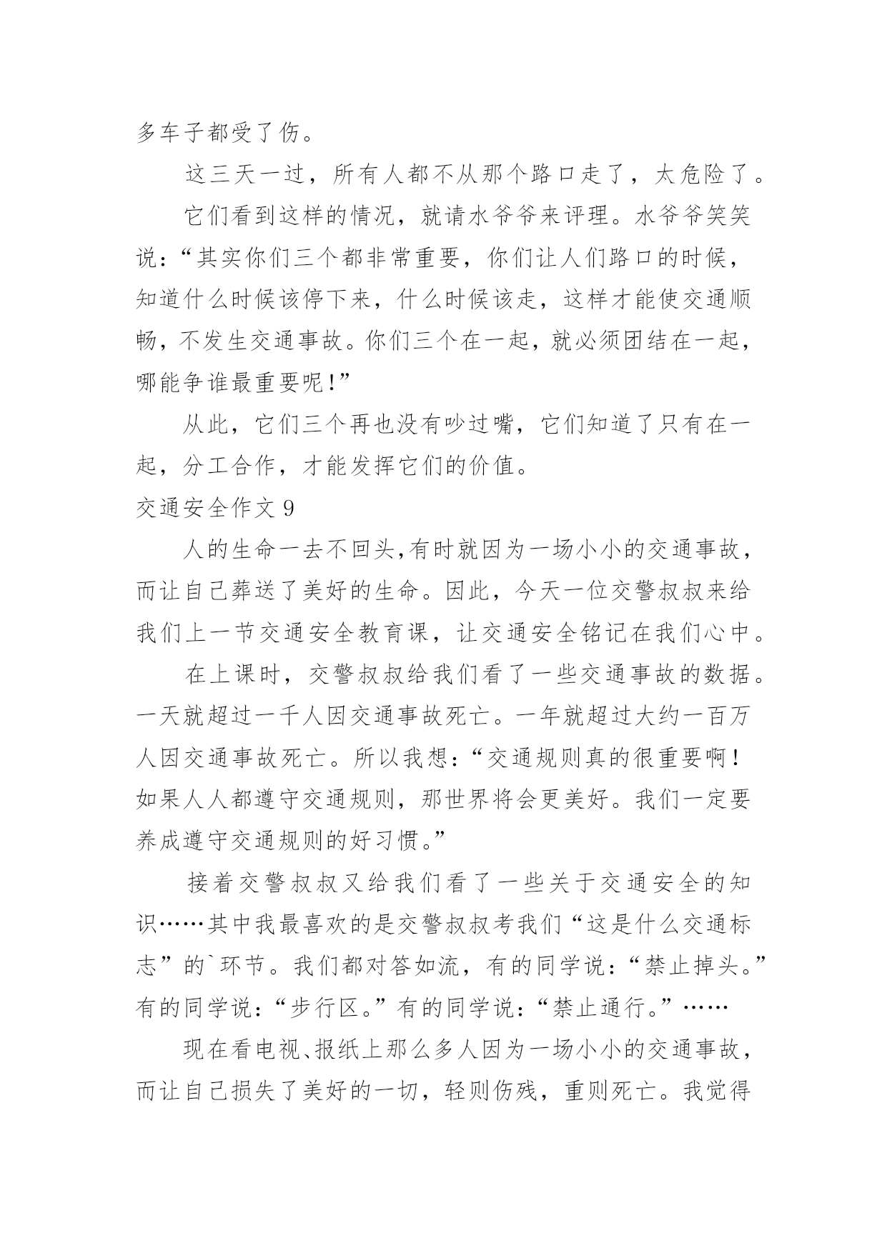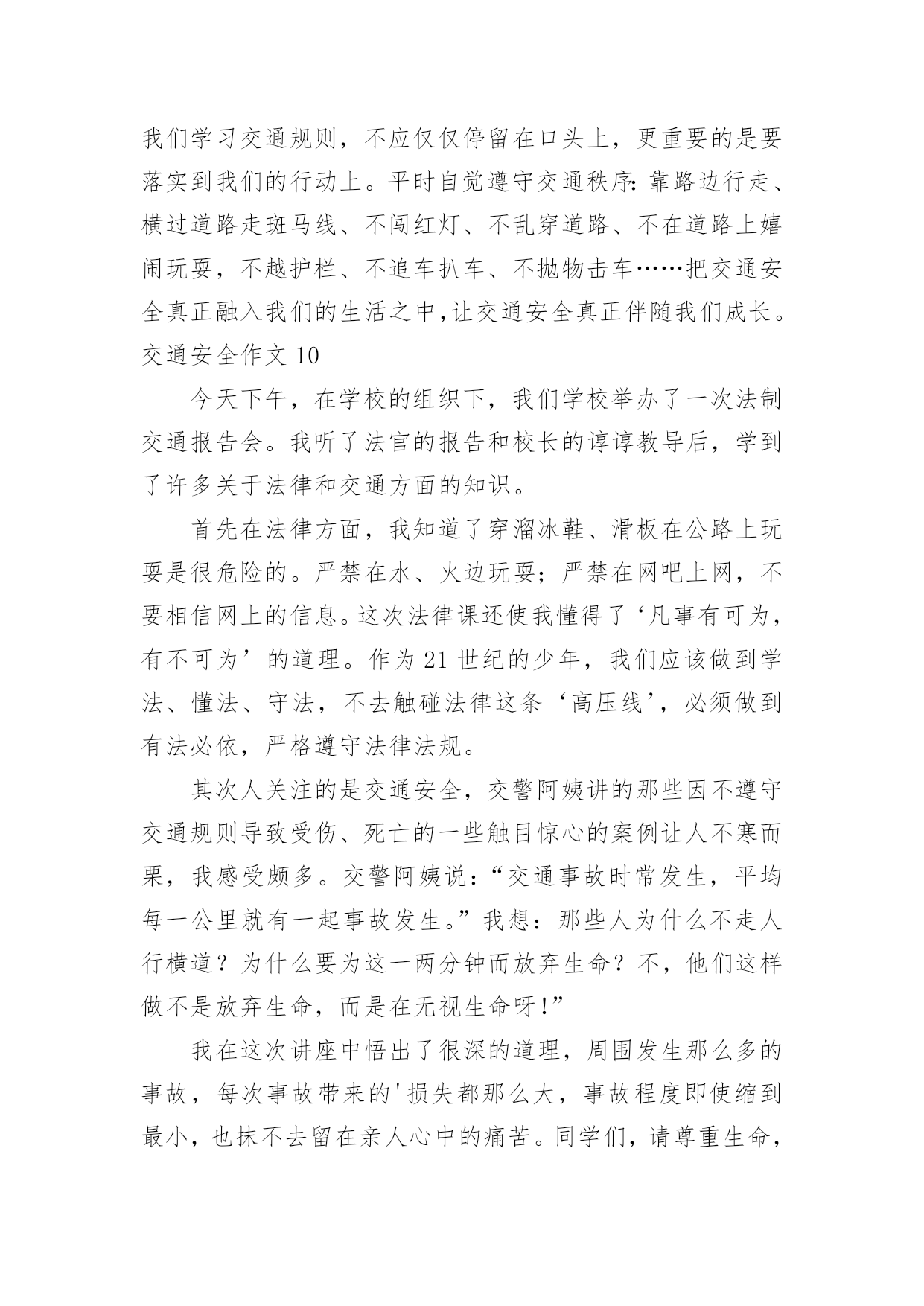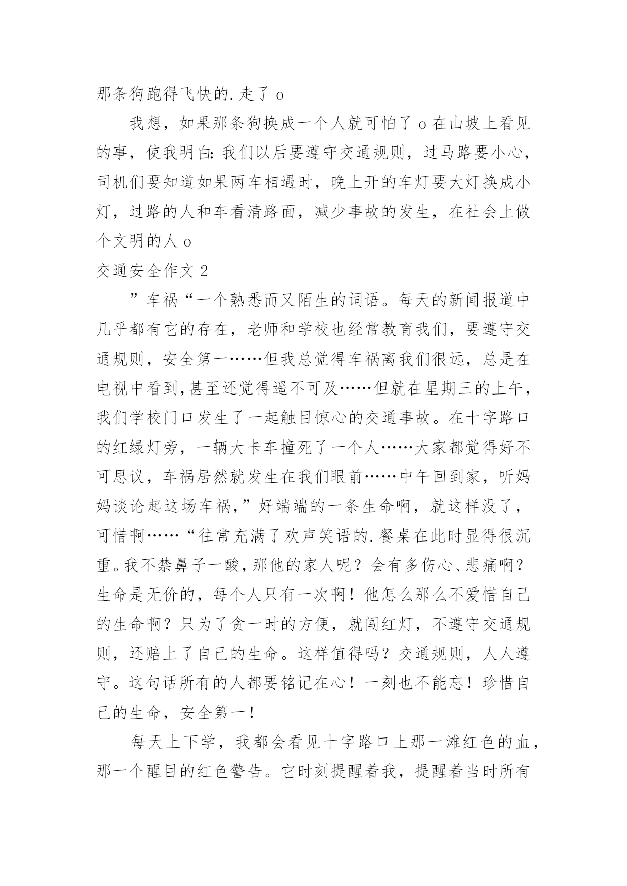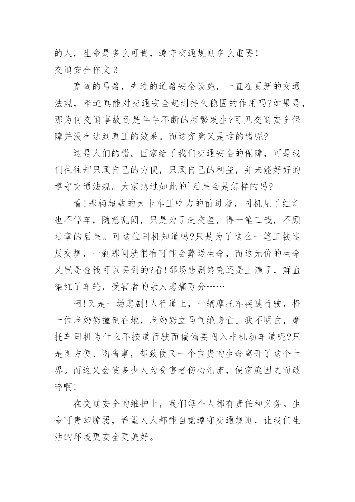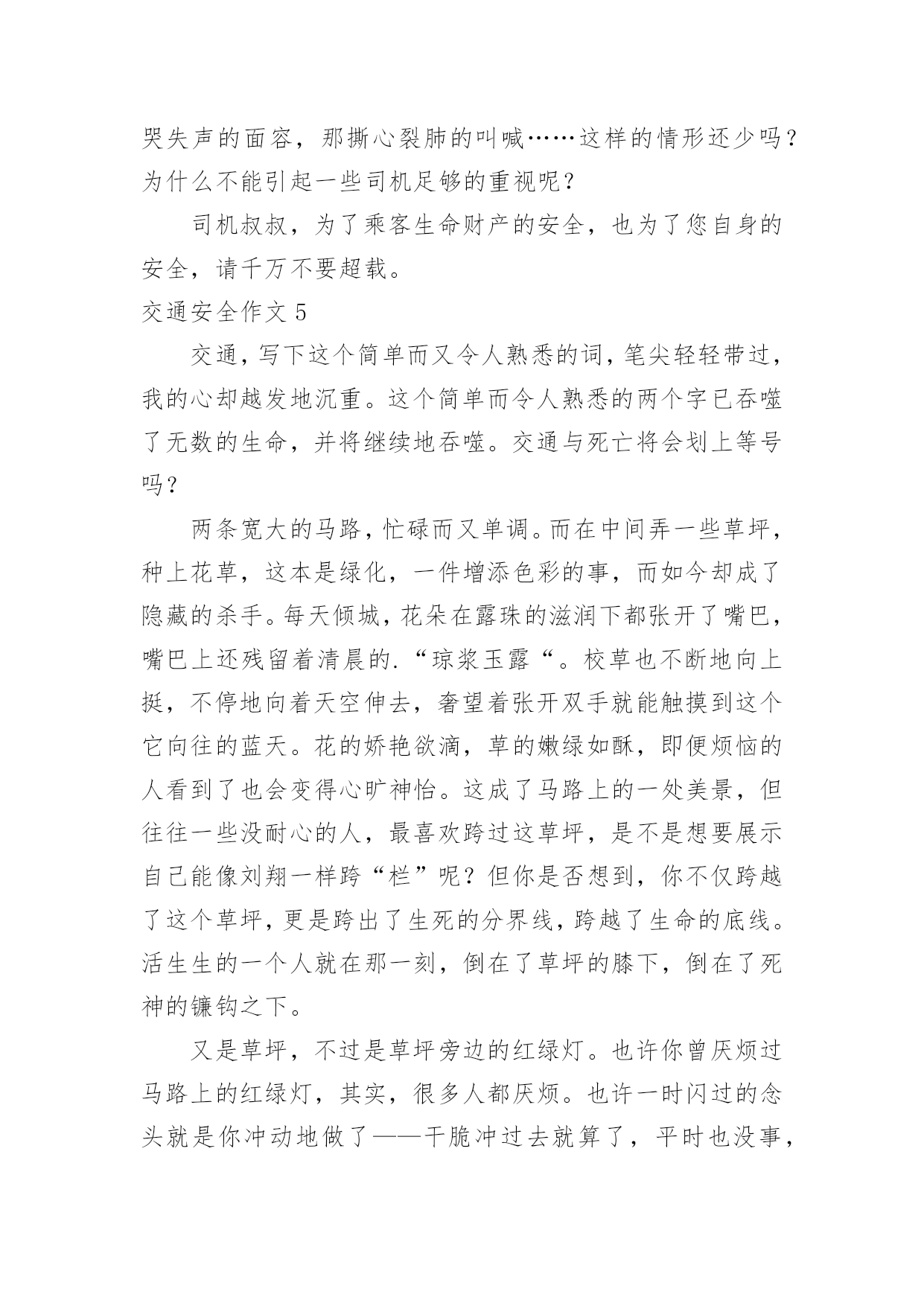 交通安全作文(实用)交通安全作文在平凡的学习、工作、生活中,大家一定都接触过作文吧,借助作文人们可以实现文化交流的目的。那么,怎么去写作文呢?以下是小编精心整理的交通安全作文,欢迎大家借鉴与参考,希望对大家有所帮助。交通安全作文1一些交通的事故,都是由于人们不遵守交通安全可造成的,下面这篇文章有一个非常典型的例子,虽然这是一件小小的交通事故,但也会小事化成大事的!每到节日的晚上,街道上可热闹!人来人往,还有来往的小轿车如织如梭,千盏万盏车灯汇成一条急驰的光河o在这一个场面上,我也在和妈妈、爸爸在山坡上散步,这时我的眼睛被车头灯射得不停地眨眼,像星星一样闪闪的o我们走过几个山坡,往下看,发现一辆吉普车的机器突然发出“吱吱”的怪声,像个哮喘的病人在喘气儿o我在想:这辆吉普车的机器已经很“老”了,得要换新的机器o突然,吉普车走着走着急忙停下来了,我走去前面一看,惊讶起来,原来是前面窜出了一条狗,司机急忙刹车,车外剧烈摇晃着o车轮与柏油路面剧烈摩擦,发出了一阵刺耳的、像困在大笼子上的野兽在尖叫着o但原来如此,吉普车还是没撞上那条狗,但是,吉普车的机器已经全坏掉了o那条狗跑得飞快的.走了o我想,如果那条狗换成一个人就可怕了o在山坡上看见的事,使我明白:我们以后要遵守交通规则,过马路要小心,司机们要知道如果两车相遇时,晚上开的车灯要大灯换成小灯,过路的人和车看清路面,减少事故的发生,在社会上做个文明的人o交通安全作文2”车祸“一个熟悉而又陌生的词语。每天的新闻报道中几乎都有它的存在,老师和学校也经常教育我们,要遵守交通规则,安全第一……但我总觉得车祸离我们很远,总是在电视中看到,甚至还觉得遥不可及……但就在星期三的上午,我们学校门口发生了一起触目惊心的交通事故。在十字路口的红绿灯旁,一辆大卡车撞死了一个人……大家都觉得好不可思议,车祸居然就发生在我们眼前……中午回到家,听妈妈谈论起这场车祸,”好端端的一条生命啊,就这样没了,可惜啊……“往常充满了欢声笑语的.餐桌在此时显得很沉重。我不禁鼻子一酸,那他的家人呢?会有多伤心、悲痛啊?生命是无价的,每个人只有一次啊!他怎么那么不爱惜自己的生命啊?只为了贪一时的方便,就闯红灯,不遵守交通规则,还赔上了自己的生命。这样值得吗?交通规则,人人遵守。这句话所有的人都要铭记在心!一刻也不能忘!珍惜自己的生命,安全第一!每天上下学,我都会看见十字路口上那一滩红色的血,那一个醒目的红色警告。它时刻提醒着我,提醒着当时所有的人,生命是多么可贵,遵守交通规则多么重要!交通安全作文3宽阔的马路,先进的道路安全设施,一直在更新的交通法规,难道真能对交通安全起到持久稳固的作用吗?如果是,那为何交通事故还是年年不断的频繁发生?可见交通安全保障并没有达到真正的效果。而这究竟又是谁的错呢?这是人们的错。国家给了我们交通安全的保障,可是我们往往却只顾自己的方便,只顾自己的利益,并未能好好的遵守交通法规。大家想过如此的`后果会是怎样的吗?看!那辆超载的大卡车正吃力的前进着,司机见了红灯也不停车,随意乱闯,只是为了赶交差,得一笔工钱,不顾违章的后果。可这位司机知道吗?只是为了这么一笔工钱违反交规,一刹那间就很有可能会葬送生命,而这无价的生命又岂是金钱可以买到的?看!那场悲剧终究还是上演了,鲜血染红了车轮,受害者的亲人悲痛万分……啊!又是一场悲剧!人行道上,一辆摩托车疾速行驶,将一位老奶奶撞倒在地,老奶奶立马气绝身亡。我不明白,摩托车司机为什么不按道行驶而偏偏要闯入非机动车道呢?只是图方便、图省事,却致使又一个宝贵的生命离开了这个世界。而这又会使多少人为受害者伤心泪流,使家庭因之而破碎啊!在交通安全的维护上,我们每个人都有责任和义务。生命可贵却脆弱,希望人人都能自觉遵守交通规则,让我们生活的环境更安全更美好。结束语:跨入校园,好好学习;走出校门,好好走路。感谢大家的阅读!交通安全作文4司机叔叔,我想对您说:“千万不要为了多挣钱,而不顾后果的超载拉客,那是可是人命关天的大事!”那是一天早晨,我随爸爸妈妈到小溪河去学习。一路上,我们很着急,结果给妈妈上课的数学老师却迟到了。过了一个多小时,那老师衣衫不整的来了,行,沮丧的解释说:“车上太挤了,结果翻了车……”也就在那一天,在我们回家的路上,我用亲身感受到这种危险的存在。那时车里的人相当多,挤来挤去的。我虽然在座位上坐着,但还是被挤得受不了。那些站着的人就更不用说了,连挪动一下脚都很困难。一位年轻的妇女,一头汗水,手紧紧地握着扶手,身子晃来晃去,脸色苍白。这个吼道:“别挤了,别挤了!”那个叫喊道:“谁踩我的脚了?”一会儿后面的`人往前倾,一会儿前面的人往后倒,有的还骂人,一个个都变得凶巴巴的。汽车东歪一下,西歪一下,想喝醉了酒一样往前冲,我的心像15个吊桶打水—七上八下。就在这样的情况