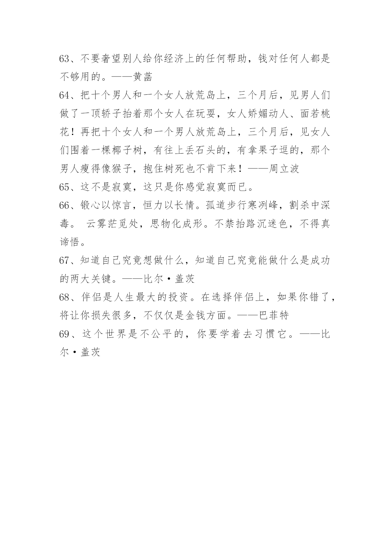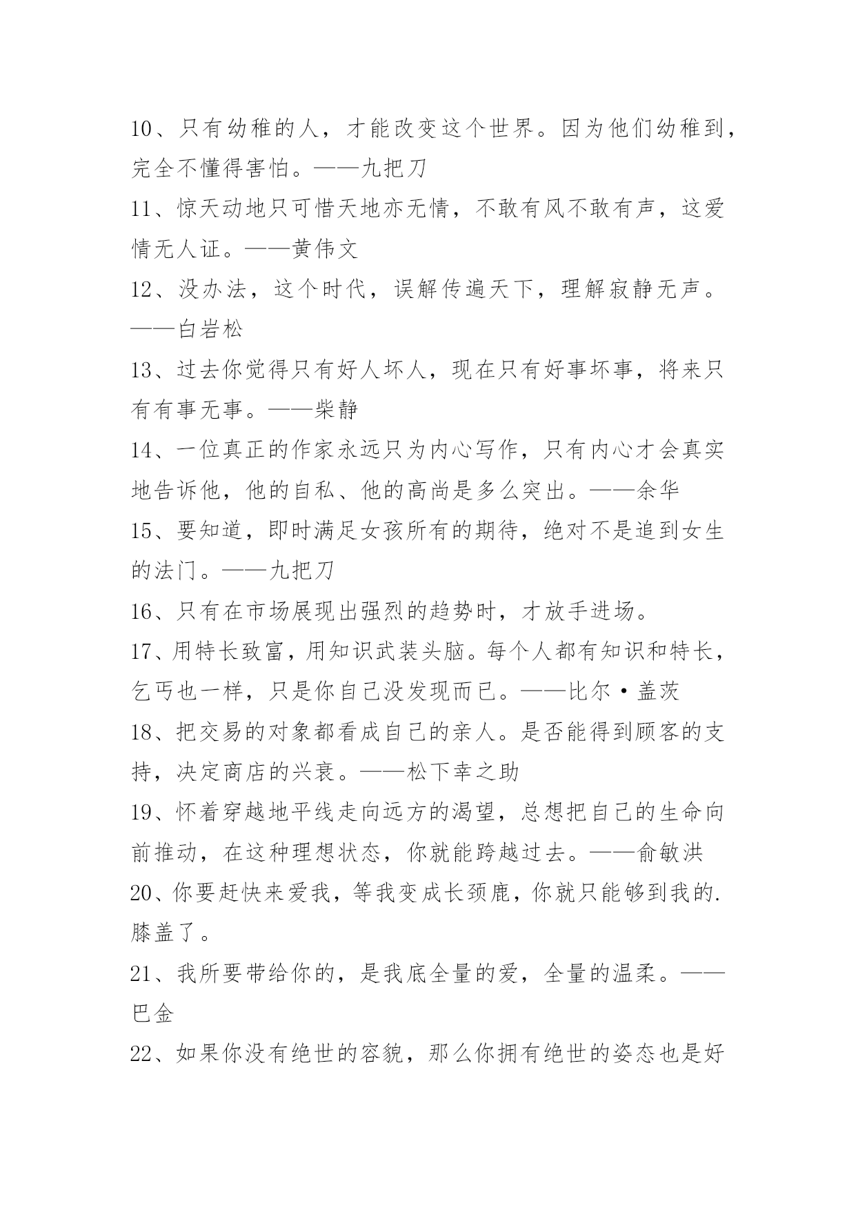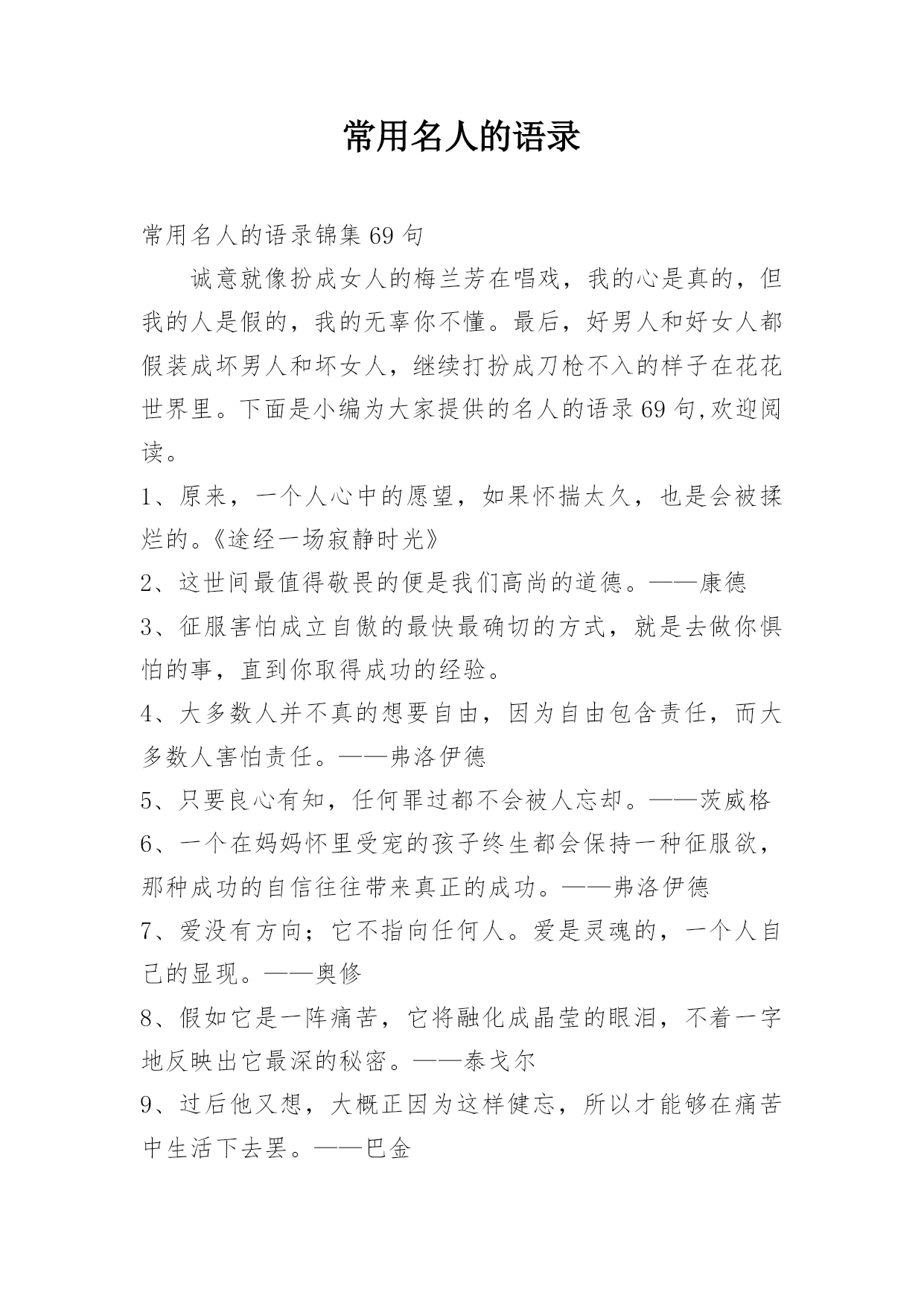 常用名人的语录常用名人的语录锦集69句诚意就像扮成女人的梅兰芳在唱戏,我的心是真的,但我的人是假的,我的无辜你不懂。最后,好男人和好女人都假装成坏男人和坏女人,继续打扮成刀枪不入的样子在花花世界里。下面是小编为大家提供的名人的语录69句,欢迎阅读。1、原来,一个人心中的愿望,如果怀揣太久,也是会被揉烂的。《途经一场寂静时光》2、这世间最值得敬畏的便是我们高尚的道德。——康德3、征服害怕成立自傲的最快最确切的方式,就是去做你惧怕的事,直到你取得成功的经验。4、大多数人并不真的想要自由,因为自由包含责任,而大多数人害怕责任。——弗洛伊德5、只要良心有知,任何罪过都不会被人忘却。——茨威格6、一个在妈妈怀里受宠的孩子终生都会保持一种征服欲,那种成功的自信往往带来真正的成功。——弗洛伊德7、爱没有方向;它不指向任何人。爱是灵魂的,一个人自己的显现。——奥修8、假如它是一阵痛苦,它将融化成晶莹的眼泪,不着一字地反映出它最深的秘密。——泰戈尔9、过后他又想,大概正因为这样健忘,所以才能够在痛苦中生活下去罢。——巴金10、只有幼稚的人,才能改变这个世界。因为他们幼稚到,完全不懂得害怕。——九把刀11、惊天动地只可惜天地亦无情,不敢有风不敢有声,这爱情无人证。——黄伟文12、没办法,这个时代,误解传遍天下,理解寂静无声。——白岩松13、过去你觉得只有好人坏人,现在只有好事坏事,将来只有有事无事。——柴静14、一位真正的作家永远只为内心写作,只有内心才会真实地告诉他,他的自私、他的高尚是多么突出。——余华15、要知道,即时满足女孩所有的期待,绝对不是追到女生的法门。——九把刀16、只有在市场展现出强烈的趋势时,才放手进场。17、用特长致富,用知识武装头脑。每个人都有知识和特长,乞丐也一样,只是你自己没发现而已。——比尔·盖茨18、把交易的对象都看成自己的亲人。是否能得到顾客的支持,决定商店的兴衰。——松下幸之助19、怀着穿越地平线走向远方的渴望,总想把自己的生命向前推动,在这种理想状态,你就能跨越过去。——俞敏洪20、你要赶快来爱我,等我变成长颈鹿,你就只能够到我的.膝盖了。21、我所要带给你的,是我底全量的爱,全量的温柔。——巴金22、如果你没有绝世的容貌,那么你拥有绝世的姿态也是好的。——雪小禅23、我拒绝成为一个幸福的人,有了幸福便有了恐惧。——廖一梅24、人不到山里去,不到水里去,那真是活得冤枉。——张晓风25、我渐渐懂得他为什么喜欢淋雨了,那让人同时感到迎接自然又挣脱捆绑。——几米26、廉洁自律,警钟常敲。27、岁月将故事染色,结局我看透。人生画卷,努力填色中。28、每个角色都是一次历练,我徜徉于角色的美好,游历她们的人生壮阔。29、没有人能随随便便成长,没有人能随随便便快乐,没有人能随随便便美丽,没有人能随随便成为自己。30、有生之年,一起去看看这个美丽易碎的世界。凡有等待,就有启程。31、人类的孤独就在于:他在睡觉的时候被人偷偷送到了一座孤岛上,醒来之后却不知道自己在哪里。32、生而知之者,上也;学而知之者,次也;困而学之,又其次也;困而不学,民斯为下矣!——《论语·季氏》33、"辣妈"不是育儿剧,我现在对收视率很从容。——孙俪34、痛苦有多深.爱就有多深。35、微笑具有一种魅力,它可以点亮天空,可以振作精神,可以改变你周围的气氛,更可以改变你。面带微笑会使你更受别人的欢迎。你对别人皱的眉头越深,别人回报你的眉头也就越深;但如果你给对方一个微笑的话,你将得到十倍的利润。36、快乐在于行动,不只是拥有,剥夺别人的快乐不能使自己快乐。微笑使人更美丽、更愉快,却不费分文。热情比怨恨更得人心。慷慨地给予快乐,自己更快乐。37、有人说了,习惯谁没有呢?这还用养成么?这里所说的习惯可不是你现在的习惯。你没成功就说明你现在的习惯还不是好的习惯,我们要培养一种使我们成功的好习惯。38、我知道我长得丑,被扔石头无所谓,但让你害怕让我觉得很难过。39、让你难过的事,总有一天你会笑着说出来。——《肖申克的救赎》40、未知的路很长,但坚信,一定能走下去,一定会得到自己所想的。41、不仅要保护妇女,并且要赋予她们权利!42、人最光辉那一天,不是功成名就那一天,而是终于醒悟奋起直追的那一天。每个人都有很多毛病,但只要你接受并承认这一点开始,你就成功了。——刘同43、你渴望被人理解,又害怕被人看穿。你渴望被人赏识,又害怕溜须拍马。你渴望平步青云,又害怕脱离群众。你渴望升职加薪,又害怕急功近利。自我矛盾是职场上最常见的病,看清自己,对症下药。谁没一点病,谁都能久病成良医。职场体检,匹夫有责!44、元稹:曾经沧海难为水,除去巫山不是云。45、张国荣:就让我陪你唱一辈子戏,不行吗?46、生活的本来面目与时间的本来面目相撞击,我们就把这种撞击称做无聊。——米兰昆德