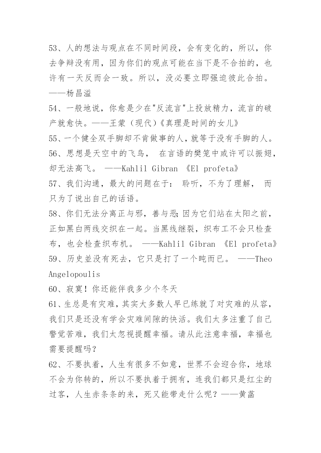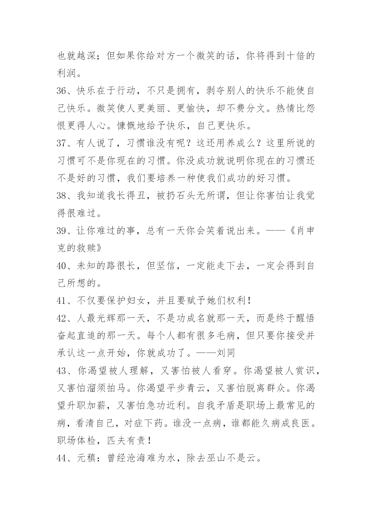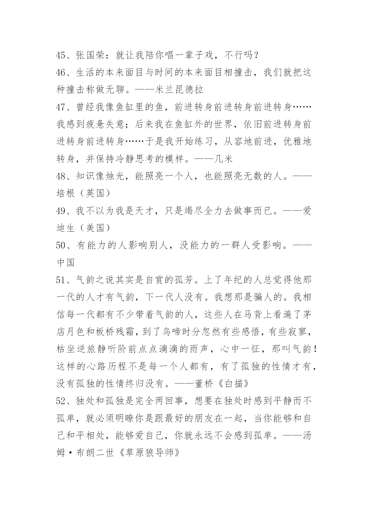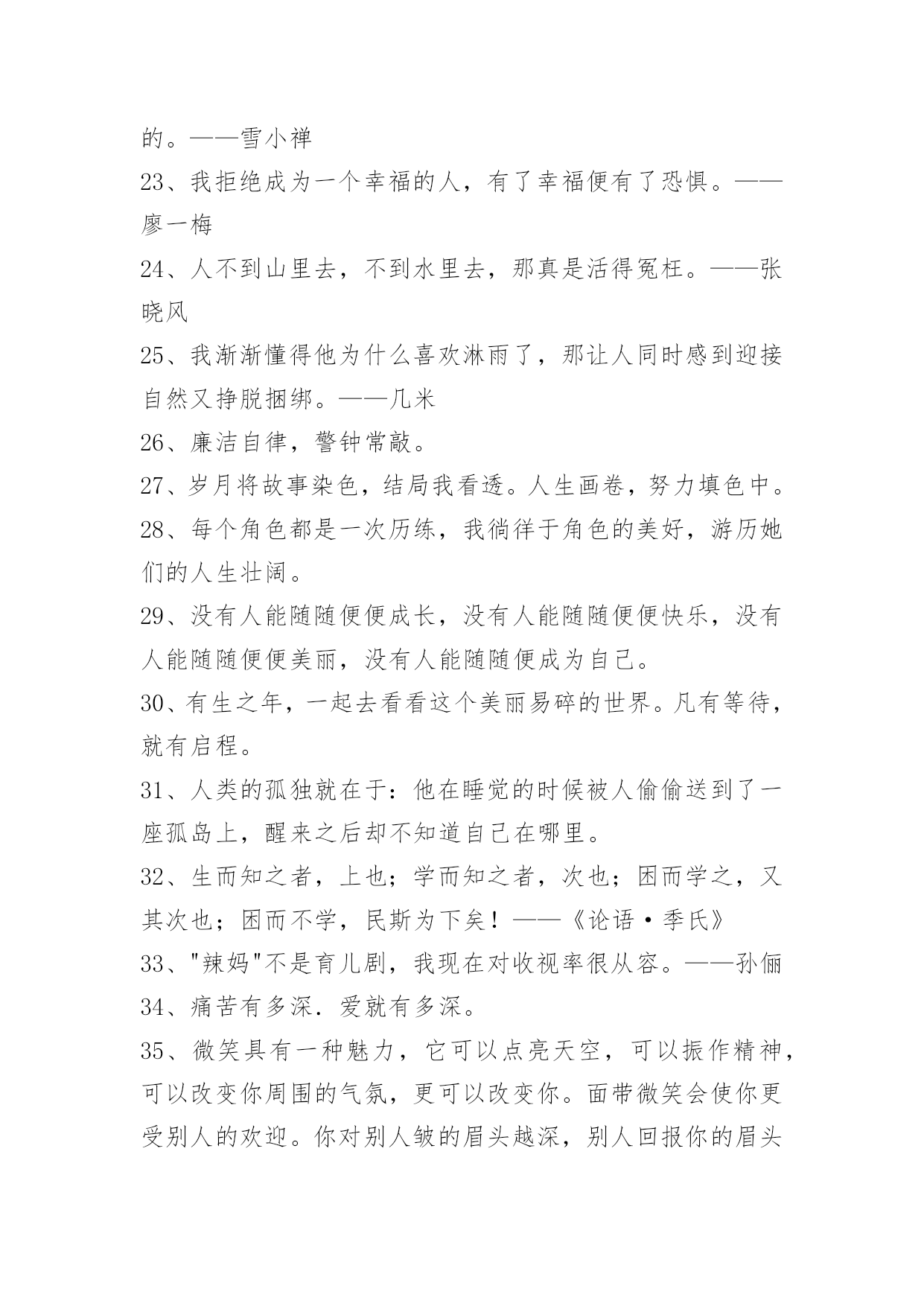 常用名人的语录常用名人的语录锦集69句诚意就像扮成女人的梅兰芳在唱戏,我的心是真的,但我的人是假的,我的无辜你不懂。最后,好男人和好女人都假装成坏男人和坏女人,继续打扮成刀枪不入的样子在花花世界里。下面是小编为大家提供的名人的语录69句,欢迎阅读。1、原来,一个人心中的愿望,如果怀揣太久,也是会被揉烂的。《途经一场寂静时光》2、这世间最值得敬畏的便是我们高尚的道德。——康德3、征服害怕成立自傲的最快最确切的方式,就是去做你惧怕的事,直到你取得成功的经验。4、大多数人并不真的想要自由,因为自由包含责任,而大多数人害怕责任。——弗洛伊德5、只要良心有知,任何罪过都不会被人忘却。——茨威格6、一个在妈妈怀里受宠的孩子终生都会保持一种征服欲,那种成功的自信往往带来真正的成功。——弗洛伊德7、爱没有方向;它不指向任何人。爱是灵魂的,一个人自己的显现。——奥修8、假如它是一阵痛苦,它将融化成晶莹的眼泪,不着一字地反映出它最深的秘密。——泰戈尔9、过后他又想,大概正因为这样健忘,所以才能够在痛苦中生活下去罢。——巴金10、只有幼稚的人,才能改变这个世界。因为他们幼稚到,完全不懂得害怕。——九把刀11、惊天动地只可惜天地亦无情,不敢有风不敢有声,这爱情无人证。——黄伟文12、没办法,这个时代,误解传遍天下,理解寂静无声。——白岩松13、过去你觉得只有好人坏人,现在只有好事坏事,将来只有有事无事。——柴静14、一位真正的作家永远只为内心写作,只有内心才会真实地告诉他,他的自私、他的高尚是多么突出。——余华15、要知道,即时满足女孩所有的期待,绝对不是追到女生的法门。——九把刀16、只有在市场展现出强烈的趋势时,才放手进场。17、用特长致富,用知识武装头脑。每个人都有知识和特长,乞丐也一样,只是你自己没发现而已。——比尔·盖茨18、把交易的对象都看成自己的亲人。是否能得到顾客的支持,决定商店的兴衰。——松下幸之助19、怀着穿越地平线走向远方的渴望,总想把自己的生命向前推动,在这种理想状态,你就能跨越过去。——俞敏洪20、你要赶快来爱我,等我变成长颈鹿,你就只能够到我的.膝盖了。21、我所要带给你的,是我底全量的爱,全量的温柔。——巴金22、如果你没有绝世的容貌,那么你拥有绝世的姿态也是好的。——雪小禅23、我拒绝成为一个幸福的人,有了幸福便有了恐惧。——廖一梅24、人不到山里去,不到水里去,那真是活得冤枉。——张晓风25、我渐渐懂得他为什么喜欢淋雨了,那让人同时感到迎接自然又挣脱捆绑。——几米26、廉洁自律,警钟常敲。27、岁月将故事染色,结局我看透。人生画卷,努力填色中。28、每个角色都是一次历练,我徜徉于角色的美好,游历她们的人生壮阔。29、没有人能随随便便成长,没有人能随随便便快乐,没有人能随随便便美丽,没有人能随随便成为自己。30、有生之年,一起去看看这个美丽易碎的世界。凡有等待,就有启程。31、人类的孤独就在于:他在睡觉的时候被人偷偷送到了一座孤岛上,醒来之后却不知道自己在哪里。32、生而知之者,上也;学而知之者,次也;困而学之,又其次也;困而不学,民斯为下矣!——《论语·季氏》33、"辣妈"不是育儿剧,我现在对收视率很从容。——孙俪34、痛苦有多深.爱就有多深。35、微笑具有一种魅力,它可以点亮天空,可以振作精神,可以改变你周围的气氛,更可以改变你。面带微笑会使你更受别人的欢迎。你对别人皱的眉头越深,别人回报你的眉头也就越深;但如果你给对方一个微笑的话,你将得到十倍的利润。36、快乐在于行动,不只是拥有,剥夺别人的快乐不能使自己快乐。微笑使人更美丽、更愉快,却不费分文。热情比怨恨更得人心。慷慨地给予快乐,自己更快乐。37、有人说了,习惯谁没有呢?这还用养成么?这里所说的习惯可不是你现在的习惯。你没成功就说明你现在的习惯还不是好的习惯,我们要培养一种使我们成功的好习惯。38、我知道我长得丑,被扔石头无所谓,但让你害怕让我觉得很难过。39、让你难过的事,总有一天你会笑着说出来。——《肖申克的救赎》40、未知的路很长,但坚信,一定能走下去,一定会得到自己所想的。41、不仅要保护妇女,并且要赋予她们权利!42、人最光辉那一天,不是功成名就那一天,而是终于醒悟奋起直追的那一天。每个人都有很多毛病,但只要你接受并承认这一点开始,你就成功了。——刘同43、你渴望被人理解,又害怕被人看穿。你渴望被人赏识,又害怕溜须拍马。你渴望平步青云,又害怕脱离群众。你渴望升职加薪,又害怕急功近利。自我矛盾是职场上最常见的病,看清自己,对症下药。谁没一点病,谁都能久病成良医。职场体检,匹夫有责!44、元稹:曾经沧海难为水,除去巫山不是云。45、张国荣:就让我陪你唱一辈子戏,不行吗?46、生活的本来面目与时间的本来面目相撞击,我们就把这种撞击称做无聊。——米兰昆德