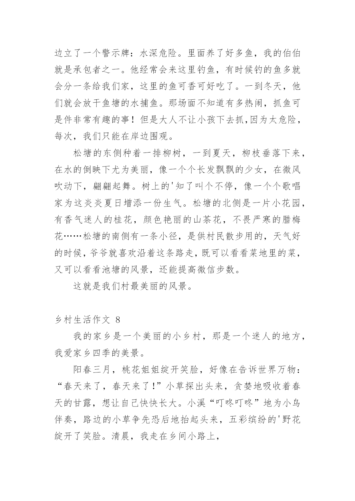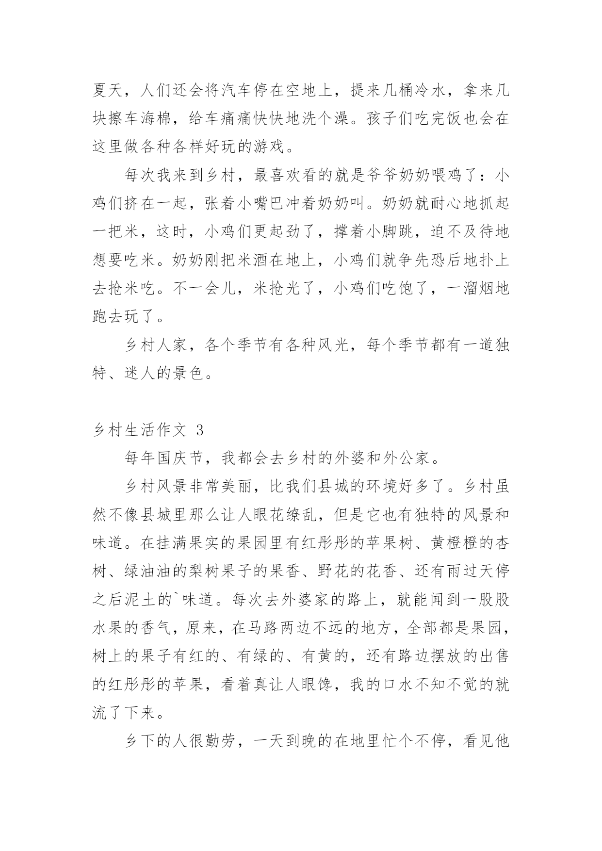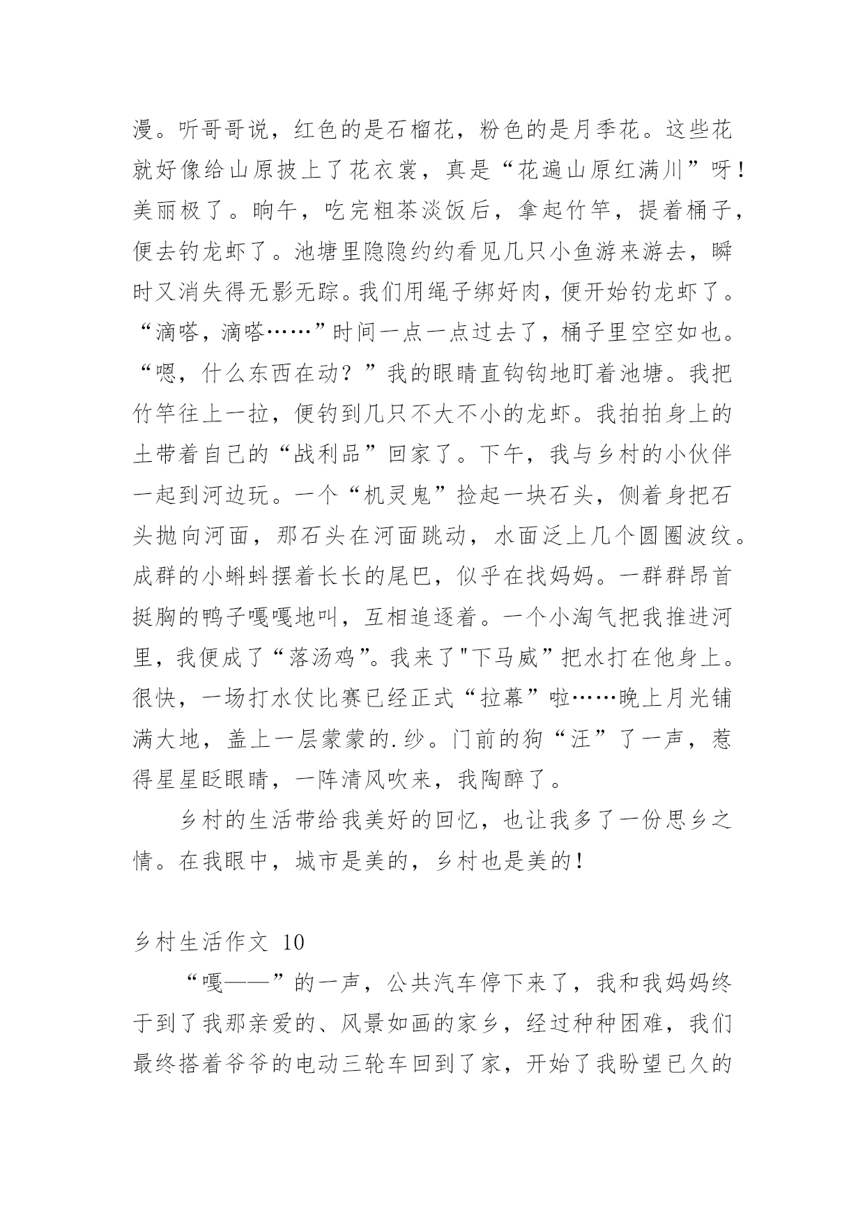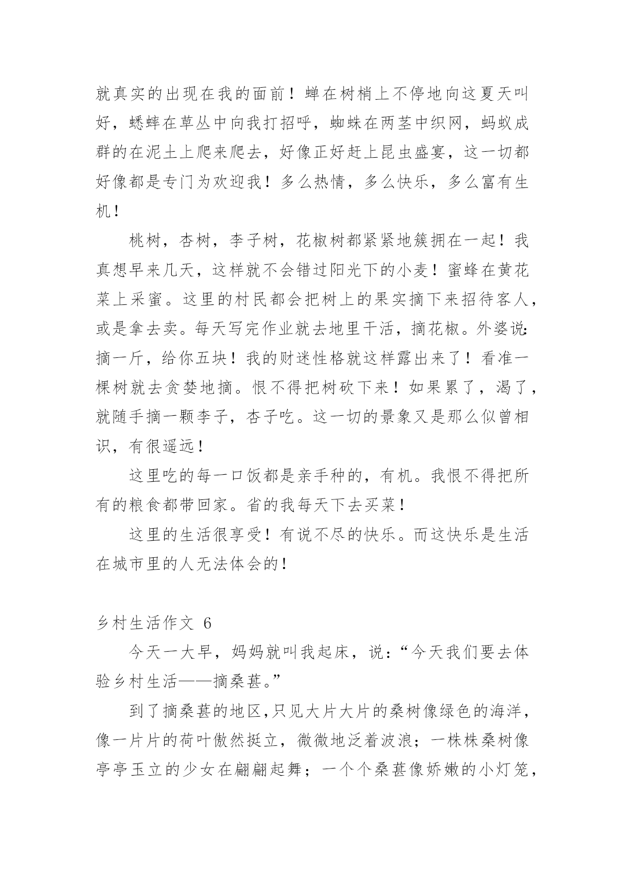 乡村生活作文乡村生活作文(通用55篇)在日常学习、工作或生活中,大家最不陌生的就是作文了吧,作文根据体裁的不同可以分为记叙文、说明文、应用文、议论文。你写作文时总是无从下笔?下面是小编帮大家整理的乡村生活作文,供大家参考借鉴,希望可以帮助到有需要的朋友。乡村生活作文1在外婆家的乡村生活让人流恋忘返。随着几声雄鸡的鸣叫,原本寂静的街道也热闹了起来:有叫卖新鲜的樱桃的,那红彤彤的樱桃让人看一眼就垂涎三尺;有卖日常用品的,剪刀,杯子,毛巾、针线之类;有叫卖换季的衣服的;还有在在叫卖小鸡仔、小鸭子和小猪仔的叫卖声和讨价声混成了一片。乡村的中午是悠闲的。在门前的大杨树下,几位老爷爷围着一张石桌,在下着象棋,周围围观的人还时不时地会指点几句。不远处,几位老奶奶开心地哄着自己的孙子、孙女。母鸡"咯咯咯"地率领小鸡玩耍,或是捉虫子,或是叼石子。门口趴着的猫懒洋洋的,眼睛眯成了一条缝,想必它也在睡午觉吧。太阳徐徐下山,把它最后的光辉洒在屋顶上、街道上、小草上所有在夕阳照耀下的万物都显现出金色的光芒。屋顶的烟囱冒出缕缕青烟,家里的晚饭也做好了。倘若在夏天,人们会把桌椅及饭菜搬到门前,要是你这时出去散步,你肯定会瞧见他们天高地阔吃饭的情景。这时天边的晚霞,头上飞过的归巢的鸟儿,都是他们的`好朋友。夜晚,月光如水,泻满大地。纺织娘寄住在屋前的瓜架上,便唱起歌来,那歌声真好听,赛过所有的催眠曲,让那些辛劳了一天的人们进入甜蜜的梦乡。乡下人家的生活就这样,日日夜夜在勾勒着一幅和谐、自然的田园风景画。乡村生活作文2乡村生活,比城市生活更丰富多彩,有新鲜果肉蔬菜,有动物和声交响乐……这次,我们就一起走进乡村生活。乡下人家住着一座双层房屋,他们会在自己的“领地”周边围一圈栅栏。他们的屋前有一片空地,地上洒着几粒米。当鸡们饿了,母鸡就会率领一群小鸡去抢食米粒。公鸡呢,耸着尾巴在一旁大踏步地走来走去,像是为母鸡他们护卫,自己也时不时地啄一下地面。小土坑里种着各种各样的蔬菜:莴笋、丝瓜、南瓜、黄瓜、紫苏……人们可以在不同的季节吃到自己亲手种植的新鲜蔬菜。猪圈中,猪哼哼地叫着,好像是在对什么表示赞许,鸭子摇摇摆摆地走来走去,噶噶地叫着,像是找谁跟它们玩呢!乡下的一家人若是住在小坡上,那么从绿树在成荫的小道走下坡去,到了一片很辽阔的'土地。这里可以看日出,放鞭炮、跑步,甚至可以搞节目了。夏天,人们还会将汽车停在空地上,提来几桶冷水,拿来几块擦车海棉,给车痛痛快快地洗个澡。孩子们吃完饭也会在这里做各种各样好玩的游戏。每次我来到乡村,最喜欢看的就是爷爷奶奶喂鸡了:小鸡们挤在一起,张着小嘴巴冲着奶奶叫。奶奶就耐心地抓起一把米,这时,小鸡们更起劲了,撑着小脚跳,迫不及待地想要吃米。奶奶刚把米酒在地上,小鸡们就争先恐后地扑上去抢米吃。不一会儿,米抢光了,小鸡们吃饱了,一溜烟地跑去玩了。乡村人家,各个季节有各种风光,每个季节都有一道独特、迷人的景色。乡村生活作文3每年国庆节,我都会去乡村的外婆和外公家。乡村风景非常美丽,比我们县城的环境好多了。乡村虽然不像县城里那么让人眼花缭乱,但是它也有独特的风景和味道。在挂满果实的果园里有红彤彤的苹果树、黄橙橙的杏树、绿油油的梨树果子的果香、野花的花香、还有雨过天停之后泥土的`味道。每次去外婆家的路上,就能闻到一股股水果的香气,原来,在马路两边不远的地方,全部都是果园,树上的果子有红的、有绿的、有黄的,还有路边摆放的出售的红彤彤的苹果,看着真让人眼馋,我的口水不知不觉的就流了下来。乡下的人很勤劳,一天到晚的在地里忙个不停,看见他们在地里干活,我就想起唐代诗人李绅的《悯农》的诗句:锄禾日当午,汗滴禾下土;谁知盘中餐,粒粒皆辛苦。看着累弯了腰的农民伯伯们,我以后会更加珍惜粮食,再也不浪费农民伯伯们用辛勤的汗水换来的食物了。乡村和县城里大有不同,县城里有一股浓浓的汽油味,还非常吵闹。乡村,特别宁静,还有新鲜的空气和野花的花香,让人心神荡漾。山坡上的野花开满遍地,蒲公英的种子乘着降落伞,随着微风飞到四处的草地上,繁衍着它们的后代。夜晚,我在躺着院子里外公的躺椅上,一边纳凉,一边抬头数挂在天上的星星,乡村的星星很明很亮也很多,我每次都数不完。在外婆家的乡村生活真好,我喜欢这里。乡村生活作文4说到农村,我最先想到的地方就是外婆家。外婆家的门前有一条会唱歌的小溪。春天小溪哗啦啦地唱着优美动听的歌,夏天小溪唱着快乐热情的歌,秋天小溪唱起了丰收的.赞歌,冬天小溪不再唱歌,而是静静地等待着春天。我最喜欢夏天的小溪,小朋友们在小溪里欢快地游泳。小溪也在庆祝这夏天的到来。一到晚上,成群的鱼虾从水里窜出来,只要你用渔网一捞,一定会捞一窝小鱼,或者一只螃蟹,一个贝壳什么的。小溪的侧面就是田野,春天芽苞出放,鹅黄嫩绿。夏天农民种着各种蔬果,秋天等待已久的农民背着锄头到田