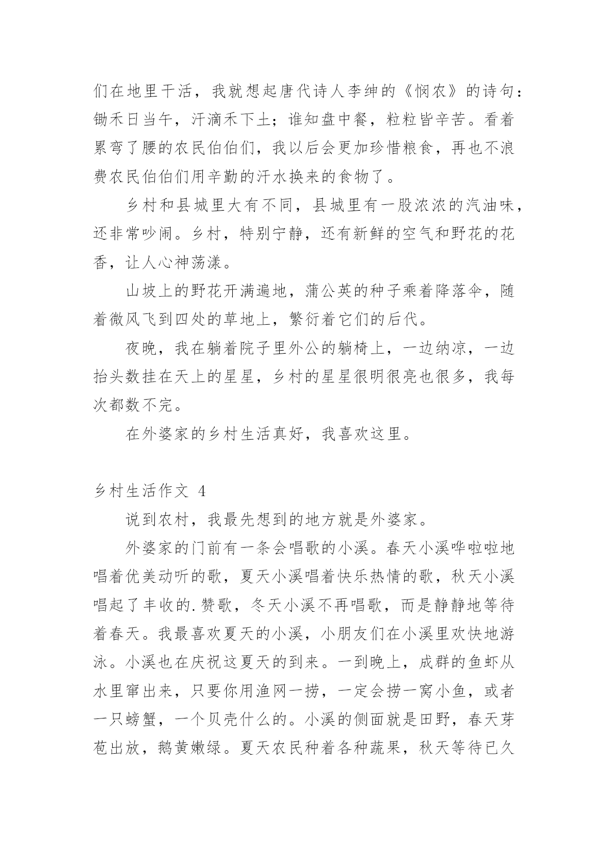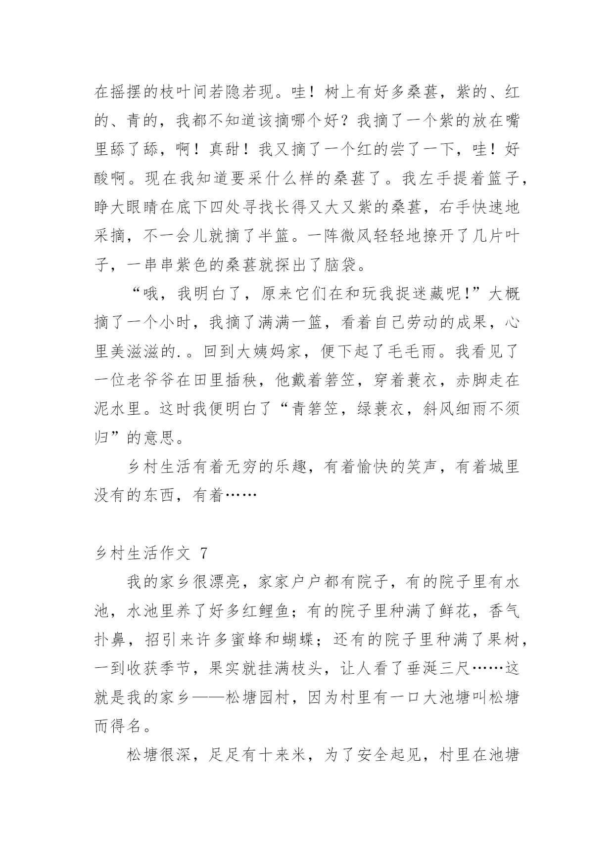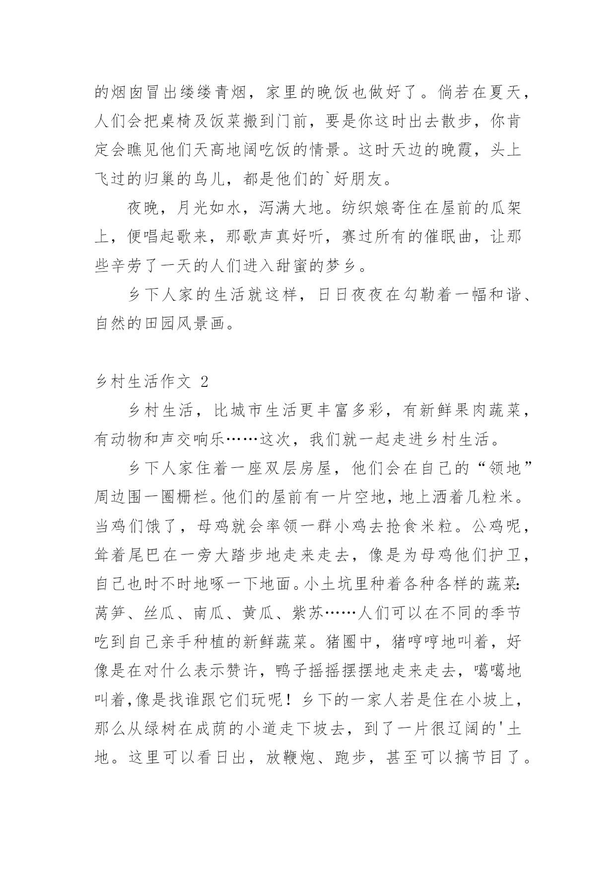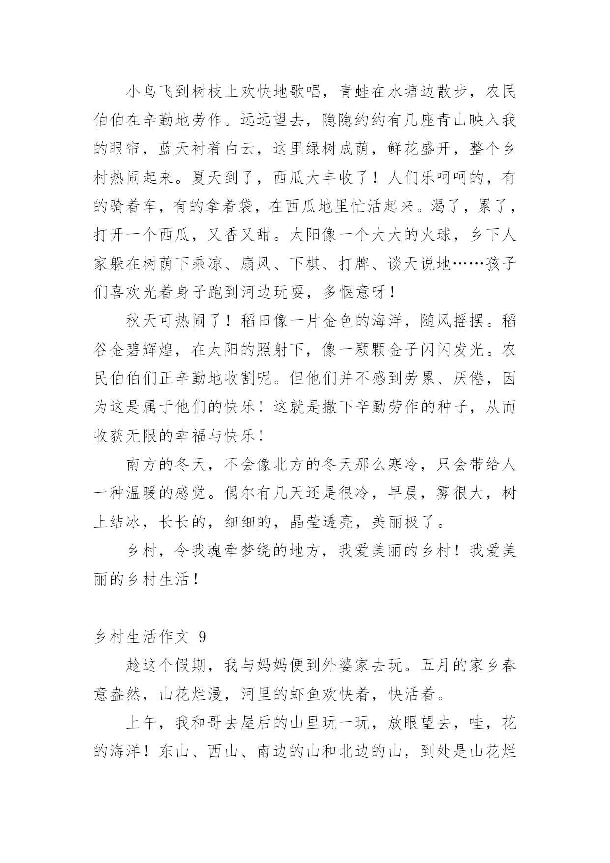 乡村生活作文乡村生活作文(通用55篇)在日常学习、工作或生活中,大家最不陌生的就是作文了吧,作文根据体裁的不同可以分为记叙文、说明文、应用文、议论文。你写作文时总是无从下笔?下面是小编帮大家整理的乡村生活作文,供大家参考借鉴,希望可以帮助到有需要的朋友。乡村生活作文1在外婆家的乡村生活让人流恋忘返。随着几声雄鸡的鸣叫,原本寂静的街道也热闹了起来:有叫卖新鲜的樱桃的,那红彤彤的樱桃让人看一眼就垂涎三尺;有卖日常用品的,剪刀,杯子,毛巾、针线之类;有叫卖换季的衣服的;还有在在叫卖小鸡仔、小鸭子和小猪仔的叫卖声和讨价声混成了一片。乡村的中午是悠闲的。在门前的大杨树下,几位老爷爷围着一张石桌,在下着象棋,周围围观的人还时不时地会指点几句。不远处,几位老奶奶开心地哄着自己的孙子、孙女。母鸡"咯咯咯"地率领小鸡玩耍,或是捉虫子,或是叼石子。门口趴着的猫懒洋洋的,眼睛眯成了一条缝,想必它也在睡午觉吧。太阳徐徐下山,把它最后的光辉洒在屋顶上、街道上、小草上所有在夕阳照耀下的万物都显现出金色的光芒。屋顶的烟囱冒出缕缕青烟,家里的晚饭也做好了。倘若在夏天,人们会把桌椅及饭菜搬到门前,要是你这时出去散步,你肯定会瞧见他们天高地阔吃饭的情景。这时天边的晚霞,头上飞过的归巢的鸟儿,都是他们的`好朋友。夜晚,月光如水,泻满大地。纺织娘寄住在屋前的瓜架上,便唱起歌来,那歌声真好听,赛过所有的催眠曲,让那些辛劳了一天的人们进入甜蜜的梦乡。乡下人家的生活就这样,日日夜夜在勾勒着一幅和谐、自然的田园风景画。乡村生活作文2乡村生活,比城市生活更丰富多彩,有新鲜果肉蔬菜,有动物和声交响乐……这次,我们就一起走进乡村生活。乡下人家住着一座双层房屋,他们会在自己的“领地”周边围一圈栅栏。他们的屋前有一片空地,地上洒着几粒米。当鸡们饿了,母鸡就会率领一群小鸡去抢食米粒。公鸡呢,耸着尾巴在一旁大踏步地走来走去,像是为母鸡他们护卫,自己也时不时地啄一下地面。小土坑里种着各种各样的蔬菜:莴笋、丝瓜、南瓜、黄瓜、紫苏……人们可以在不同的季节吃到自己亲手种植的新鲜蔬菜。猪圈中,猪哼哼地叫着,好像是在对什么表示赞许,鸭子摇摇摆摆地走来走去,噶噶地叫着,像是找谁跟它们玩呢!乡下的一家人若是住在小坡上,那么从绿树在成荫的小道走下坡去,到了一片很辽阔的'土地。这里可以看日出,放鞭炮、跑步,甚至可以搞节目了。夏天,人们还会将汽车停在空地上,提来几桶冷水,拿来几块擦车海棉,给车痛痛快快地洗个澡。孩子们吃完饭也会在这里做各种各样好玩的游戏。每次我来到乡村,最喜欢看的就是爷爷奶奶喂鸡了:小鸡们挤在一起,张着小嘴巴冲着奶奶叫。奶奶就耐心地抓起一把米,这时,小鸡们更起劲了,撑着小脚跳,迫不及待地想要吃米。奶奶刚把米酒在地上,小鸡们就争先恐后地扑上去抢米吃。不一会儿,米抢光了,小鸡们吃饱了,一溜烟地跑去玩了。乡村人家,各个季节有各种风光,每个季节都有一道独特、迷人的景色。乡村生活作文3每年国庆节,我都会去乡村的外婆和外公家。乡村风景非常美丽,比我们县城的环境好多了。乡村虽然不像县城里那么让人眼花缭乱,但是它也有独特的风景和味道。在挂满果实的果园里有红彤彤的苹果树、黄橙橙的杏树、绿油油的梨树果子的果香、野花的花香、还有雨过天停之后泥土的`味道。每次去外婆家的路上,就能闻到一股股水果的香气,原来,在马路两边不远的地方,全部都是果园,树上的果子有红的、有绿的、有黄的,还有路边摆放的出售的红彤彤的苹果,看着真让人眼馋,我的口水不知不觉的就流了下来。乡下的人很勤劳,一天到晚的在地里忙个不停,看见他们在地里干活,我就想起唐代诗人李绅的《悯农》的诗句:锄禾日当午,汗滴禾下土;谁知盘中餐,粒粒皆辛苦。看着累弯了腰的农民伯伯们,我以后会更加珍惜粮食,再也不浪费农民伯伯们用辛勤的汗水换来的食物了。乡村和县城里大有不同,县城里有一股浓浓的汽油味,还非常吵闹。乡村,特别宁静,还有新鲜的空气和野花的花香,让人心神荡漾。山坡上的野花开满遍地,蒲公英的种子乘着降落伞,随着微风飞到四处的草地上,繁衍着它们的后代。夜晚,我在躺着院子里外公的躺椅上,一边纳凉,一边抬头数挂在天上的星星,乡村的星星很明很亮也很多,我每次都数不完。在外婆家的乡村生活真好,我喜欢这里。乡村生活作文4说到农村,我最先想到的地方就是外婆家。外婆家的门前有一条会唱歌的小溪。春天小溪哗啦啦地唱着优美动听的歌,夏天小溪唱着快乐热情的歌,秋天小溪唱起了丰收的.赞歌,冬天小溪不再唱歌,而是静静地等待着春天。我最喜欢夏天的小溪,小朋友们在小溪里欢快地游泳。小溪也在庆祝这夏天的到来。一到晚上,成群的鱼虾从水里窜出来,只要你用渔网一捞,一定会捞一窝小鱼,或者一只螃蟹,一个贝壳什么的。小溪的侧面就是田野,春天芽苞出放,鹅黄嫩绿。夏天农民种着各种蔬果,秋天等待已久的农民背着锄头到田