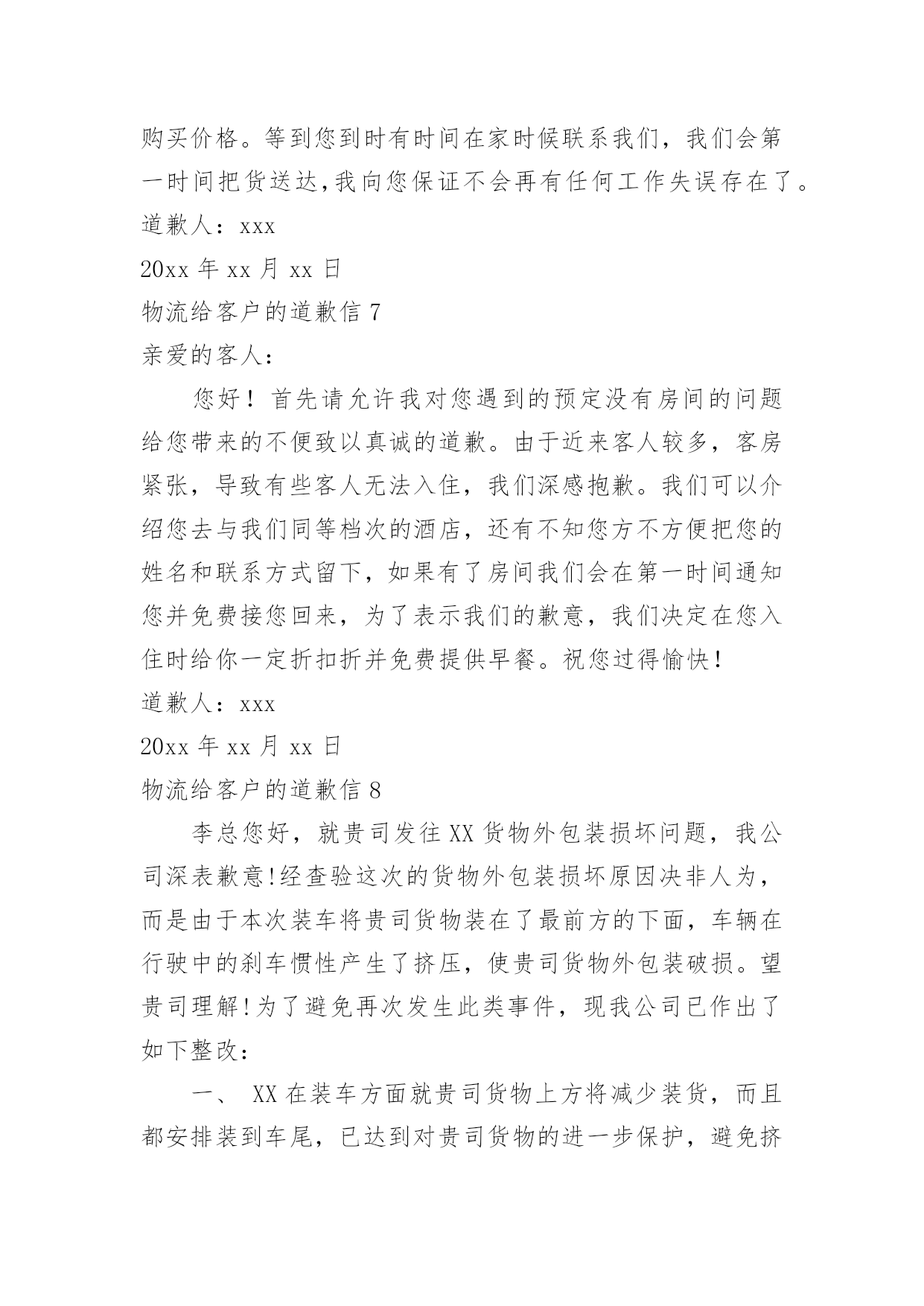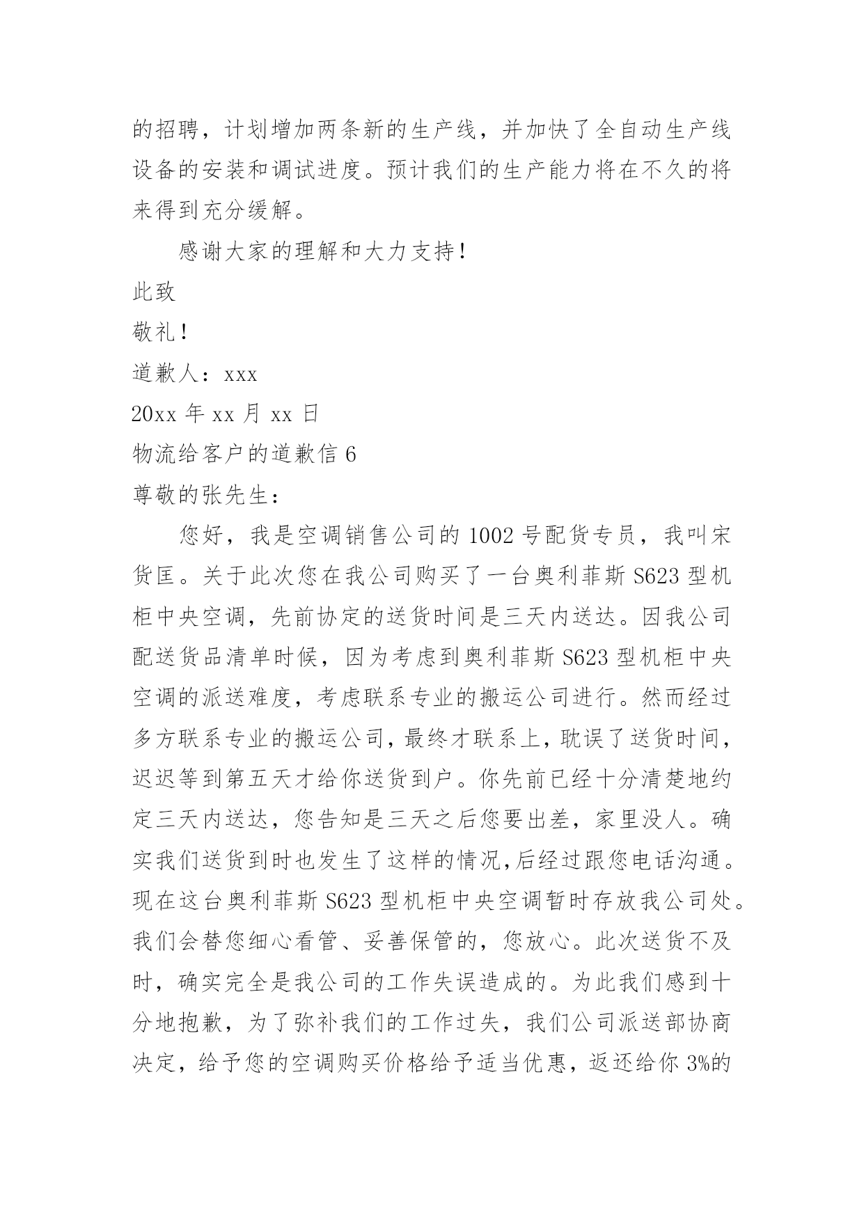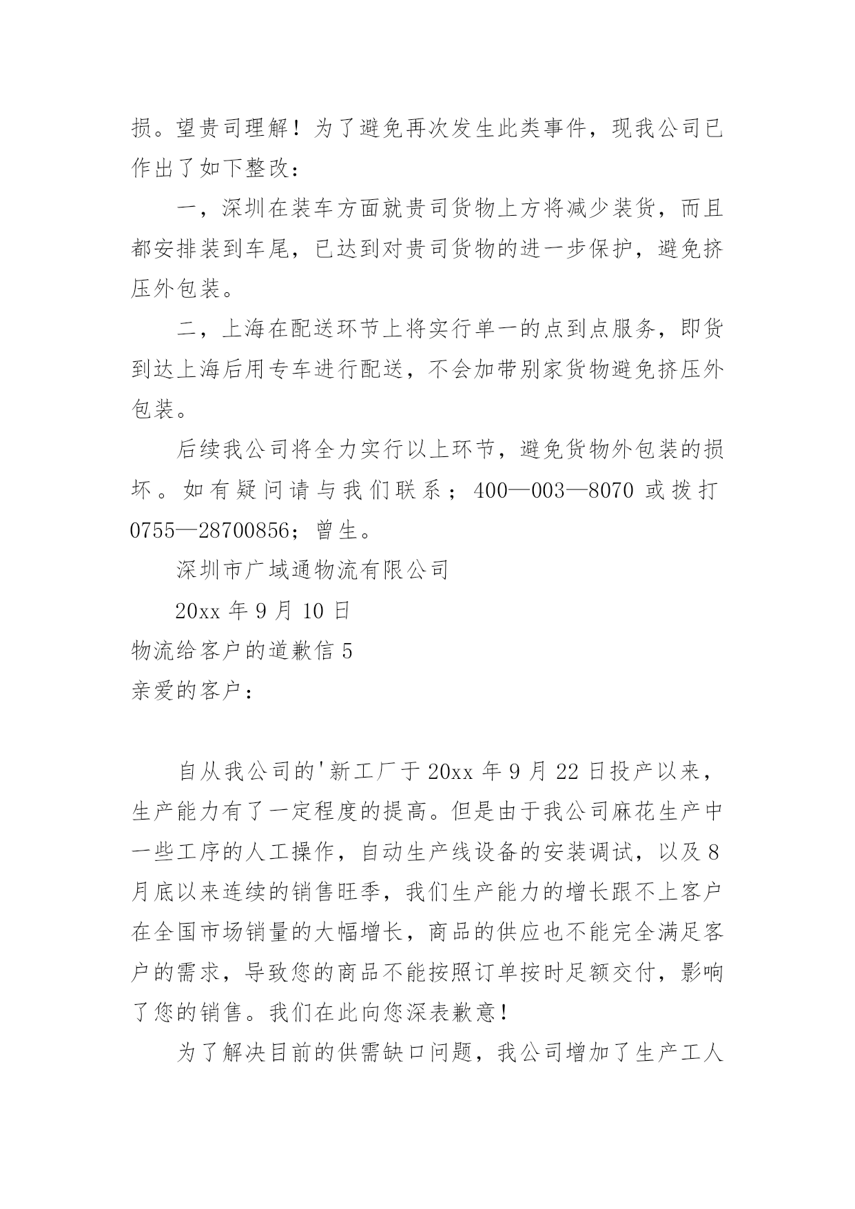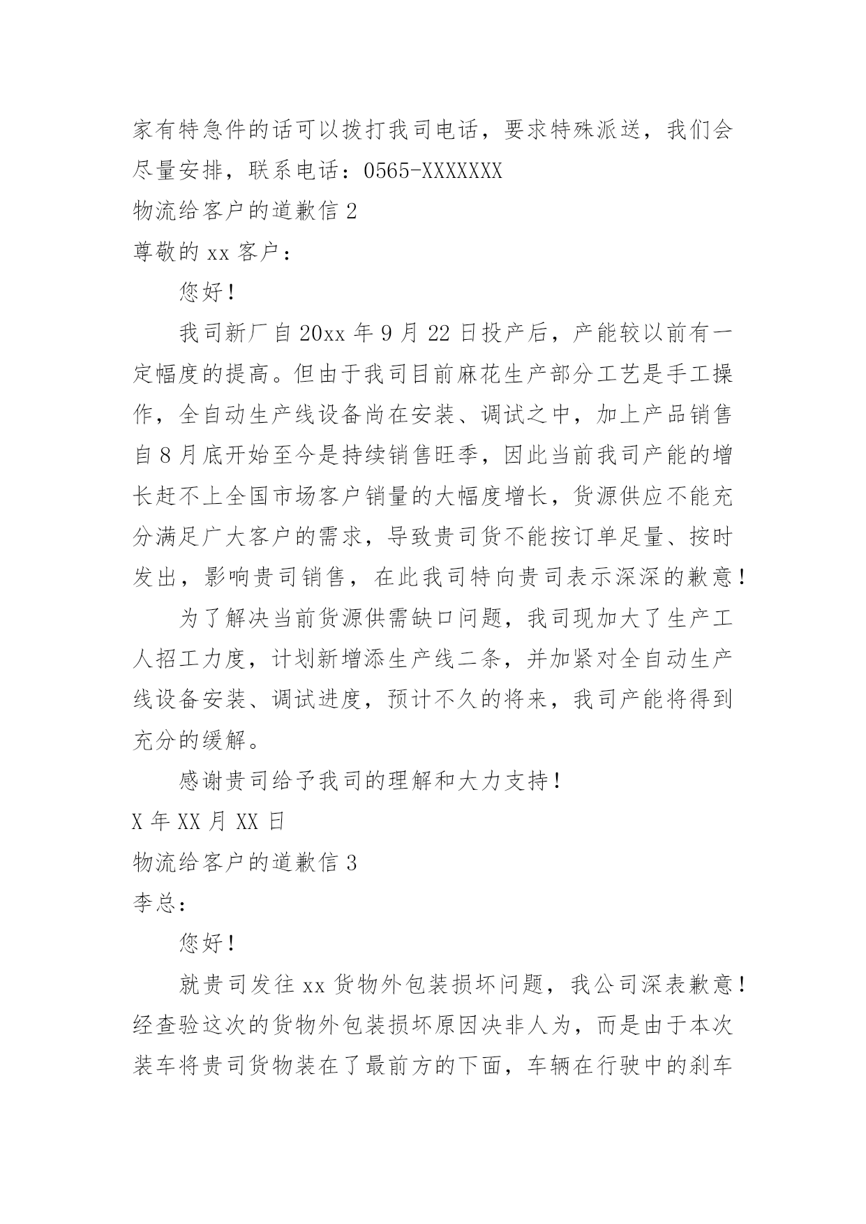 物流给客户的道歉信物流给客户的道歉信在充满活力,日益开放的今天,我们都可能会用到道歉信,道歉信可以帮助我们消除误会,增进友谊和信赖。怎么写道歉信才能避免踩雷呢?下面是小编精心整理的物流给客户的道歉信,欢迎阅读,希望大家能够喜欢。物流给客户的道歉信1首先感谢一直支持和关注我们的广大客户群体,在20xx年里我公司自认为还有许多做的不好的地方,也收到一些客户的电话投诉,在这里我代表公司向你们表示歉意,希望大家谅解。原因来源于各方面,目前和县各大快递的总派件量在迅速上升,从去年的150份发展到今天的400份多,我司今年日平均派件量达到150份多,是去年的2倍还多,其他快递也是一样的增长速度,虽然派件员有所增加,但是还是有一定的困难,因为和县的出件量增加并不明显,造成了派件多接件少的问题,人员工资在涨,物价在涨,油价也在涨,但是我们的快递费却不见涨,反而有下降的趋势,各家快递公司分别呈现收支不平衡现象,为了节约成本大家都采取了瘦身法来应对,所以造成部分快件的不及时,还请大家谅解,我司也在发展物流上下足功夫以缓解收支不平衡,如果大家有特急件的话可以拨打我司电话,要求特殊派送,我们会尽量安排,联系电话:0565-XXXXXXX物流给客户的道歉信2尊敬的xx客户:您好!我司新厂自20xx年9月22日投产后,产能较以前有一定幅度的提高。但由于我司目前麻花生产部分工艺是手工操作,全自动生产线设备尚在安装、调试之中,加上产品销售自8月底开始至今是持续销售旺季,因此当前我司产能的增长赶不上全国市场客户销量的大幅度增长,货源供应不能充分满足广大客户的需求,导致贵司货不能按订单足量、按时发出,影响贵司销售,在此我司特向贵司表示深深的歉意!为了解决当前货源供需缺口问题,我司现加大了生产工人招工力度,计划新增添生产线二条,并加紧对全自动生产线设备安装、调试进度,预计不久的将来,我司产能将得到充分的缓解。感谢贵司给予我司的理解和大力支持!X年XX月XX日物流给客户的道歉信3李总:您好!就贵司发往xx货物外包装损坏问题,我公司深表歉意!经查验这次的货物外包装损坏原因决非人为,而是由于本次装车将贵司货物装在了最前方的下面,车辆在行驶中的刹车惯性产生了挤压,使贵司货物外包装破损。望贵司理解!为了避免再次发生此类事件,现我公司已作出了如下整改:一、xx在装车方面就贵司货物上方将减少装货,而且都安排装到车尾,已达到对贵司货物的进一步保护,避免挤压外包装。二、xx在配送环节上将实行单一的点到点服务,即货到达xx后用专车进行配送,不会加带别家货物避免挤压外包装。后续我公司将全力实行以上环节,避免货物外包装的损坏。如有疑问请与我们联系;400—xxx—xxxx或拨打0755—xxxxxxx;186xxxxxxxx。此致敬礼!道歉人:xxx20xx年xx月xx日物流给客户的道歉信4尊敬的xx客户:您好!李总您好,就贵司发往上海万向货物外包装损坏问题,我公司深表歉意!经查验这次的货物外包装损坏原因决非人为,而是由于本次装车将贵司货物装在了最前方的下面,车辆在行驶中的刹车惯性产生了挤压,使贵司货物外包装破损。望贵司理解!为了避免再次发生此类事件,现我公司已作出了如下整改:一,深圳在装车方面就贵司货物上方将减少装货,而且都安排装到车尾,已达到对贵司货物的进一步保护,避免挤压外包装。二,上海在配送环节上将实行单一的点到点服务,即货到达上海后用专车进行配送,不会加带别家货物避免挤压外包装。后续我公司将全力实行以上环节,避免货物外包装的损坏。如有疑问请与我们联系;400—003—8070或拨打0755—28700856;曾生。深圳市广域通物流有限公司20xx年9月10日物流给客户的道歉信5亲爱的客户:自从我公司的'新工厂于20xx年9月22日投产以来,生产能力有了一定程度的提高。但是由于我公司麻花生产中一些工序的人工操作,自动生产线设备的安装调试,以及8月底以来连续的销售旺季,我们生产能力的增长跟不上客户在全国市场销量的大幅增长,商品的供应也不能完全满足客户的需求,导致您的商品不能按照订单按时足额交付,影响了您的销售。我们在此向您深表歉意!为了解决目前的供需缺口问题,我公司增加了生产工人的招聘,计划增加两条新的生产线,并加快了全自动生产线设备的安装和调试进度。预计我们的生产能力将在不久的将来得到充分缓解。感谢大家的理解和大力支持!此致敬礼!道歉人:xxx20xx年xx月xx日物流给客户的道歉信6尊敬的张先生:您好,我是空调销售公司的1002号配货专员,我叫宋货匡。关于此次您在我公司购买了一台奥利菲斯S623型机柜中央空调,先前协定的送货时间是三天内送达。因我公司配送货品清单时候,因为考虑到奥利菲斯S623型机柜中央空调的派送难度,考虑联系专业的搬运公司进行。然而经过多方联系专业的搬运公