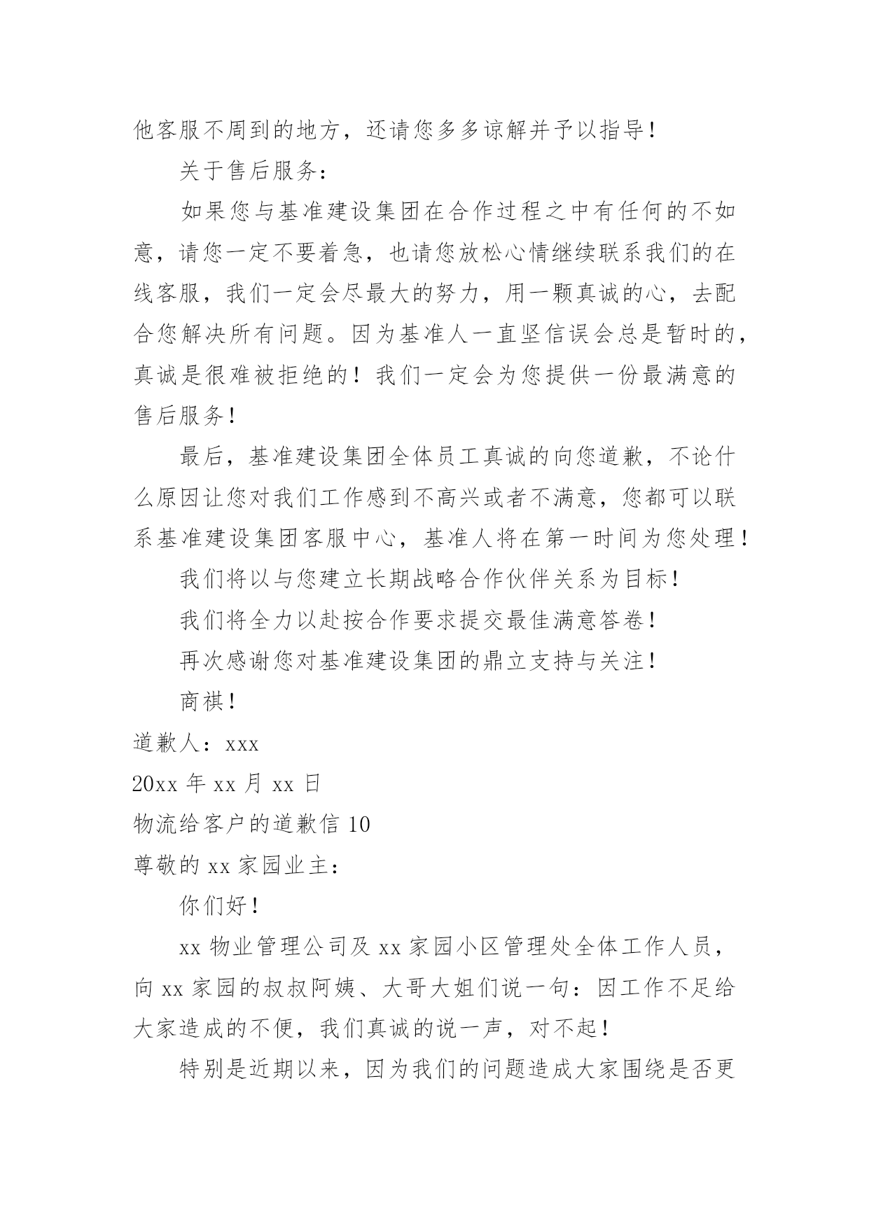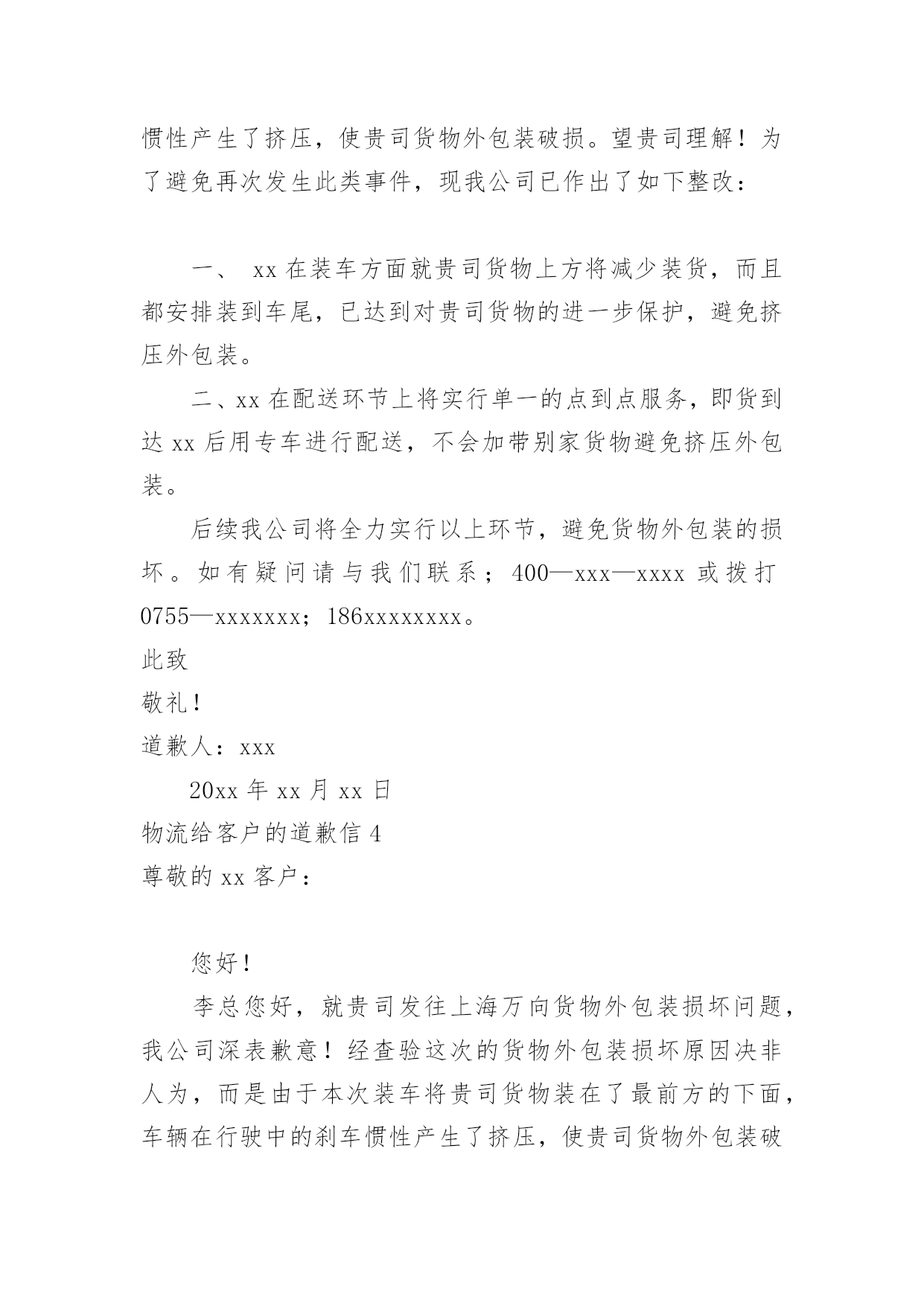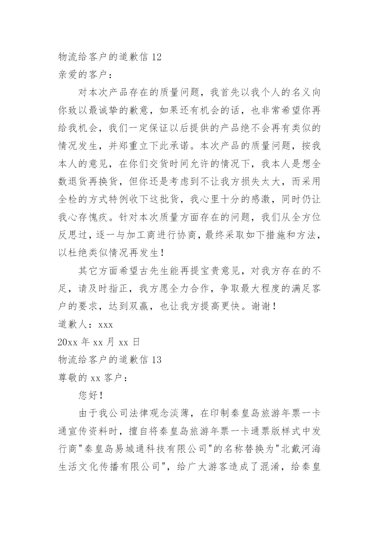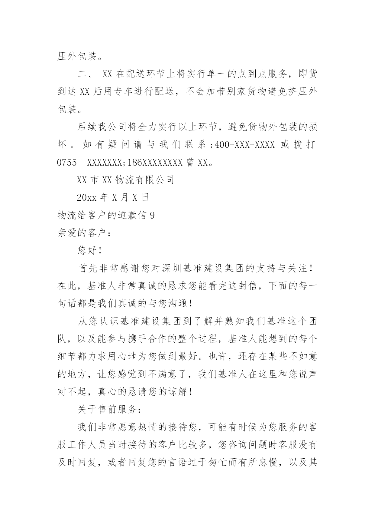 物流给客户的道歉信物流给客户的道歉信在充满活力,日益开放的今天,我们都可能会用到道歉信,道歉信可以帮助我们消除误会,增进友谊和信赖。怎么写道歉信才能避免踩雷呢?下面是小编精心整理的物流给客户的道歉信,欢迎阅读,希望大家能够喜欢。物流给客户的道歉信1首先感谢一直支持和关注我们的广大客户群体,在20xx年里我公司自认为还有许多做的不好的地方,也收到一些客户的电话投诉,在这里我代表公司向你们表示歉意,希望大家谅解。原因来源于各方面,目前和县各大快递的总派件量在迅速上升,从去年的150份发展到今天的400份多,我司今年日平均派件量达到150份多,是去年的2倍还多,其他快递也是一样的增长速度,虽然派件员有所增加,但是还是有一定的困难,因为和县的出件量增加并不明显,造成了派件多接件少的问题,人员工资在涨,物价在涨,油价也在涨,但是我们的快递费却不见涨,反而有下降的趋势,各家快递公司分别呈现收支不平衡现象,为了节约成本大家都采取了瘦身法来应对,所以造成部分快件的不及时,还请大家谅解,我司也在发展物流上下足功夫以缓解收支不平衡,如果大家有特急件的话可以拨打我司电话,要求特殊派送,我们会尽量安排,联系电话:0565-XXXXXXX物流给客户的道歉信2尊敬的xx客户:您好!我司新厂自20xx年9月22日投产后,产能较以前有一定幅度的提高。但由于我司目前麻花生产部分工艺是手工操作,全自动生产线设备尚在安装、调试之中,加上产品销售自8月底开始至今是持续销售旺季,因此当前我司产能的增长赶不上全国市场客户销量的大幅度增长,货源供应不能充分满足广大客户的需求,导致贵司货不能按订单足量、按时发出,影响贵司销售,在此我司特向贵司表示深深的歉意!为了解决当前货源供需缺口问题,我司现加大了生产工人招工力度,计划新增添生产线二条,并加紧对全自动生产线设备安装、调试进度,预计不久的将来,我司产能将得到充分的缓解。感谢贵司给予我司的理解和大力支持!X年XX月XX日物流给客户的道歉信3李总:您好!就贵司发往xx货物外包装损坏问题,我公司深表歉意!经查验这次的货物外包装损坏原因决非人为,而是由于本次装车将贵司货物装在了最前方的下面,车辆在行驶中的刹车惯性产生了挤压,使贵司货物外包装破损。望贵司理解!为了避免再次发生此类事件,现我公司已作出了如下整改:一、xx在装车方面就贵司货物上方将减少装货,而且都安排装到车尾,已达到对贵司货物的进一步保护,避免挤压外包装。二、xx在配送环节上将实行单一的点到点服务,即货到达xx后用专车进行配送,不会加带别家货物避免挤压外包装。后续我公司将全力实行以上环节,避免货物外包装的损坏。如有疑问请与我们联系;400—xxx—xxxx或拨打0755—xxxxxxx;186xxxxxxxx。此致敬礼!道歉人:xxx20xx年xx月xx日物流给客户的道歉信4尊敬的xx客户:您好!李总您好,就贵司发往上海万向货物外包装损坏问题,我公司深表歉意!经查验这次的货物外包装损坏原因决非人为,而是由于本次装车将贵司货物装在了最前方的下面,车辆在行驶中的刹车惯性产生了挤压,使贵司货物外包装破损。望贵司理解!为了避免再次发生此类事件,现我公司已作出了如下整改:一,深圳在装车方面就贵司货物上方将减少装货,而且都安排装到车尾,已达到对贵司货物的进一步保护,避免挤压外包装。二,上海在配送环节上将实行单一的点到点服务,即货到达上海后用专车进行配送,不会加带别家货物避免挤压外包装。后续我公司将全力实行以上环节,避免货物外包装的损坏。如有疑问请与我们联系;400—003—8070或拨打0755—28700856;曾生。深圳市广域通物流有限公司20xx年9月10日物流给客户的道歉信5亲爱的客户:自从我公司的'新工厂于20xx年9月22日投产以来,生产能力有了一定程度的提高。但是由于我公司麻花生产中一些工序的人工操作,自动生产线设备的安装调试,以及8月底以来连续的销售旺季,我们生产能力的增长跟不上客户在全国市场销量的大幅增长,商品的供应也不能完全满足客户的需求,导致您的商品不能按照订单按时足额交付,影响了您的销售。我们在此向您深表歉意!为了解决目前的供需缺口问题,我公司增加了生产工人的招聘,计划增加两条新的生产线,并加快了全自动生产线设备的安装和调试进度。预计我们的生产能力将在不久的将来得到充分缓解。感谢大家的理解和大力支持!此致敬礼!道歉人:xxx20xx年xx月xx日物流给客户的道歉信6尊敬的张先生:您好,我是空调销售公司的1002号配货专员,我叫宋货匡。关于此次您在我公司购买了一台奥利菲斯S623型机柜中央空调,先前协定的送货时间是三天内送达。因我公司配送货品清单时候,因为考虑到奥利菲斯S623型机柜中央空调的派送难度,考虑联系专业的搬运公司进行。然而经过多方联系专业的搬运公