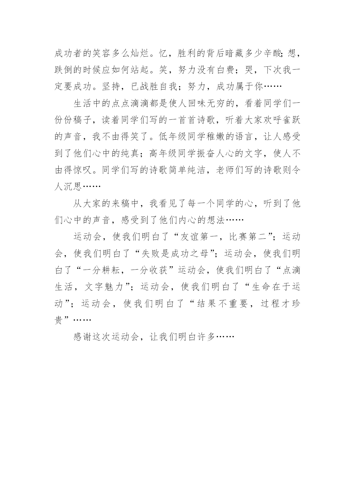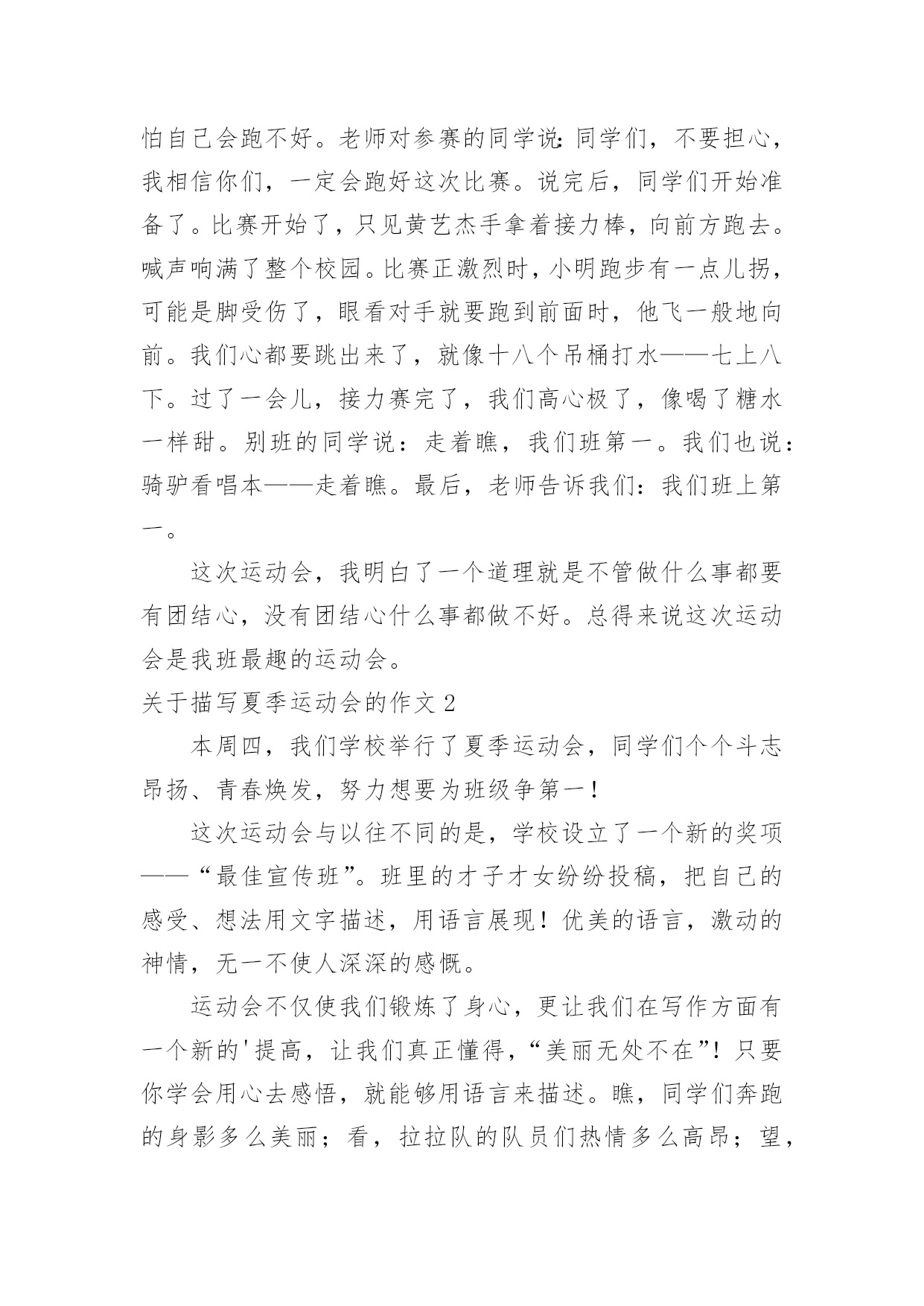 描写夏季运动会的作文关于描写夏季运动会的作文在现实生活或工作学习中,大家都经常看到作文的身影吧,借助作文人们可以实现文化交流的目的。你所见过的作文是什么样的呢?以下是小编为大家收集的关于描写夏季运动会的作文,仅供参考,希望能够帮助到大家。关于描写夏季运动会的作文1今天我们学校开运动会。大家都十分激动。这次运动会最使我难忘的是四百米跑步和接力赛了。上午,四百米跑步比赛开始了。我们班的丁佳惠也参加了四百米比赛,她被我们称做为飞毛腿。是我们班上常常拿第一的人,今天她已经拿了一个八百米第一。比赛正式开始了,只听“啪”的一声,她们像箭一样向前冲,我们大喊:丁佳惠,加油!丁佳惠,加油!可能我们班同学的叫喊声激励了她,跑的更快了。在预赛中拿了个第一,我们高心极了。决赛开始了,她突然肚子痛了起来,大家都非常着急,生怕决赛她参加不了。可是,她忍着疼痛坚强地站在起跑线上,忍着疼痛顽强地跑完了四百米而且还拿了一个第一名。这件事激力我。心想:自己以前做什么都怕困难,而丁佳惠就不同了。我一定要向她学习,做个不怕困难,不怕吃苦的`人,认真做好每件事。下午,是接力赛。参加接力赛的20名同学都非常担心,怕自己会跑不好。老师对参赛的同学说:同学们,不要担心,我相信你们,一定会跑好这次比赛。说完后,同学们开始准备了。比赛开始了,只见黄艺杰手拿着接力棒,向前方跑去。喊声响满了整个校园。比赛正激烈时,小明跑步有一点儿拐,可能是脚受伤了,眼看对手就要跑到前面时,他飞一般地向前。我们心都要跳出来了,就像十八个吊桶打水——七上八下。过了一会儿,接力赛完了,我们高心极了,像喝了糖水一样甜。别班的同学说:走着瞧,我们班第一。我们也说:骑驴看唱本——走着瞧。最后,老师告诉我们:我们班上第一。这次运动会,我明白了一个道理就是不管做什么事都要有团结心,没有团结心什么事都做不好。总得来说这次运动会是我班最趣的运动会。关于描写夏季运动会的作文2本周四,我们学校举行了夏季运动会,同学们个个斗志昂扬、青春焕发,努力想要为班级争第一!这次运动会与以往不同的是,学校设立了一个新的奖项——“最佳宣传班”。班里的才子才女纷纷投稿,把自己的感受、想法用文字描述,用语言展现!优美的语言,激动的神情,无一不使人深深的感慨。运动会不仅使我们锻炼了身心,更让我们在写作方面有一个新的'提高,让我们真正懂得,“美丽无处不在”!只要你学会用心去感悟,就能够用语言来描述。瞧,同学们奔跑的身影多么美丽;看,拉拉队的队员们热情多么高昂;望,成功者的笑容多么灿烂。忆,胜利的背后暗藏多少辛酸;想,跌倒的时候应如何站起。笑,努力没有白费;哭,下次我一定要成功。坚持,已战胜自我;努力,成功属于你……生活中的点点滴滴都是使人回味无穷的,看着同学们一份份稿子,读着同学们写的一首首诗歌,听着大家欢呼雀跃的声音,我不由得笑了。低年级同学稚嫩的语言,让人感受到了他们心中的纯真;高年级同学振奋人心的文字,使人不由得惊叹。同学们写的诗歌简单纯洁,老师们写的诗歌则令人沉思……从大家的来稿中,我看见了每一个同学的心,听到了他们心中的声音,感受到了他们内心的想法……运动会,使我们明白了“友谊第一,比赛第二”;运动会,使我们明白了“失败是成功之母”;运动会,使我们明白了“一分耕耘,一分收获”运动会,使我们明白了“点滴生活,文字魅力”;运动会,使我们明白了“生命在于运动”;运动会,使我们明白了“结果不重要,过程才珍贵”……感谢这次运动会,让我们明白许多……