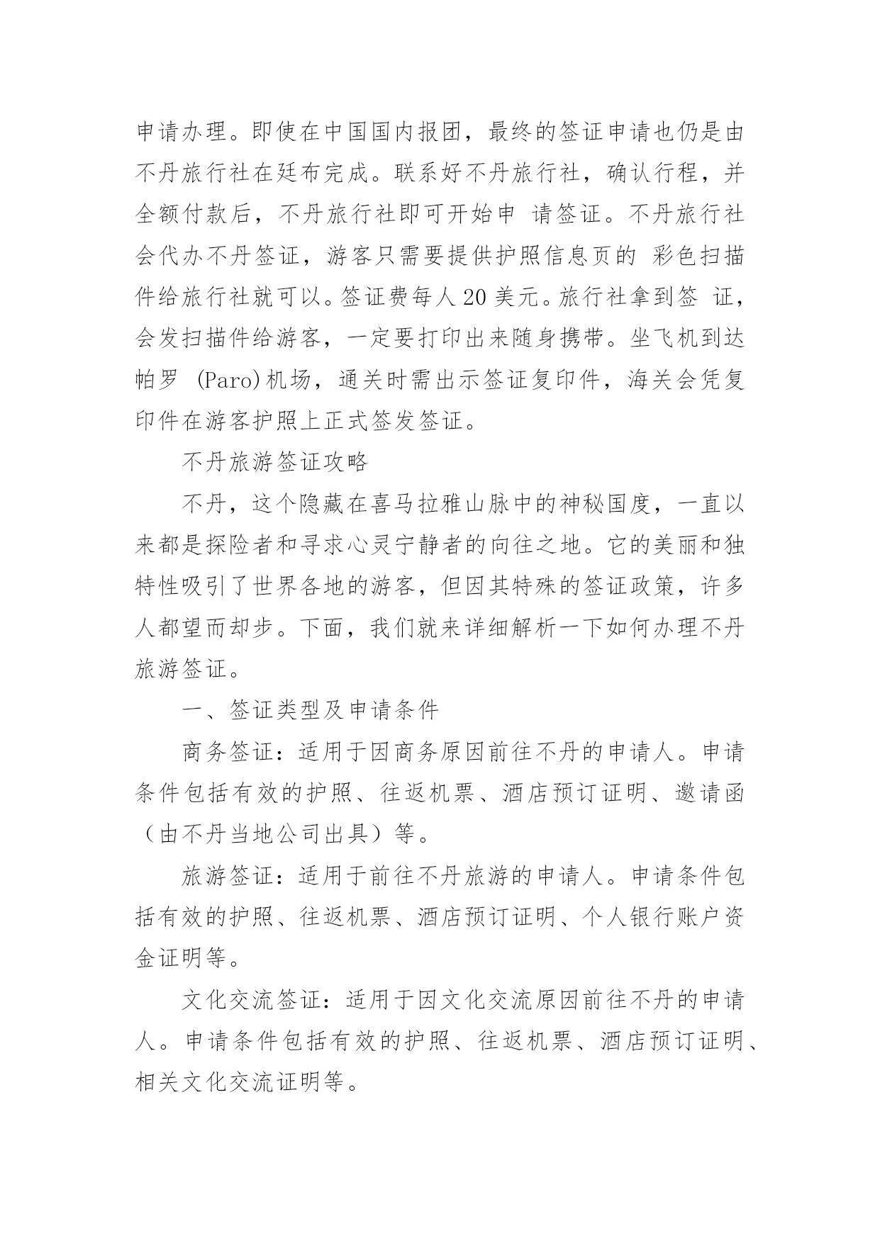 不丹旅游签证攻略在社会一步步向前发展的今天,大家都想去哪游玩吧,随着人们生活水平的提高,对外界的渴望越来越强烈,最有效释放这种情感的方式就是旅游。那么写旅游攻略需要注意哪些问题呢?下面是小编收集整理的不丹旅游签证攻略,供大家参考借鉴,希望可以帮助到有需要的朋友。不丹旅游签证攻略签证有效期有效期6个月送签时间不丹没有和中国建交,素以必须由不丹政府指定的不丹地接社出具邀请函才能递交签证申请是否可以代送是,可以委托指定的旅行社到使馆递交申请资料准备以送签社要求为标准免签、落地签、过境签是否免签否是否落地签否是否过境签否出入境注意事项不丹和中国没有建交,不可能通过大使馆申请签证。而且不丹政府规定,不丹的旅游签证必须通过不丹旅行社来申请办理。即使在中国国内报团,最终的签证申请也仍是由不丹旅行社在廷布完成。联系好不丹旅行社,确认行程,并全额付款后,不丹旅行社即可开始申请签证。不丹旅行社会代办不丹签证,游客只需要提供护照信息页的彩色扫描件给旅行社就可以。签证费每人20美元。旅行社拿到签证,会发扫描件给游客,一定要打印出来随身携带。坐飞机到达帕罗(Paro)机场,通关时需出示签证复印件,海关会凭复印件在游客护照上正式签发签证。不丹旅游签证攻略不丹,这个隐藏在喜马拉雅山脉中的神秘国度,一直以来都是探险者和寻求心灵宁静者的向往之地。它的美丽和独特性吸引了世界各地的游客,但因其特殊的签证政策,许多人都望而却步。下面,我们就来详细解析一下如何办理不丹旅游签证。一、签证类型及申请条件商务签证:适用于因商务原因前往不丹的申请人。申请条件包括有效的护照、往返机票、酒店预订证明、邀请函(由不丹当地公司出具)等。旅游签证:适用于前往不丹旅游的申请人。申请条件包括有效的护照、往返机票、酒店预订证明、个人银行账户资金证明等。文化交流签证:适用于因文化交流原因前往不丹的申请人。申请条件包括有效的护照、往返机票、酒店预订证明、相关文化交流证明等。二、签证办理流程1、确定签证类型及申请条件,准备相关材料。2、在线填写签证申请表并上传所需材料。3、缴纳签证费用(请注意,不丹签证费用因申请类型而异)。4、等待签证审批结果。一般情况下,商务签证和旅游签证审批时间为5个工作日,文化交流签证审批时间为10个工作日。5、收到签证批准通知后,打印电子签证(eVisa)并携带有效护照前往不丹。三、注意事项1、不丹签证政策较为严格,务必确保所有申请材料真实有效。2、在线填写申请表时,应按照要求上传清晰的照片和文件,避免因文件不符合要求而耽误审批进度。3、签证申请过程中如遇到问题,可联系不丹驻华使馆或官方指定的签证代理机构进行咨询和协助。4、获得签证后,请仔细核对个人信息及签证有效期,确保行程与签证规定相符。5、入境不丹时,务必携带有效护照及电子签证(eVisa),并提前了解不丹的海关规定,避免不必要的麻烦。