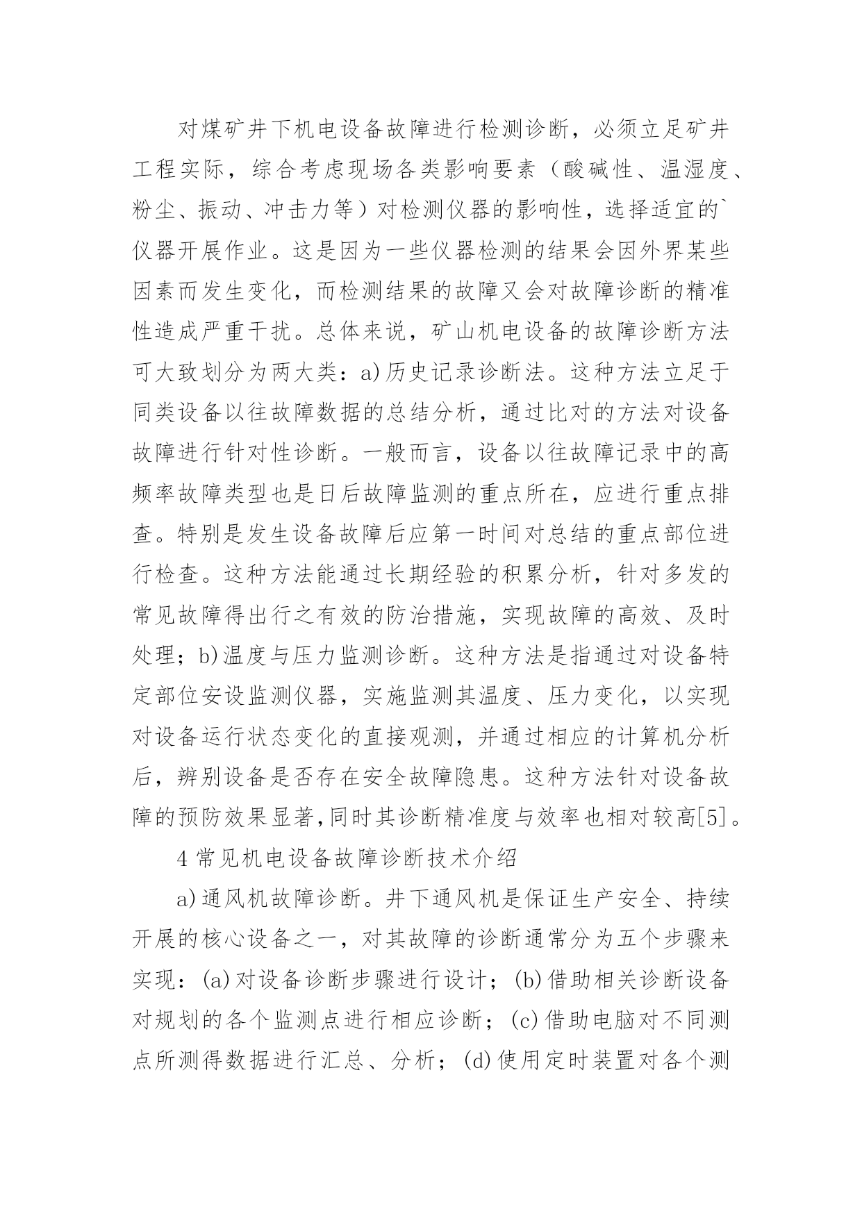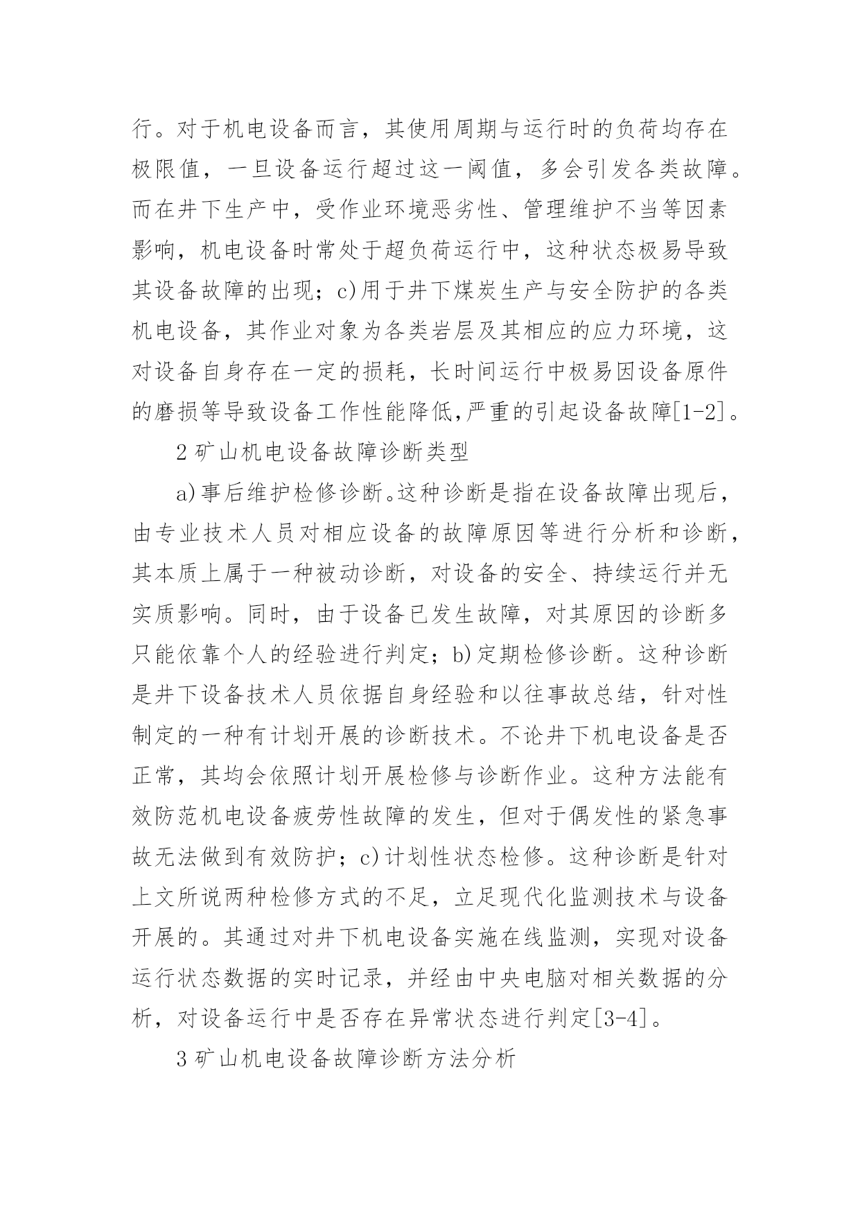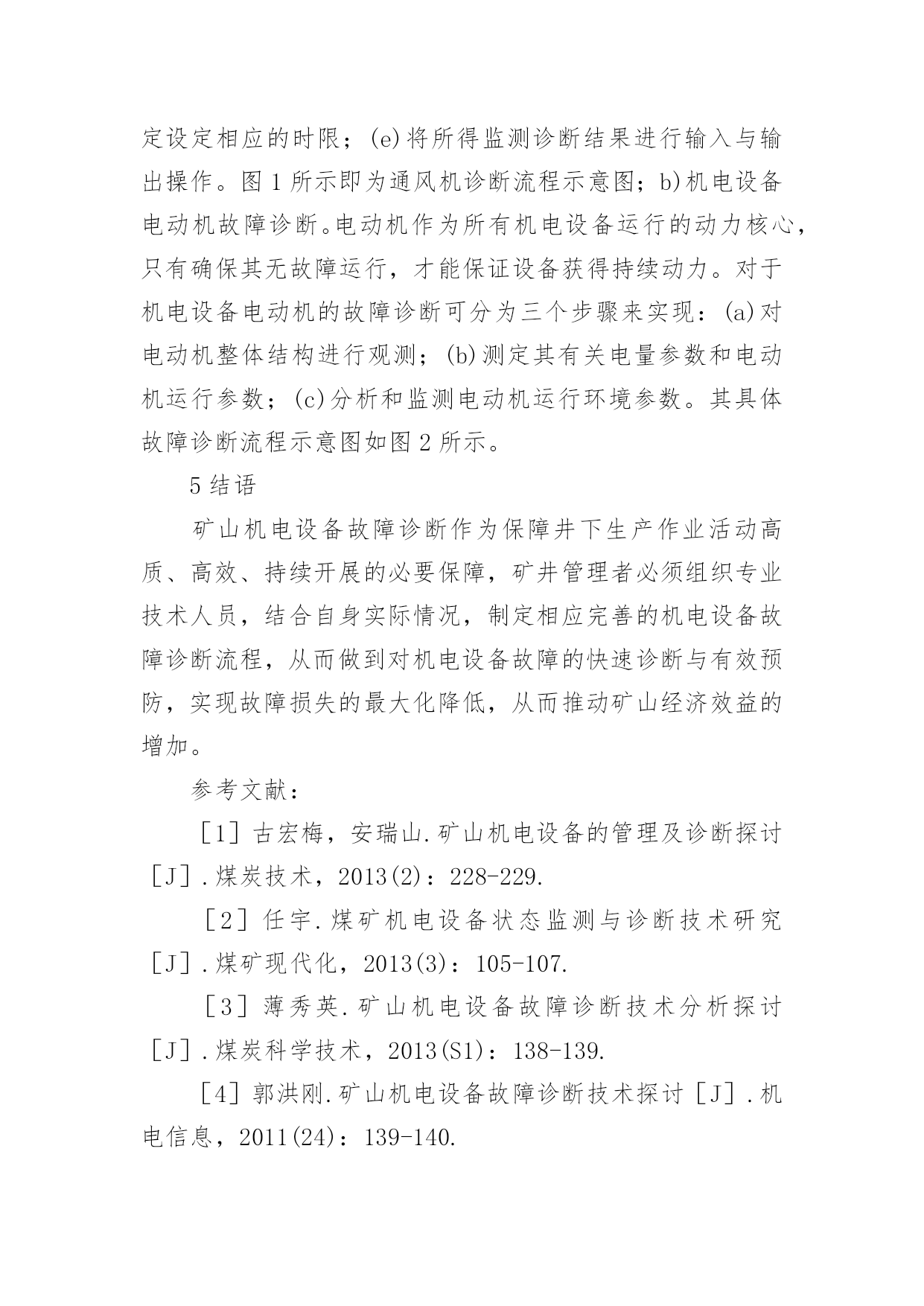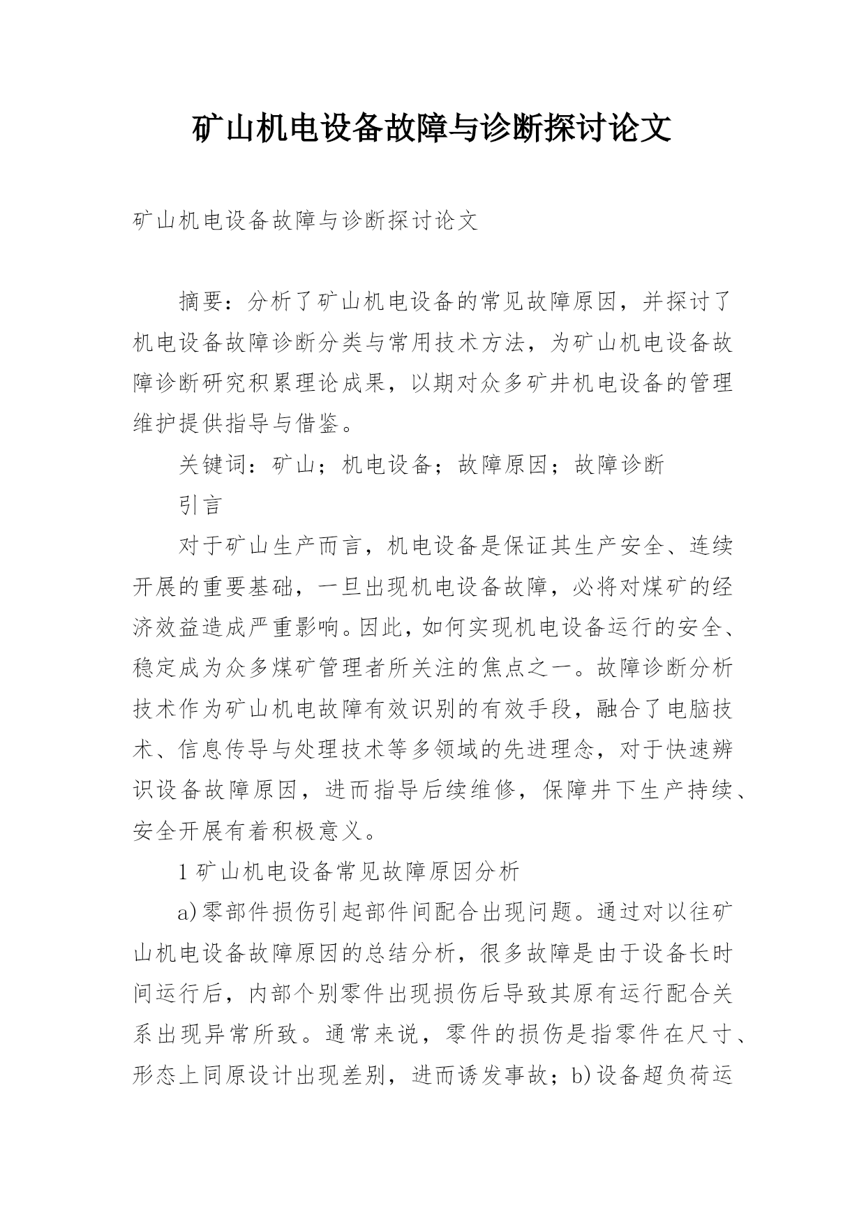 矿山机电设备故障与诊断探讨论文矿山机电设备故障与诊断探讨论文摘要:分析了矿山机电设备的常见故障原因,并探讨了机电设备故障诊断分类与常用技术方法,为矿山机电设备故障诊断研究积累理论成果,以期对众多矿井机电设备的管理维护提供指导与借鉴。关键词:矿山;机电设备;故障原因;故障诊断引言对于矿山生产而言,机电设备是保证其生产安全、连续开展的重要基础,一旦出现机电设备故障,必将对煤矿的经济效益造成严重影响。因此,如何实现机电设备运行的安全、稳定成为众多煤矿管理者所关注的焦点之一。故障诊断分析技术作为矿山机电故障有效识别的有效手段,融合了电脑技术、信息传导与处理技术等多领域的先进理念,对于快速辨识设备故障原因,进而指导后续维修,保障井下生产持续、安全开展有着积极意义。1矿山机电设备常见故障原因分析a)零部件损伤引起部件间配合出现问题。通过对以往矿山机电设备故障原因的总结分析,很多故障是由于设备长时间运行后,内部个别零件出现损伤后导致其原有运行配合关系出现异常所致。通常来说,零件的损伤是指零件在尺寸、形态上同原设计出现差别,进而诱发事故;b)设备超负荷运行。对于机电设备而言,其使用周期与运行时的负荷均存在极限值,一旦设备运行超过这一阈值,多会引发各类故障。而在井下生产中,受作业环境恶劣性、管理维护不当等因素影响,机电设备时常处于超负荷运行中,这种状态极易导致其设备故障的出现;c)用于井下煤炭生产与安全防护的各类机电设备,其作业对象为各类岩层及其相应的应力环境,这对设备自身存在一定的损耗,长时间运行中极易因设备原件的磨损等导致设备工作性能降低,严重的引起设备故障[1-2]。2矿山机电设备故障诊断类型a)事后维护检修诊断。这种诊断是指在设备故障出现后,由专业技术人员对相应设备的故障原因等进行分析和诊断,其本质上属于一种被动诊断,对设备的安全、持续运行并无实质影响。同时,由于设备已发生故障,对其原因的诊断多只能依靠个人的经验进行判定;b)定期检修诊断。这种诊断是井下设备技术人员依据自身经验和以往事故总结,针对性制定的一种有计划开展的诊断技术。不论井下机电设备是否正常,其均会依照计划开展检修与诊断作业。这种方法能有效防范机电设备疲劳性故障的发生,但对于偶发性的紧急事故无法做到有效防护;c)计划性状态检修。这种诊断是针对上文所说两种检修方式的不足,立足现代化监测技术与设备开展的。其通过对井下机电设备实施在线监测,实现对设备运行状态数据的实时记录,并经由中央电脑对相关数据的分析,对设备运行中是否存在异常状态进行判定[3-4]。3矿山机电设备故障诊断方法分析对煤矿井下机电设备故障进行检测诊断,必须立足矿井工程实际,综合考虑现场各类影响要素(酸碱性、温湿度、粉尘、振动、冲击力等)对检测仪器的影响性,选择适宜的`仪器开展作业。这是因为一些仪器检测的结果会因外界某些因素而发生变化,而检测结果的故障又会对故障诊断的精准性造成严重干扰。总体来说,矿山机电设备的故障诊断方法可大致划分为两大类:a)历史记录诊断法。这种方法立足于同类设备以往故障数据的总结分析,通过比对的方法对设备故障进行针对性诊断。一般而言,设备以往故障记录中的高频率故障类型也是日后故障监测的重点所在,应进行重点排查。特别是发生设备故障后应第一时间对总结的重点部位进行检查。这种方法能通过长期经验的积累分析,针对多发的常见故障得出行之有效的防治措施,实现故障的高效、及时处理;b)温度与压力监测诊断。这种方法是指通过对设备特定部位安设监测仪器,实施监测其温度、压力变化,以实现对设备运行状态变化的直接观测,并通过相应的计算机分析后,辨别设备是否存在安全故障隐患。这种方法针对设备故障的预防效果显著,同时其诊断精准度与效率也相对较高[5]。4常见机电设备故障诊断技术介绍a)通风机故障诊断。井下通风机是保证生产安全、持续开展的核心设备之一,对其故障的诊断通常分为五个步骤来实现:(a)对设备诊断步骤进行设计;(b)借助相关诊断设备对规划的各个监测点进行相应诊断;(c)借助电脑对不同测点所测得数据进行汇总、分析;(d)使用定时装置对各个测定设定相应的时限;(e)将所得监测诊断结果进行输入与输出操作。图1所示即为通风机诊断流程示意图;b)机电设备电动机故障诊断。电动机作为所有机电设备运行的动力核心,只有确保其无故障运行,才能保证设备获得持续动力。对于机电设备电动机的故障诊断可分为三个步骤来实现:(a)对电动机整体结构进行观测;(b)测定其有关电量参数和电动机运行参数;(c)分析和监测电动机运行环境参数。其具体故障诊断流程示意图如图2所示。5结语矿山机电设备故障诊断作为保障井下生产作业活动高质、高效、持续开展的必要保障,矿井管理者必须组织专业技术人员,结合自身实际情况,制定相应完善的机电设备故障诊断流程,从而做到对机电